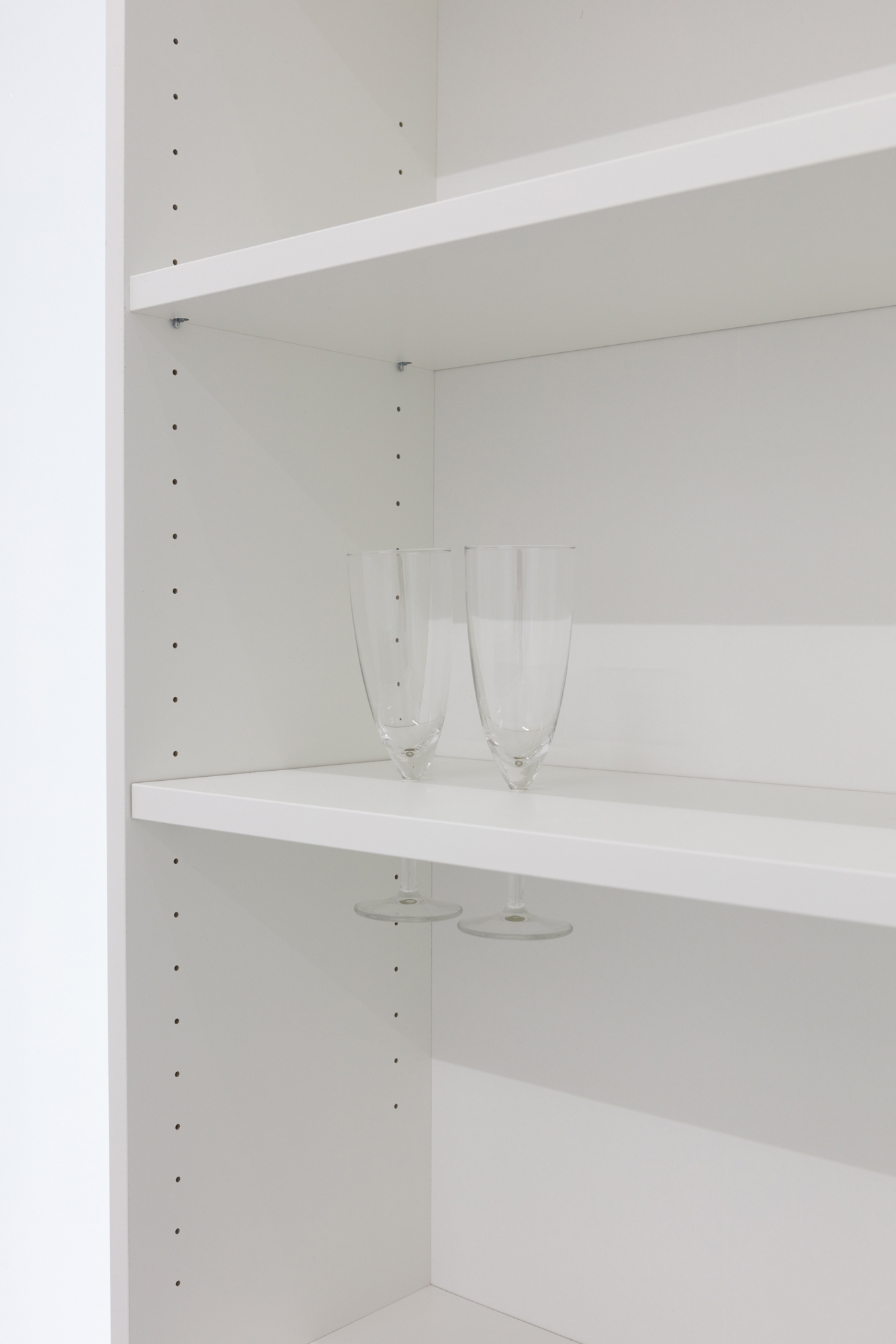 3 Bookcases, white, particleboard, paper foil, plastic edging, champagne glasses, glass, each 202 x 80 x 28 cm