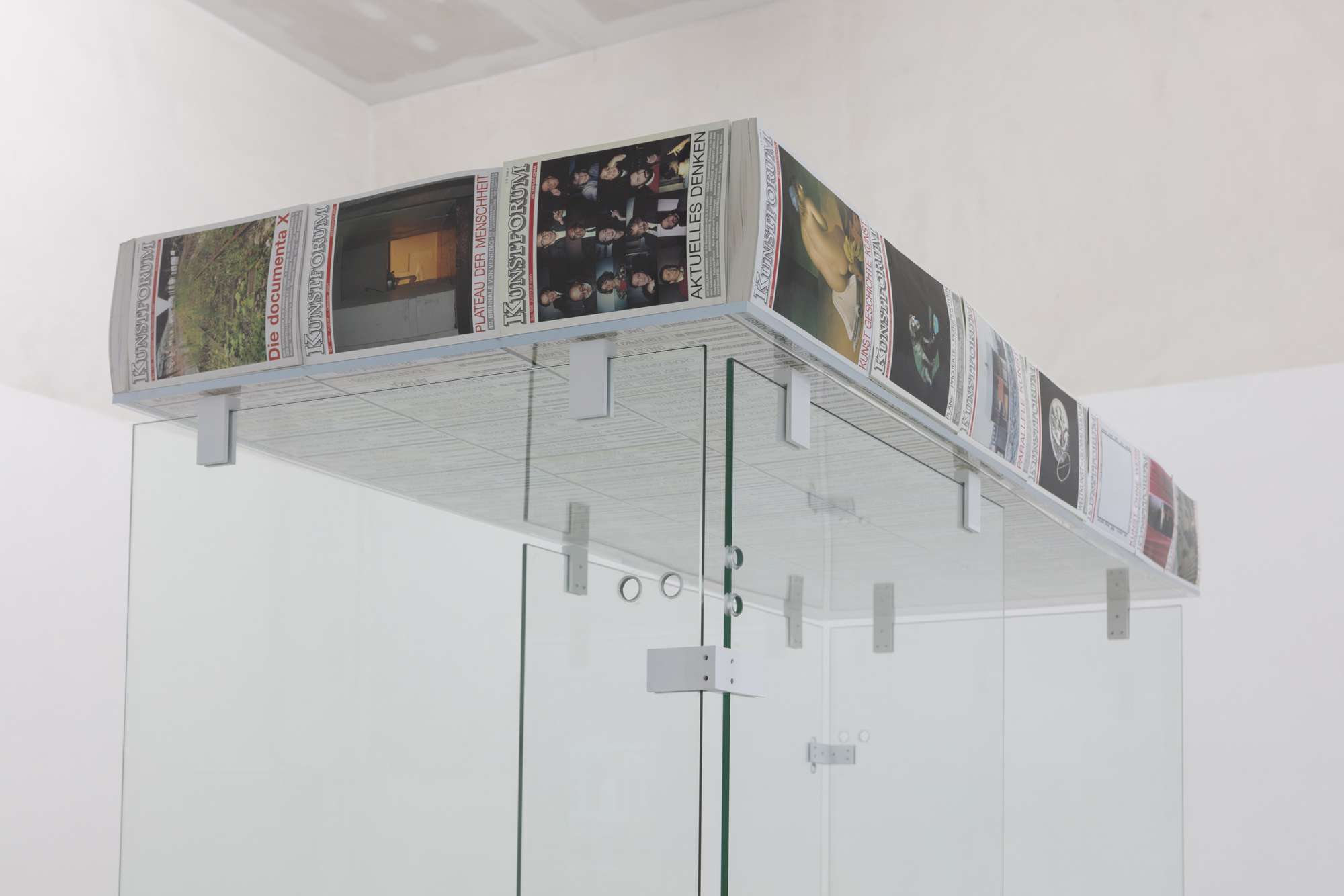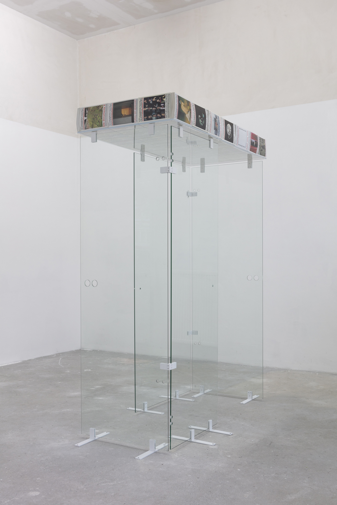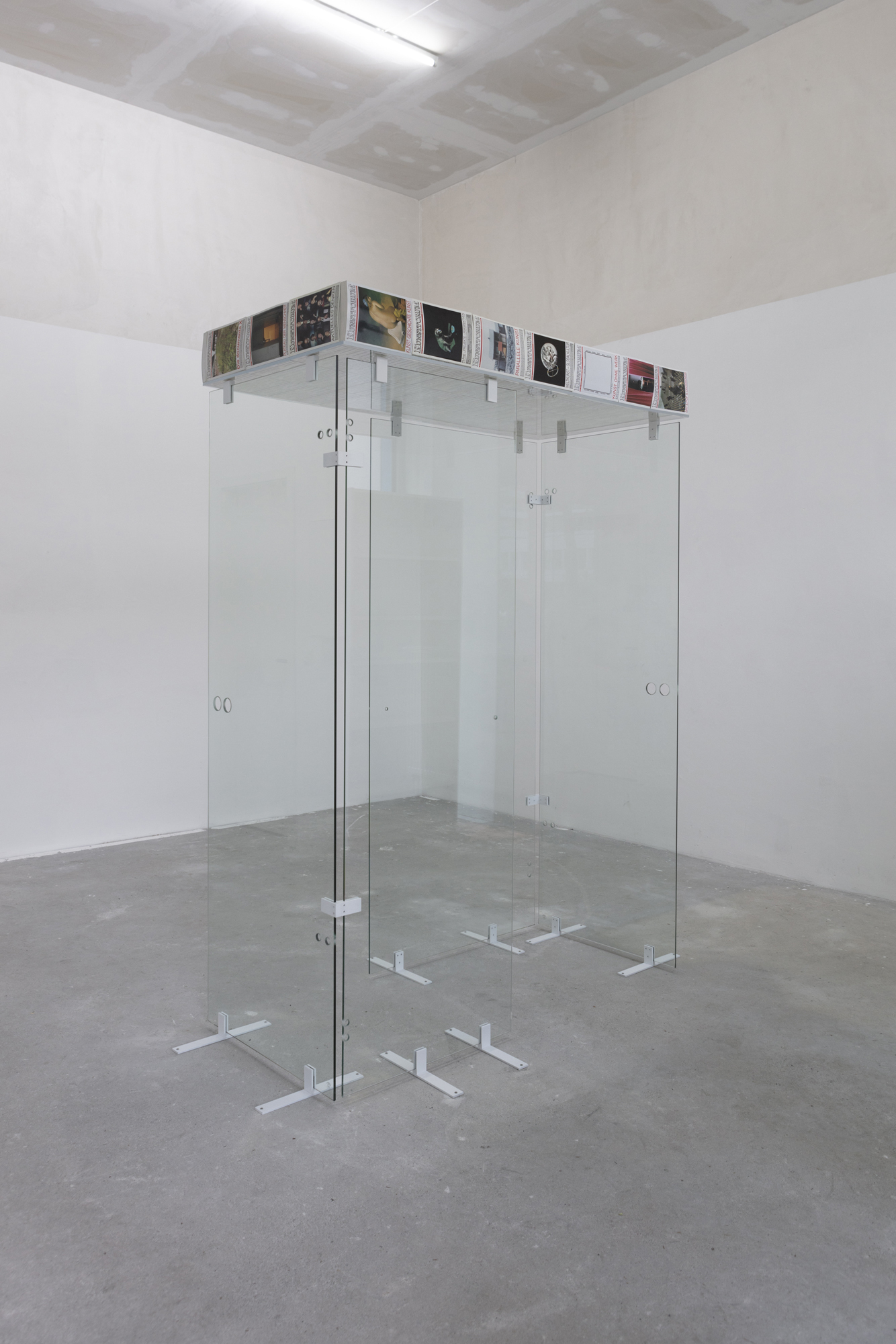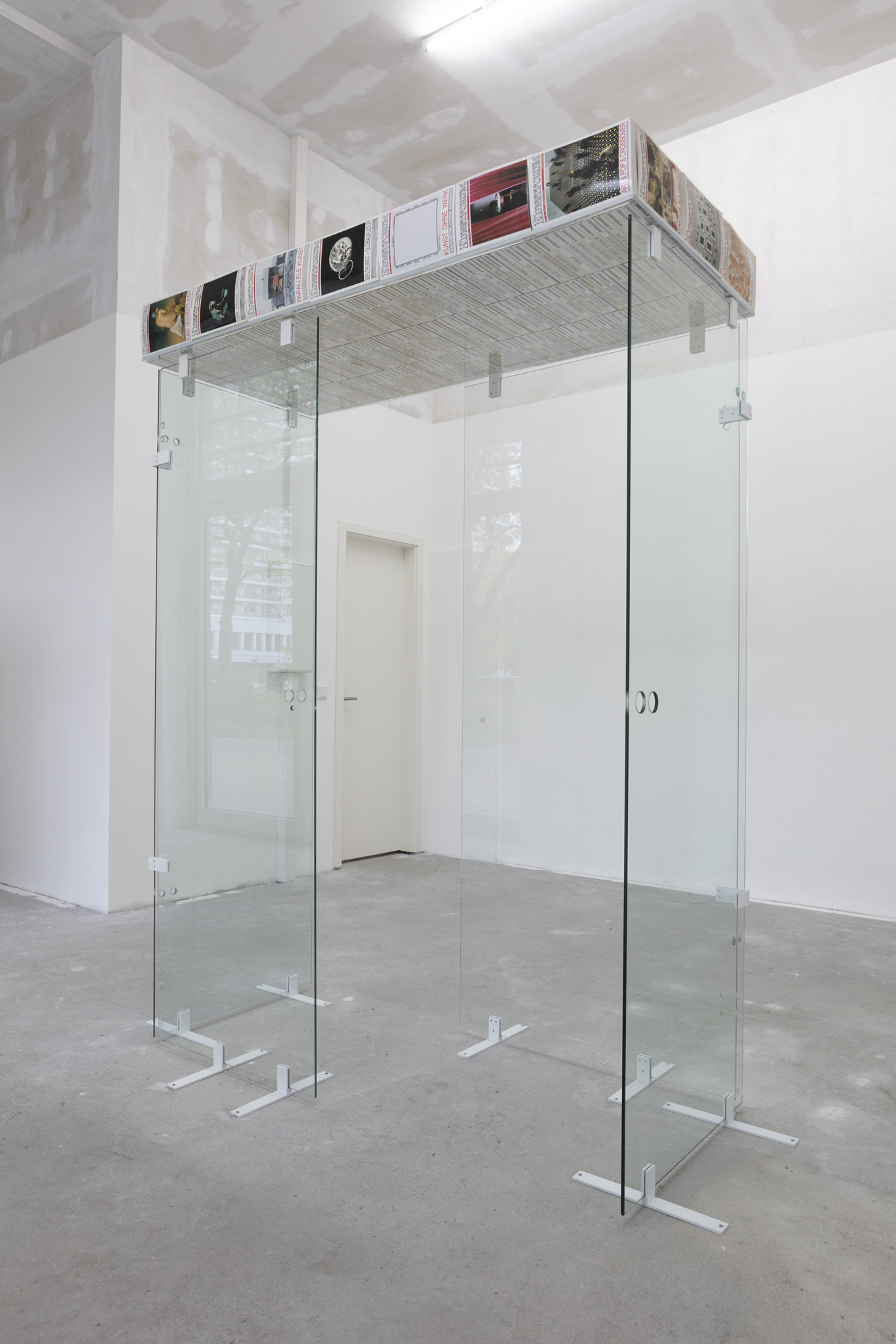 Repurposed shower cubicle doors, Aluminium brackets, Kunstforum magazines, 230 x 165 x 76 cm