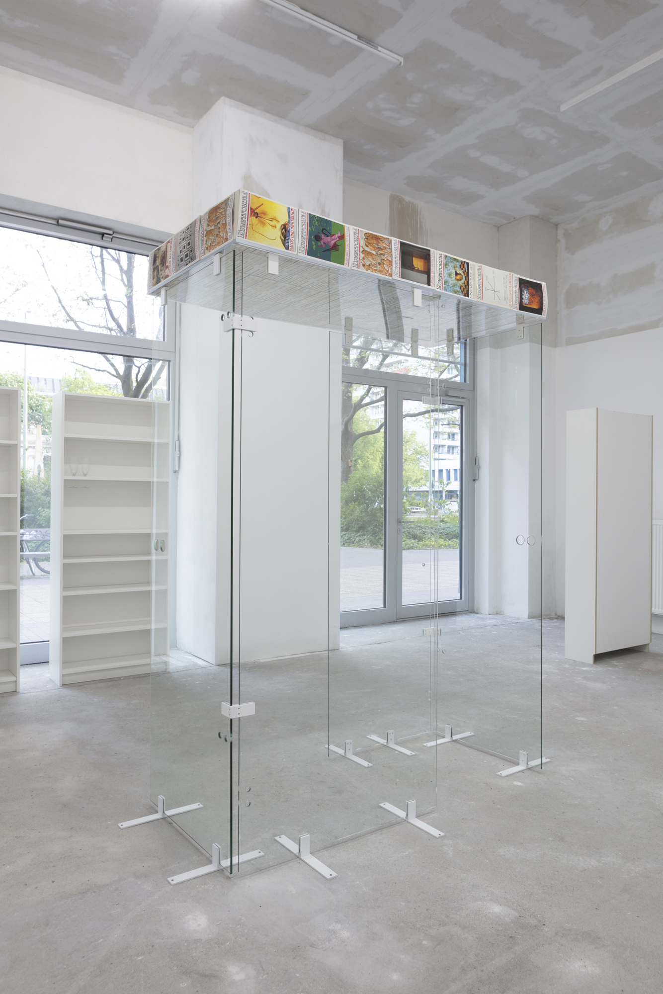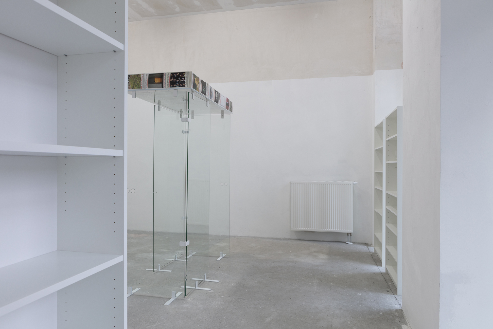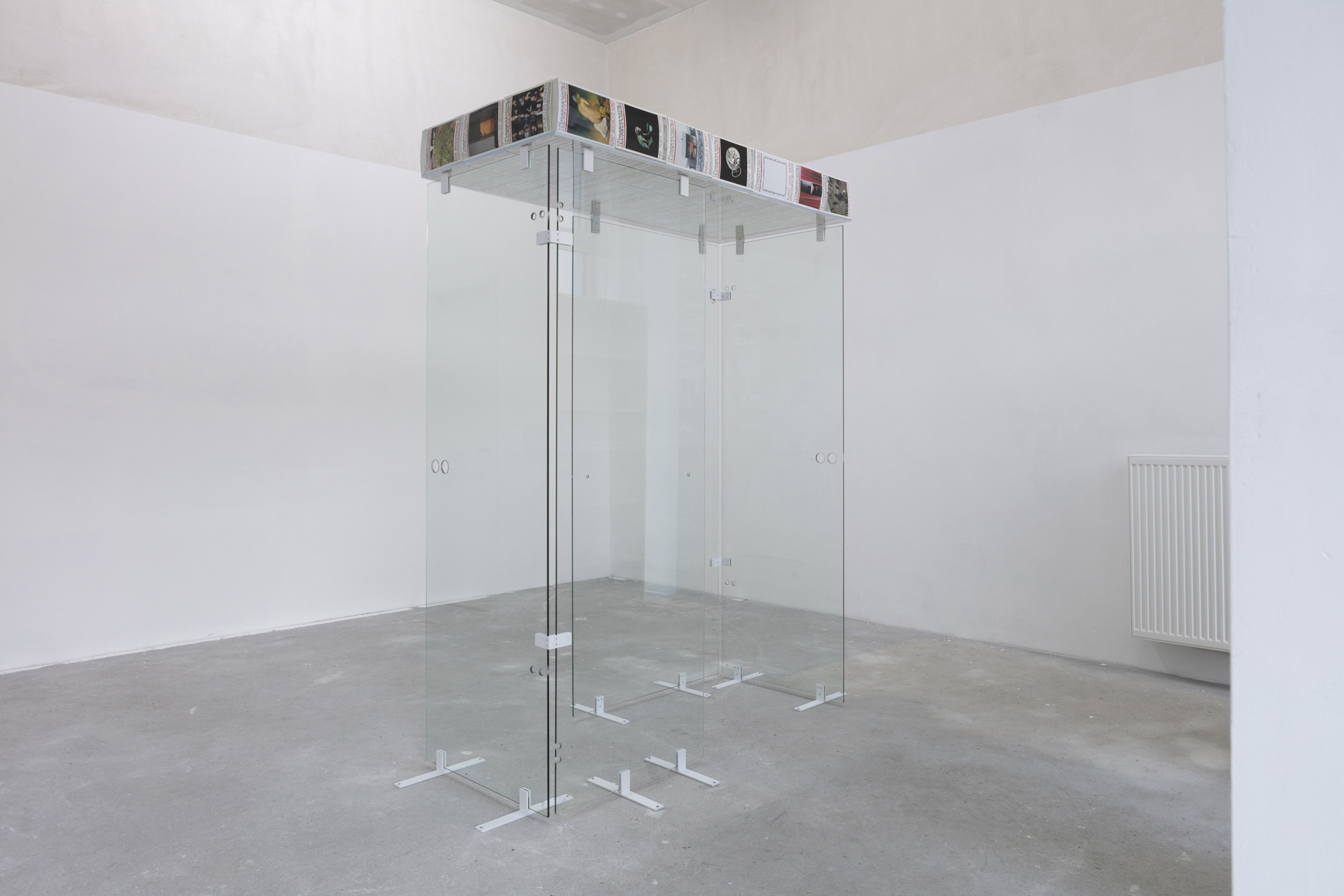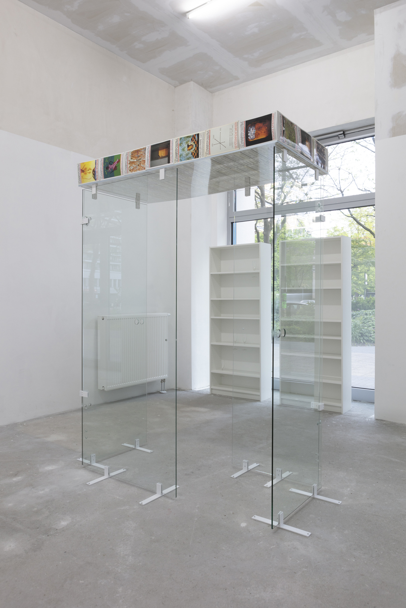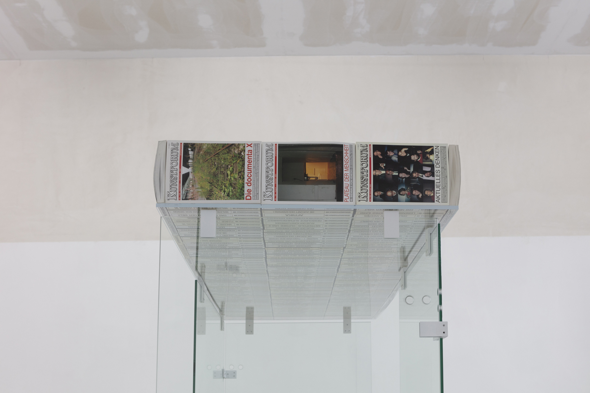 Repurposed shower cubicle doors, Aluminium brackets, Kunstforum magazines, 230 x 165 x 76 cm