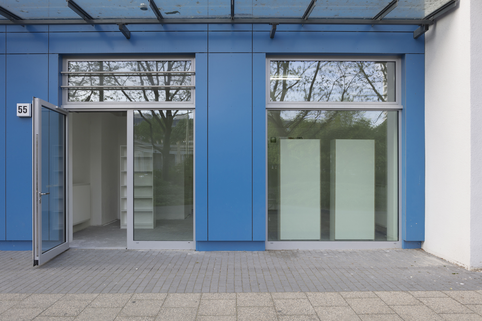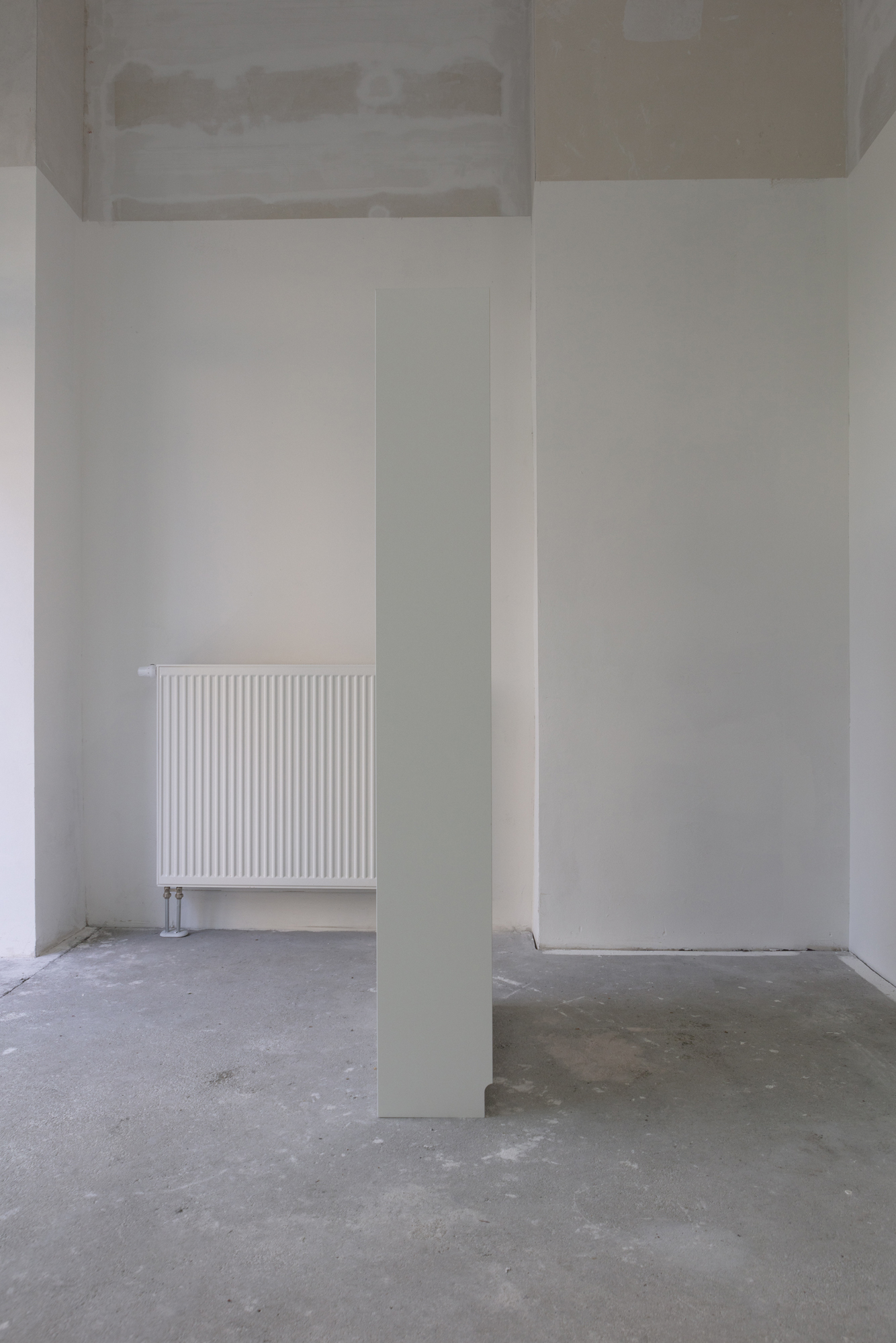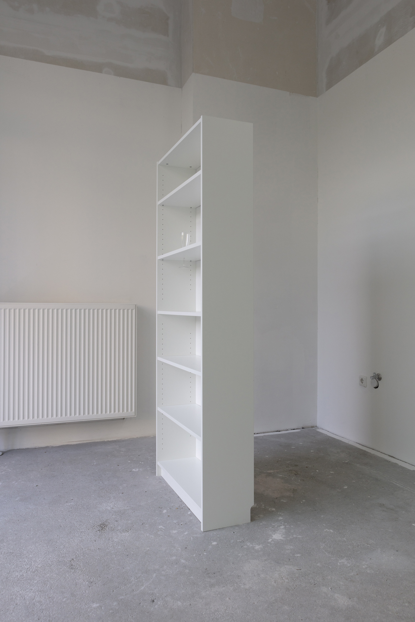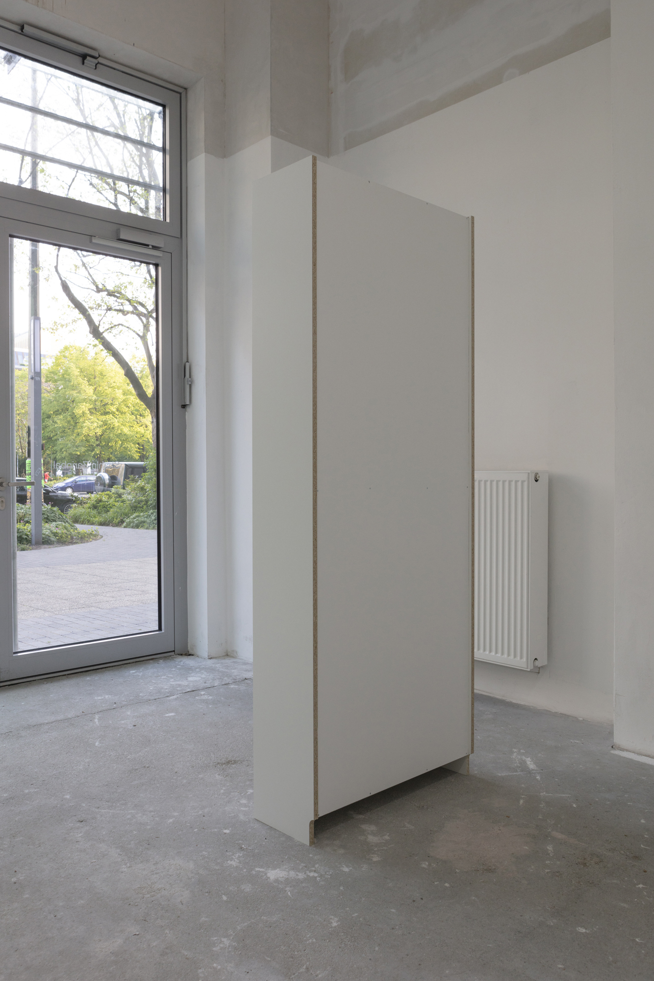 The ordinary, commonplace and domestic at home becomes an obstruction in the gallery, a wall, a column - a placeholder for something rigid and brute. With its butt against the window it obstructs that which is within, a showing of the non-shown, in its place - an agency of monumentality of particleboard, paper foil, plastic edging.