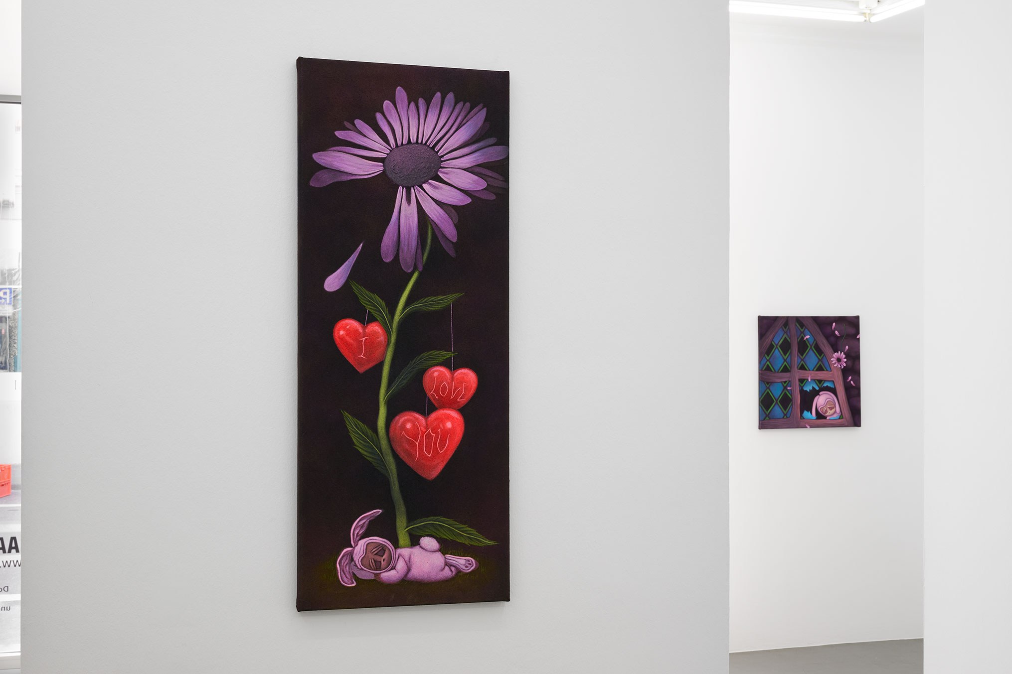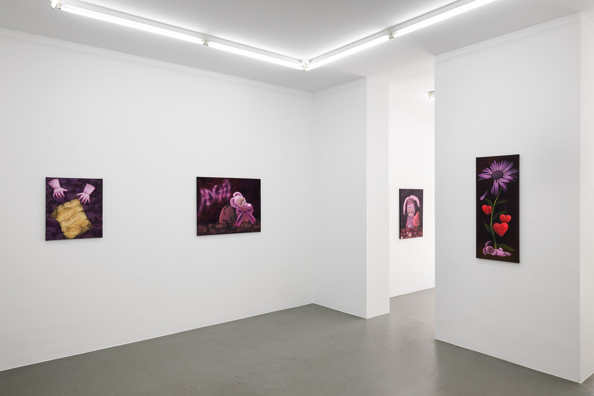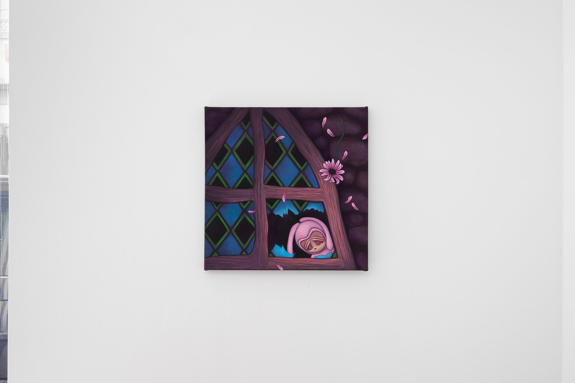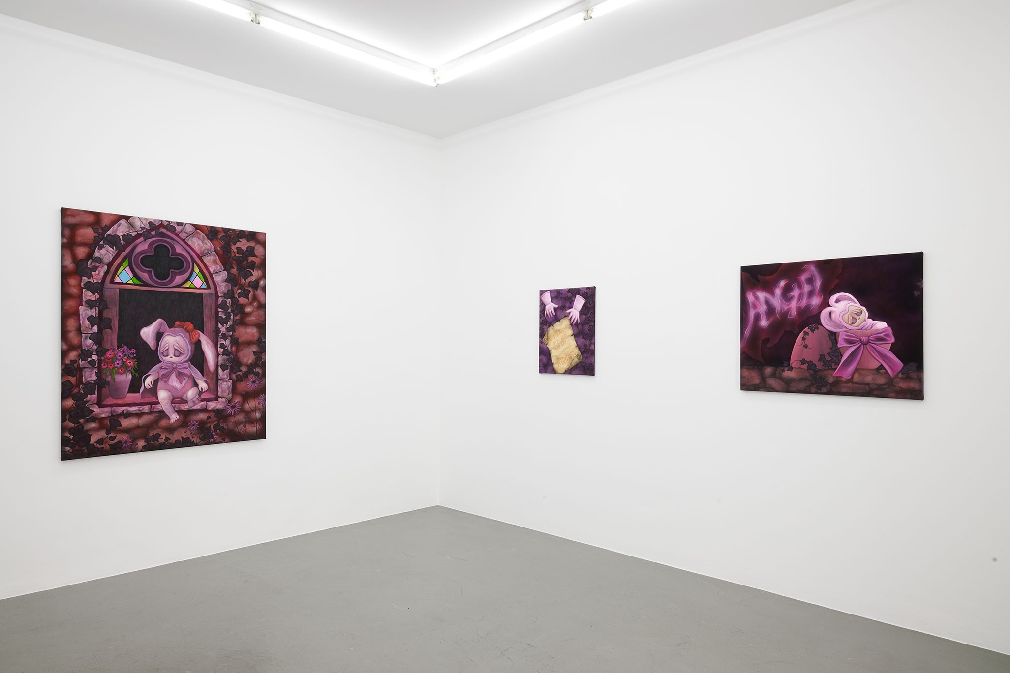 Immersed in strange swirls of smoke, ribbon, and ivy, foreboding elements wrap around the inhabitants of Padoux’s paintings. Tattoo script spells out the messages of angels. A child-like figure, more doll than human, is dressed in a rabbit costume. Figures are grounded by cathedral windows and ambiguous suggestions of space. Inspired by Anne Geddes’ photographs of costumed babies, Padoux’s humanoid bunnies prompt questions about our past as humans and the psychological dimension of moving beyond the present and imagining the future. In her eerie renderings of babies swaddled in eggs cracked open, Padoux asks: what will the next generation be born into? What do the legacies of the past determine for future fertility and choice?