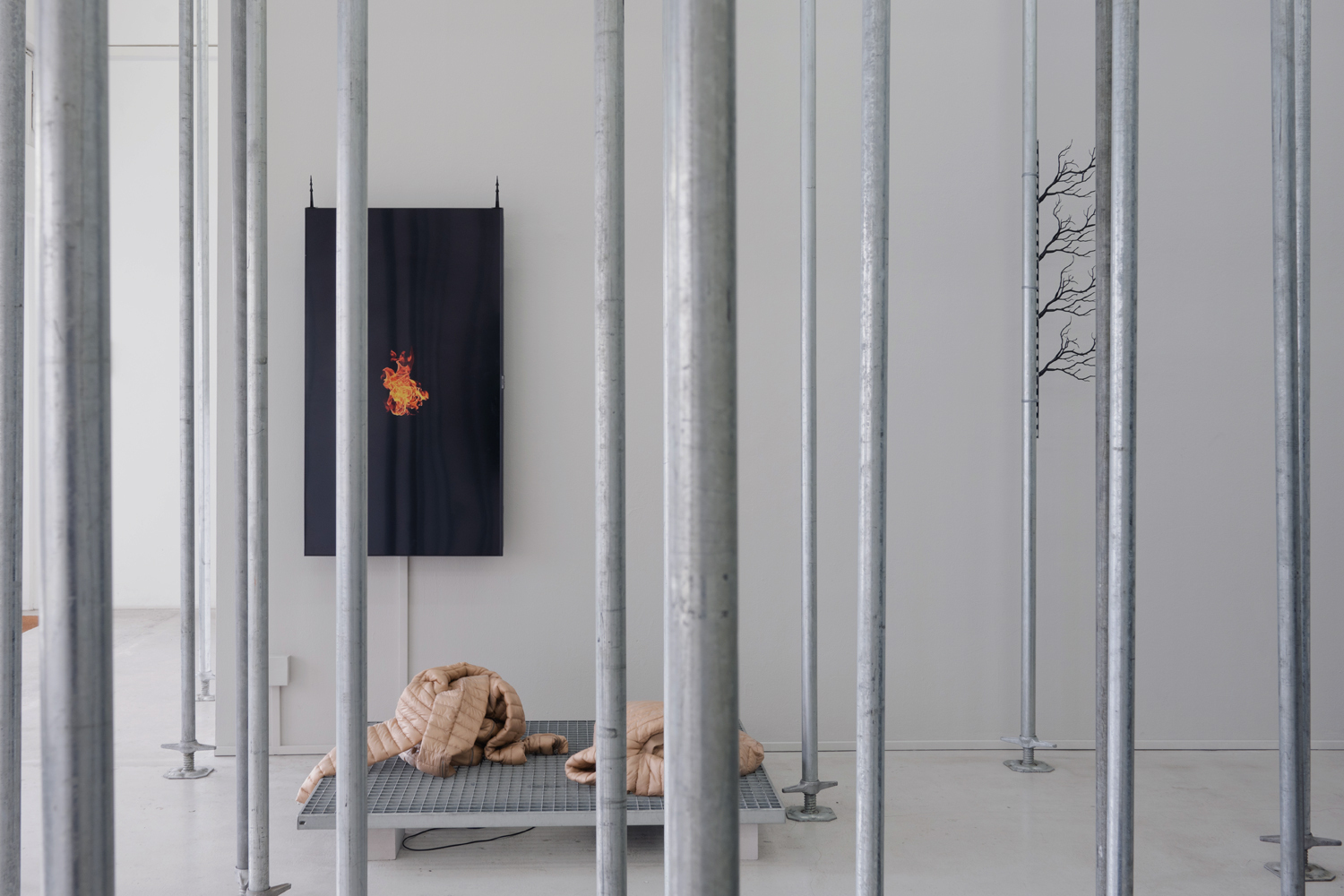 Adler uses materials that underscore the aesthetics of this rather incidental scenario. For twisted notions are to be found not only in the deepest depths of the internet, but also and above all in our midst – Holistic Paranoia – in the pimped gaming chair or the stuffy down jacket. Adler plays with precisely this idea, juxtaposing various ideologies that are currently creating a mood in the country and which are, first and foremost, loud.