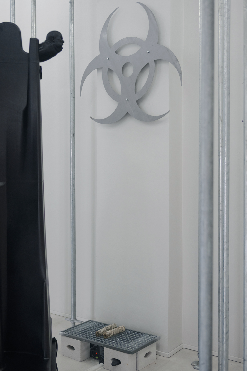 The object seems somehow unfamiliar, although its basic structure is still recognisable: a black urinal – with piss troughs and small separate cubicles – bearing the title “SHRN WRSHIP”. Raised on high, it virtually hovers above the setting like a shrine, an altar, awaiting worship. It illustrates how insane and absurd are these structures that inform religions and conspiracy theories. It stands as an ironic commentary on structures that systematically oppress women, drown out their voices, and exclude them. What emerges when diverse fears and personal expressions compete and collide is a menacing, looming dread, in the shadows of which a hatred of women, foreigners, and all things Other runs rife.