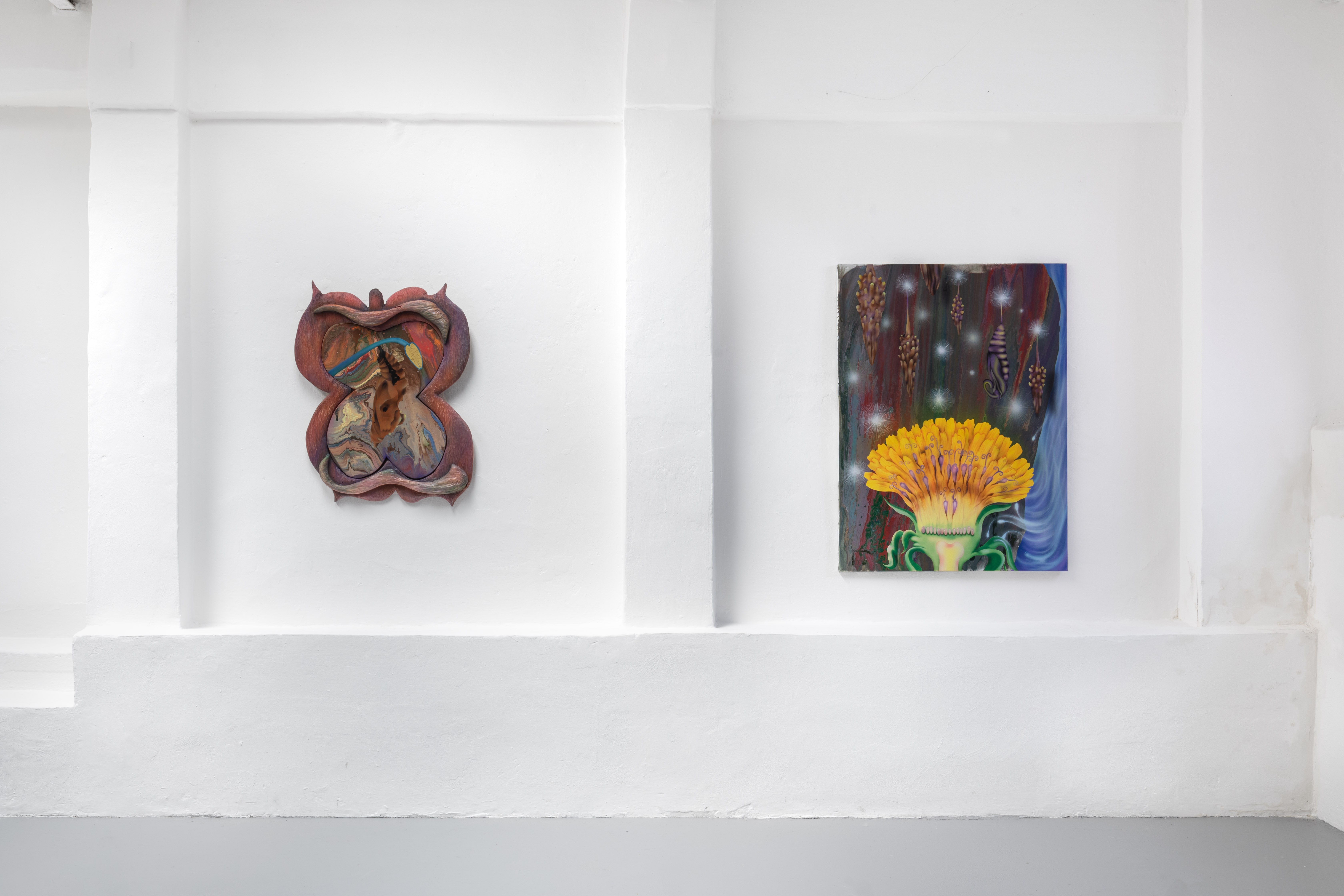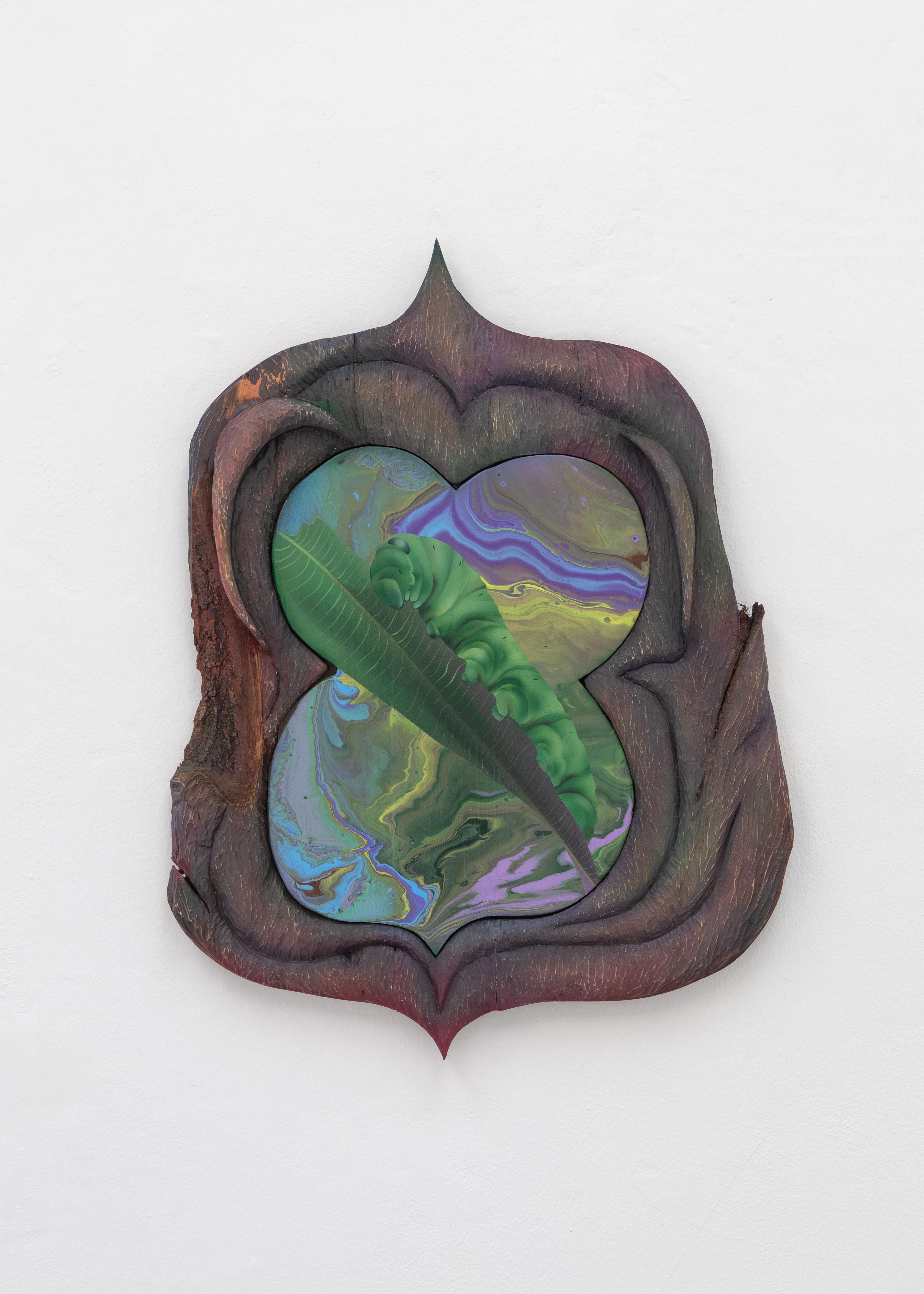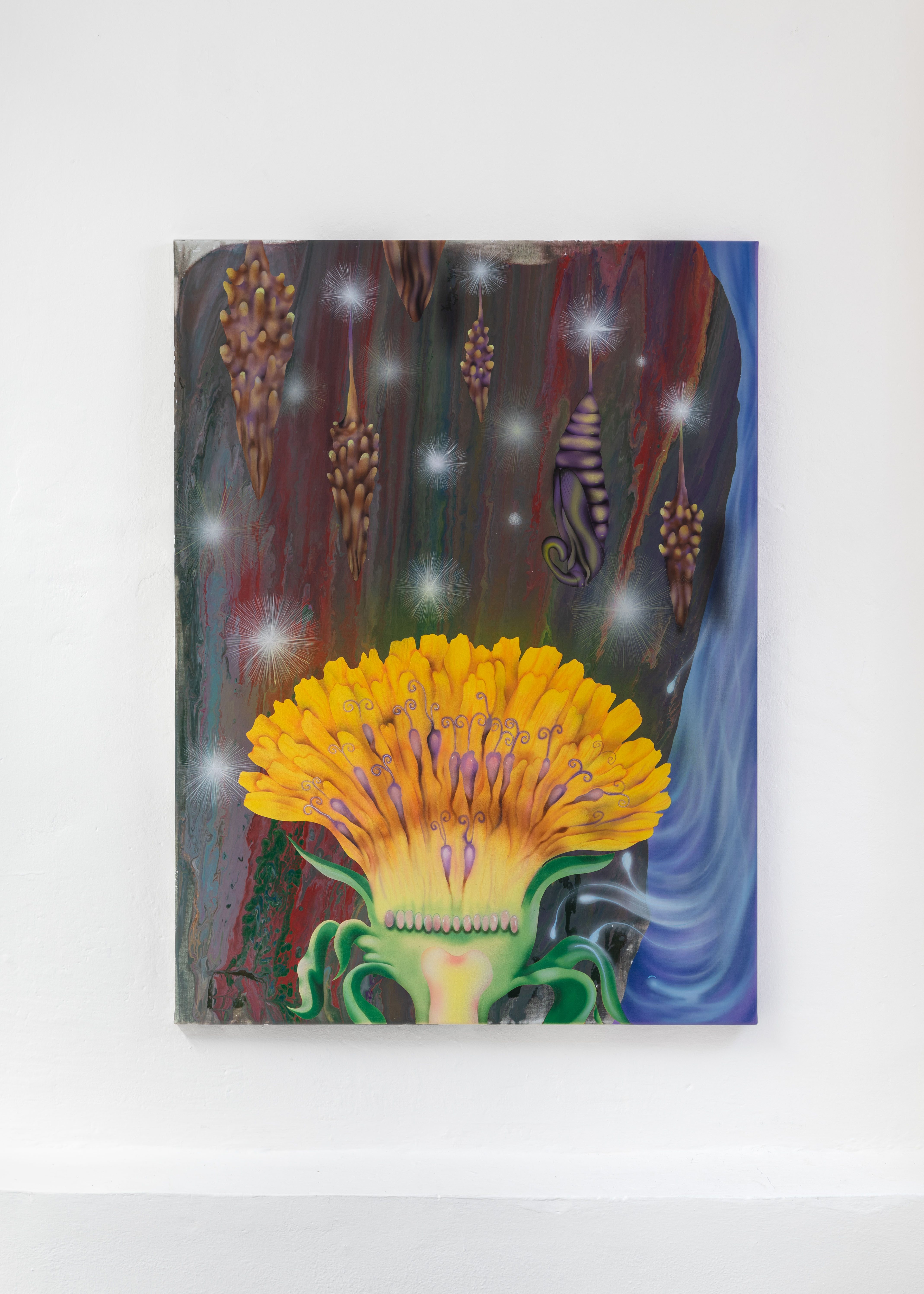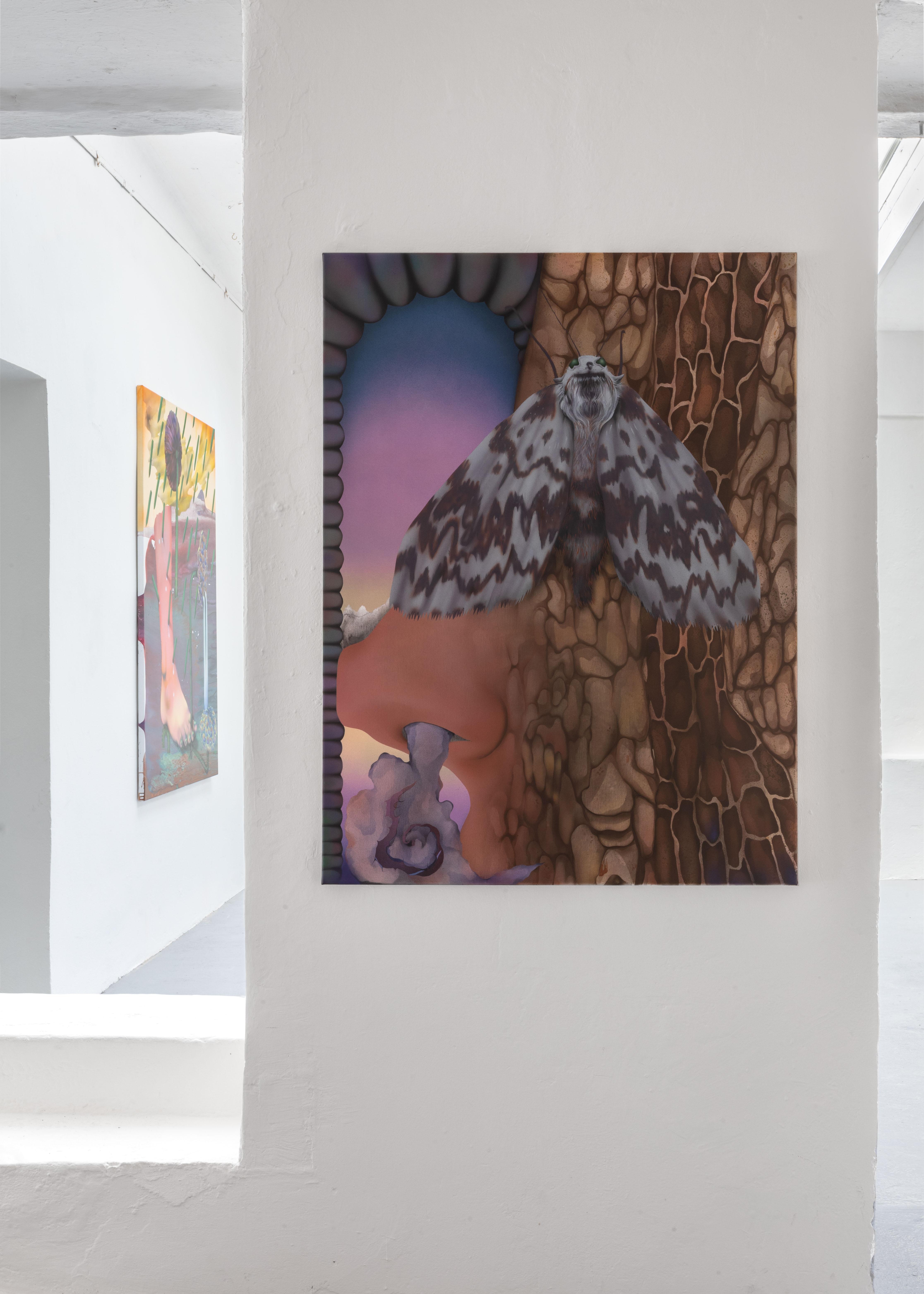 The most sensitive indicator of changes in the delicate balance of the biosphere are insects, whose decline may be one of the last warnings to humanity in the near future. As a result of warmer temperatures, plants and trees are flowering earlier and are thus not in the necessary symbiosis with the time when butterflies lay their eggs and metamorphose. The flowers have no one to pollinate them and the butterflies lose their natural food – the flora they depend on has already bloomed. They must therefore feed on the flowers of alternative plants, which affects their following survival and even their reproduction. A vicious circle is being created, where butterfly and flower species are declining due to human influence, and humanity itself is endangering its future. Thanks to this direct experience with the fragility of biodiversity, Kristína frames her painted microdramas in the shapes of butterfly wings, on the flapping of which the entire biotope, or rather all life on Earth, is proverbially dependent. The paintings, which are paradoxically so compelling for their toxic-stain colours, are populated by butterfly chrysalises - symbols of forced shelter from the world, but also of resilient, changeable and adaptable hope.