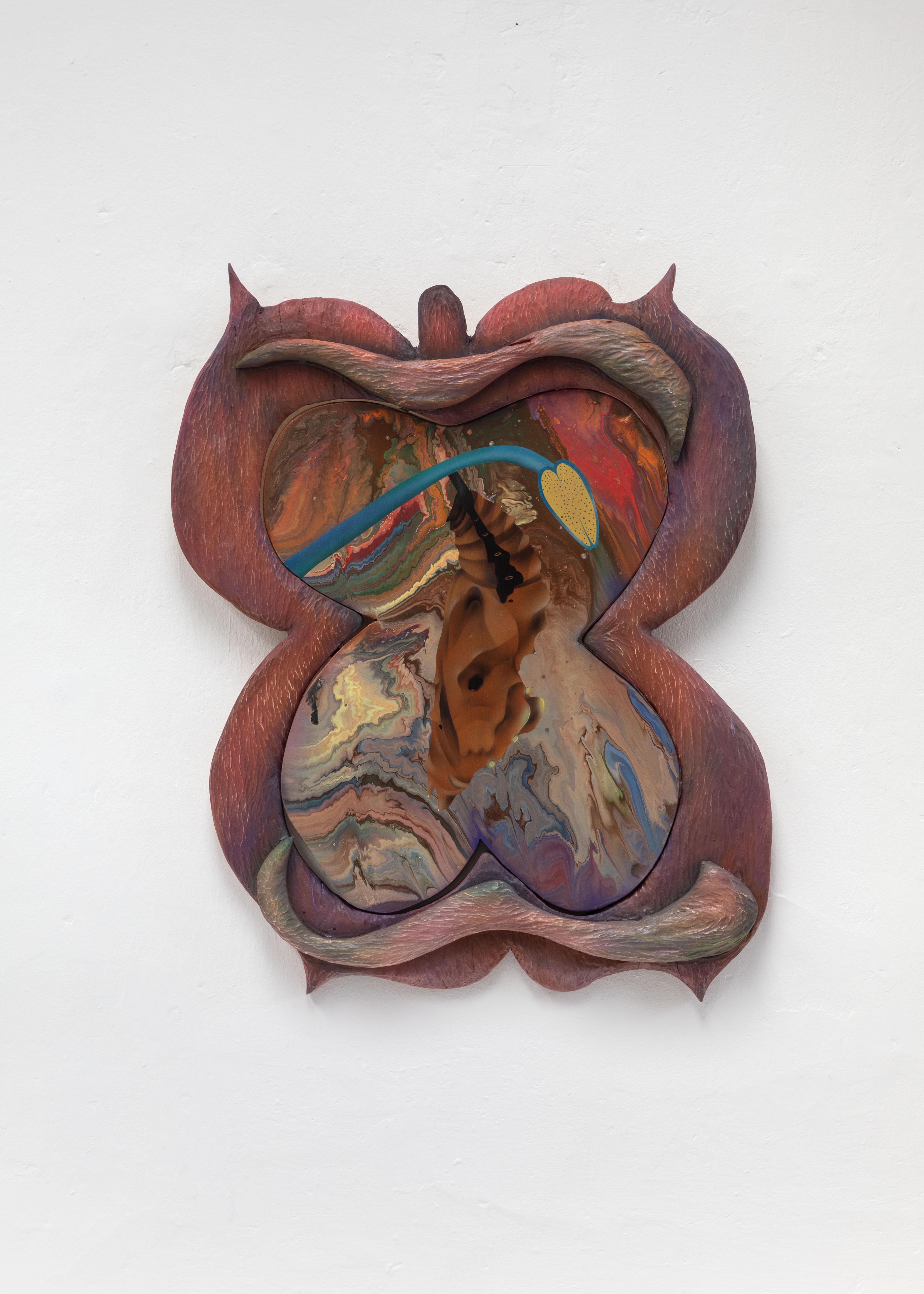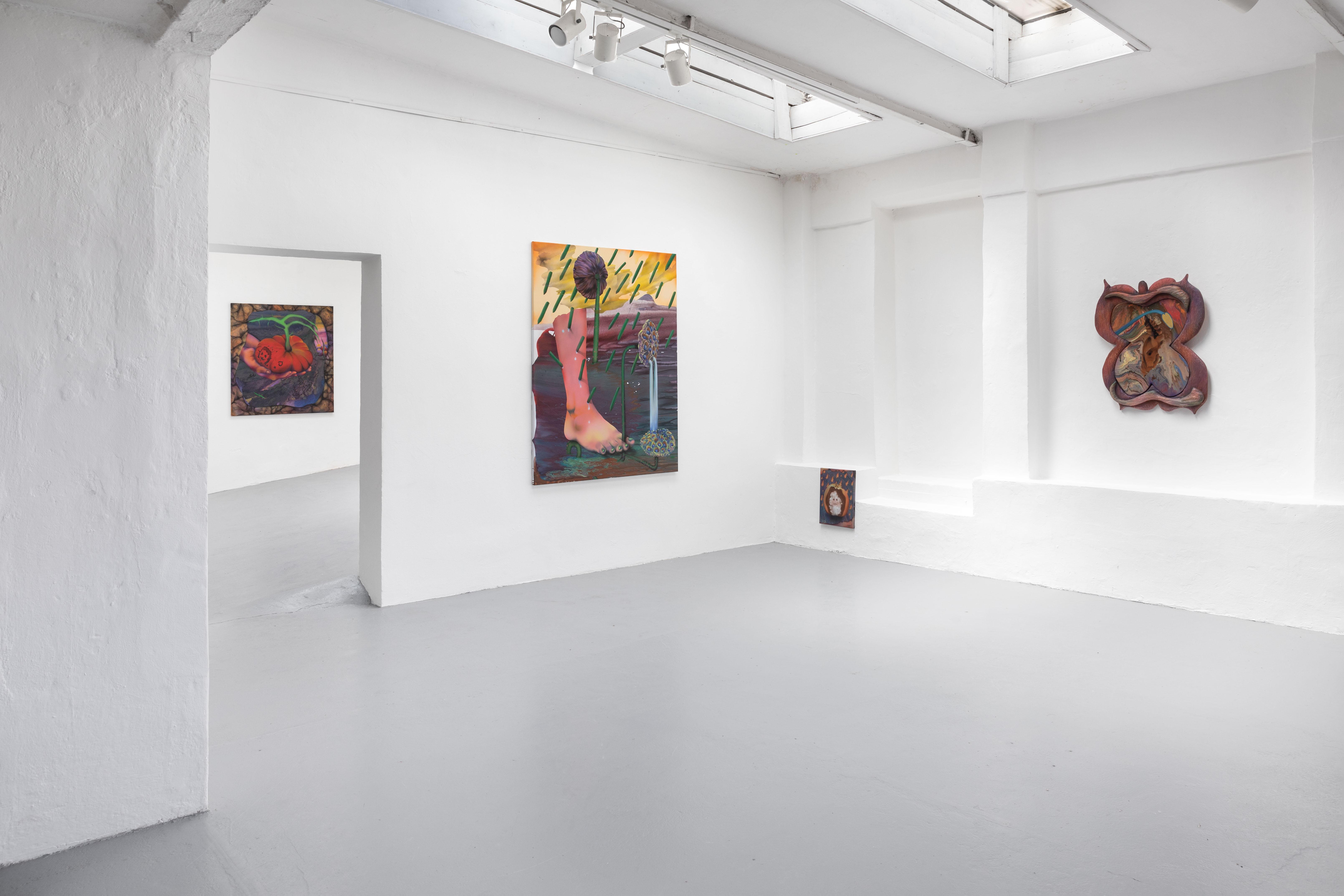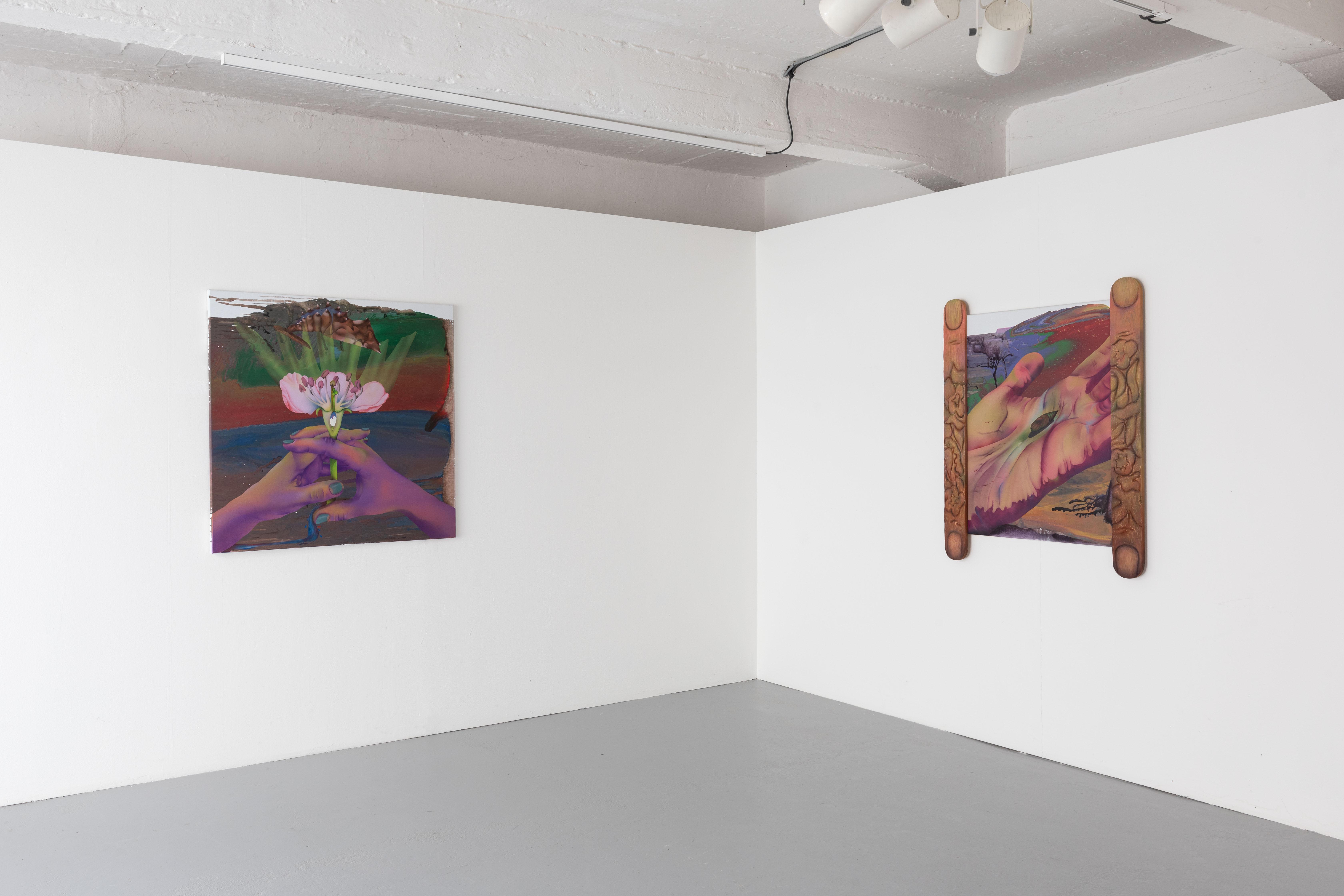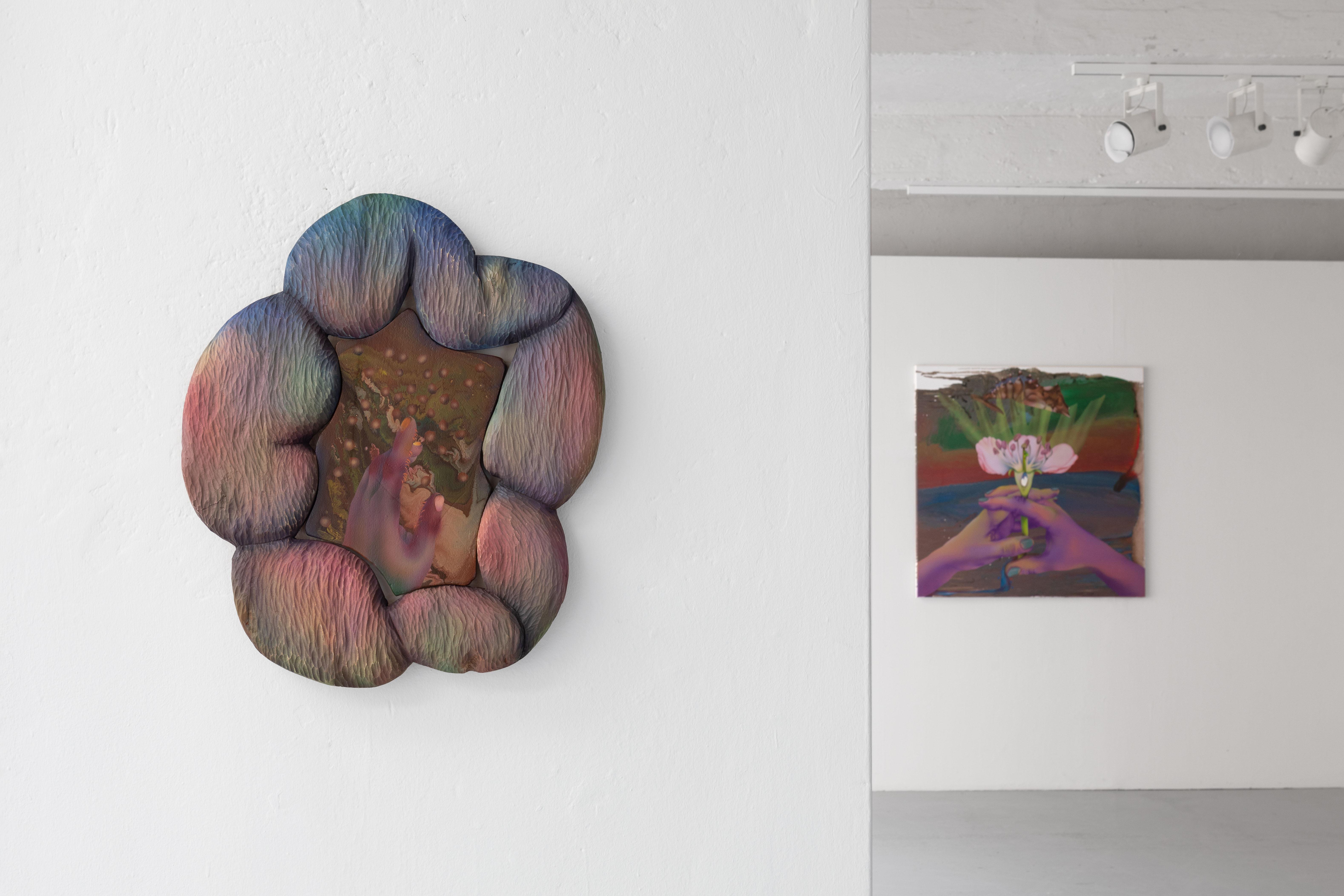 The most sensitive indicator of changes in the delicate balance of the biosphere are insects, whose decline may be one of the last warnings to humanity in the near future. As a result of warmer temperatures, plants and trees are flowering earlier and are thus not in the necessary symbiosis with the time when butterflies lay their eggs and metamorphose. The flowers have no one to pollinate them and the butterflies lose their natural food – the flora they depend on has already bloomed. They must therefore feed on the flowers of alternative plants, which affects their following survival and even their reproduction. A vicious circle is being created, where butterfly and flower species are declining due to human influence, and humanity itself is endangering its future. Thanks to this direct experience with the fragility of biodiversity, Kristína frames her painted microdramas in the shapes of butterfly wings, on the flapping of which the entire biotope, or rather all life on Earth, is proverbially dependent. The paintings, which are paradoxically so compelling for their toxic-stain colours, are populated by butterfly chrysalises - symbols of forced shelter from the world, but also of resilient, changeable and adaptable hope.