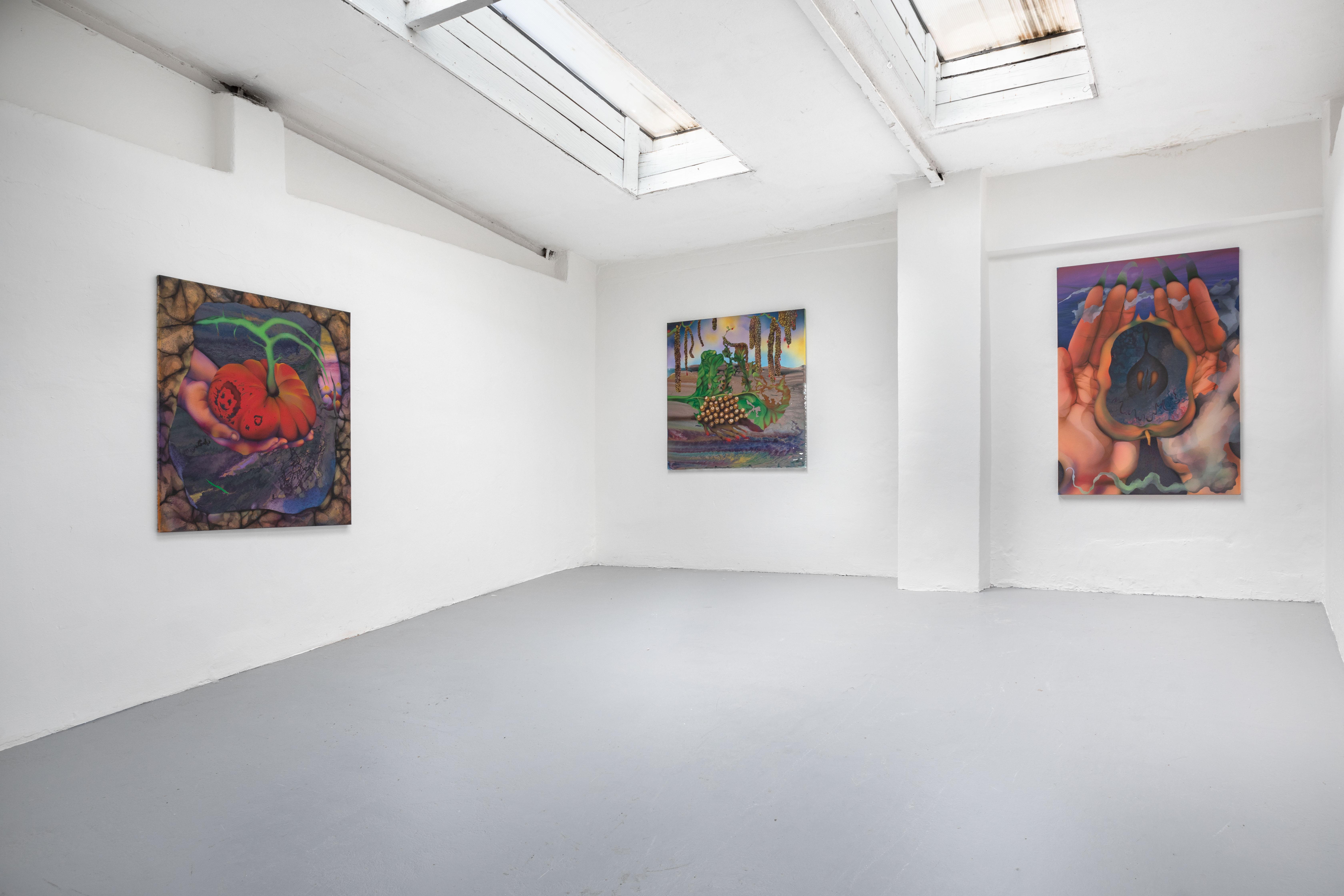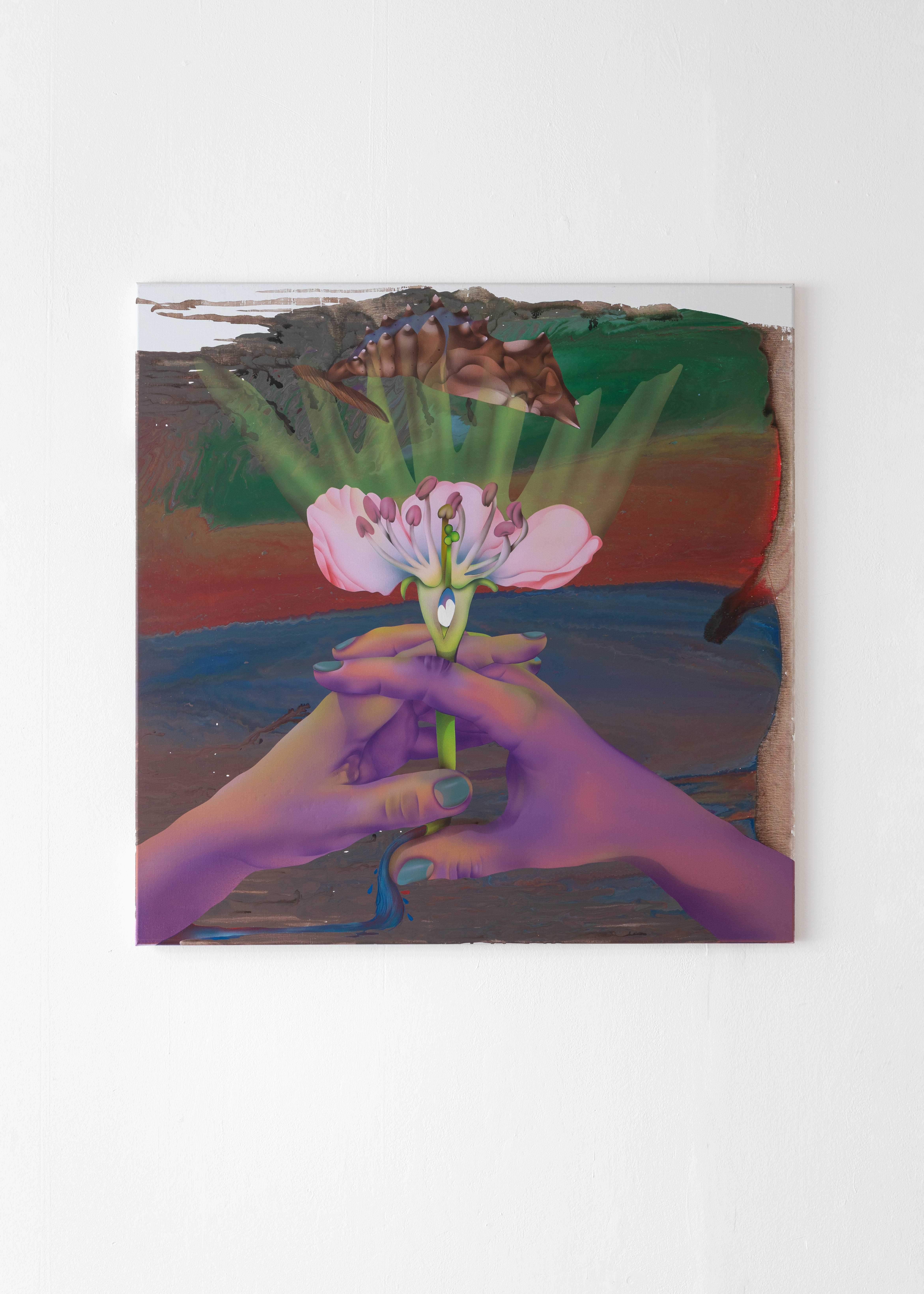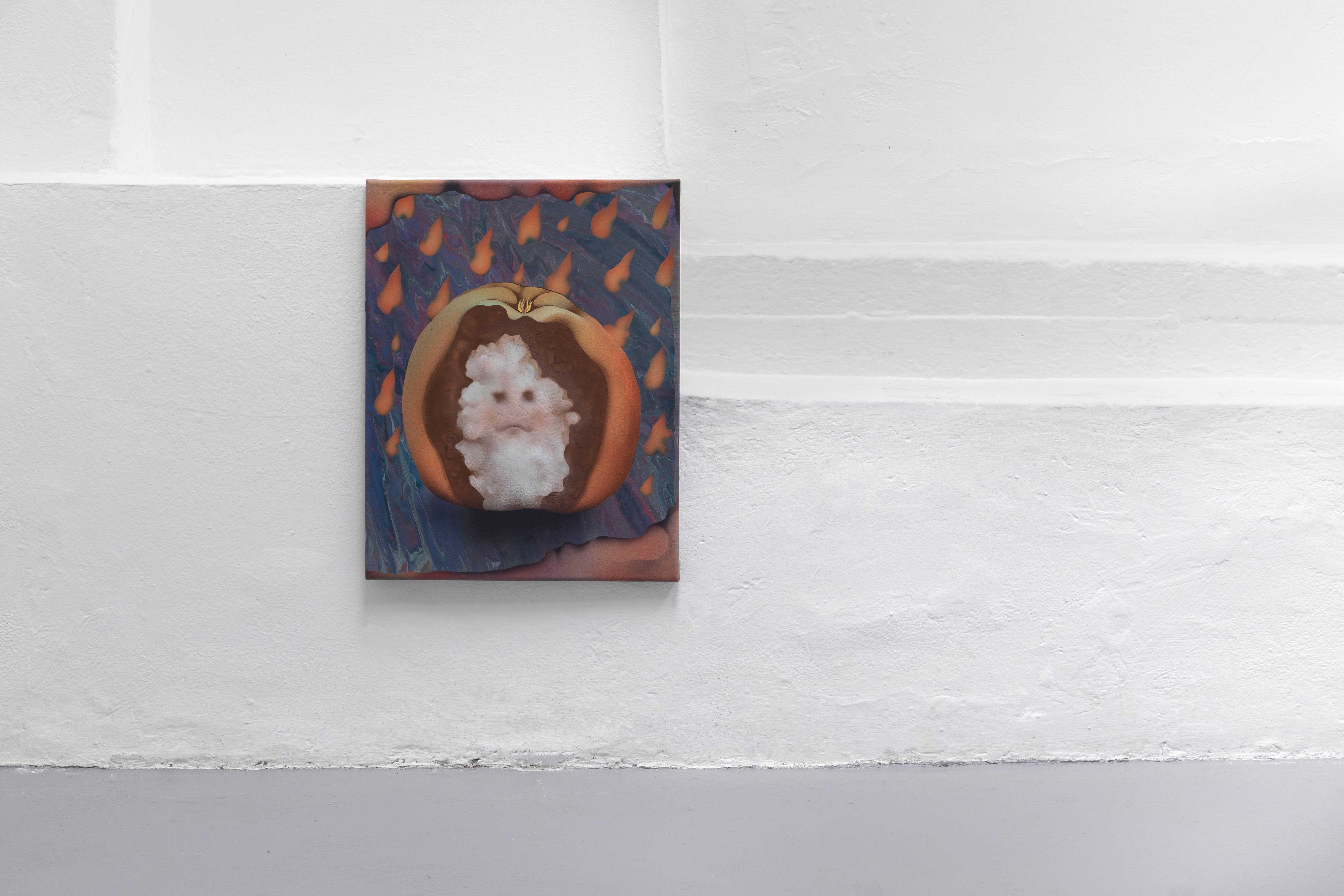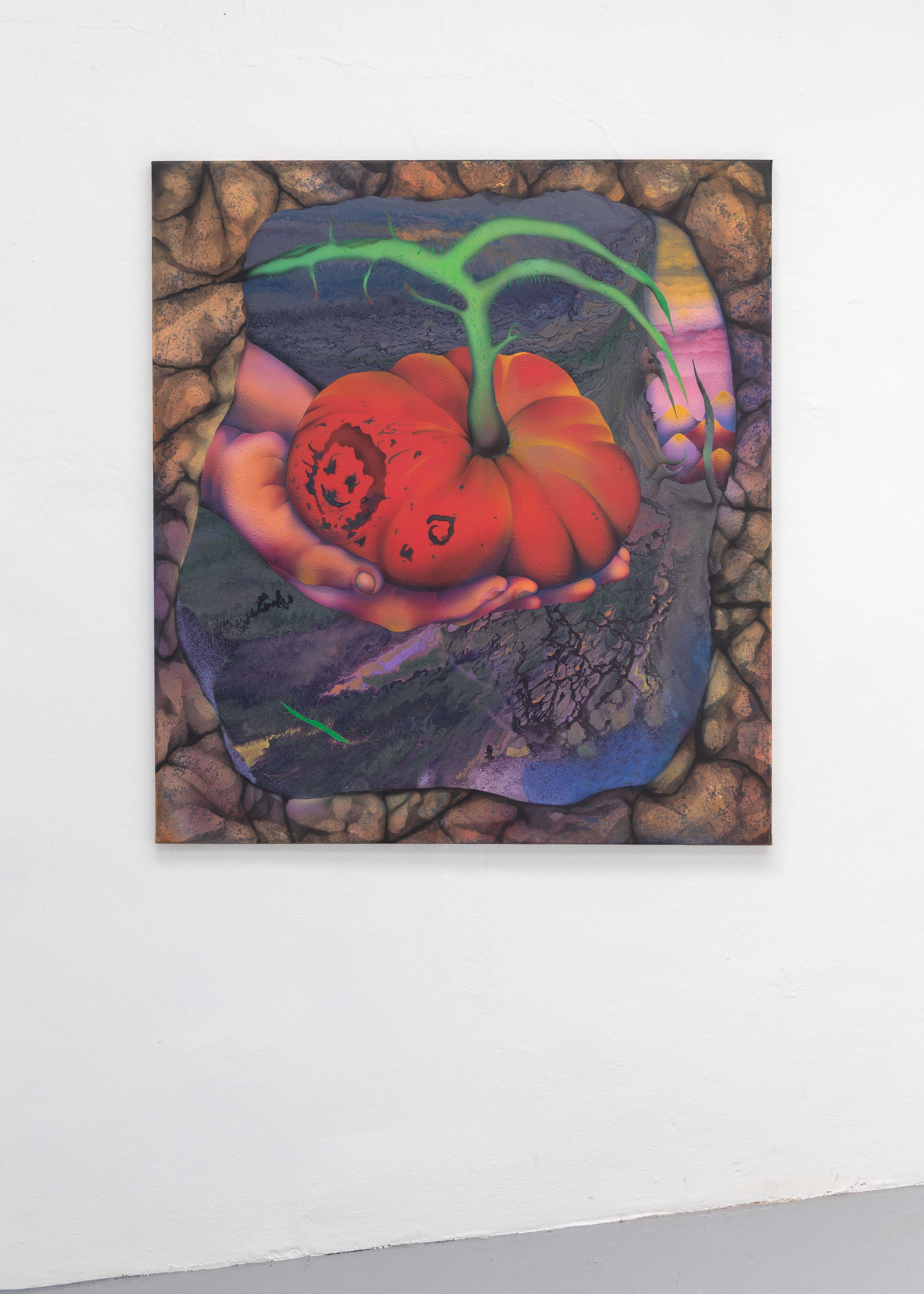 In the same year, Kristína Bukovčáková's paintings also began to settle both thematically and formally around compositions of plants, soil, stones, flowers and fruit. The change in her painting approach, i.e. the transition from classical painting to the airbrush technique, paradoxically brought a visual and thematic heaviness to Kristína. Her originally figurative paintings full of air have become thickened with the structures of tree bark, roots, layers of soil, fruit peels or pansy flowers, reminiscent of martial ritual masks. But is it possible, in a time increasingly struggling with the consequences of climate change, to paint images full of natural elements and maintain a purely positive, celebratory or romantic attitude towards nature? Certainly not for Kristína – in her paintings, from the very beginning, fruit rots, plant offshoots struggle gruellingly to survive, drops of water seem to be the last to wet the flowers of carnivores for a long time, and pests nibble leaves into anthropomorphic shapes. It is probably symptomatic that the various moulds, rots and pests in the garden, fabricated with the help of pomology books, gardening manuals and atlases, were the imaginary heroes of her paintings at the height of the covid pandemic.