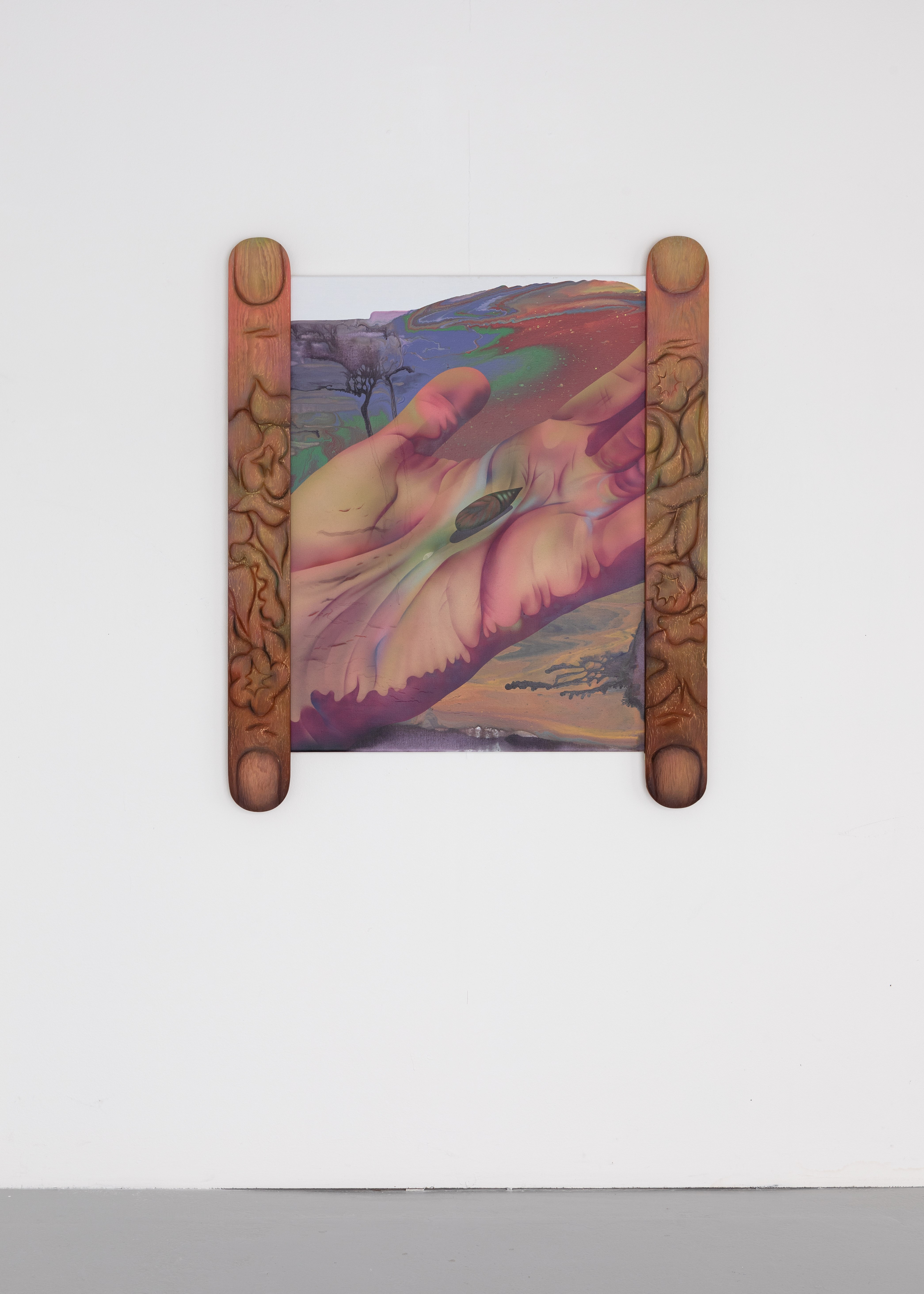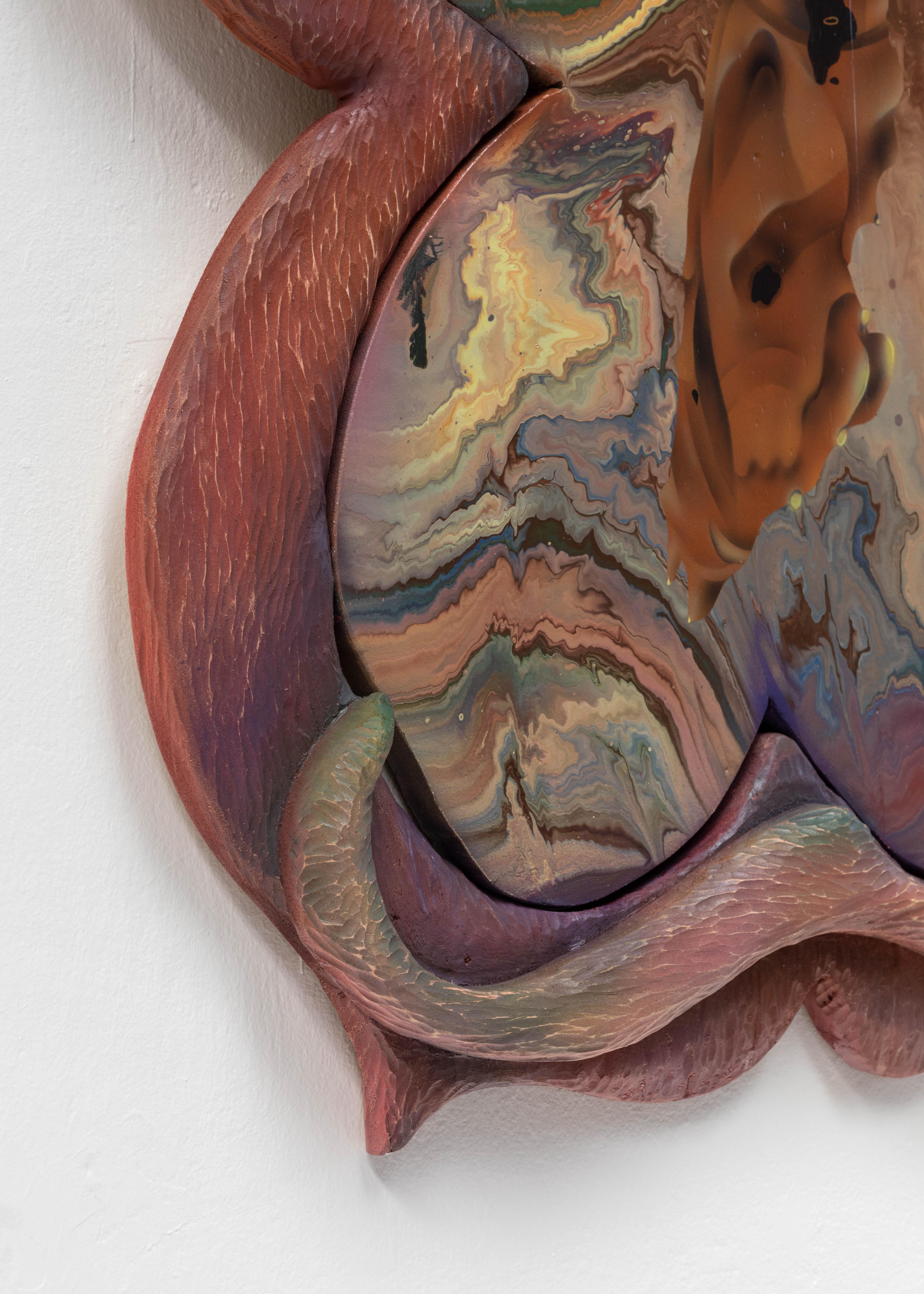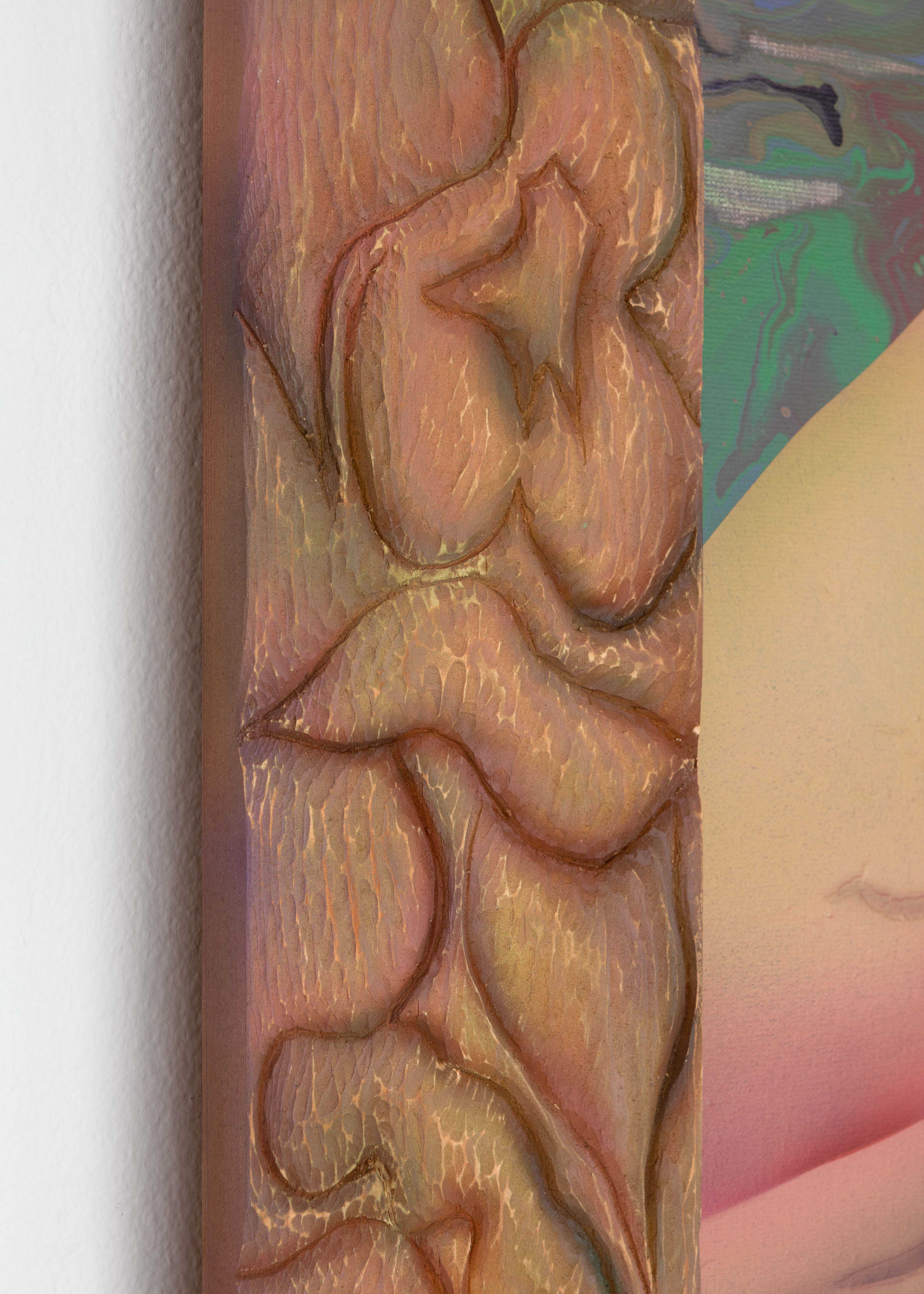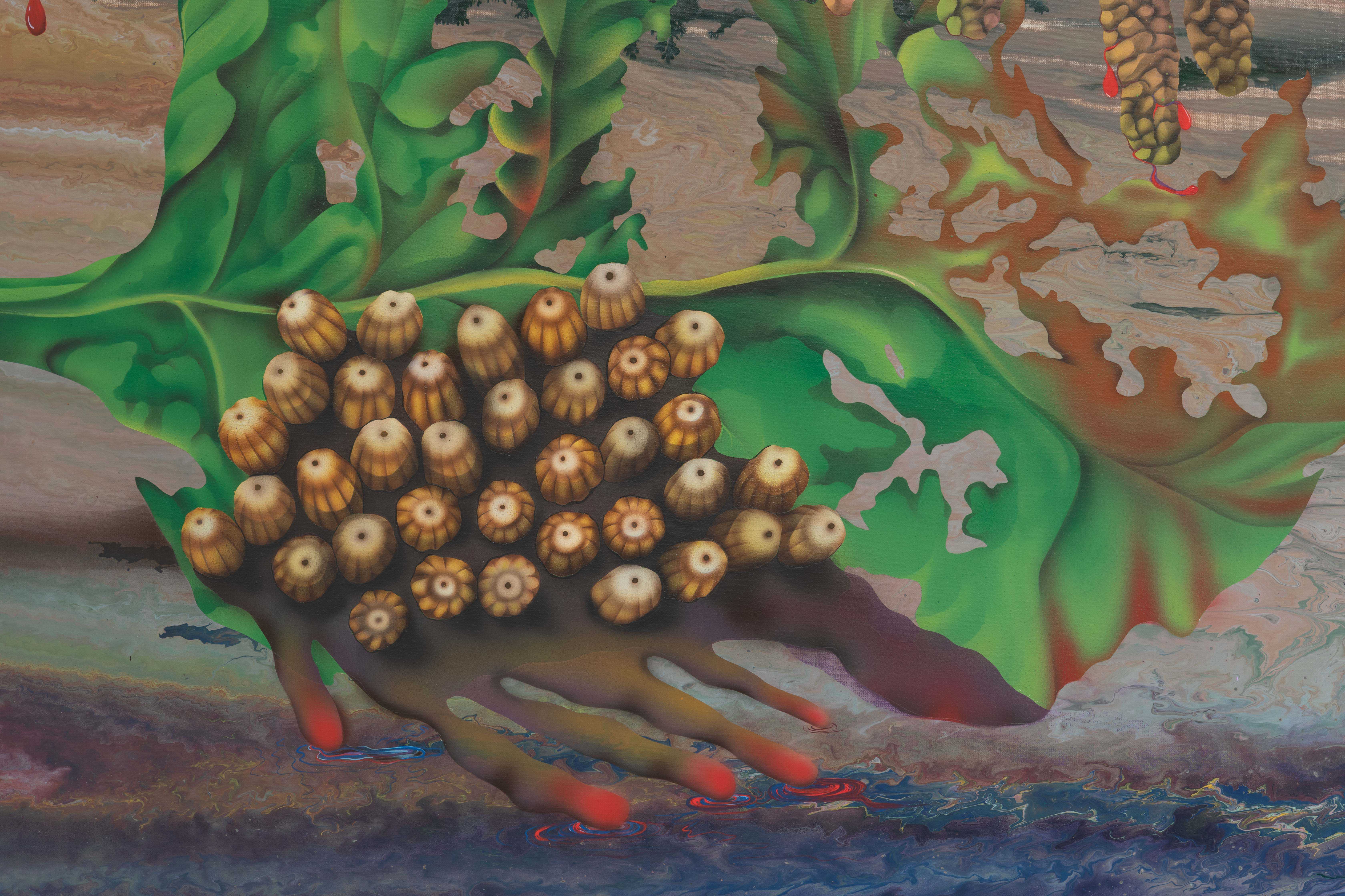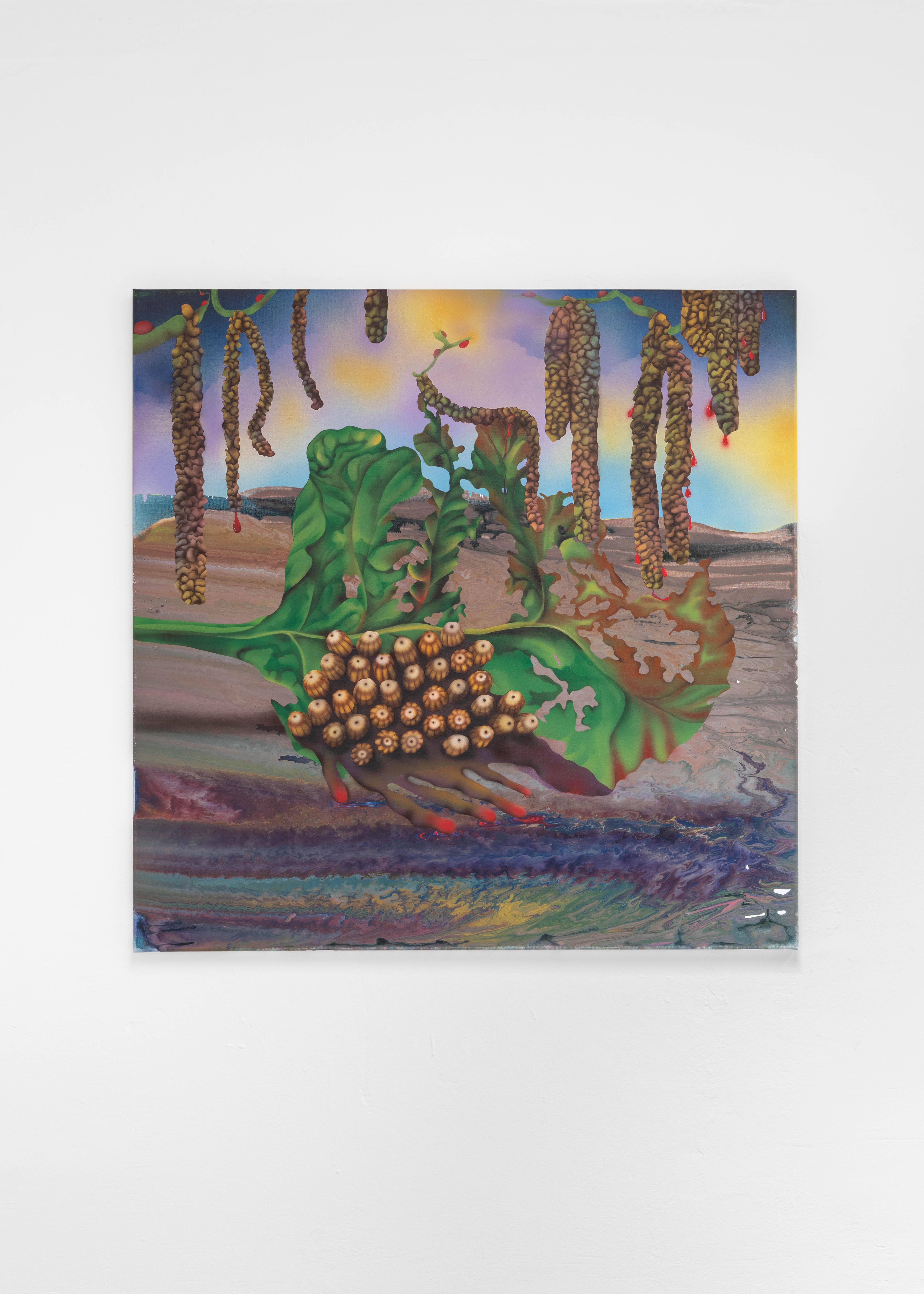 In the same year, Kristína Bukovčáková's paintings also began to settle both thematically and formally around compositions of plants, soil, stones, flowers and fruit. The change in her painting approach, i.e. the transition from classical painting to the airbrush technique, paradoxically brought a visual and thematic heaviness to Kristína. Her originally figurative paintings full of air have become thickened with the structures of tree bark, roots, layers of soil, fruit peels or pansy flowers, reminiscent of martial ritual masks. But is it possible, in a time increasingly struggling with the consequences of climate change, to paint images full of natural elements and maintain a purely positive, celebratory or romantic attitude towards nature? Certainly not for Kristína – in her paintings, from the very beginning, fruit rots, plant offshoots struggle gruellingly to survive, drops of water seem to be the last to wet the flowers of carnivores for a long time, and pests nibble leaves into anthropomorphic shapes. It is probably symptomatic that the various moulds, rots and pests in the garden, fabricated with the help of pomology books, gardening manuals and atlases, were the imaginary heroes of her paintings at the height of the covid pandemic.