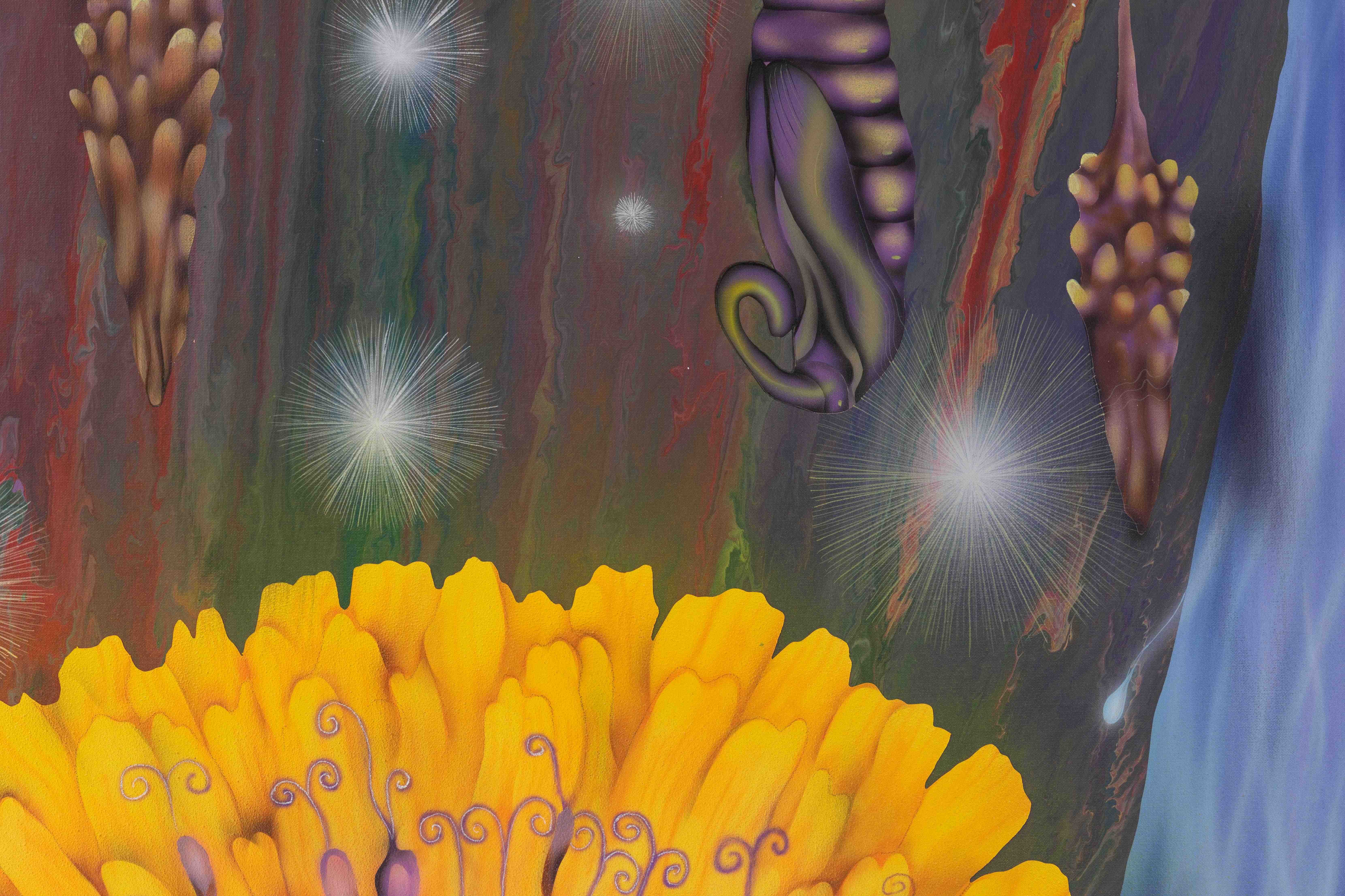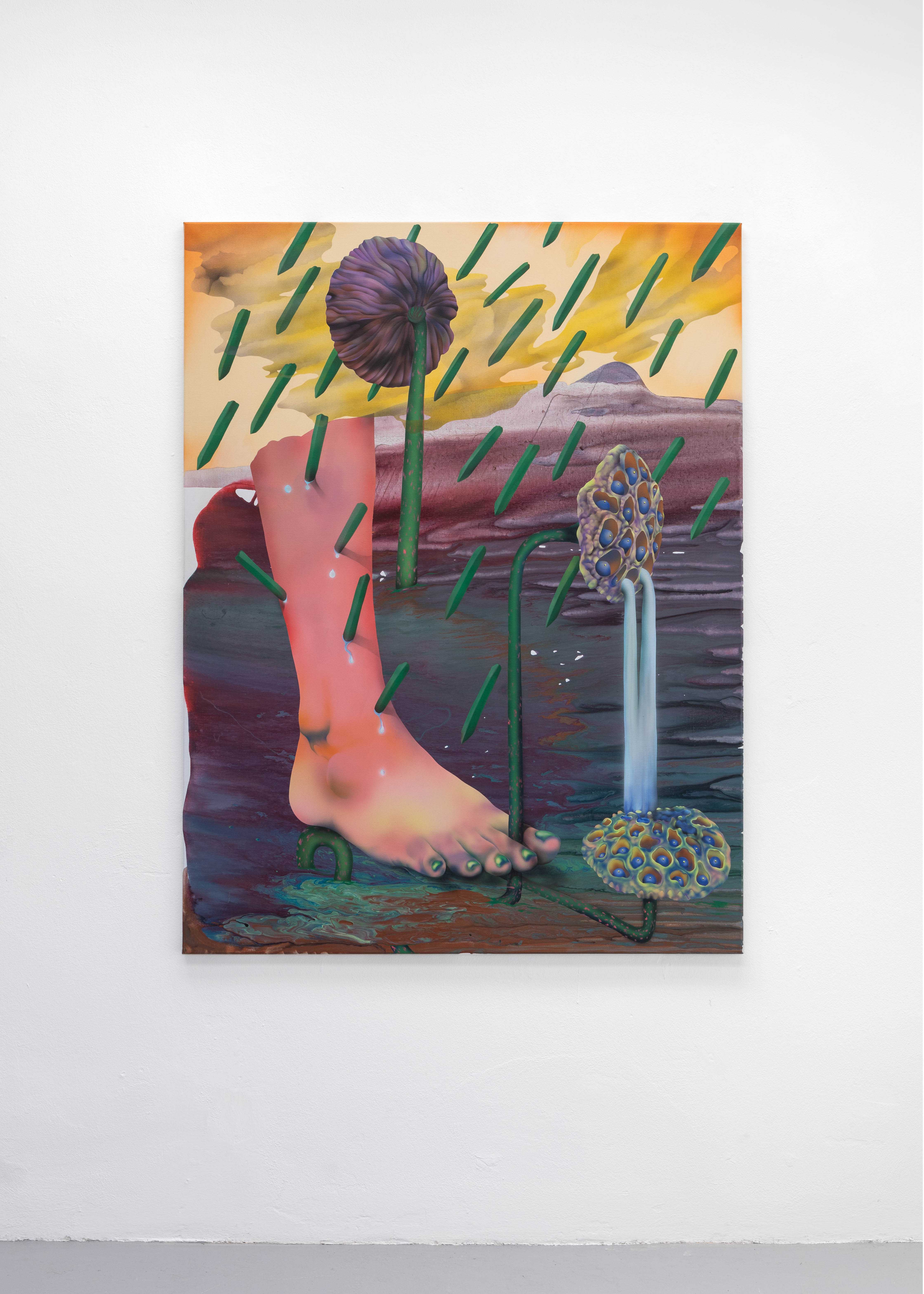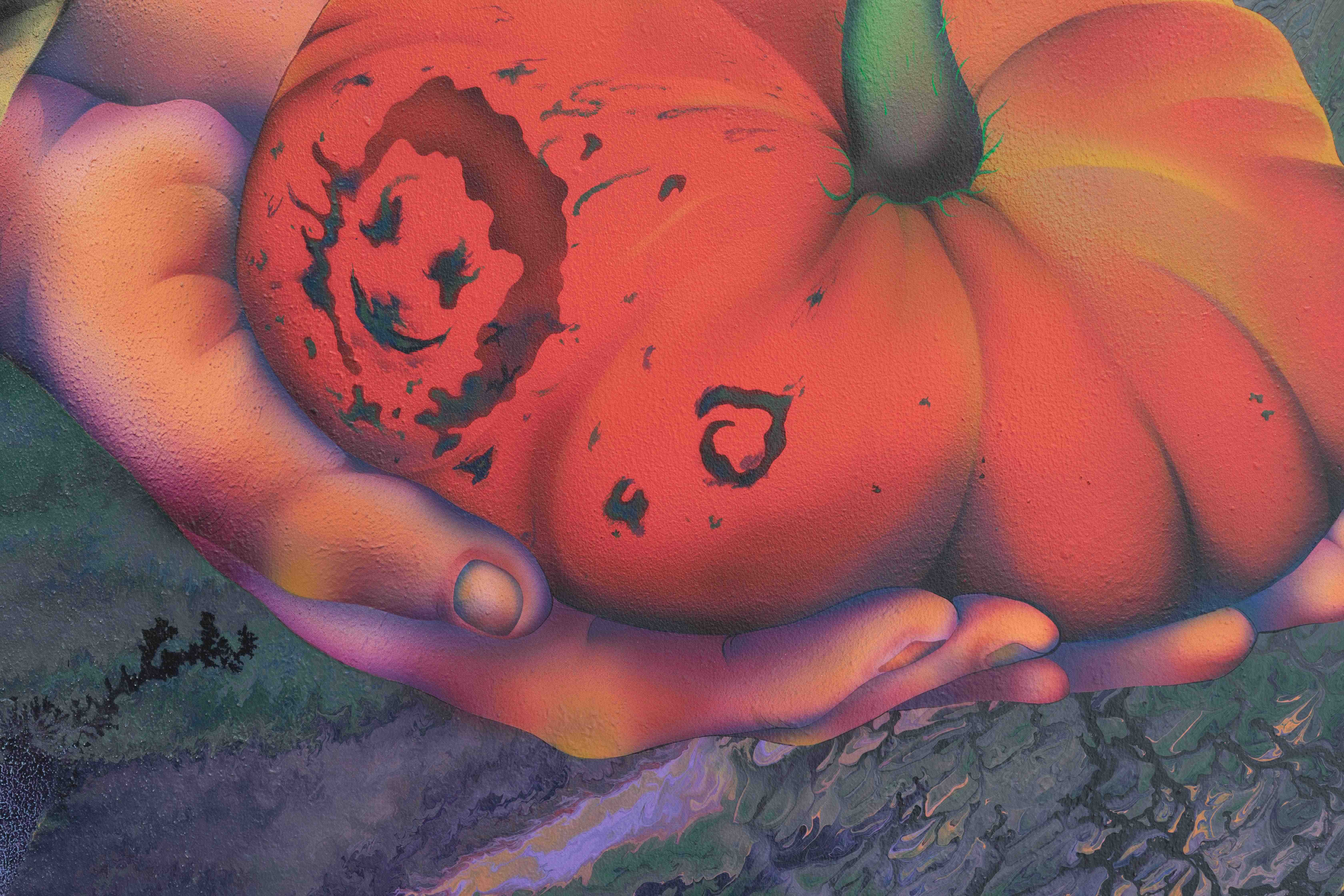 Kristína's current paintings, thanks to her new experience with her own garden, further deepen the personification of plant details, the interspecies intermingling of life forms, and especially the anthropomorphization of symbols of devastation. The rot on a pumpkin skin has a human face, a human foot bends the stem of a lotus – a symbol of fertility and eternity, a dead leaf withers into the shape of a human hand and choking smoke comes out of a human nose. Although the pursuit of permaculture, species diversity, and concern for her own garden microcosm fills Kristína's time to the point of competing with her time for painting, all of the pernicious human body parts in the paintings are hers. They may thus be an intuitive complain that, despite all our efforts, we cannot escape our destructive anthropocenrist position.