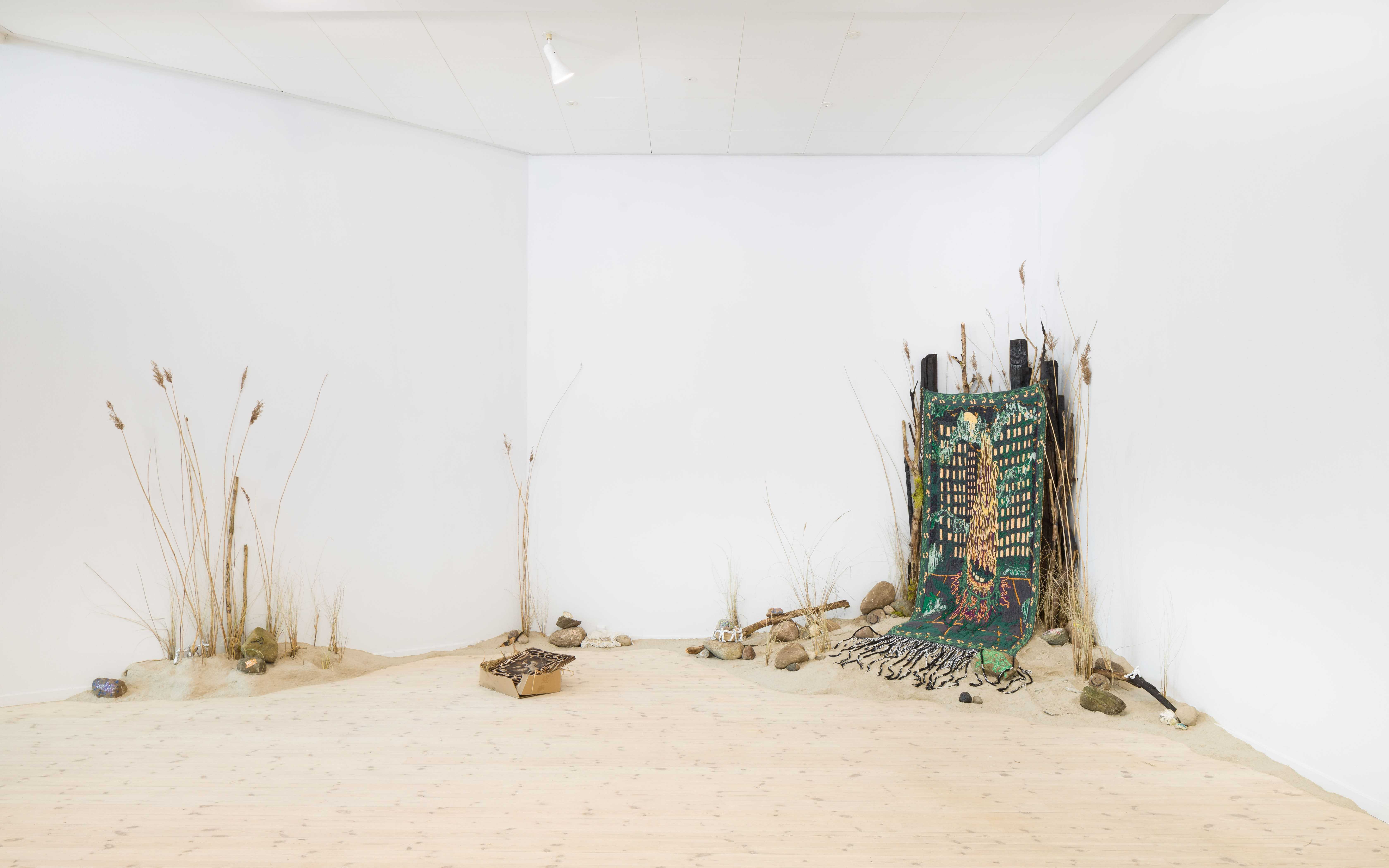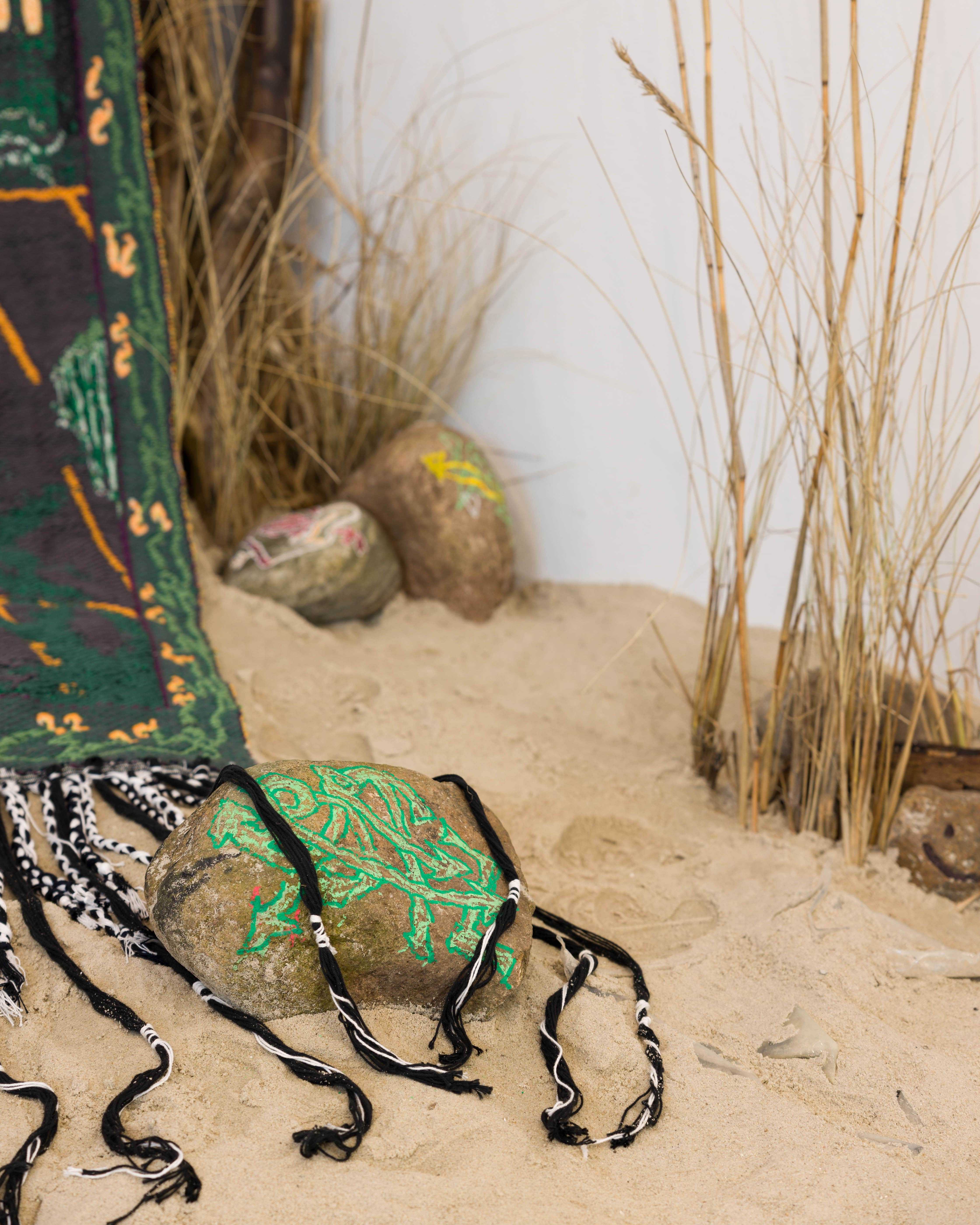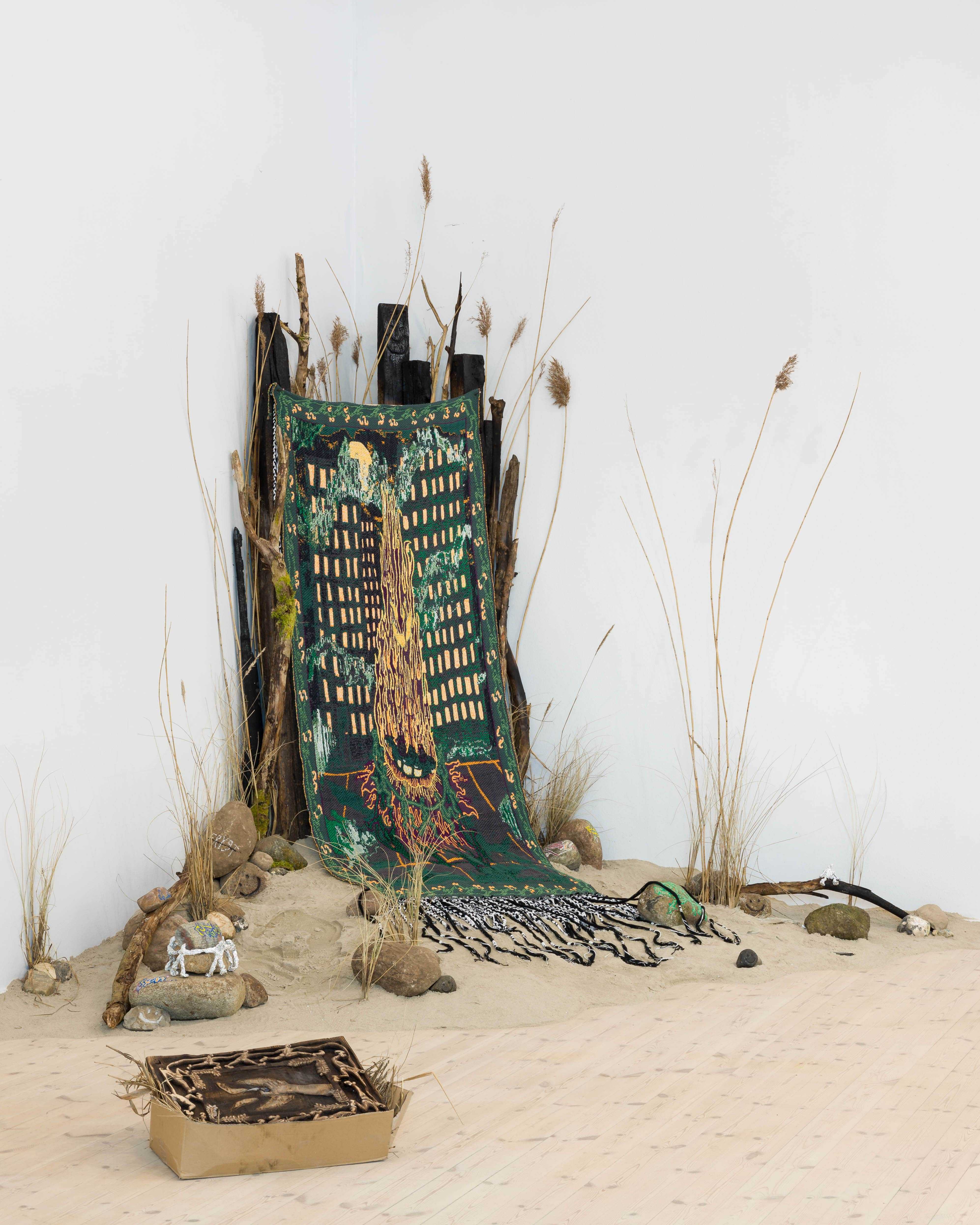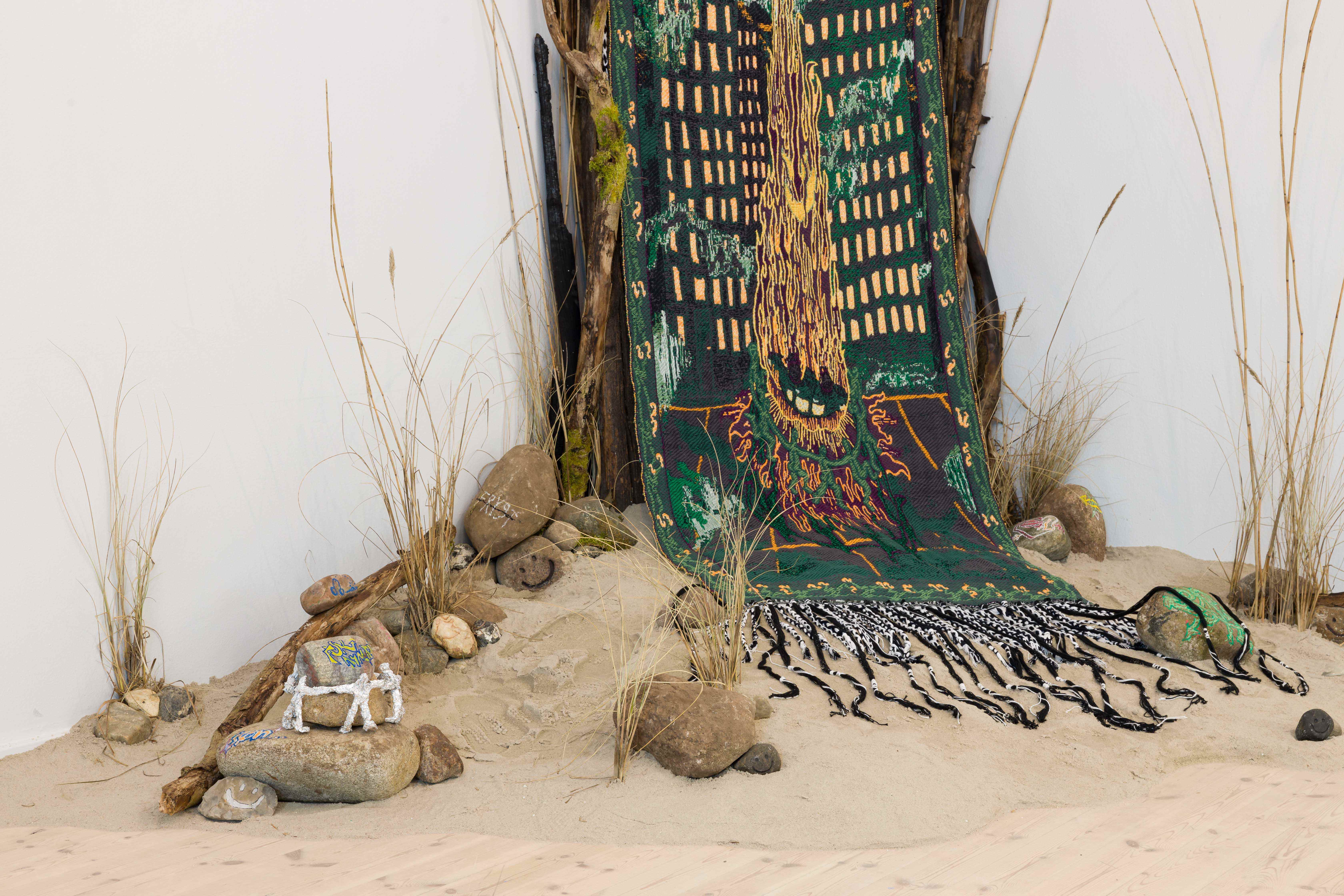 Tapestry (1OO% cotton), burnt wood, natural stone, posca marker, spray paint, plants, sand.