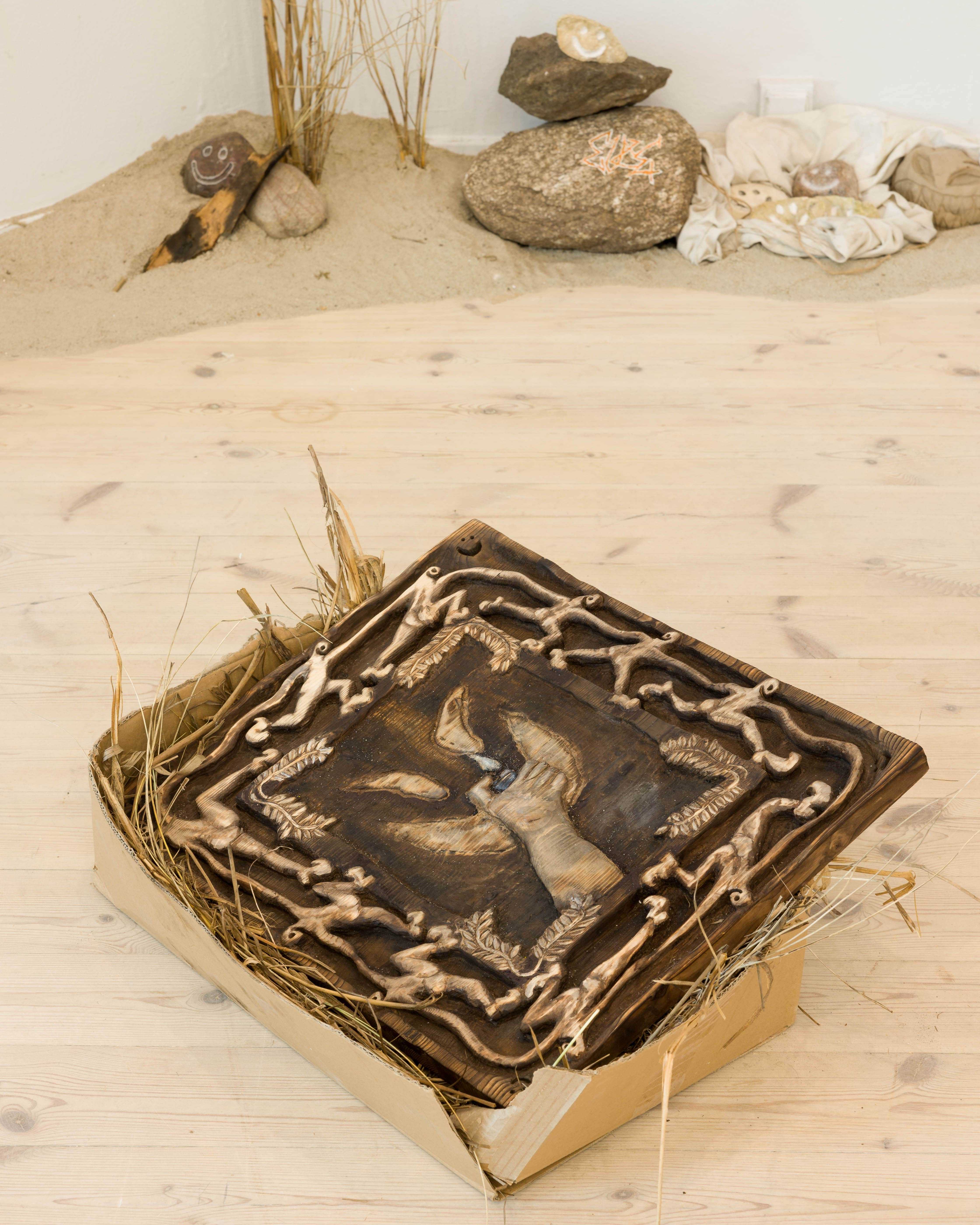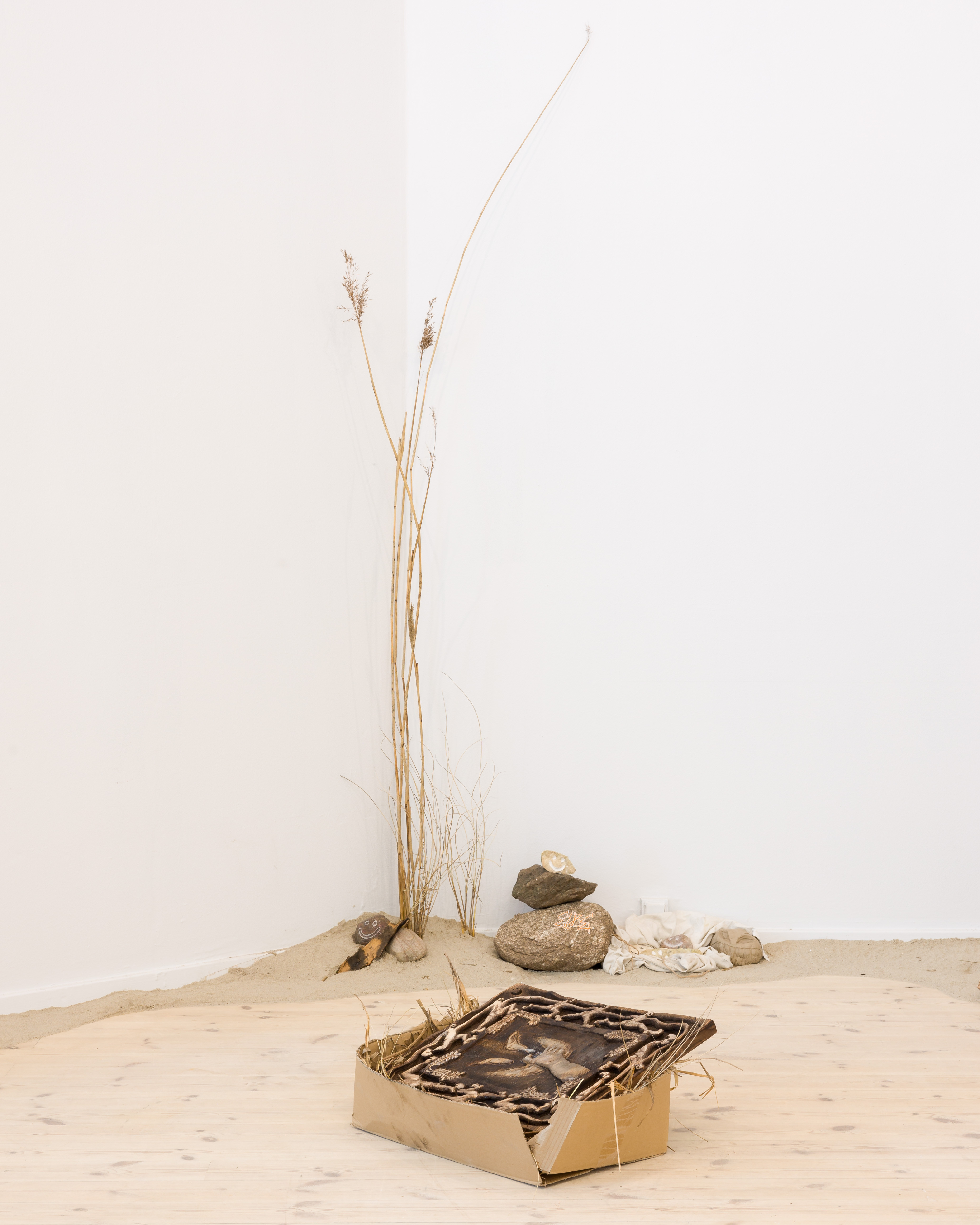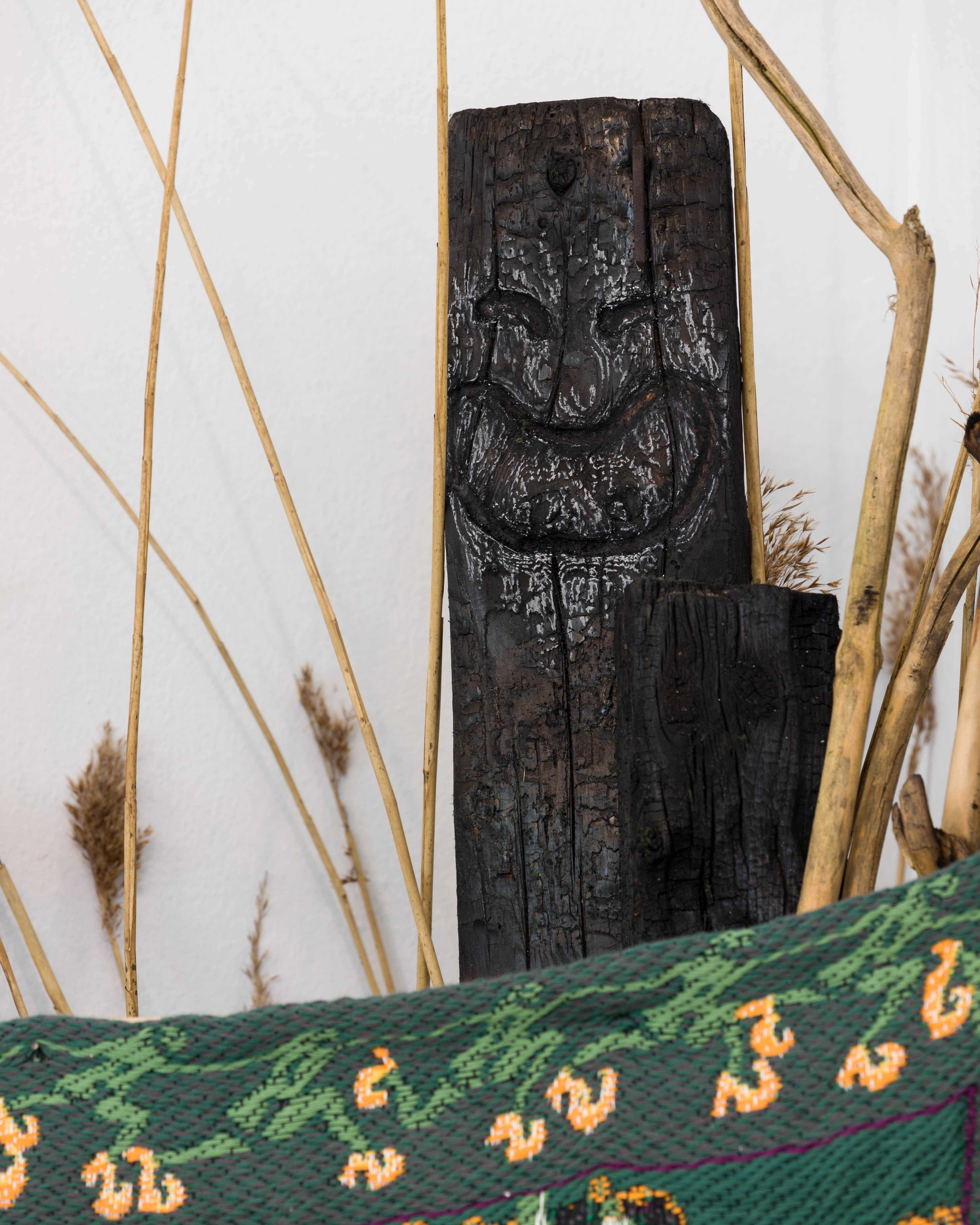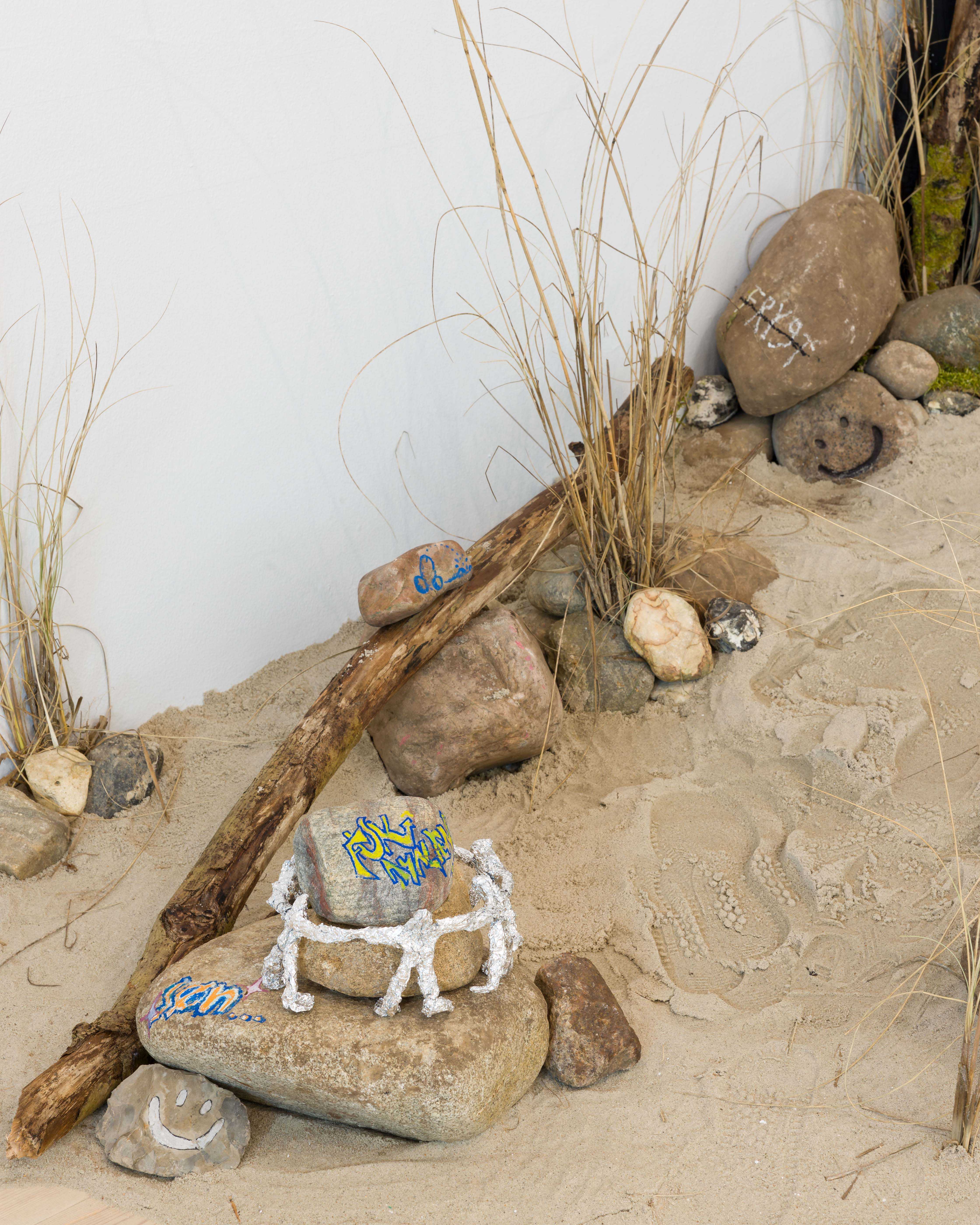 Tapestry (1OO% cotton), burnt wood, natural stone, posca marker, spray paint, plants, sand.