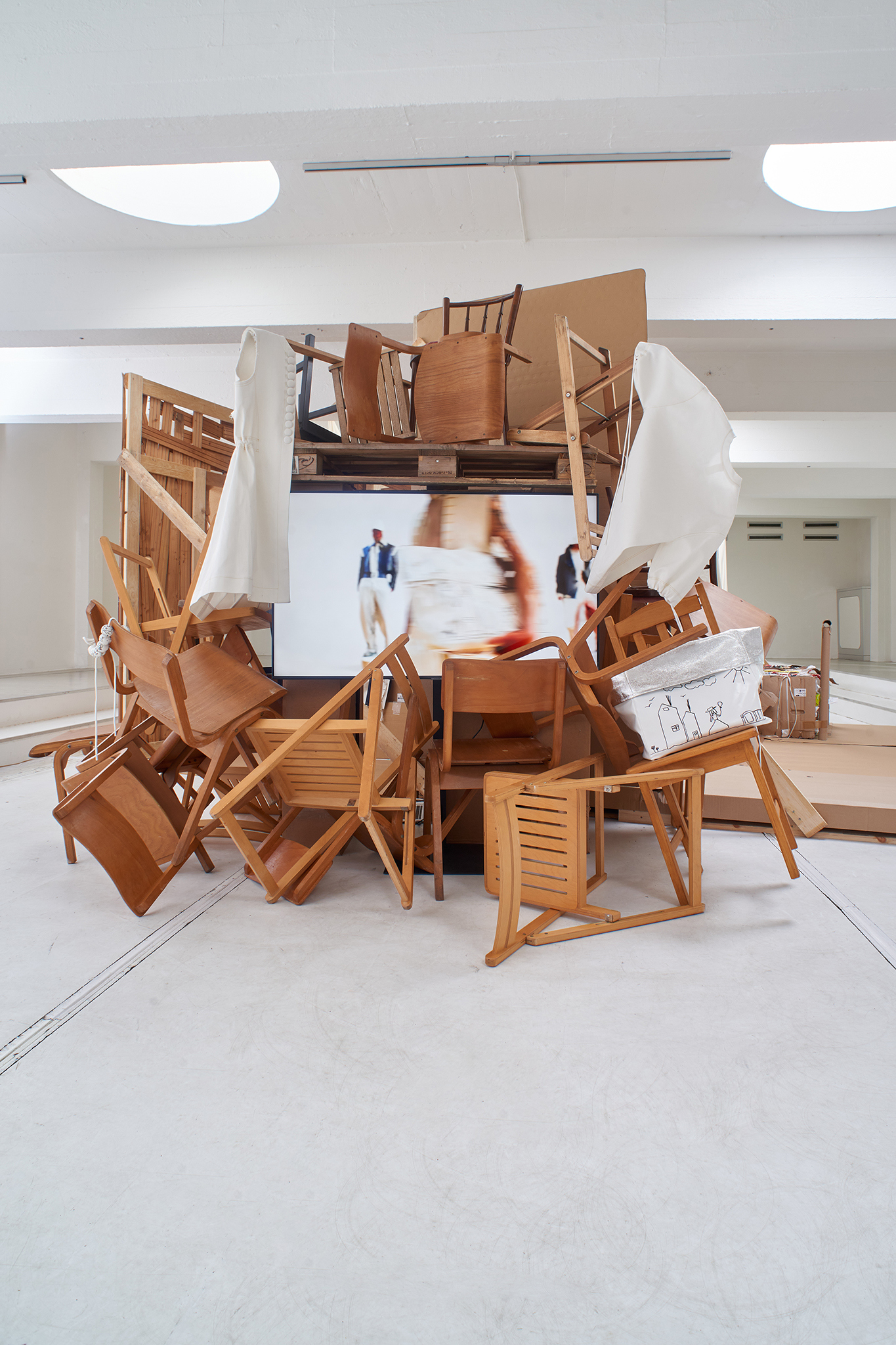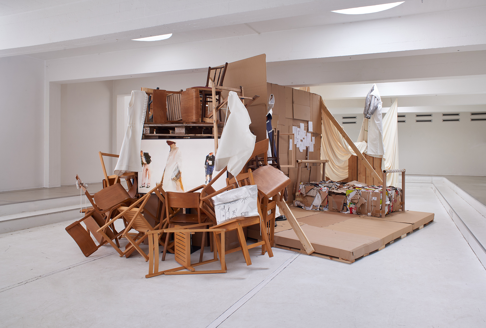 Measuring 5.40m x 8.55m x 3.25m, the installation features an extensive, amorphous structure linking various visual scenes. Carefully curated found objects, ingeniously collaged, create scenographic universes that evoke the joyous exploration and imitation of adult worlds experienced during childhood. These include a children's room, a castle made of stacked chairs, a puppet theater, and a cave made of draped fabric.