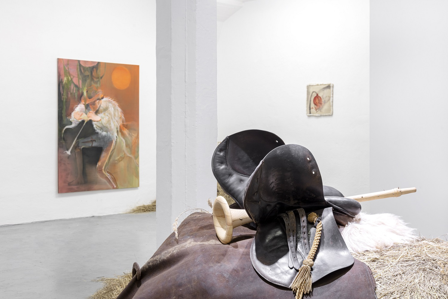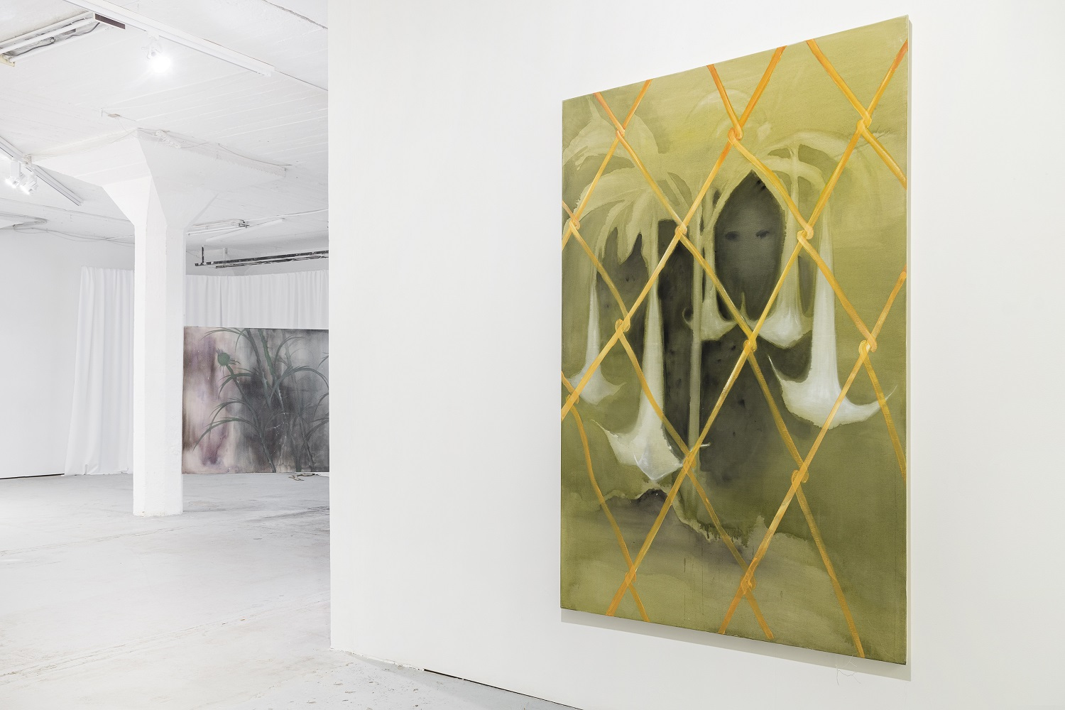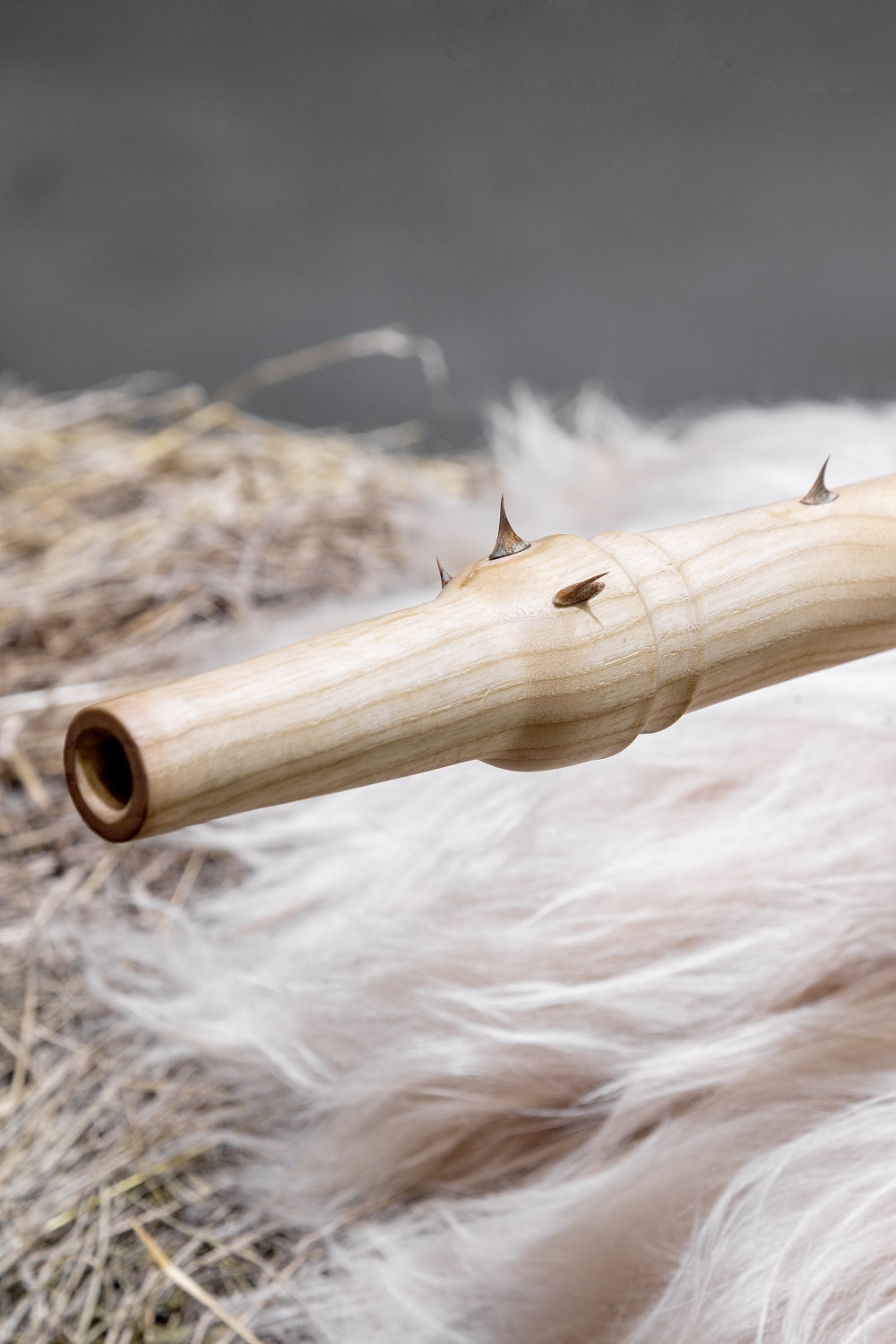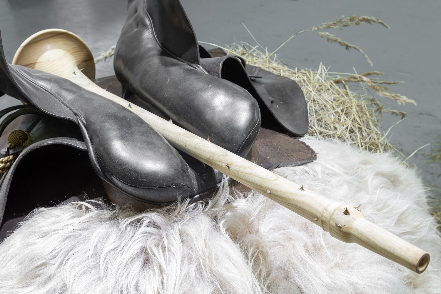The flute dominates, even though it is a ridiculous instrument that we all learn to play as small children. There is no one who has never played it. I follow up on the shape of the Jimsonweed, which I call the “angel trumpet” in my paintings. Despite its laughable and mischief nature, the flute is a tool for manipulation, hypnosis, temptation and misdirection. The Pied Piper used his flute to control all living creatures. The spines and exaggerated size of the flute represent its dominance. I like to think of the exhibition in a museum-like way, as if there are objects associated with this event, a warning, a curiosity for future generations.