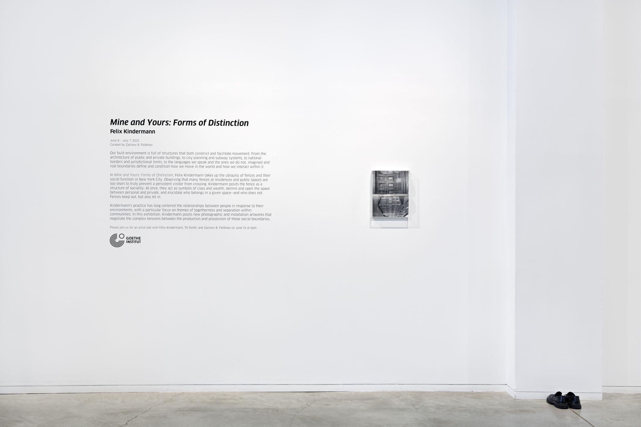 In Mine and Yours: Forms of Distinction, Felix Kindermann takes up the ubiquity of fences and their social function in New York City. Observing that many fences at residences and public spaces are too short to truly prevent a persistent visitor from crossing, Kindermann posits the fence as a structure of sociality. At once, they act as symbols of class and wealth, delimit and open the space between personal and private, and elucidate who belongs in a given spaceâand who does not. Fences keep out, but also let in.
