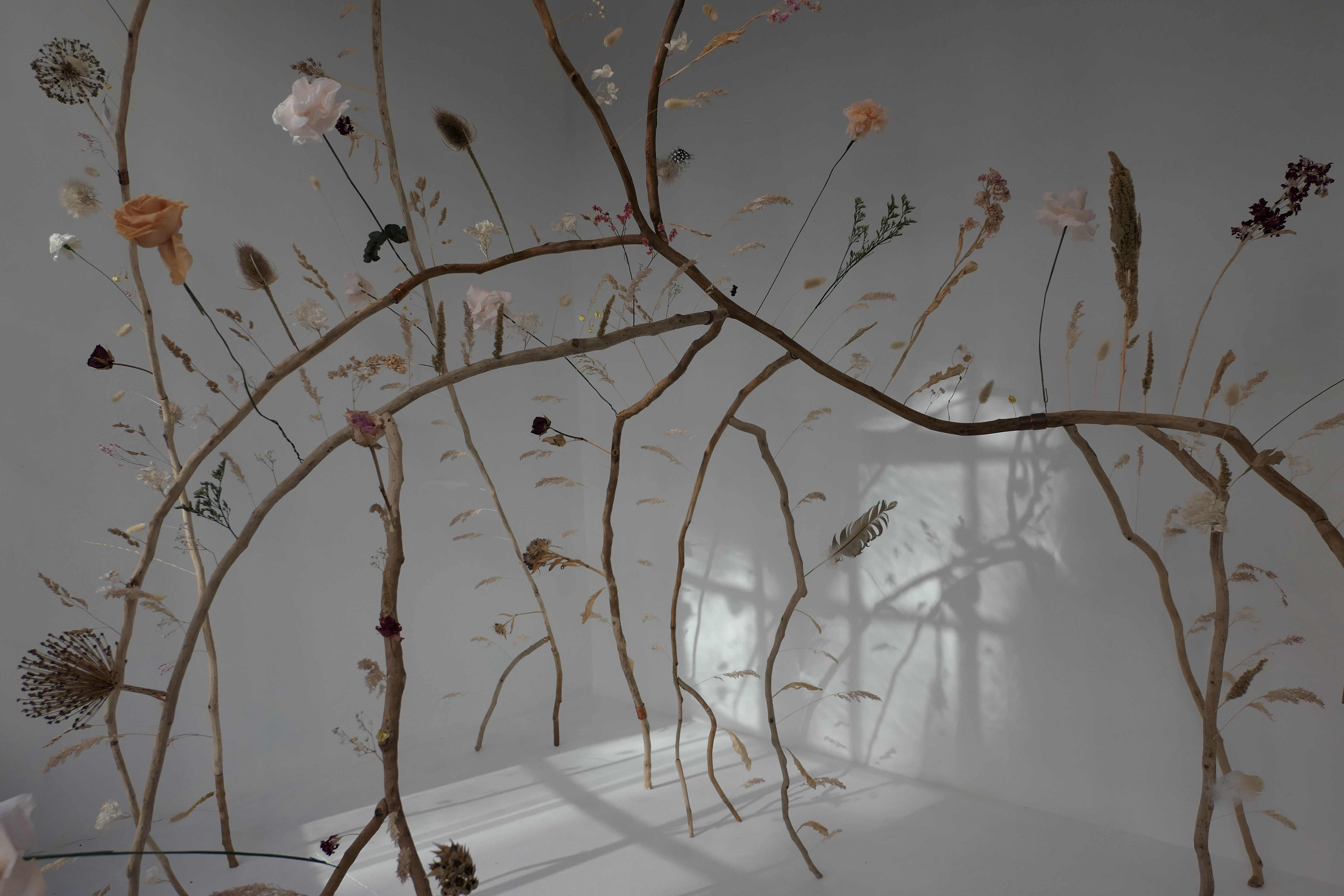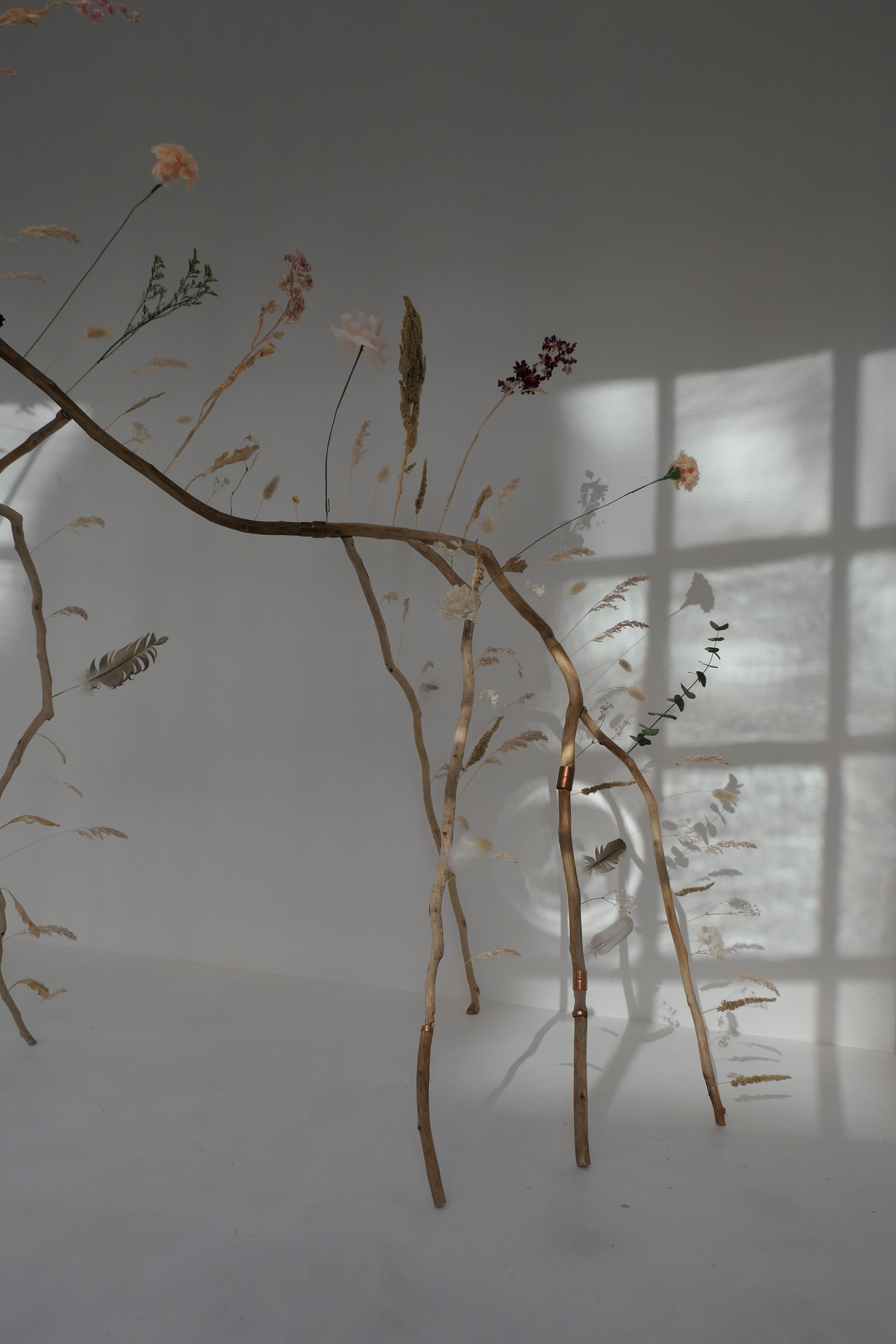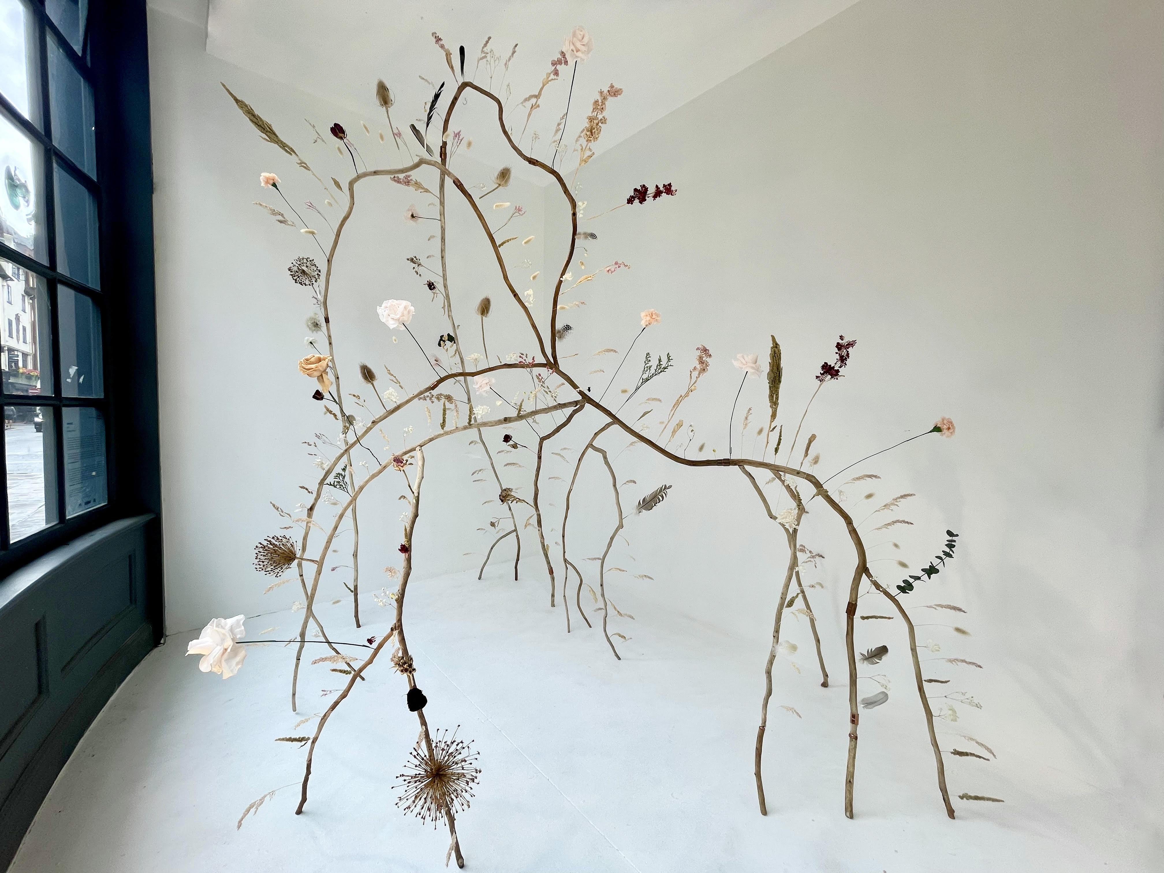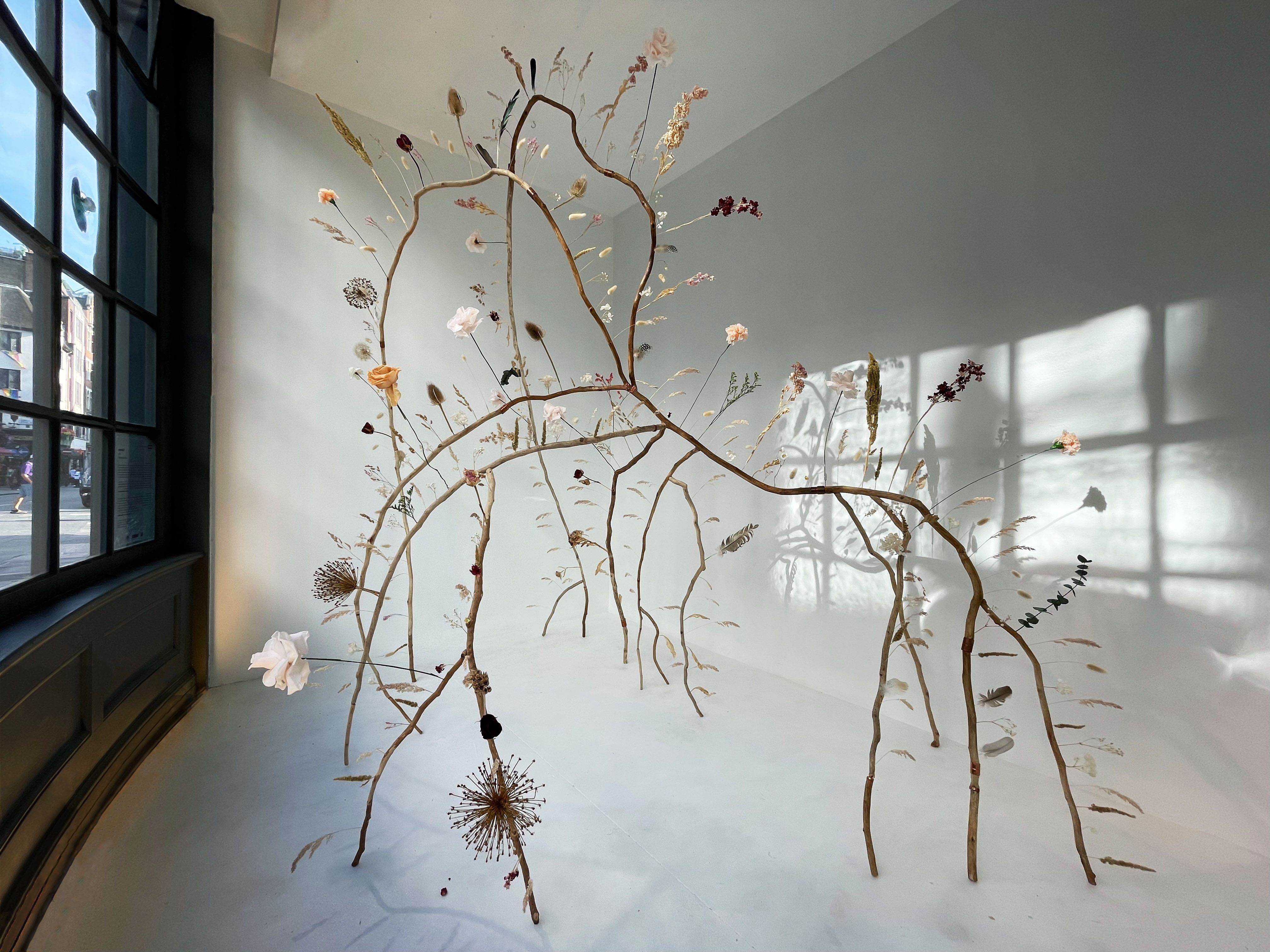 The Smallest Gallery in Soho is delighted to present a new installation by London-based artist Lise Bouissière Gowns—a transformable sculpture made of salvaged branches that can be dressed in an infinity of materials. Wild herbs, feathers, little flowers, and fallen leaves are elements that cover the main structure, forming a modulable 3D landscape extracted from its surrounding environment. Due to its transformability and because it is made of found material, the sculpture questions the themes of regeneration, ephemerality and infinity. The piece embodies the balance of opposite scales between the opulent branch skeleton and the tiny plants fixed on it.