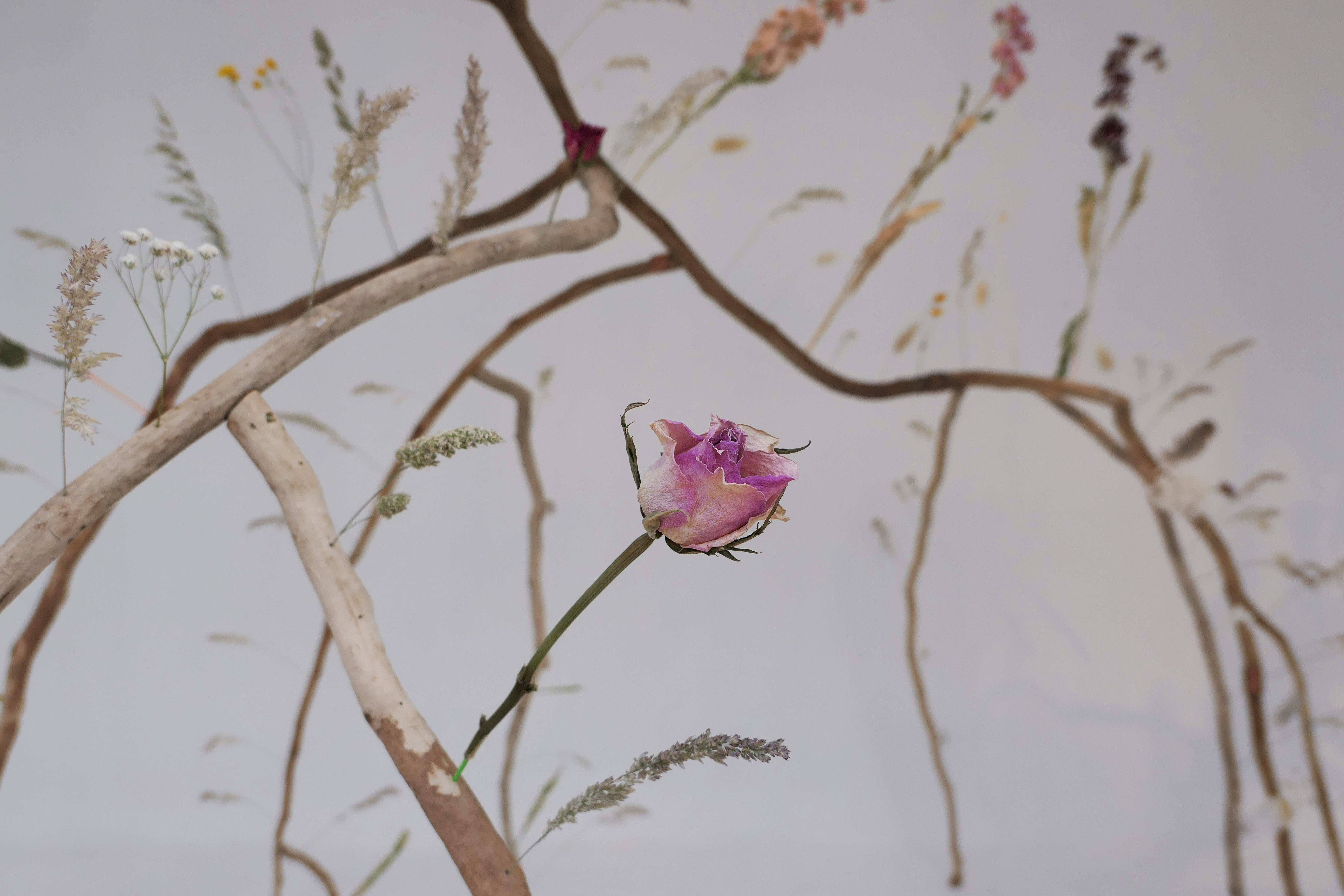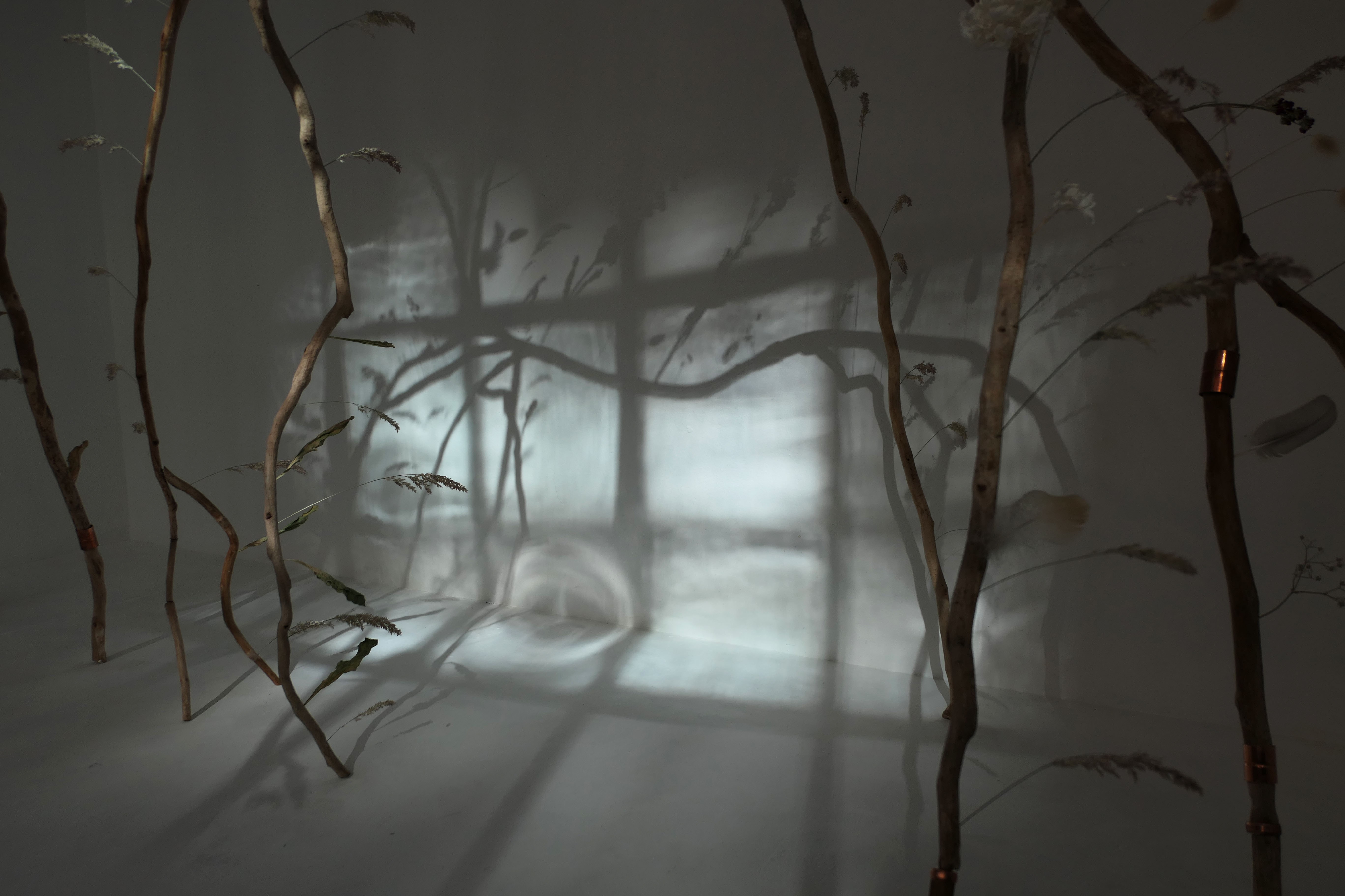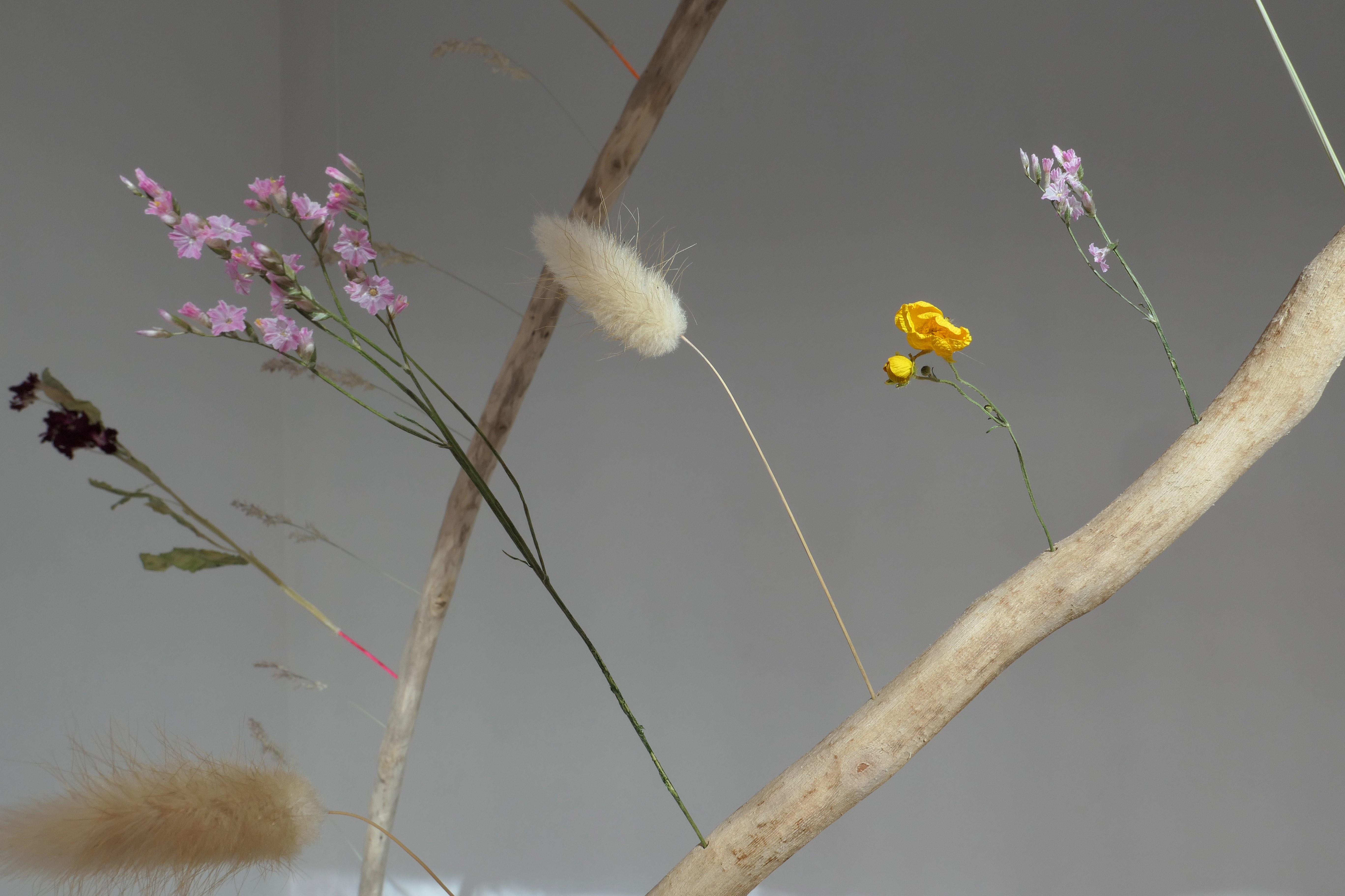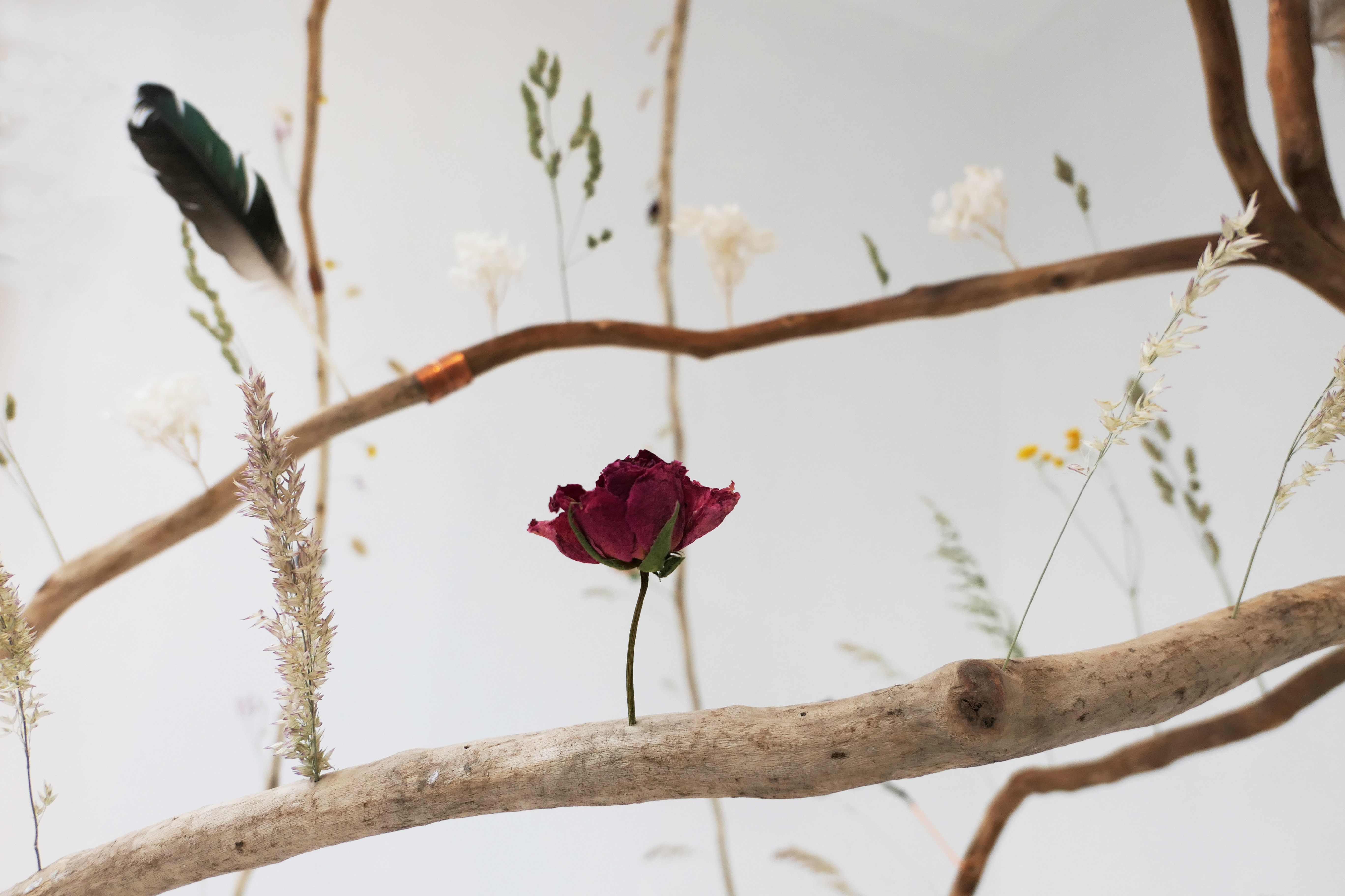 The Smallest Gallery in Soho is delighted to present a new installation by London-based artist Lise Bouissière Gowns—a transformable sculpture made of salvaged branches that can be dressed in an infinity of materials. Wild herbs, feathers, little flowers, and fallen leaves are elements that cover the main structure, forming a modulable 3D landscape extracted from its surrounding environment. Due to its transformability and because it is made of found material, the sculpture questions the themes of regeneration, ephemerality and infinity. The piece embodies the balance of opposite scales between the opulent branch skeleton and the tiny plants fixed on it.