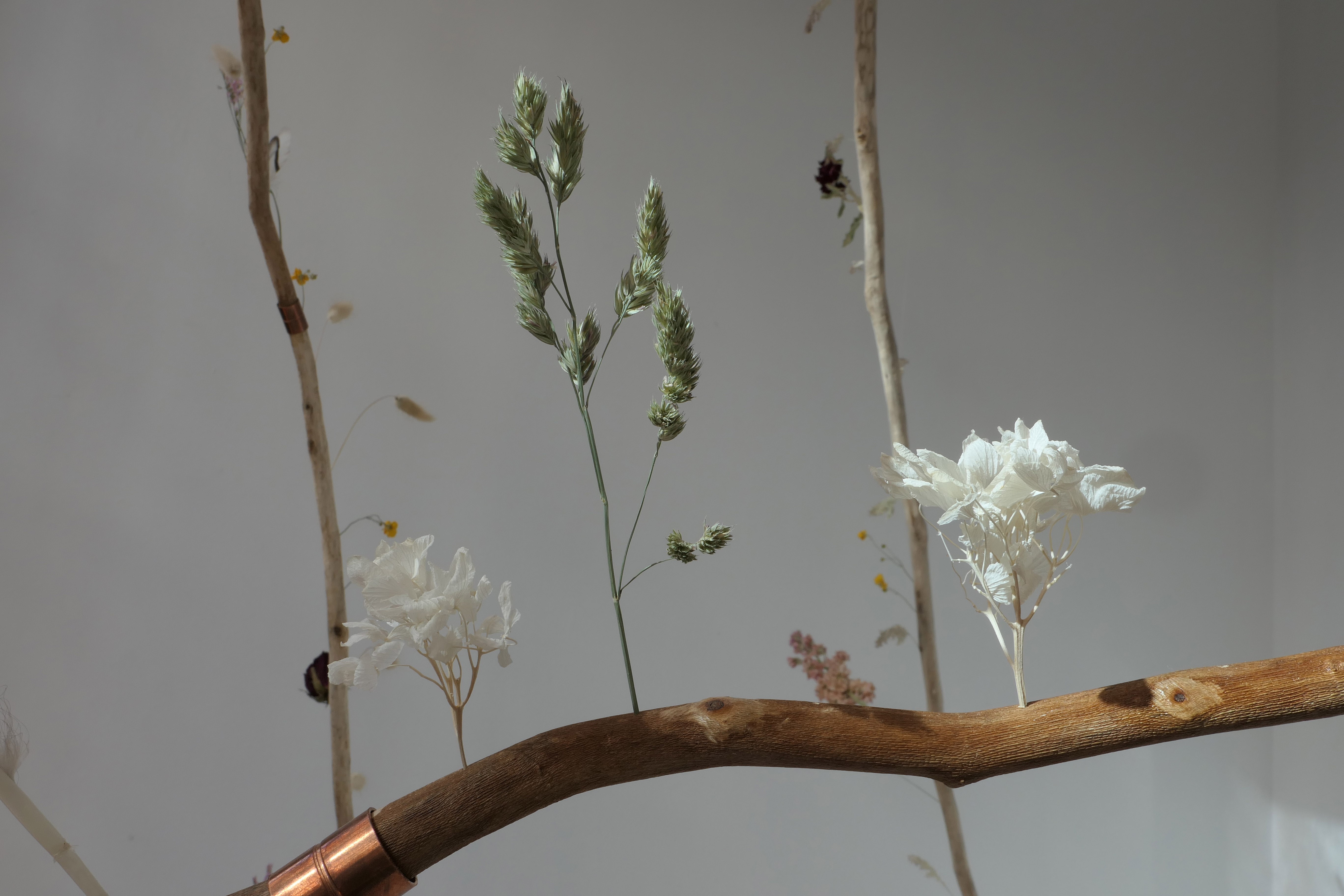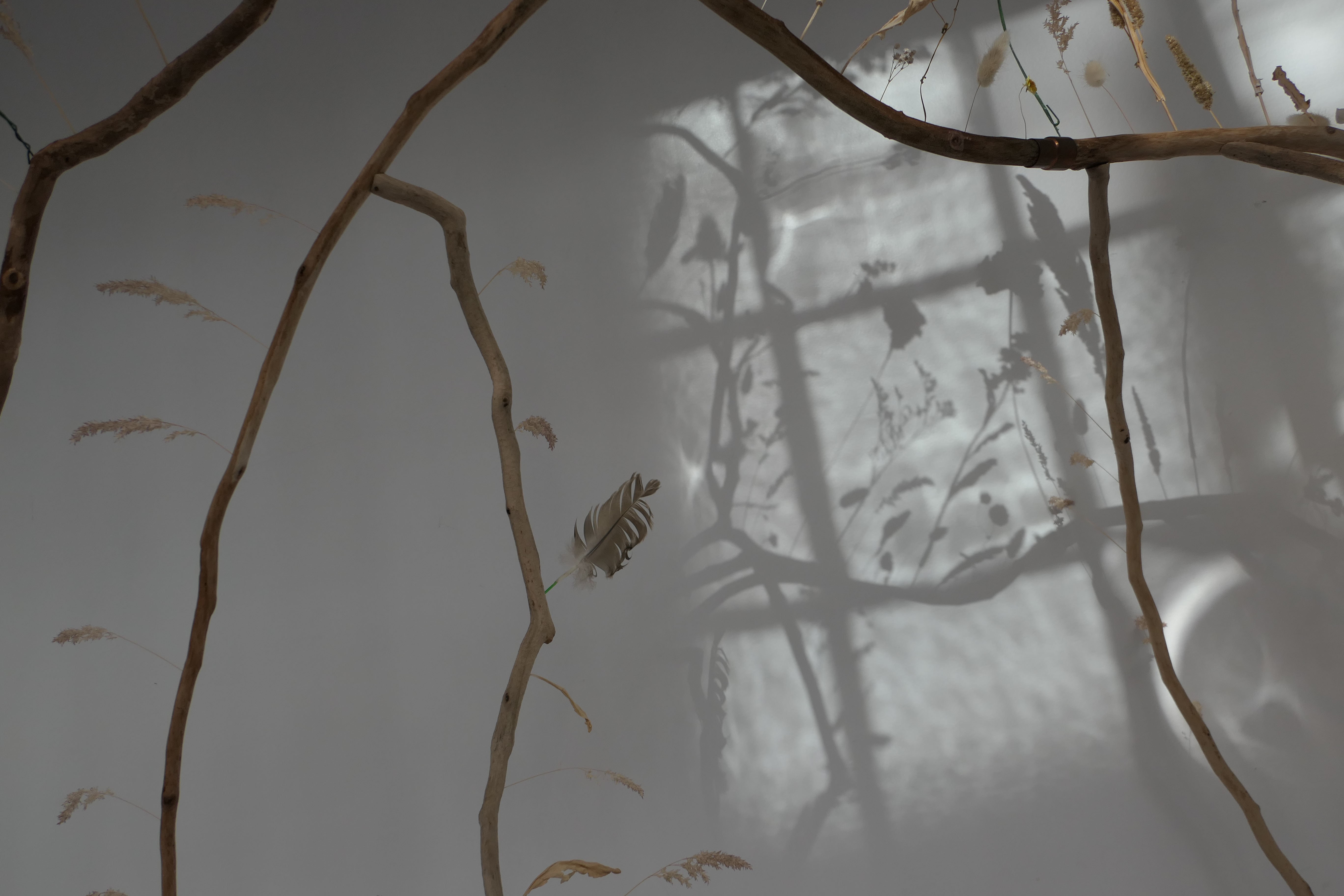 Materials: Salvaged branches, dried flowers, feathers, and wild herbs.
