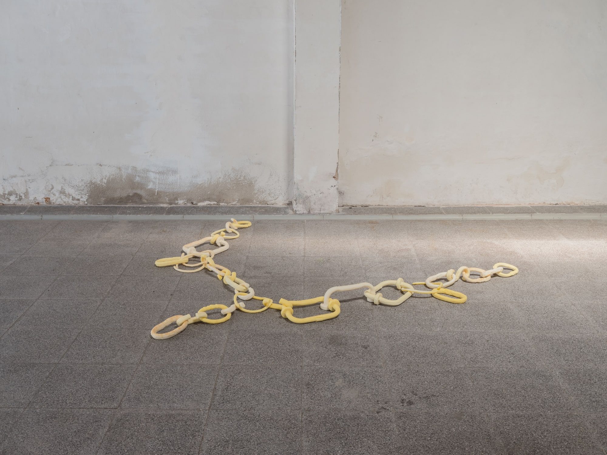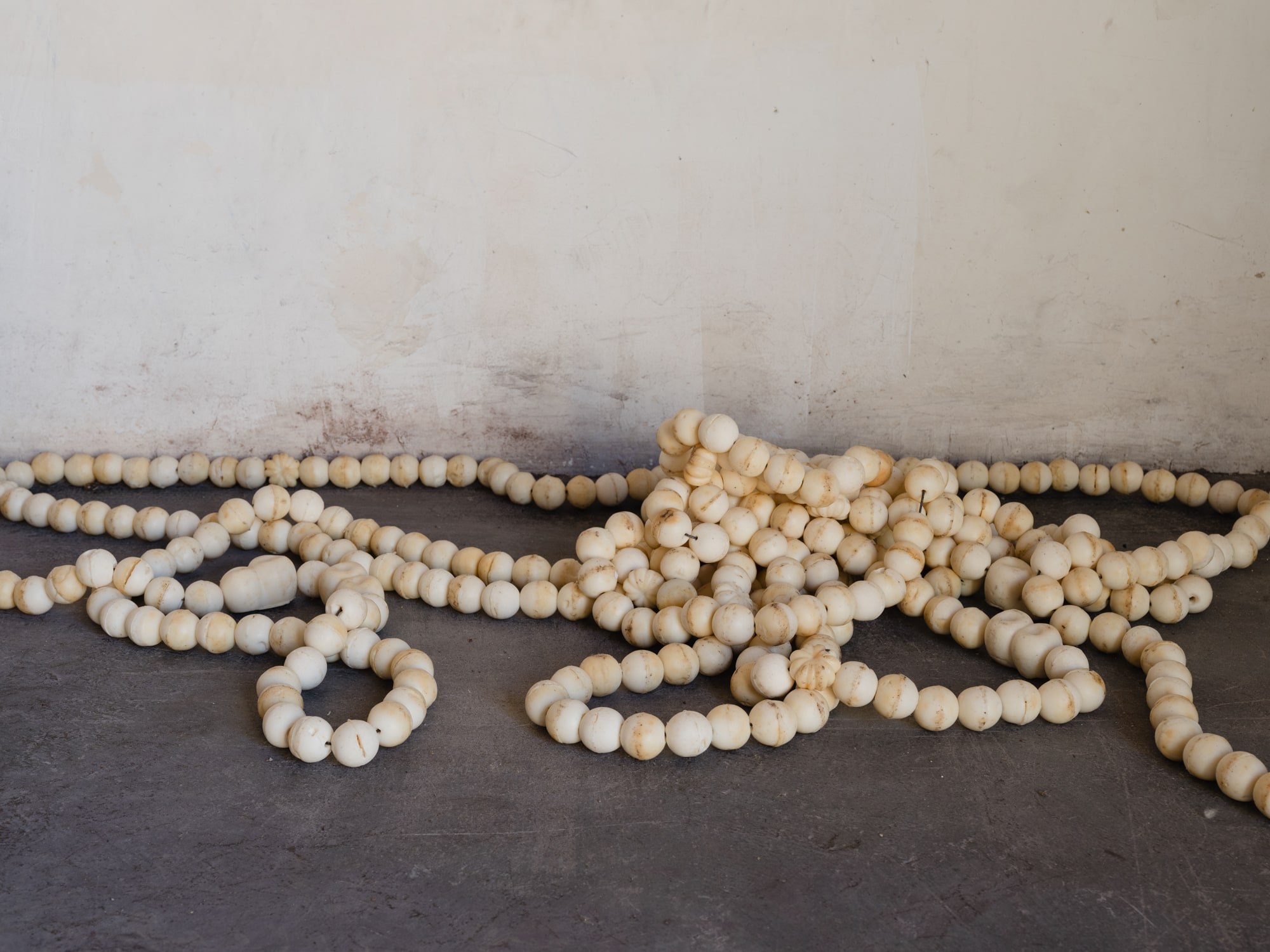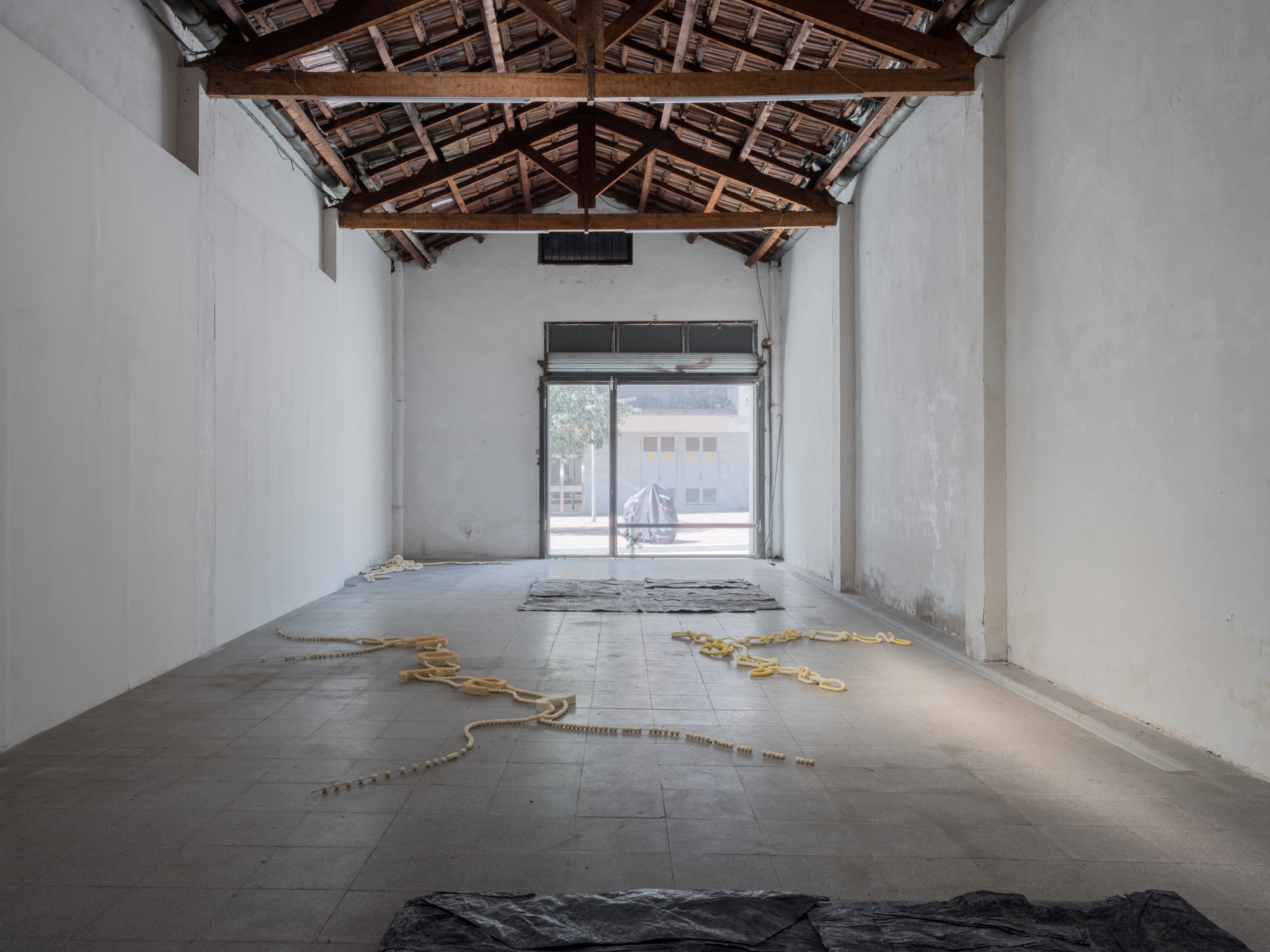 The shackles are drying out. In this part of the space, the breeze runs faster and you can feel a certain sonority: the rhythm of the pieces themselves, one after the other. By looking at them carefully, it is possible to imagine the passage of the air stream through the gap between them.