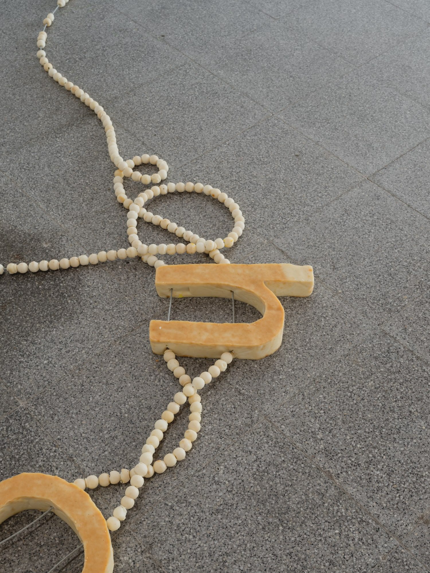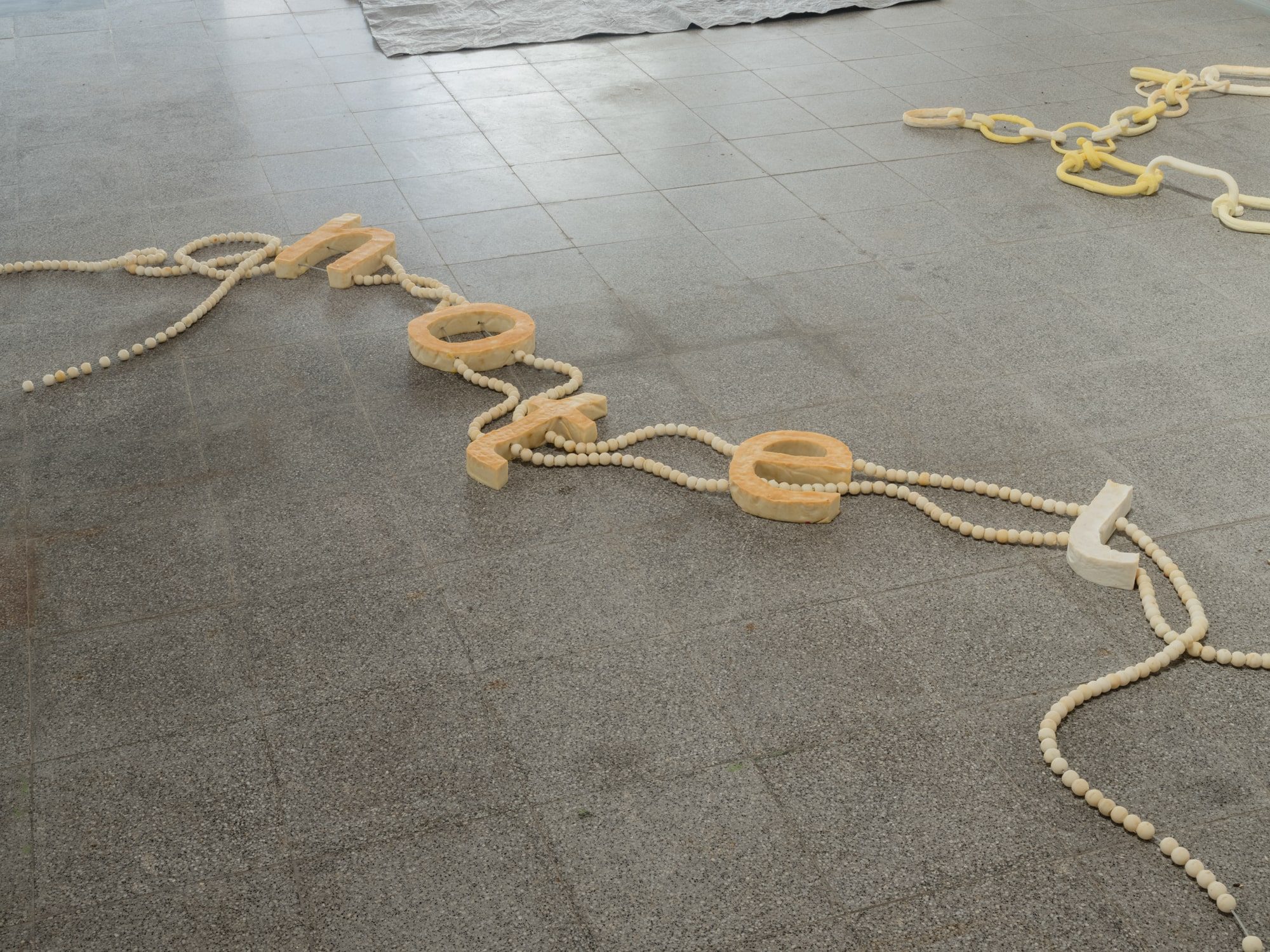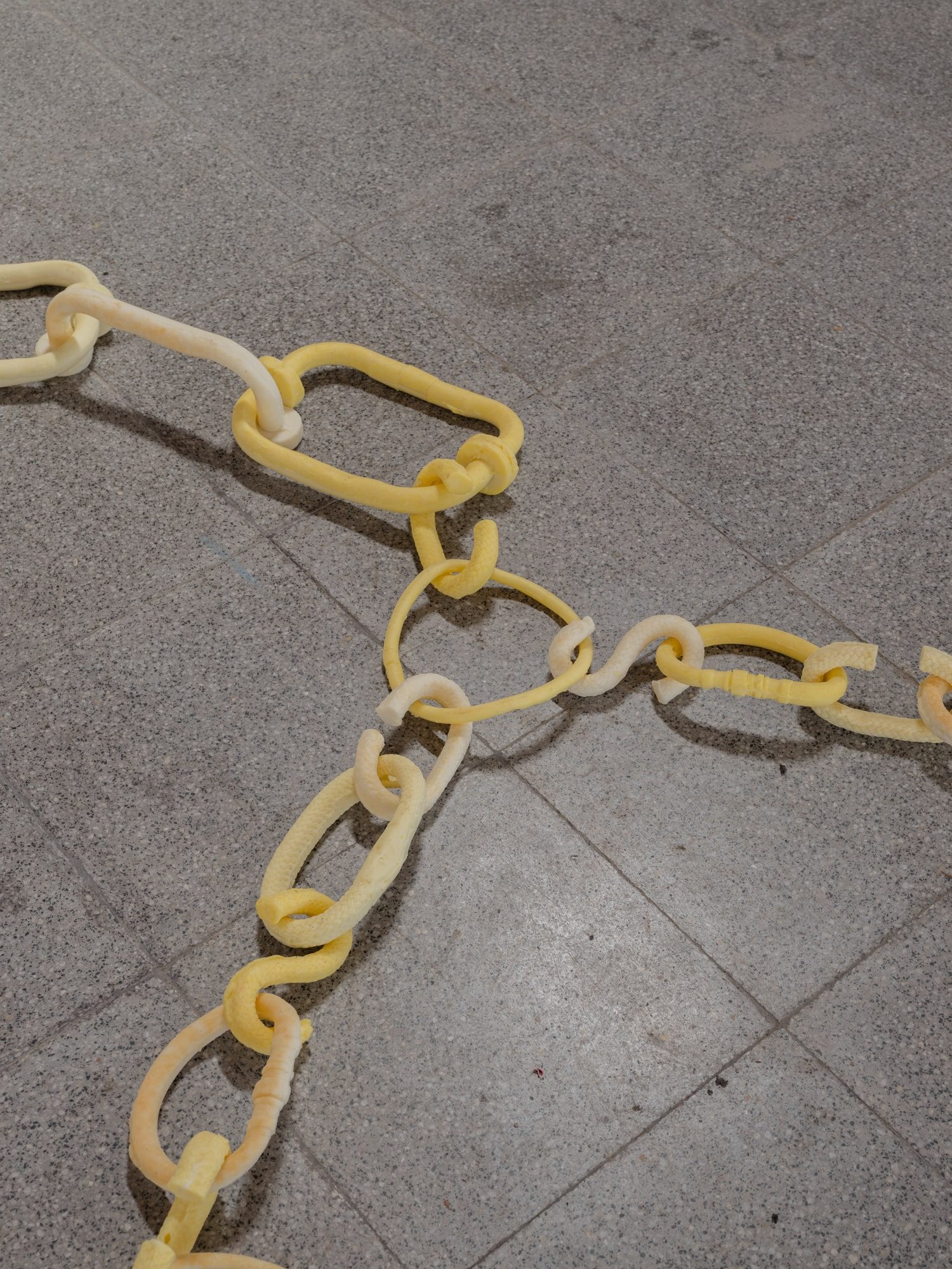 The shackles are drying out. In this part of the space, the breeze runs faster and you can feel a certain sonority: the rhythm of the pieces themselves, one after the other. By looking at them carefully, it is possible to imagine the passage of the air stream through the gap between them.