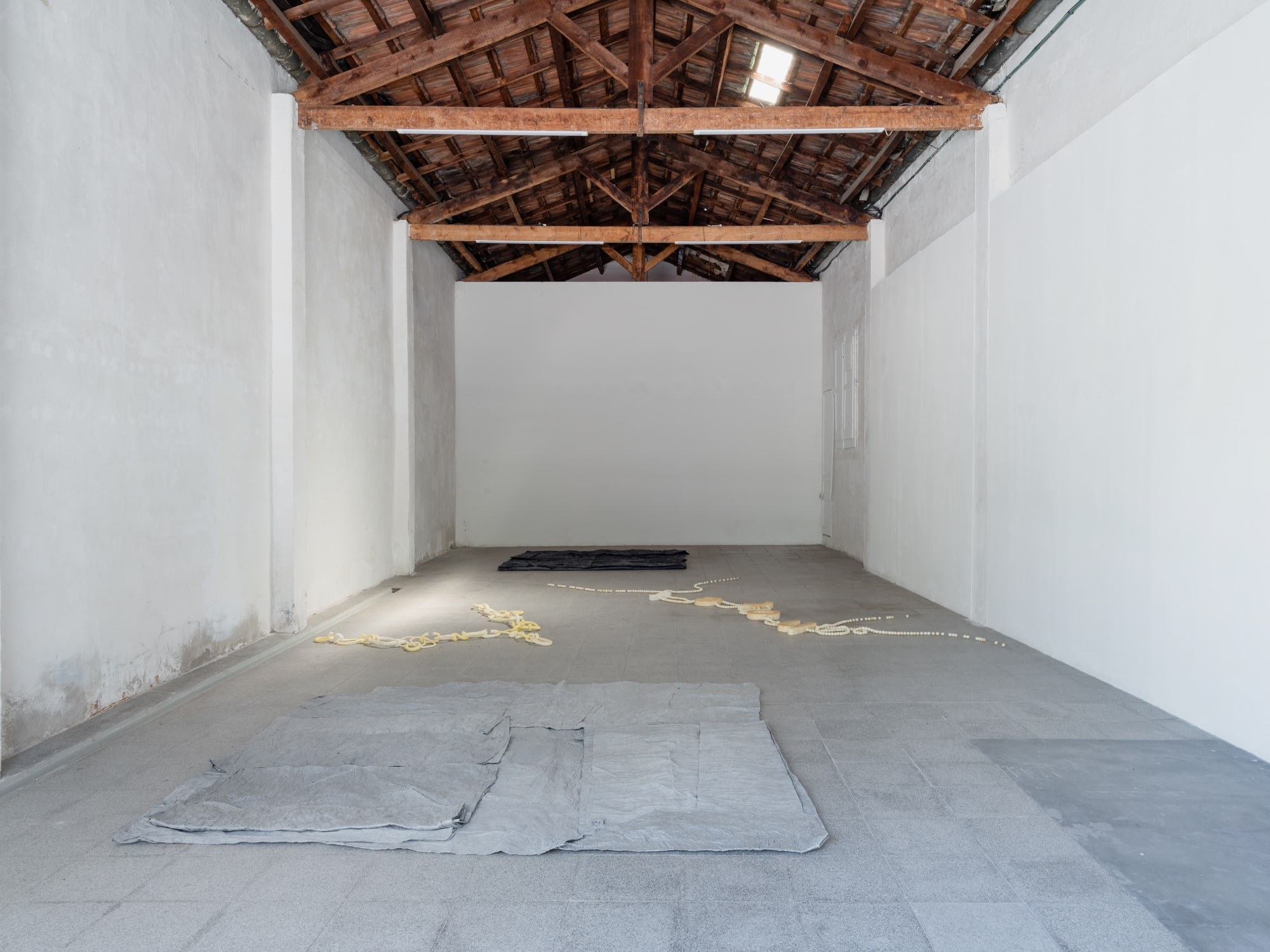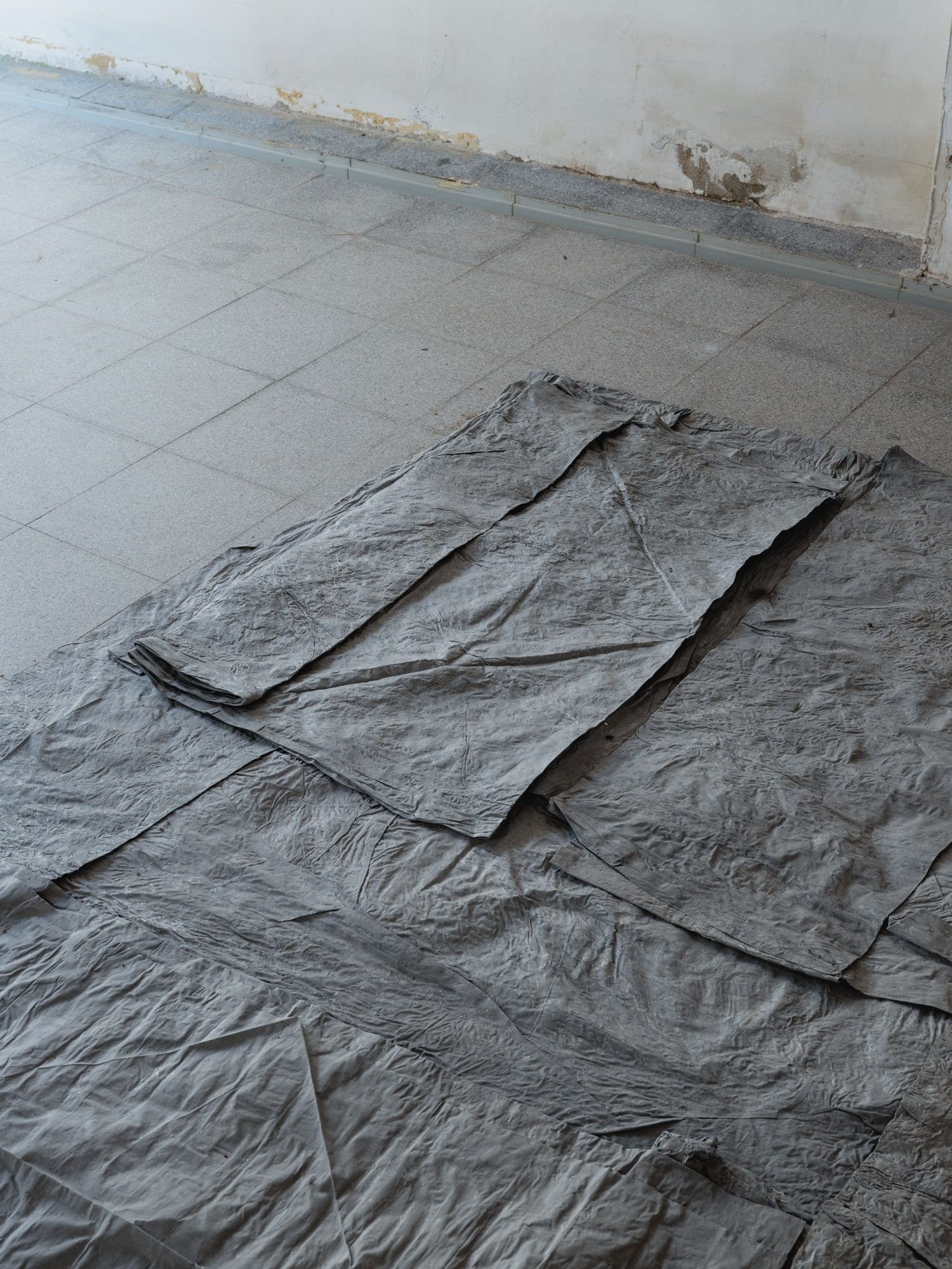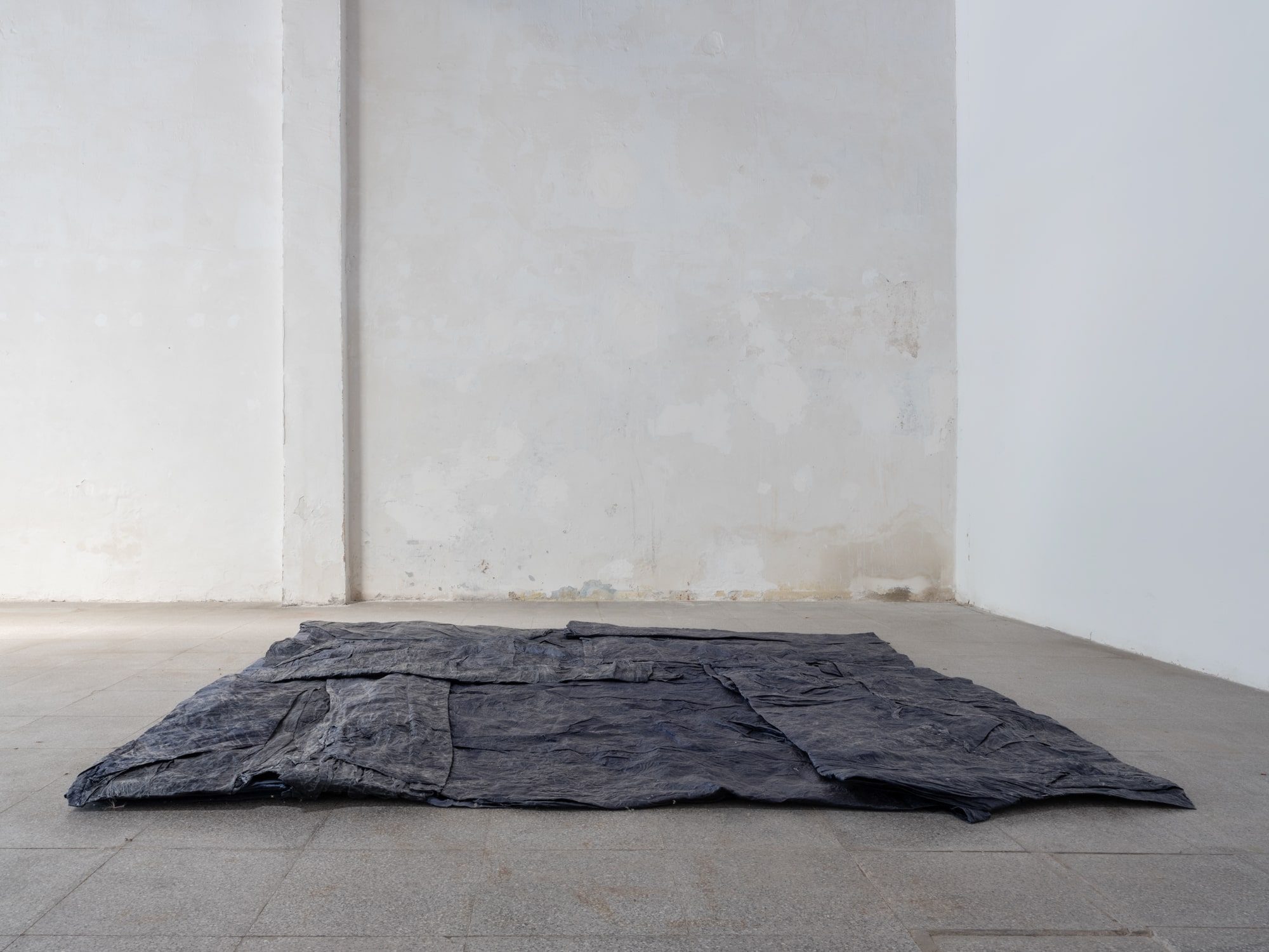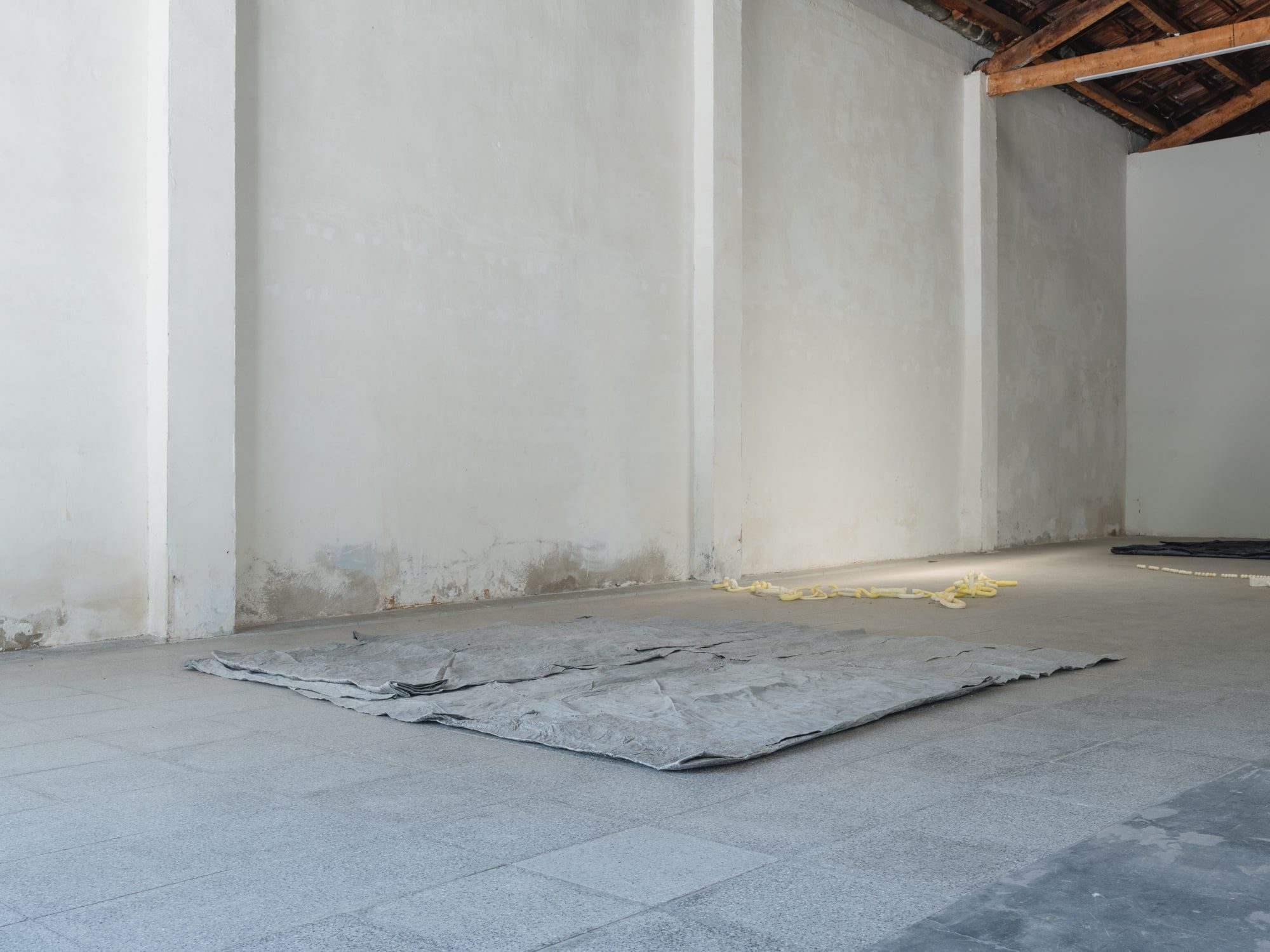 Several planes accompany the gallery space in its verticals and horizontals: grey, blue and a blue moistened almost black. The posing of the starched, wet and folded fabrics loosens the hardness of the architecture, provoking a very physical observation to activate a movement of proximity.