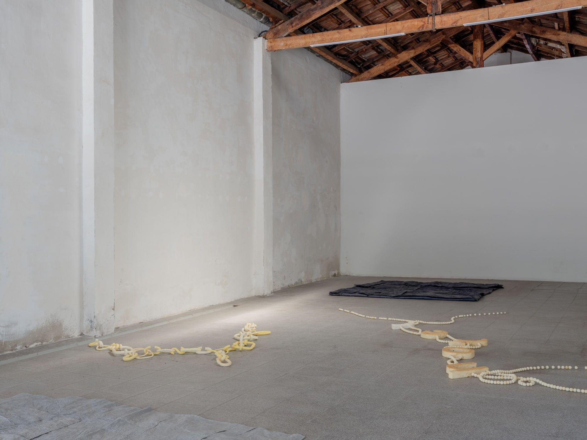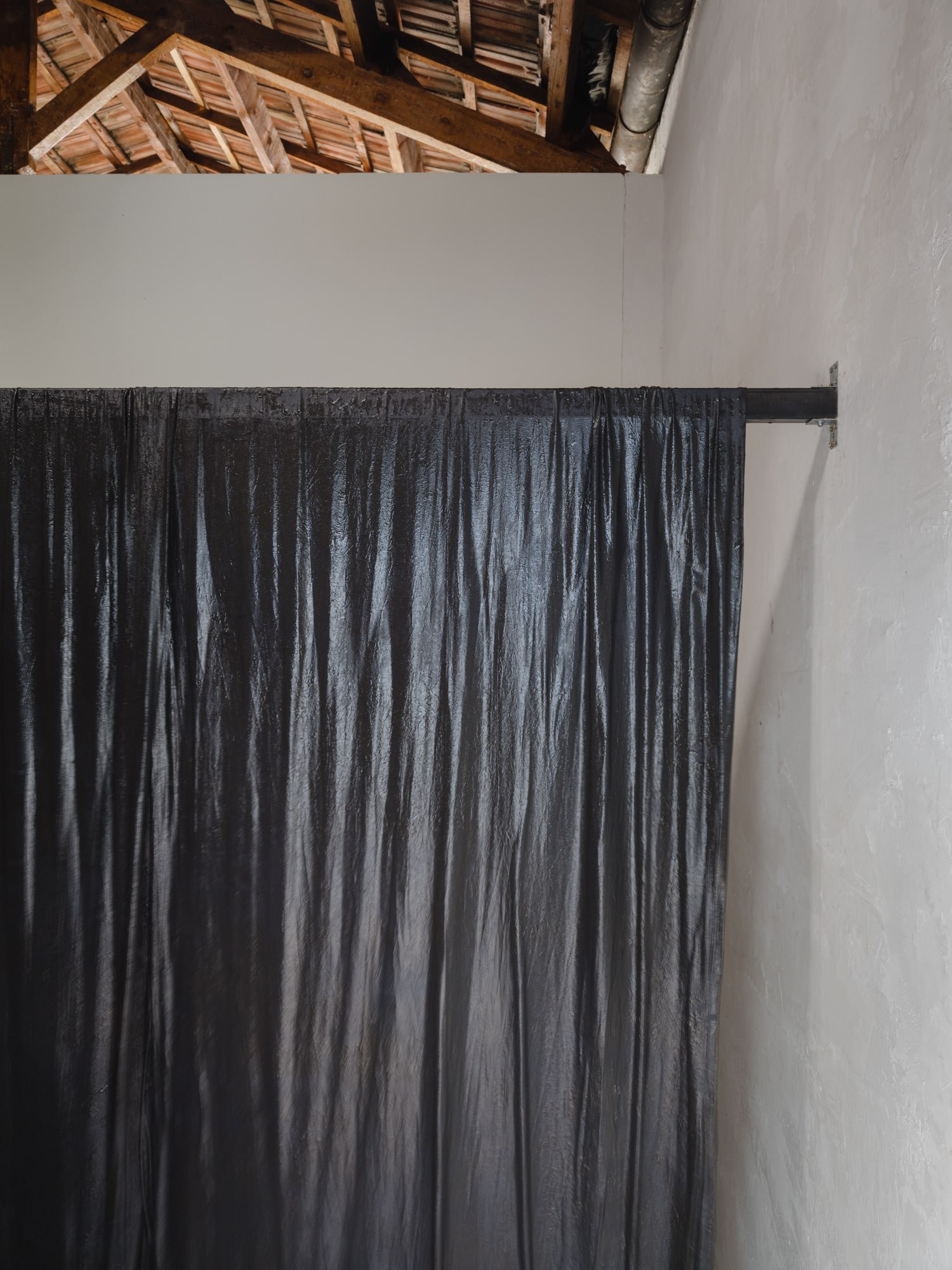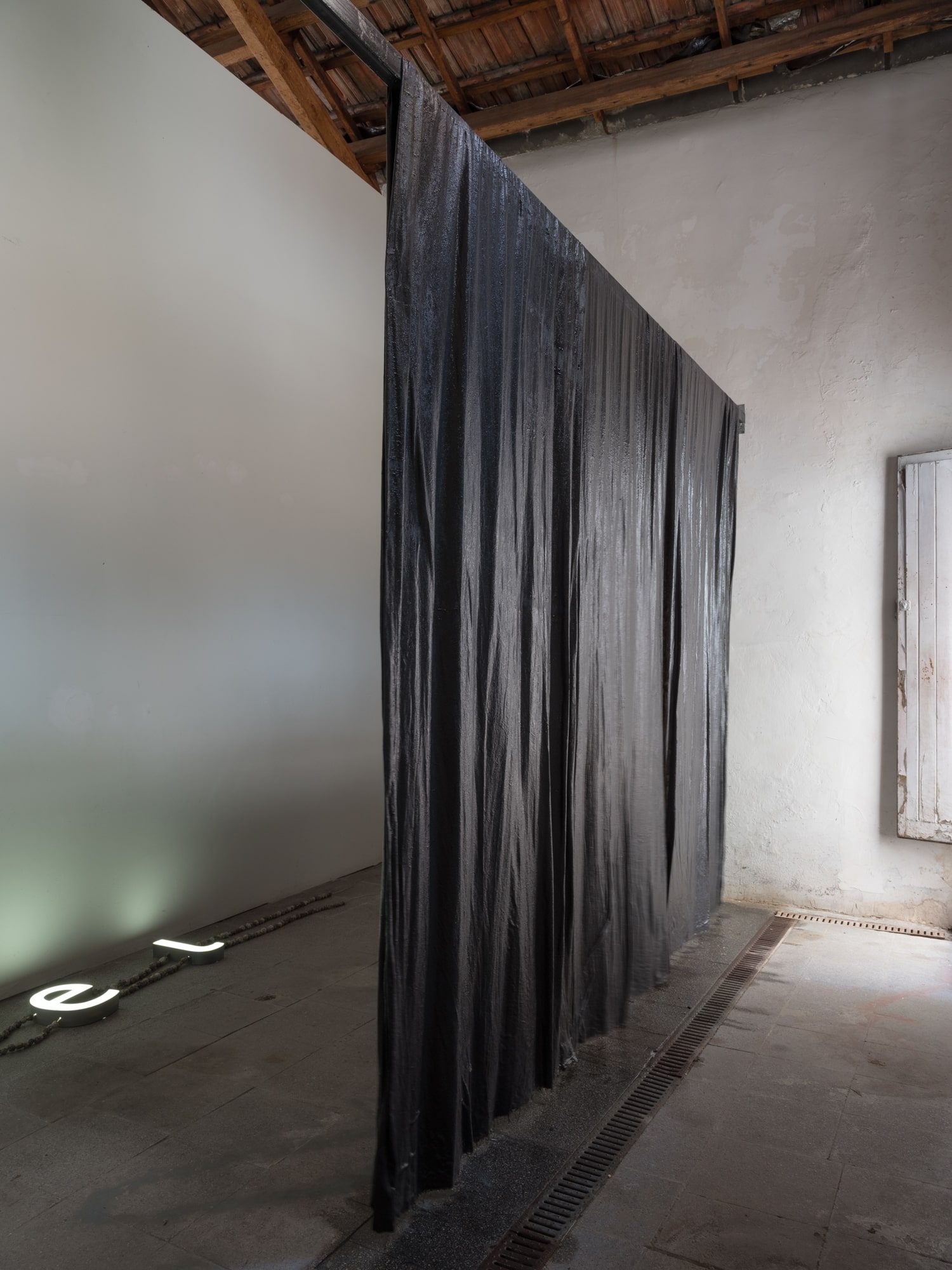 Several planes accompany the gallery space in its verticals and horizontals: grey, blue and a blue moistened almost black. The posing of the starched, wet and folded fabrics loosens the hardness of the architecture, provoking a very physical observation to activate a movement of proximity.