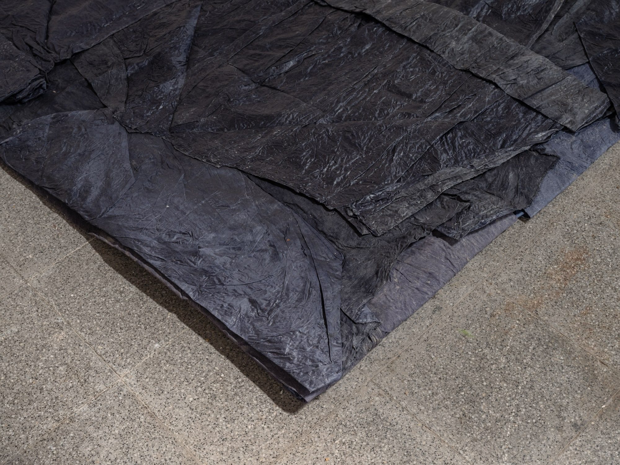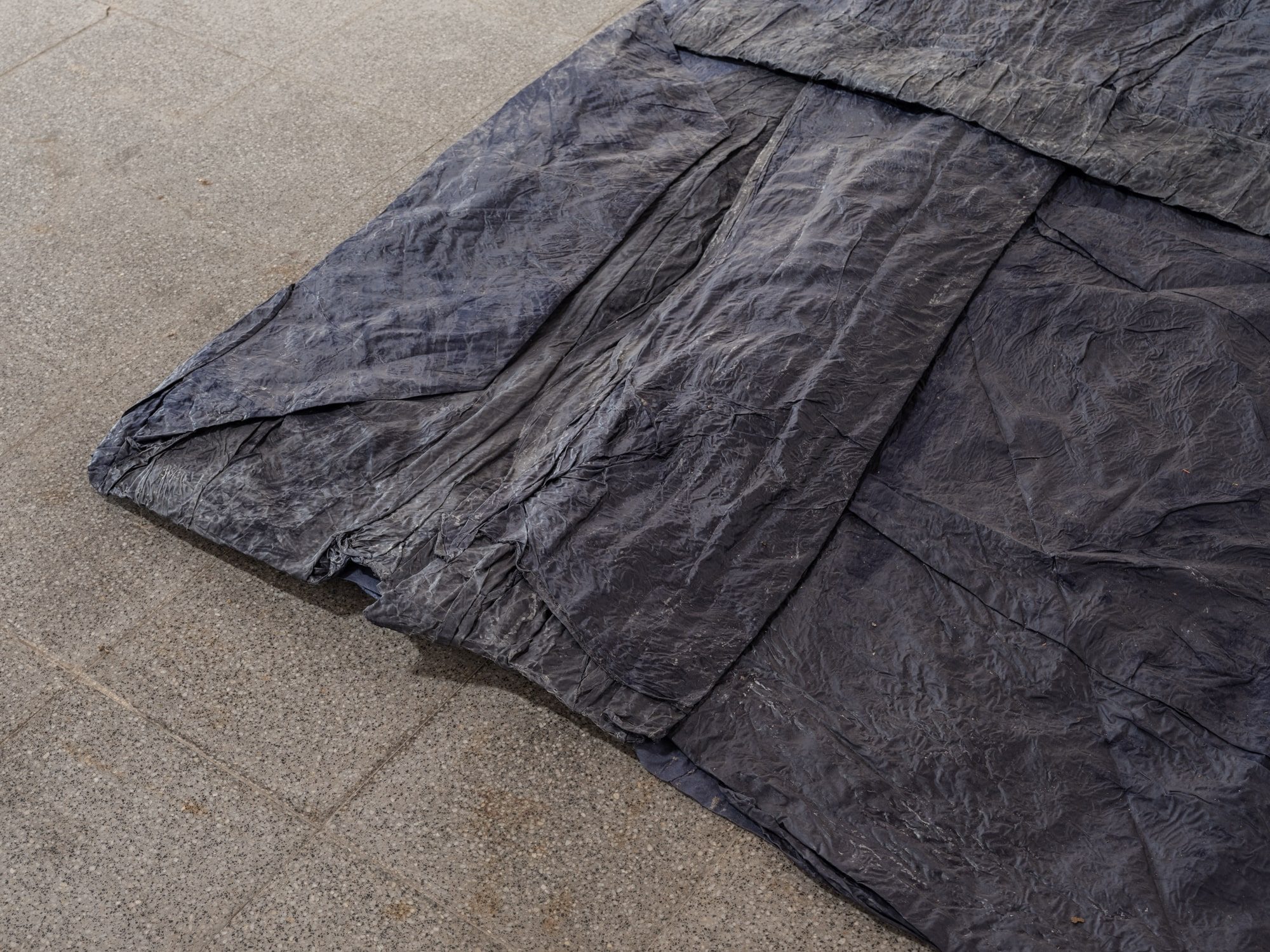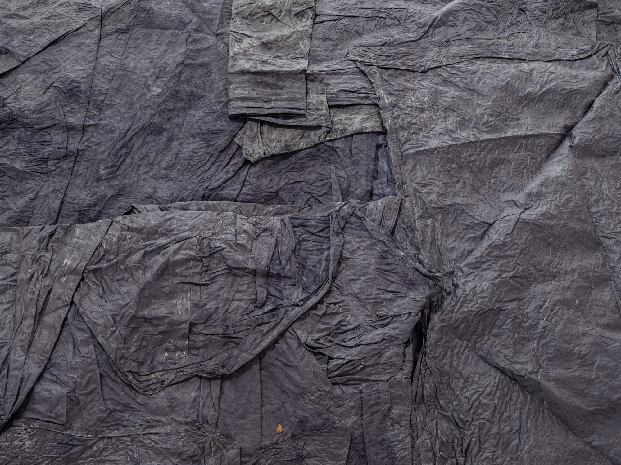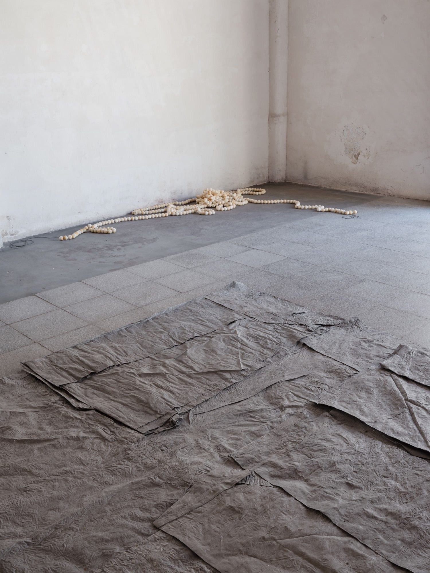 Several planes accompany the gallery space in its verticals and horizontals: grey, blue and a blue moistened almost black. The posing of the starched, wet and folded fabrics loosens the hardness of the architecture, provoking a very physical observation to activate a movement of proximity.