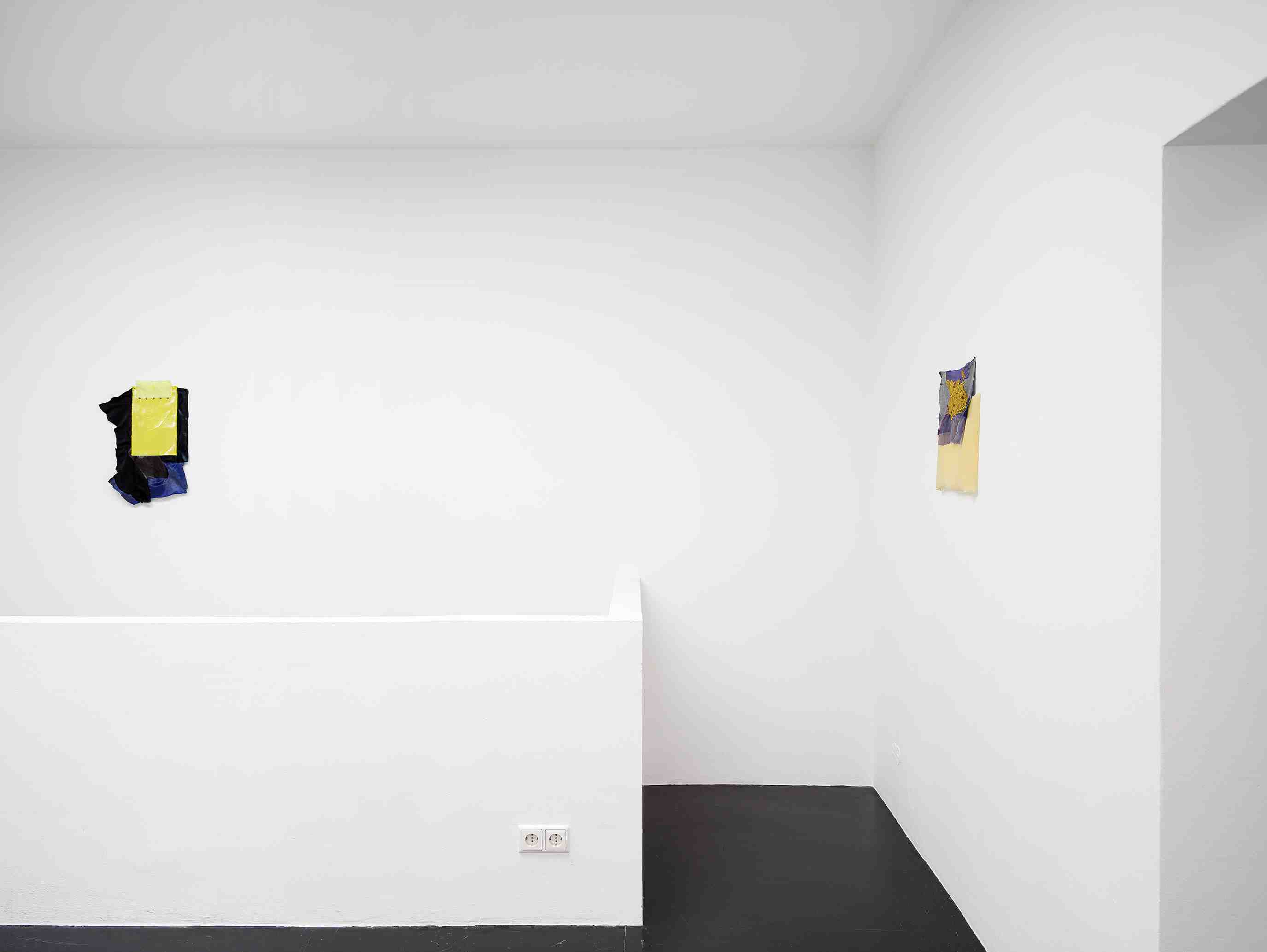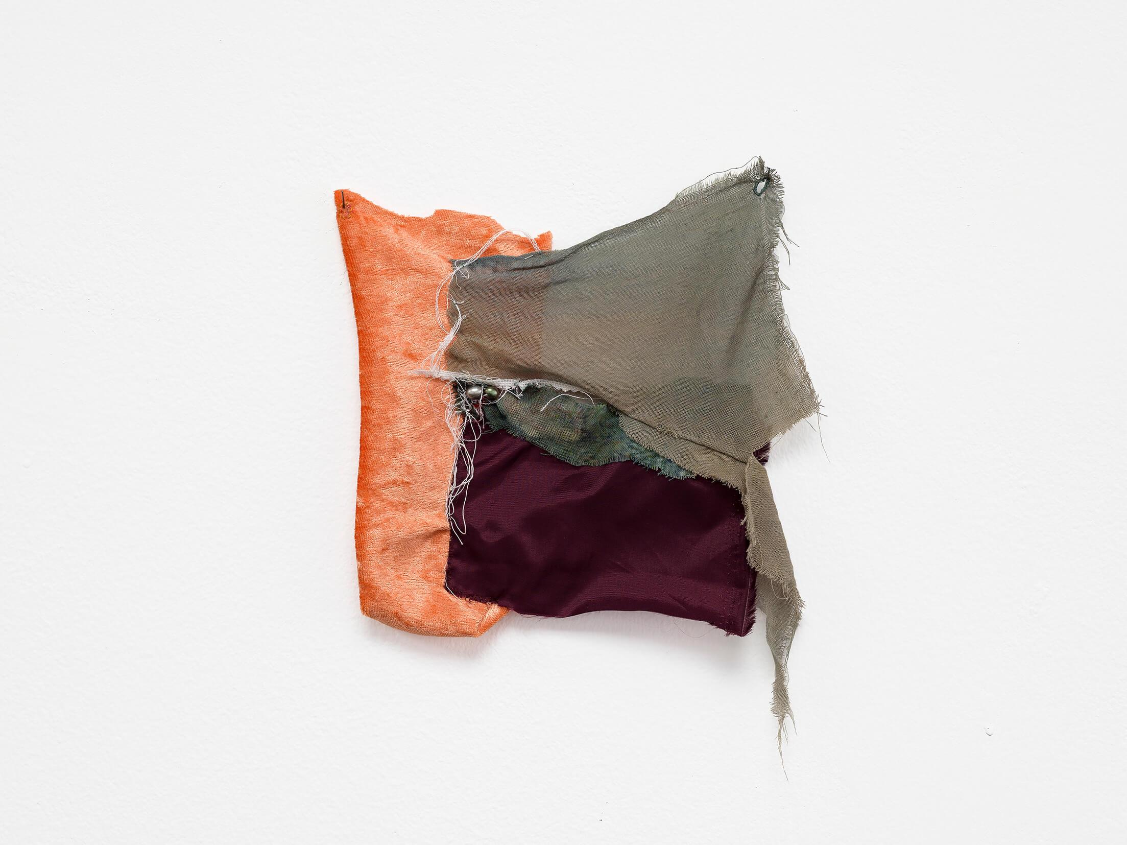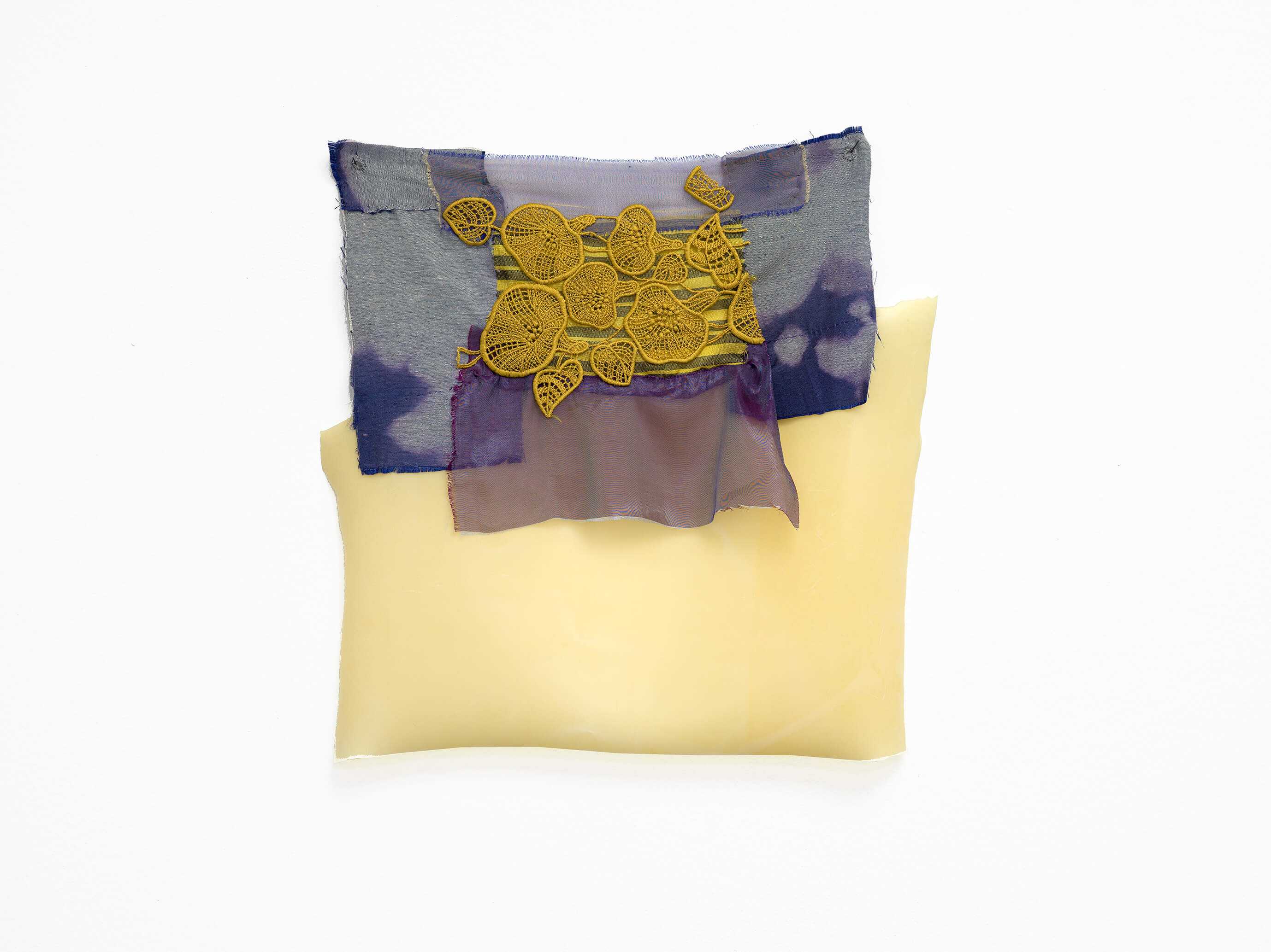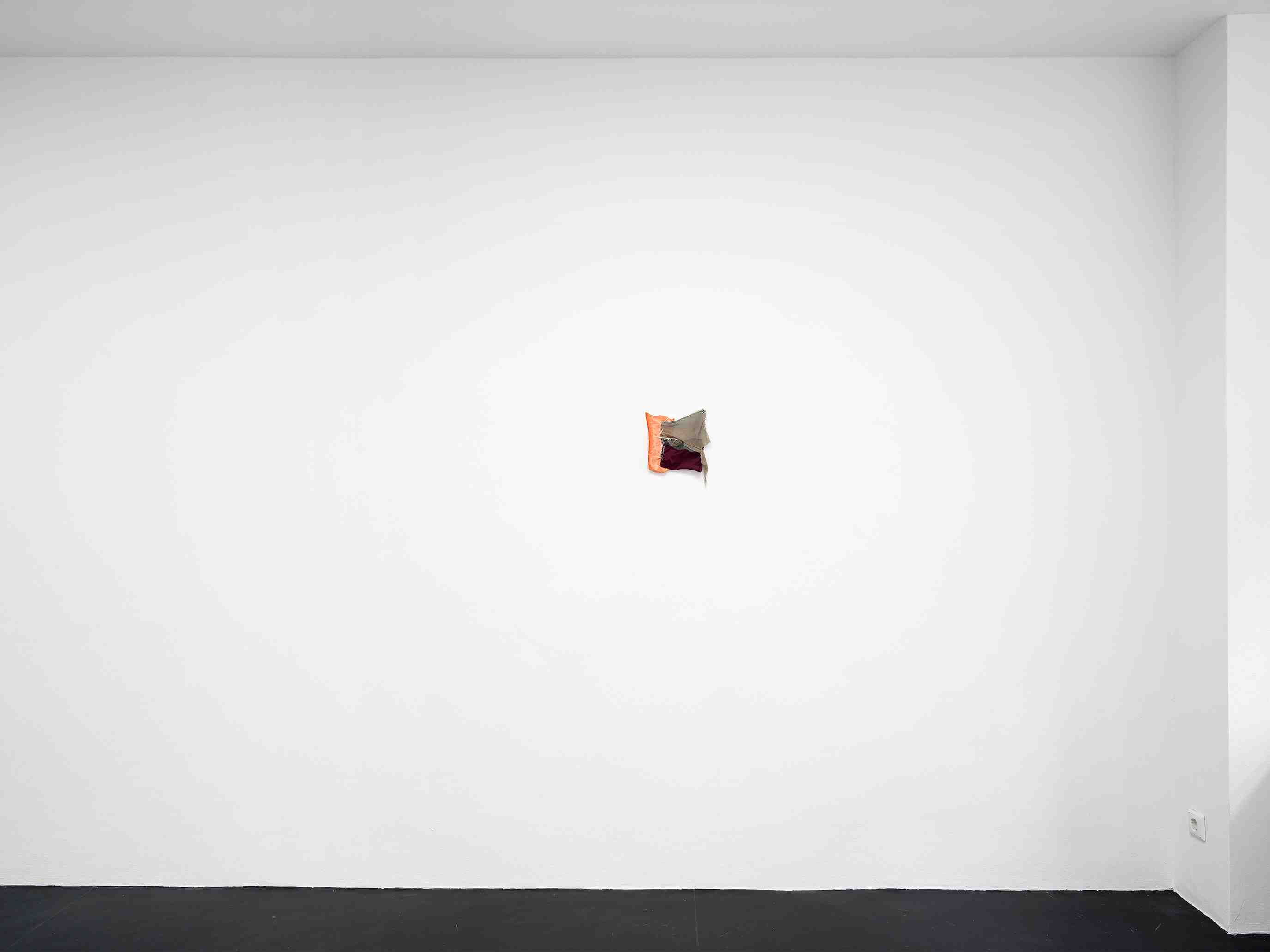 In her current exhibition, Anna Virnich addresses the heightened sensibility of the post-Corona era, the feeling of seeing more clearly, of being touched, but also connected with this "too late," with overtaxing, weariness. In Mutti raucht wieder we probably see her finest, most sculptural works to date, moving further and further away from the notion that what she is doing is "stitched painting," a response to postwar abstraction or color field painting. In them, an almost hysterical, decadent sensibility and nostalgia, an edgy unease with the present, coincides with materialist thinking, with an interest in material. Gauge Your Fears (2023), for instance, features a weave of stained chlorinated satin on a milky latex square. The embroidery flowers - callas - look like atomic mushrooms growing on pudding skin. Virnich's practice combines the touch of kink and camp with the canon and aesthetics of post-minimal and post-human thought.