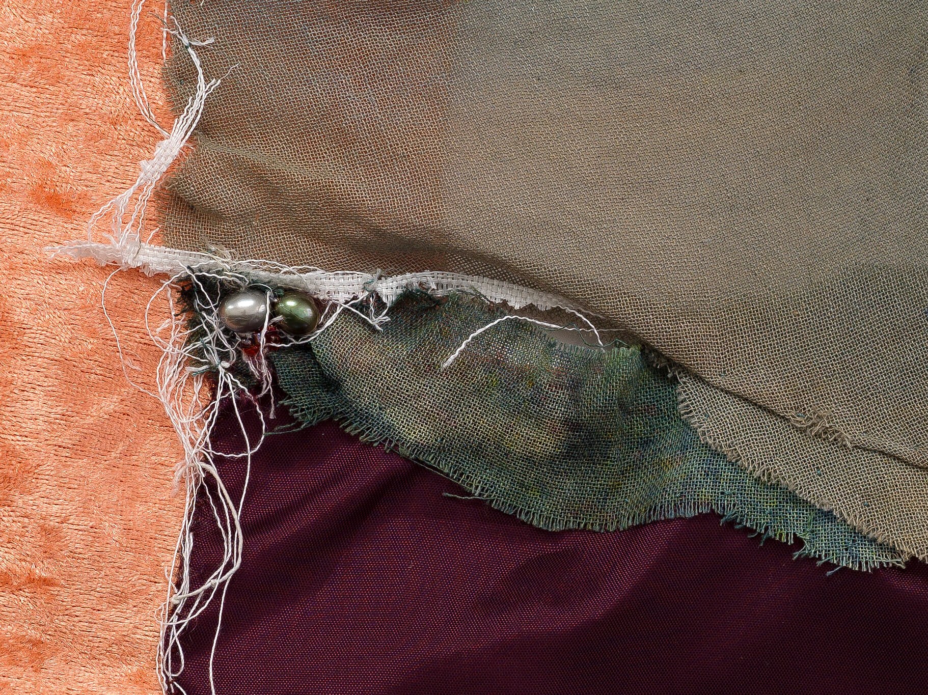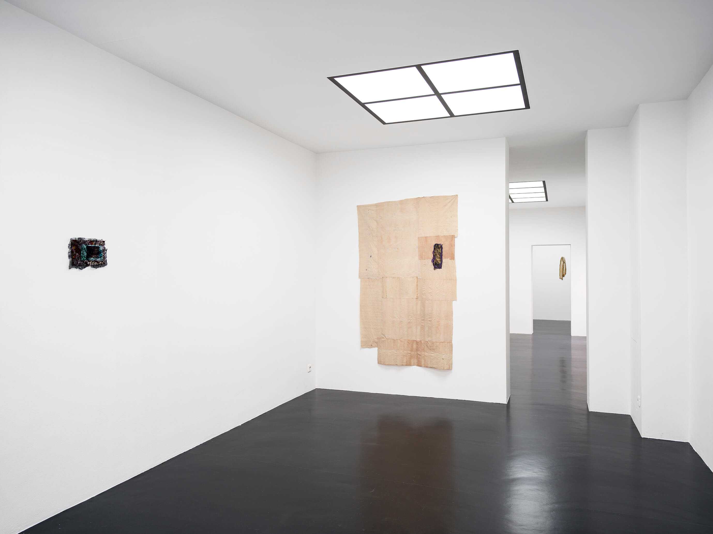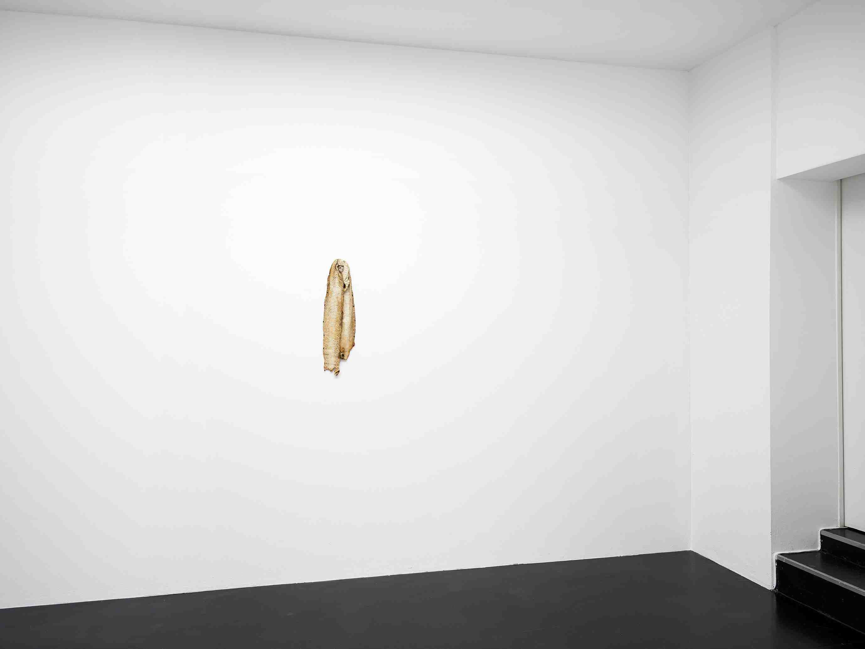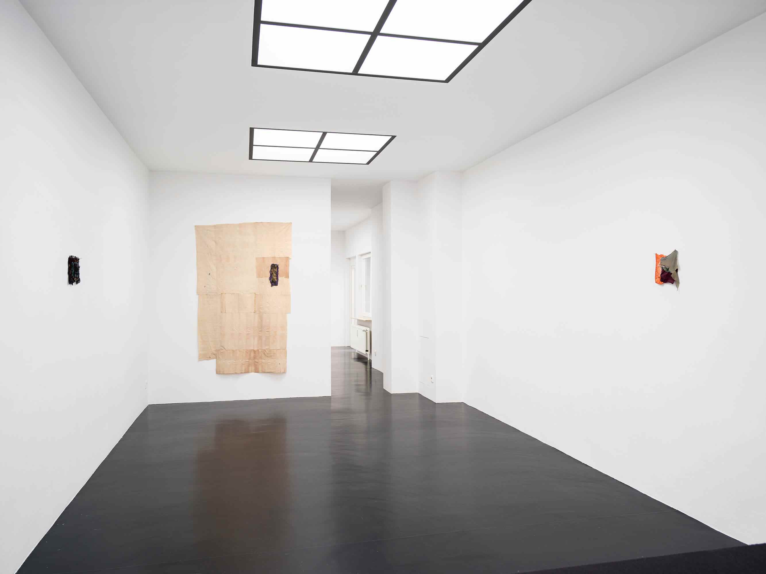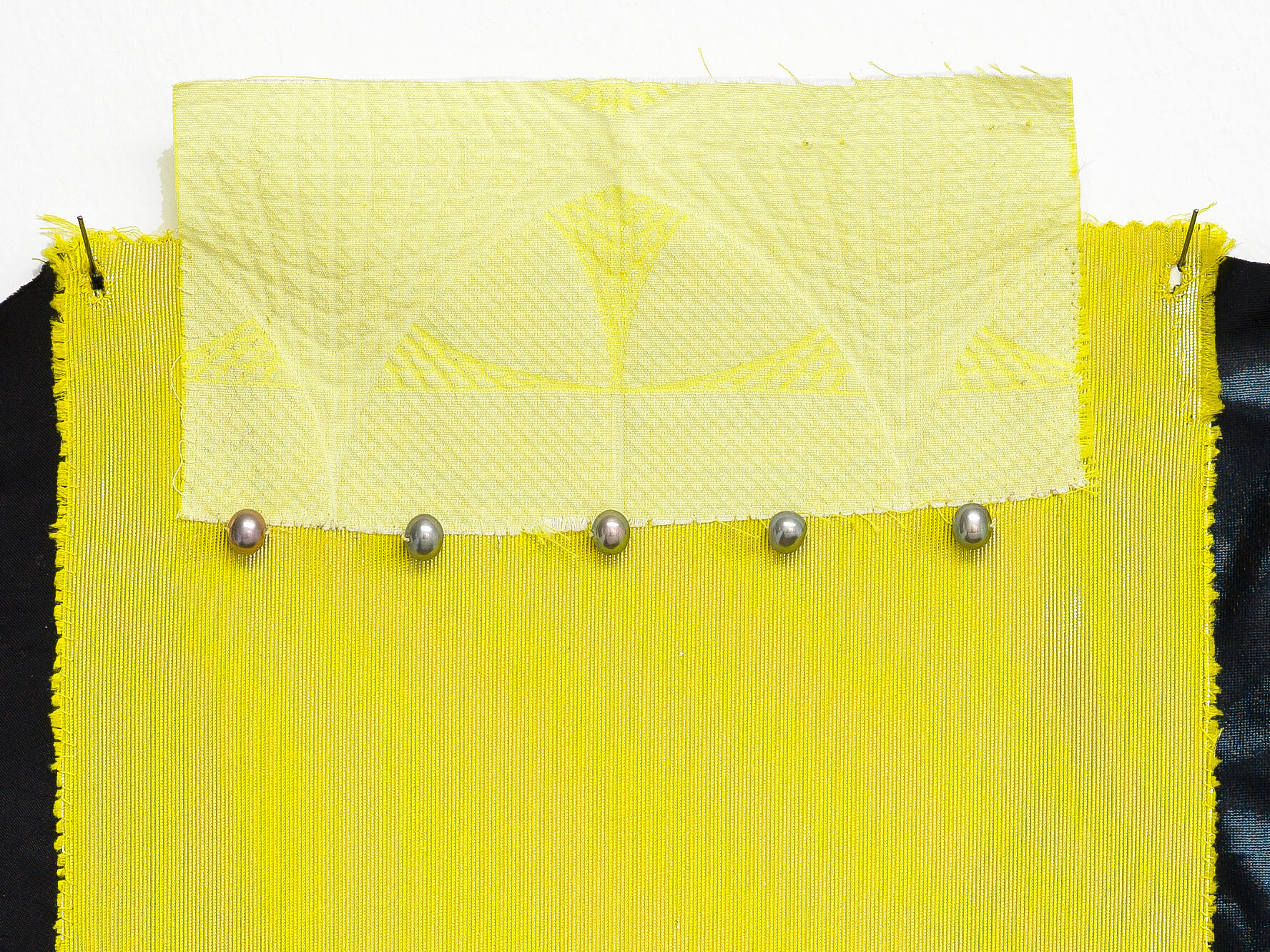 In her current exhibition, Anna Virnich addresses the heightened sensibility of the post-Corona era, the feeling of seeing more clearly, of being touched, but also connected with this "too late," with overtaxing, weariness. In Mutti raucht wieder we probably see her finest, most sculptural works to date, moving further and further away from the notion that what she is doing is "stitched painting," a response to postwar abstraction or color field painting. In them, an almost hysterical, decadent sensibility and nostalgia, an edgy unease with the present, coincides with materialist thinking, with an interest in material. Gauge Your Fears (2023), for instance, features a weave of stained chlorinated satin on a milky latex square. The embroidery flowers - callas - look like atomic mushrooms growing on pudding skin. Virnich's practice combines the touch of kink and camp with the canon and aesthetics of post-minimal and post-human thought.