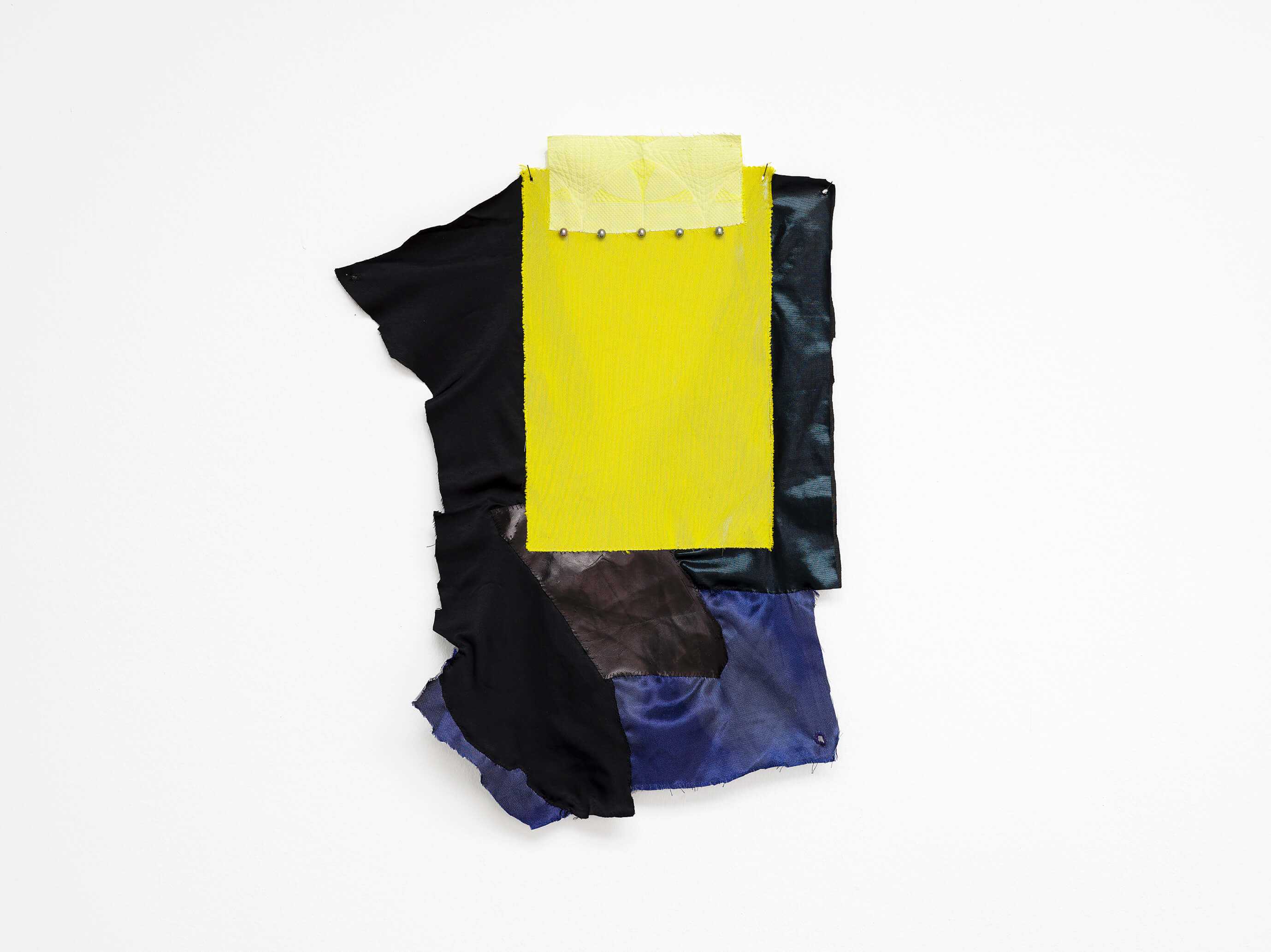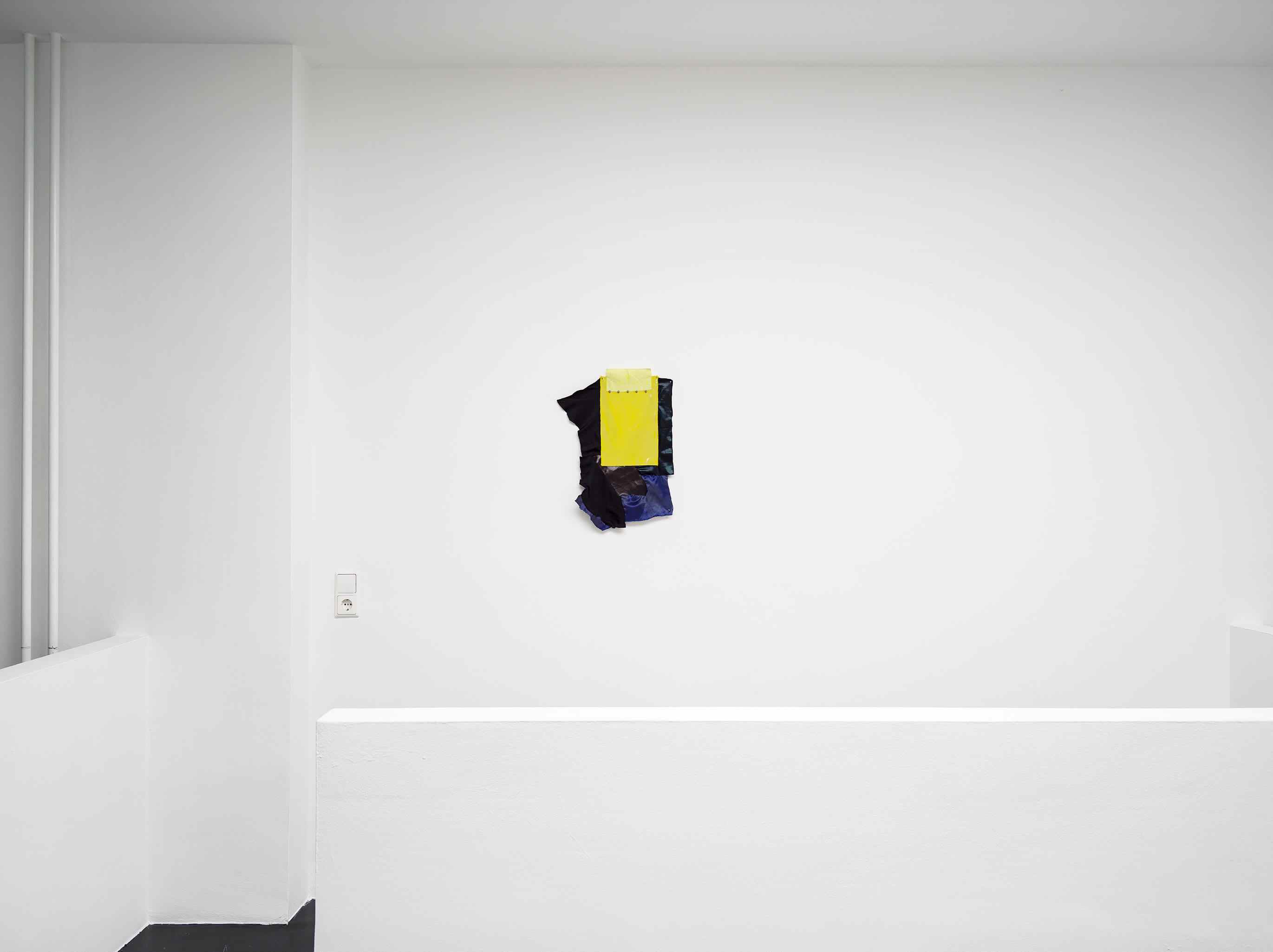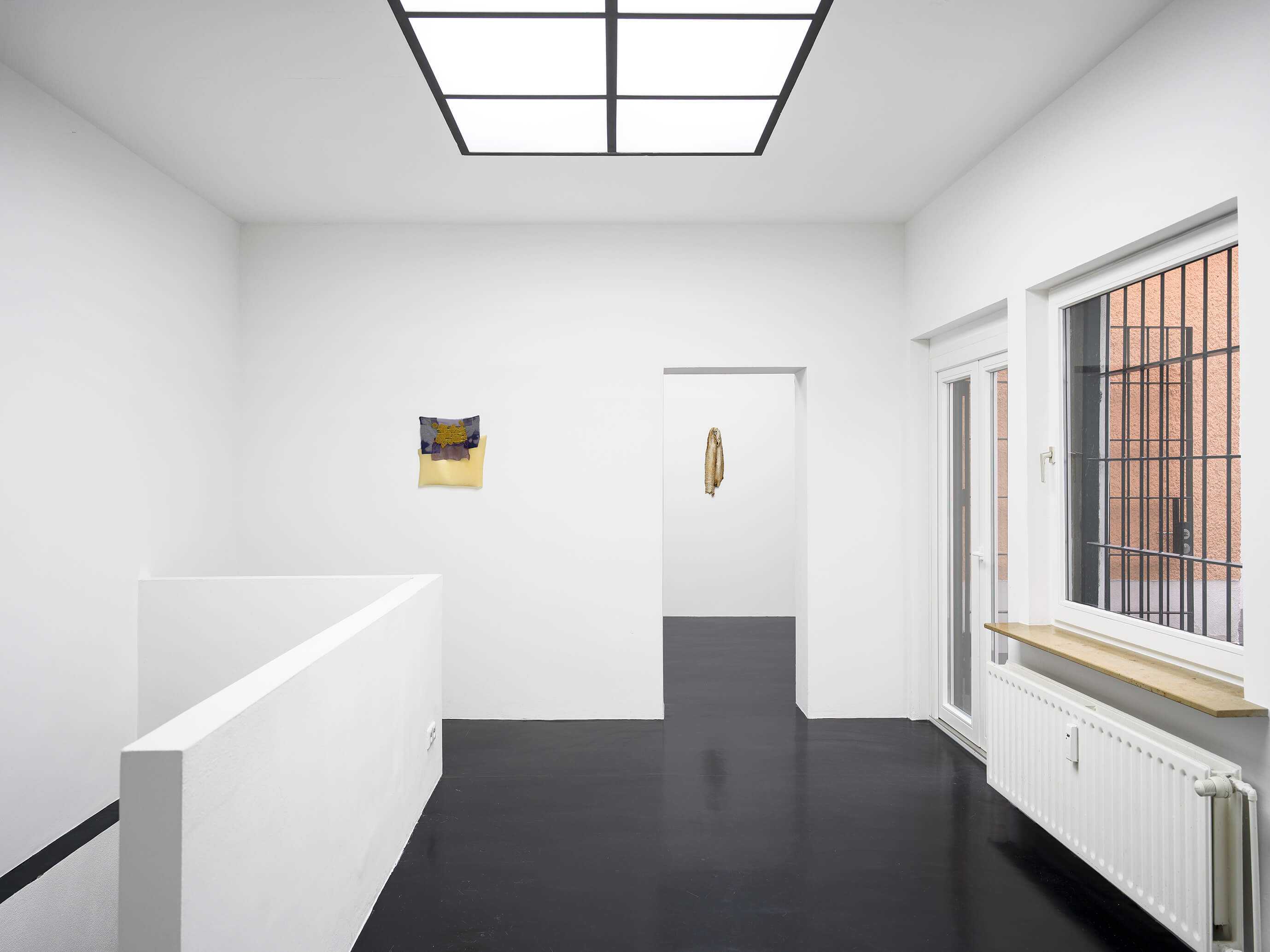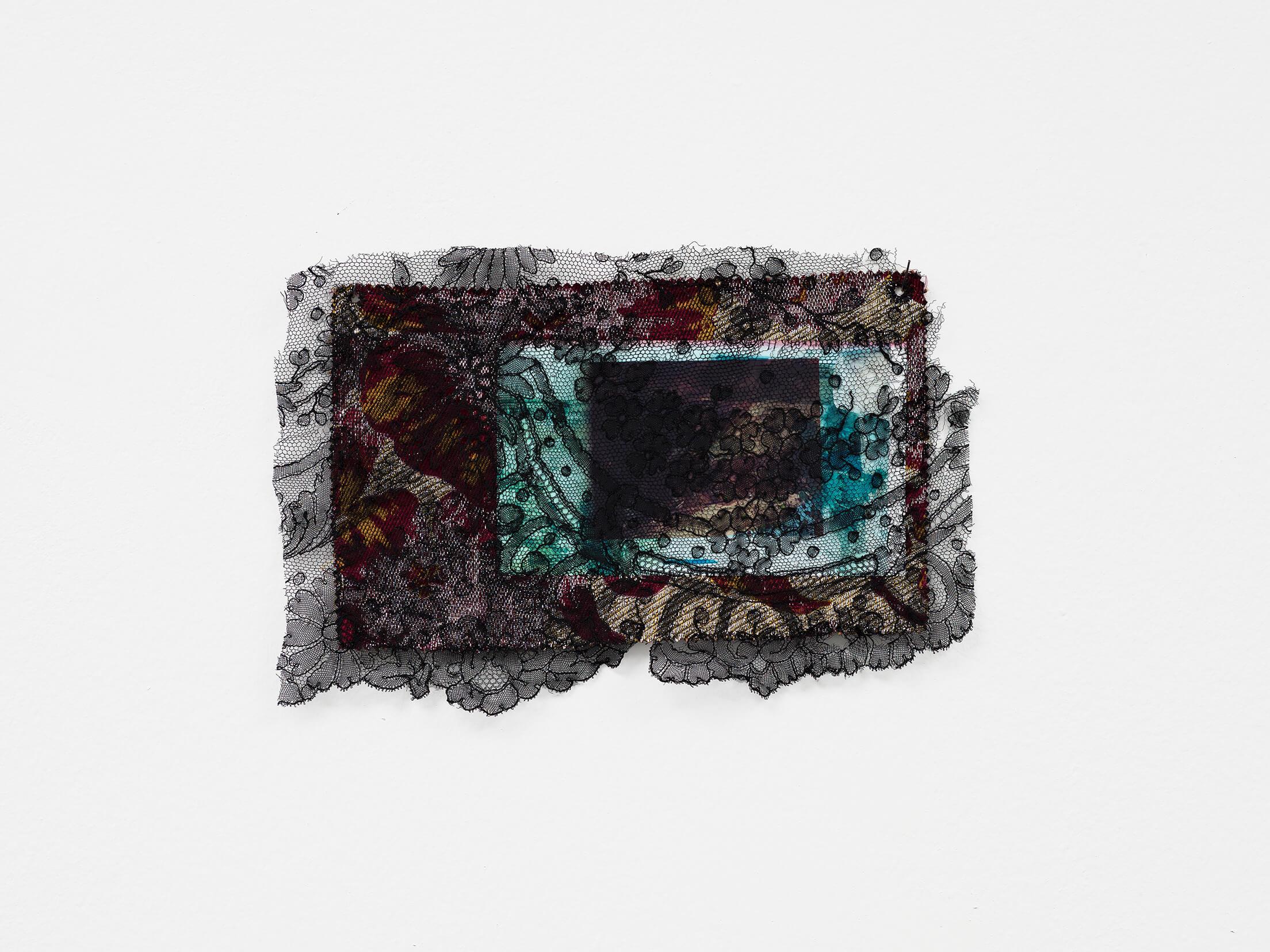 In her current exhibition, Anna Virnich addresses the heightened sensibility of the post-Corona era, the feeling of seeing more clearly, of being touched, but also connected with this "too late," with overtaxing, weariness. In Mutti raucht wieder we probably see her finest, most sculptural works to date, moving further and further away from the notion that what she is doing is "stitched painting," a response to postwar abstraction or color field painting. In them, an almost hysterical, decadent sensibility and nostalgia, an edgy unease with the present, coincides with materialist thinking, with an interest in material. Gauge Your Fears (2023), for instance, features a weave of stained chlorinated satin on a milky latex square. The embroidery flowers - callas - look like atomic mushrooms growing on pudding skin. Virnich's practice combines the touch of kink and camp with the canon and aesthetics of post-minimal and post-human thought.