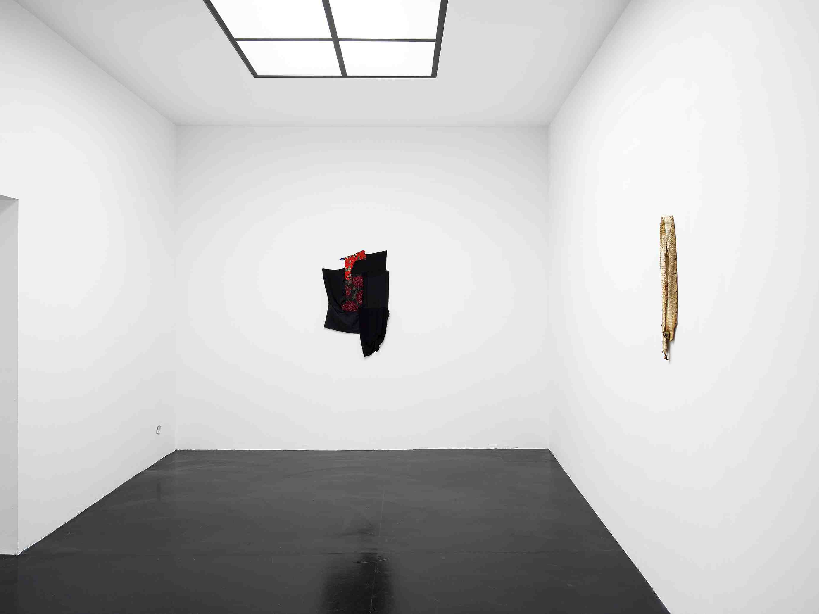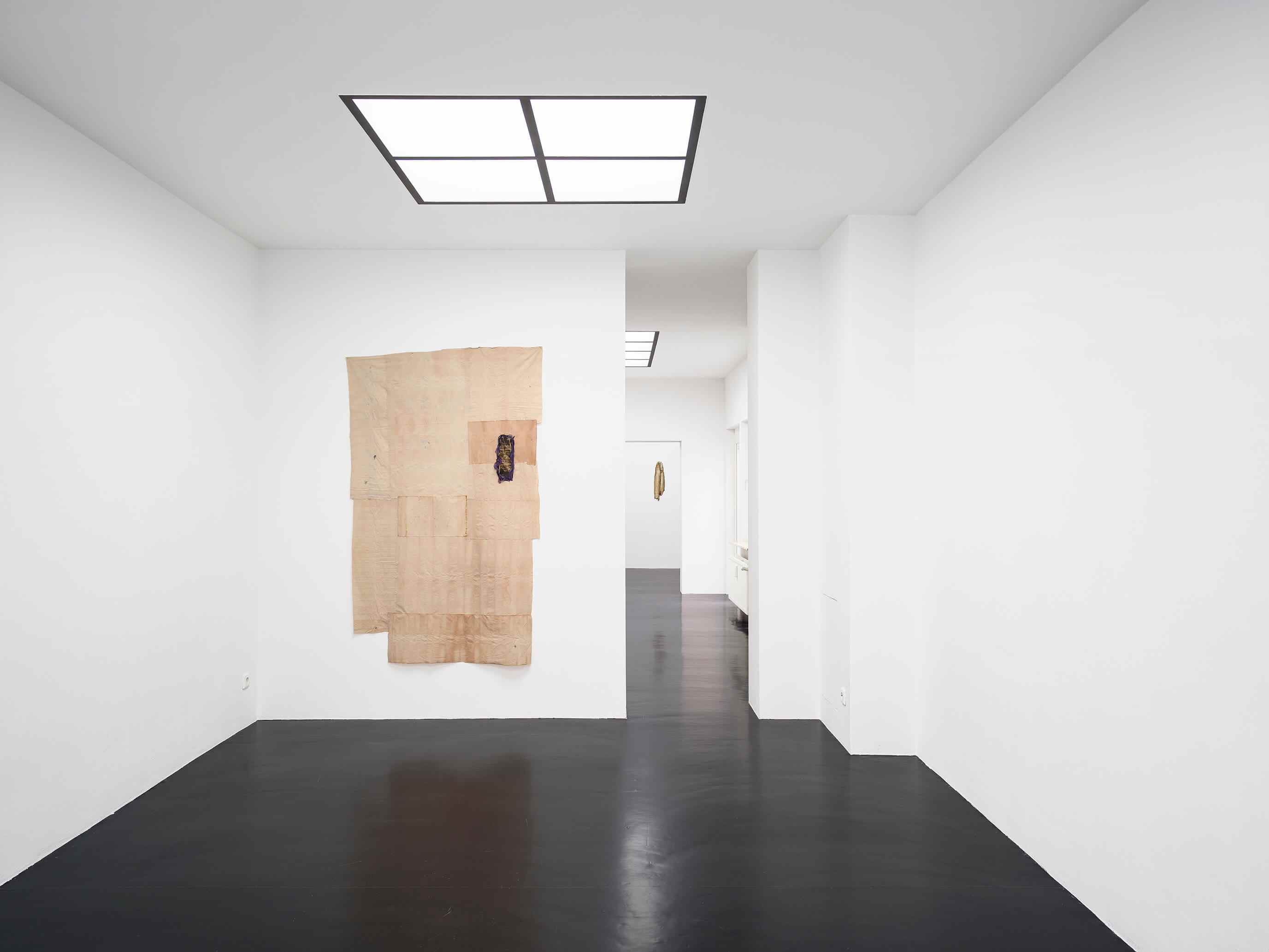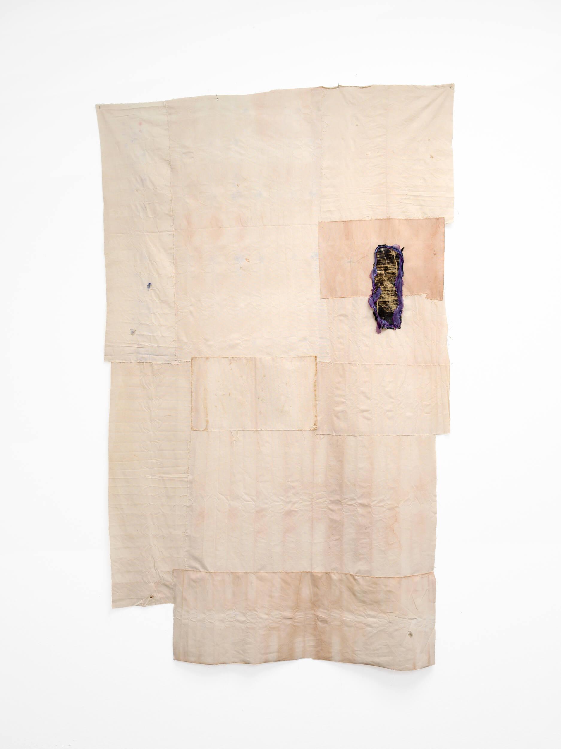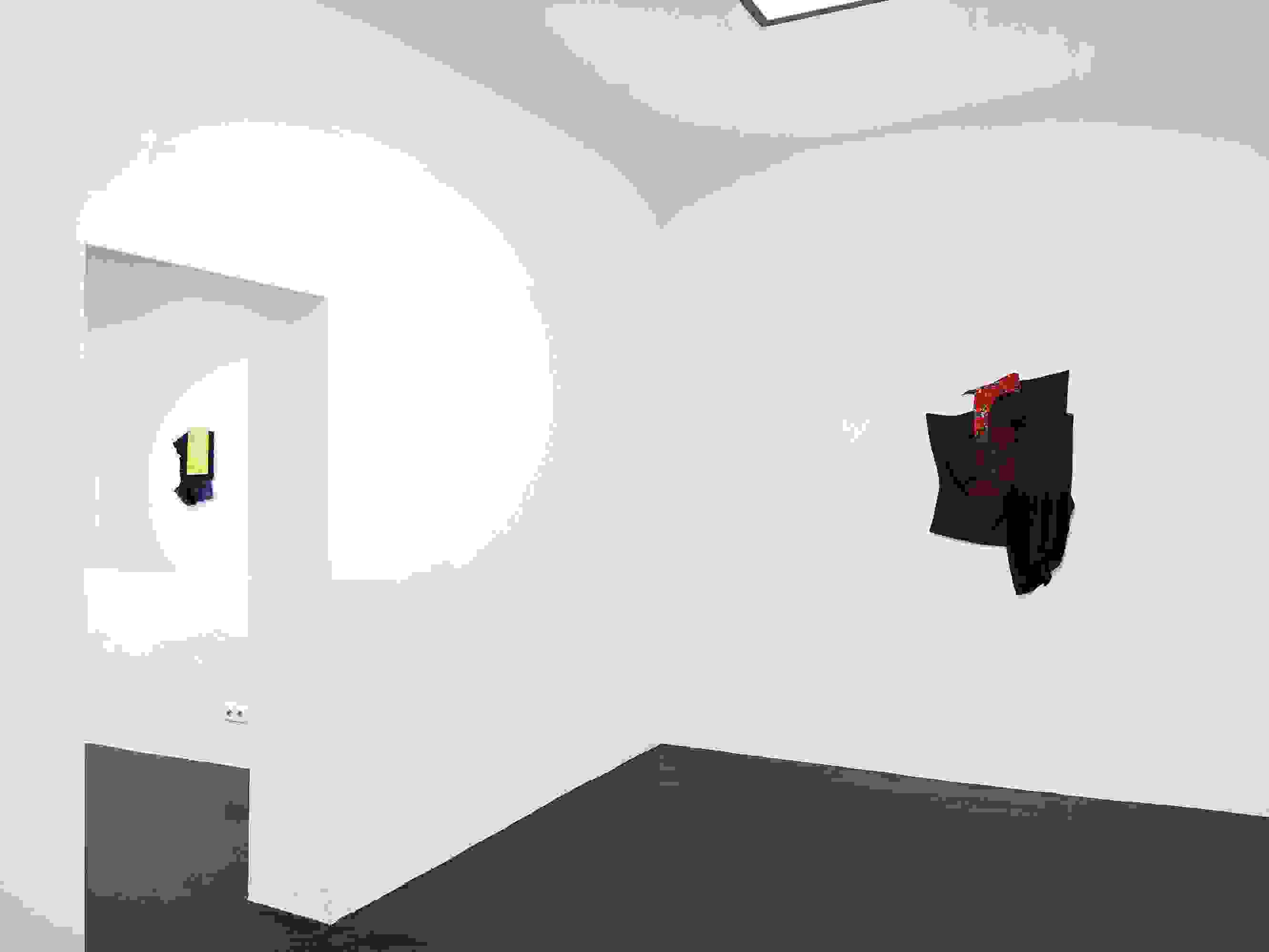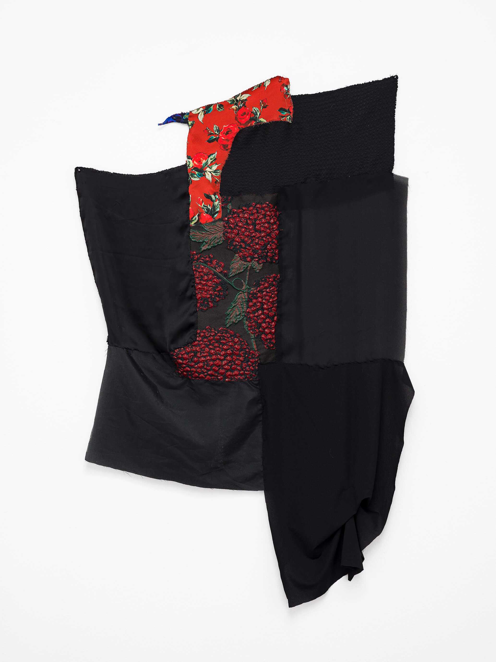 In her current exhibition, Anna Virnich addresses the heightened sensibility of the post-Corona era, the feeling of seeing more clearly, of being touched, but also connected with this "too late," with overtaxing, weariness. In Mutti raucht wieder we probably see her finest, most sculptural works to date, moving further and further away from the notion that what she is doing is "stitched painting," a response to postwar abstraction or color field painting. In them, an almost hysterical, decadent sensibility and nostalgia, an edgy unease with the present, coincides with materialist thinking, with an interest in material. Gauge Your Fears (2023), for instance, features a weave of stained chlorinated satin on a milky latex square. The embroidery flowers - callas - look like atomic mushrooms growing on pudding skin. Virnich's practice combines the touch of kink and camp with the canon and aesthetics of post-minimal and post-human thought.