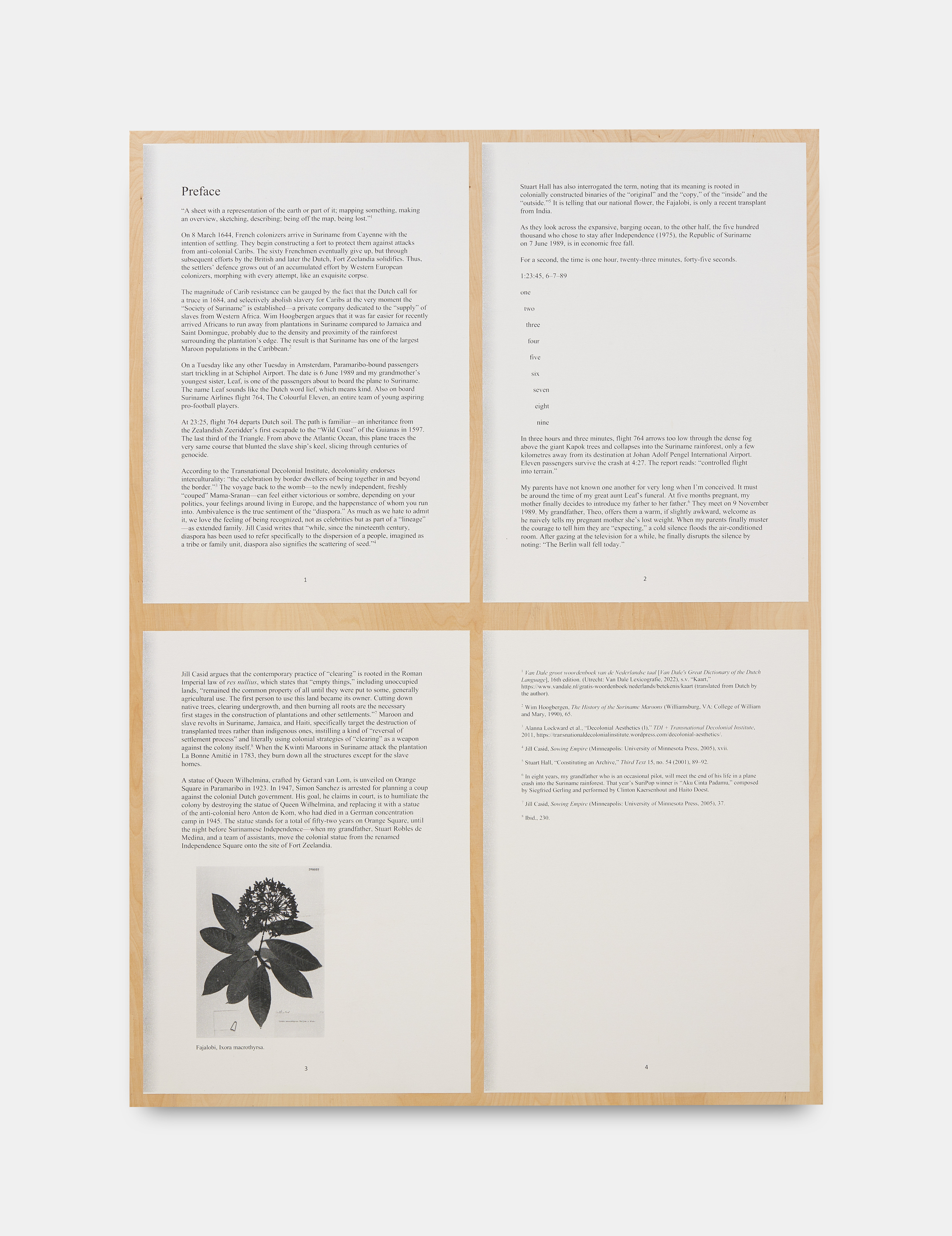 In the Grimm Brothers' tale, Snow White declares: "I will go away into the wild wood, and never come home again" as she is forced to venture into the wilderness to escape certain death. The term 'wild wood' holds both literal and metaphorical meanings, representing the unknown and standing in direct contrast to the concept of one's home. The tension between leaving safety behind and never returning home echoes diasporic experiences, and the artist’s personal journey of moving away from his homeland of Suriname. Robles de Medina uses this phrase as the title of the exhibition, inviting viewers to ponder the connection between the protagonist's statement, the artist's own journey, and the historical context around the time in which the story was written in 1812. During the early 19th century, the Global South was still grappling with European colonisation, whilst debates surrounding the ethics of slavery intensified in Western Europe. Considering this historical backdrop, the artist questions whose voice the sentence "I will go away into the wild wood, and never come home again" truly represents— those forced to leave home as a result of war, imperialistic conquest, or enslavement, or perhaps the European explorers venturing into uncharted territories in pursuit of conquest?