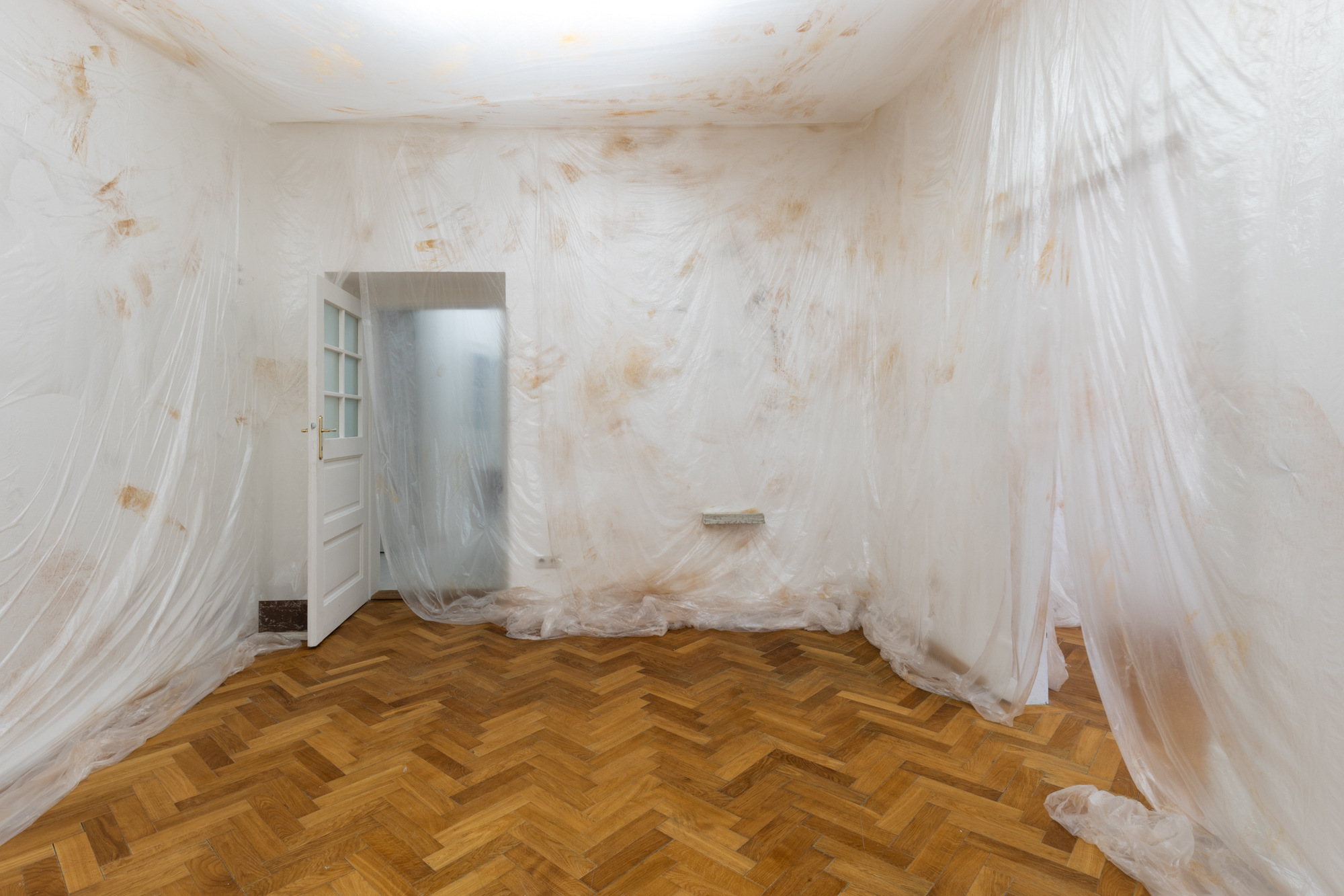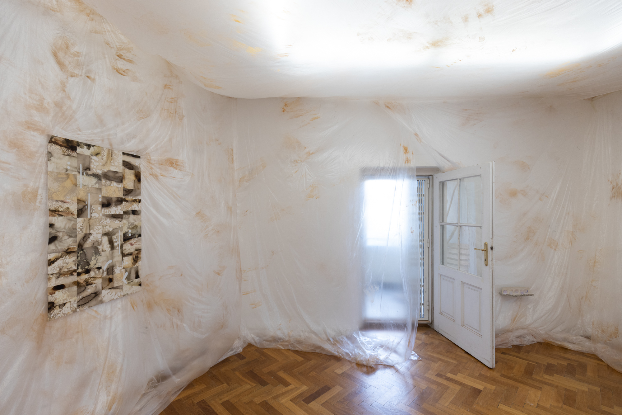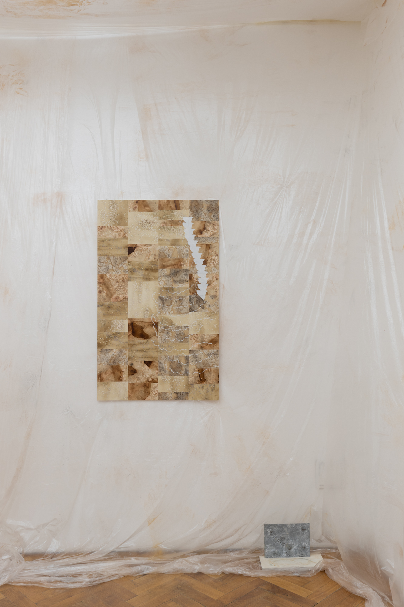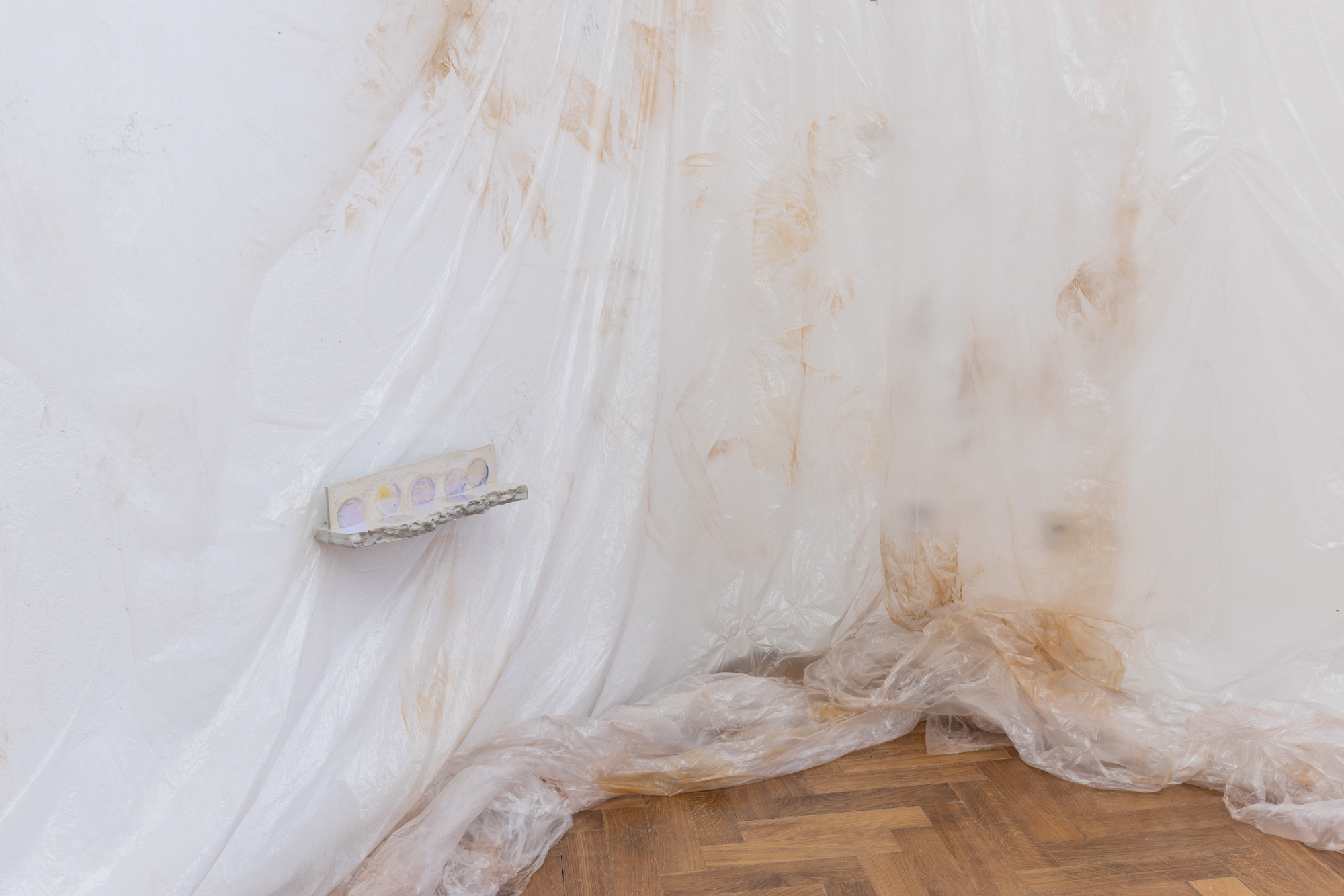 When entering ‘Thresholds and Their Phantoms’ the atmosphere of the space seems provisional. The sensory experience is estranging since the walls are covered with subtle sprayed, thin plastic sheets. Here, she is showing new partially printed collages called ‘Die Vorläufigkeit der Übertragung’ (The provisional nature of the transmission). They are made of papers treated with potato juice, and deal with point of connection where information is converted and transmitted. Is this happening in a 1:1 form? What are the cumulative errors and information falsifications when transmitting information?