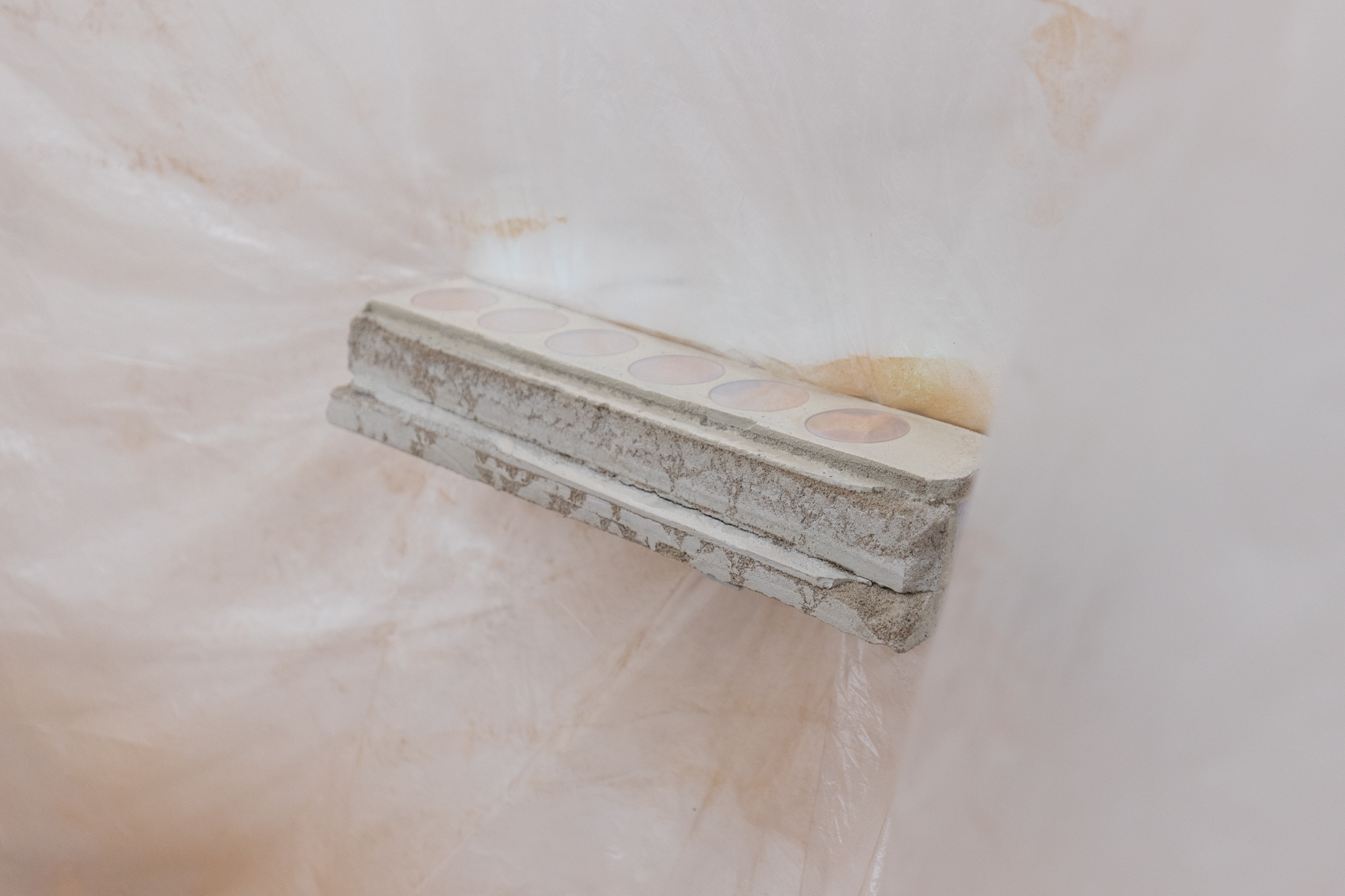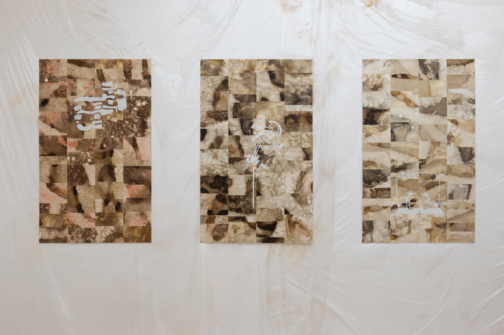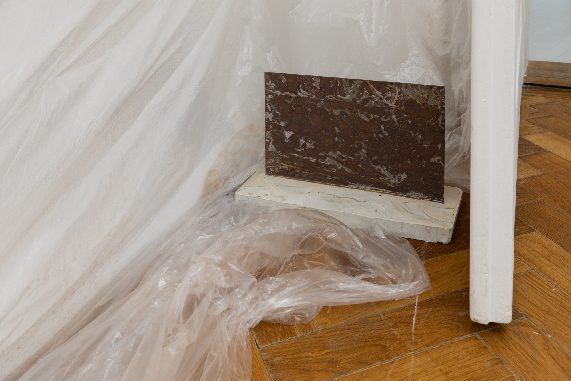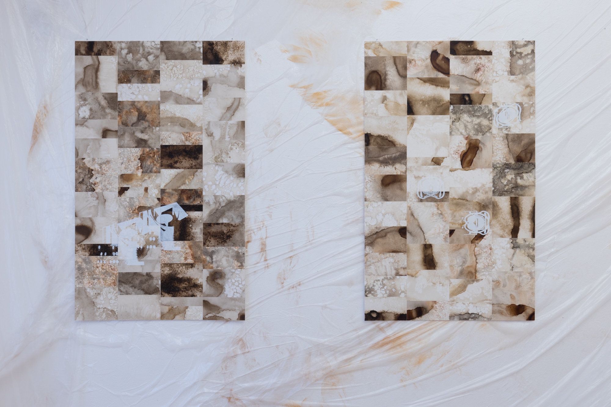 When entering ‘Thresholds and Their Phantoms’ the atmosphere of the space seems provisional. The sensory experience is estranging since the walls are covered with subtle sprayed, thin plastic sheets. Here, she is showing new partially printed collages called ‘Die Vorläufigkeit der Übertragung’ (The provisional nature of the transmission). They are made of papers treated with potato juice, and deal with point of connection where information is converted and transmitted. Is this happening in a 1:1 form? What are the cumulative errors and information falsifications when transmitting information?