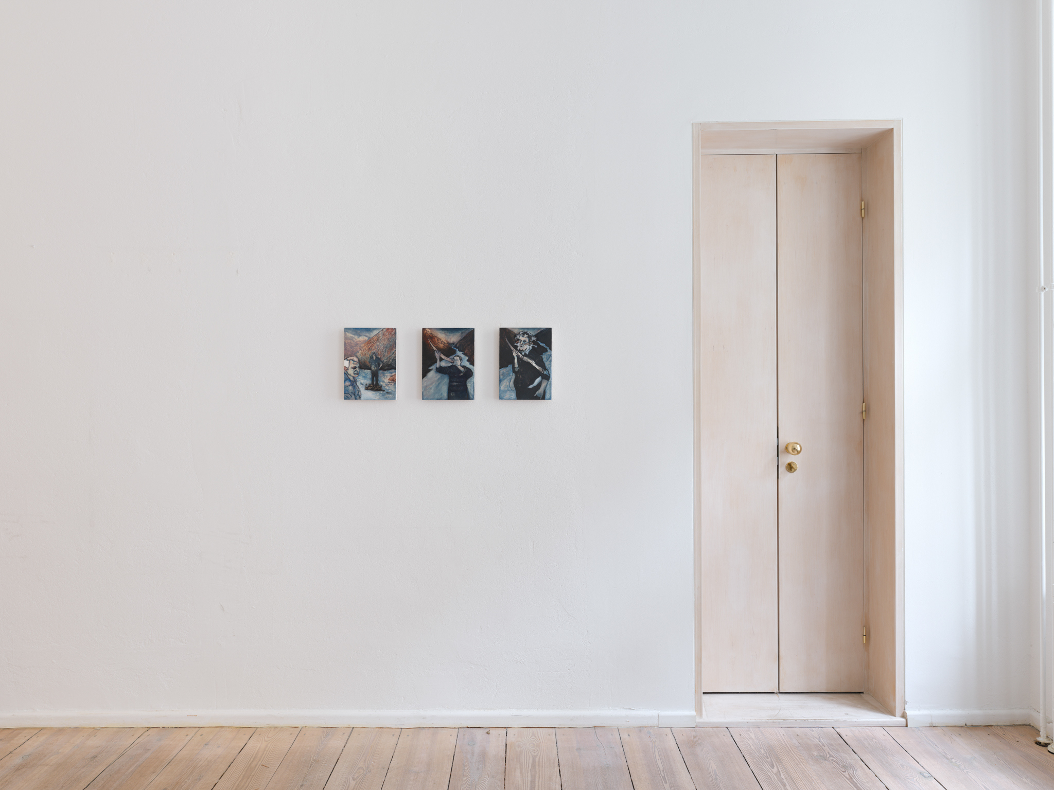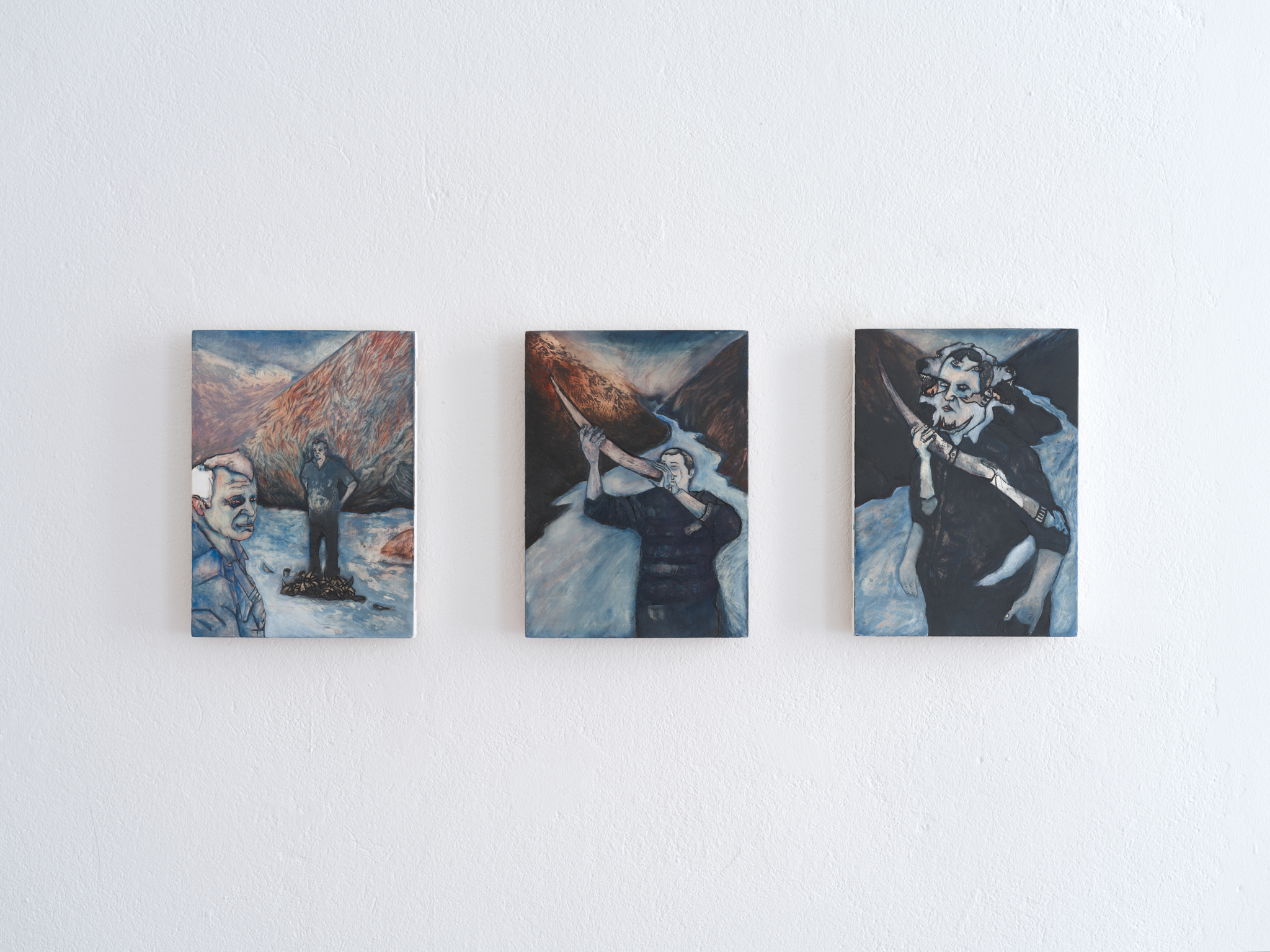 In Nika Kutateladze’s three serial works, we see a cinematic tableau of a story set in a mountainous region, centred in a ravine. Working in either immersive installations or painterly series, Kutateladze’s paintings are constructed with oil on grounded wood, where he frequently refers to compositional schemes of Georgian medieval iconography. Allegorical subject matter is at the forefront of his practice that conjures a filmic quality both haunting and evocative.