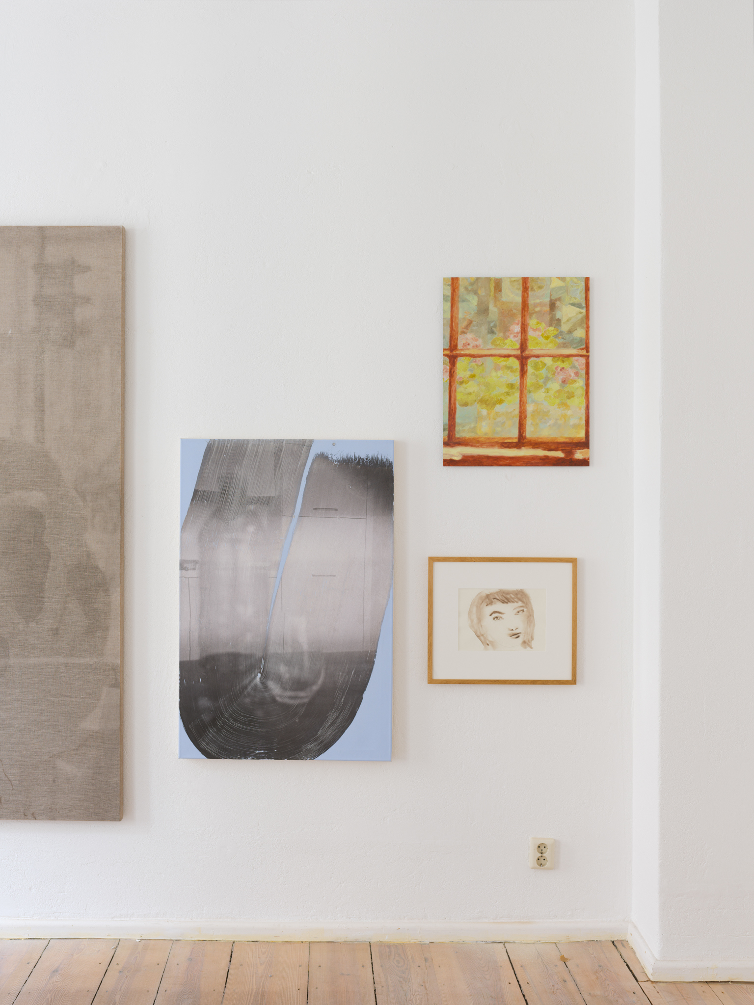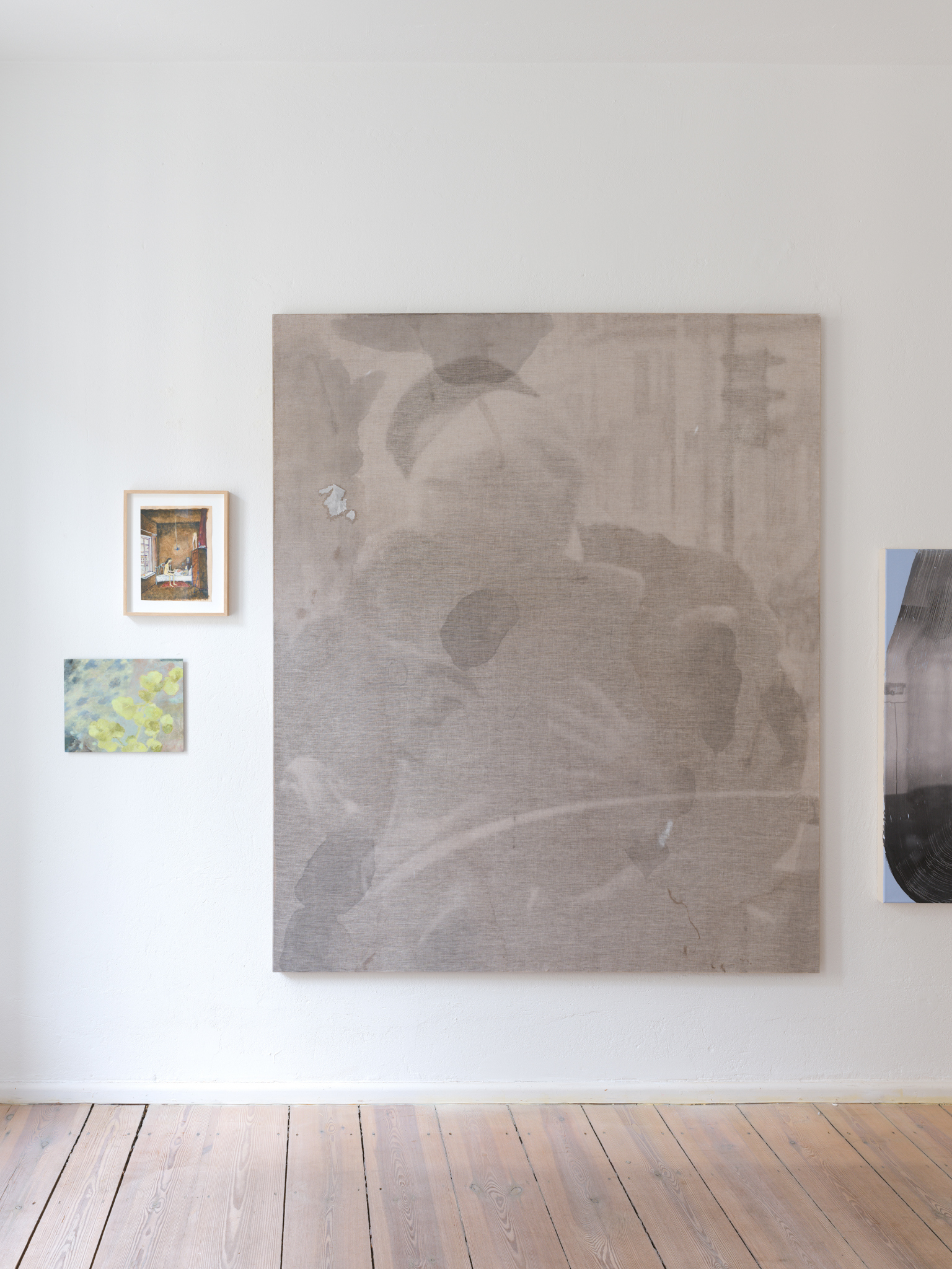 In relation to his own biography, Ian Waelder explores intimate memories and traces within his work. Personal stories, objects and relics serve as a starting point that through a process of translation, he develops into scenes that sit somewhere between fiction and reality. In "Handle with care (Les Quatre Cents Coups)" Waelder constructs a multi-layered composition of abstracted gestures alongside stains, where a ghost-like image seemingly appears through the raw linen canvas.