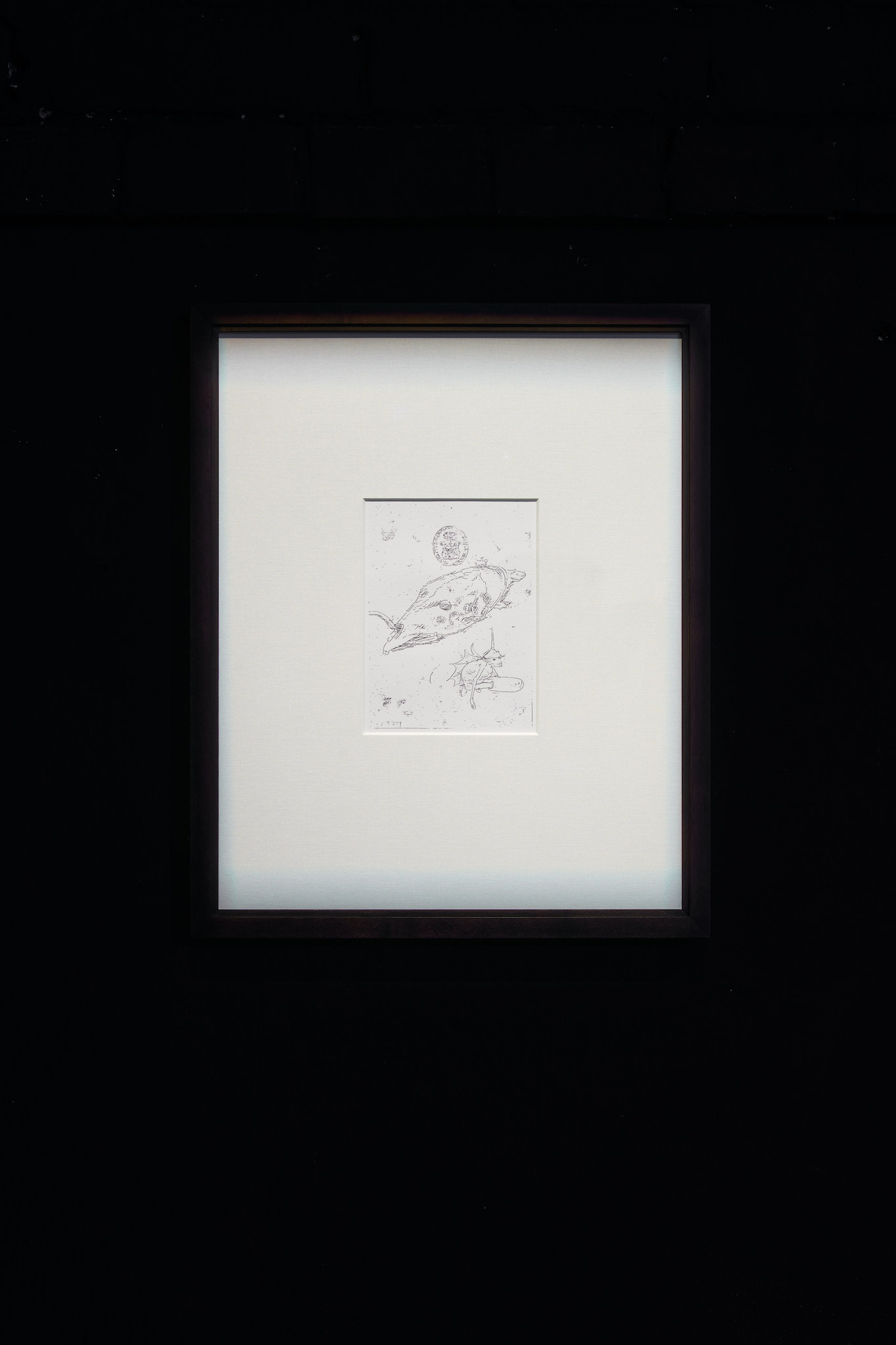 MAIN BODY drawing V (after H. Bosch, Two fantasy creatures), 2023, automatic drawing on paper, 16,4 x 12,2 cm, framed, 45 x 37 cm