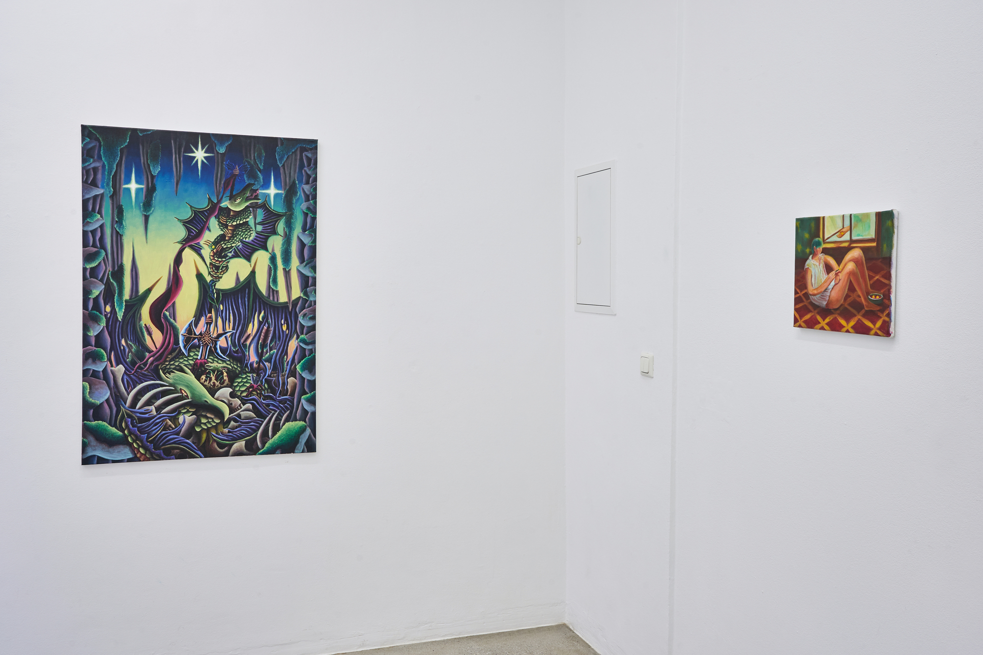 Jimmy Vuong, born in 1995 in Munich, specializes in painting and drawing. He transforms the world of emotions and their everyday manifestation in his immediate environment into a dense network of visual narratives. These narratives create a unique cosmos, yet they are influenced by the visual language of chivalric epics, Western and Eastern iconography, and art history. His small drawings, which are an essential part of his oil paintings, are just as detailed and compositionally mature as his large-scale works in oil. Despite the multitude of depictions, one can always recognize the universal and timeless symbols that bloom within the images. They are like artistically woven stories that narrate themes such as life and death, love and disappointment against the backdrop of the romanticized form of flora and fauna.