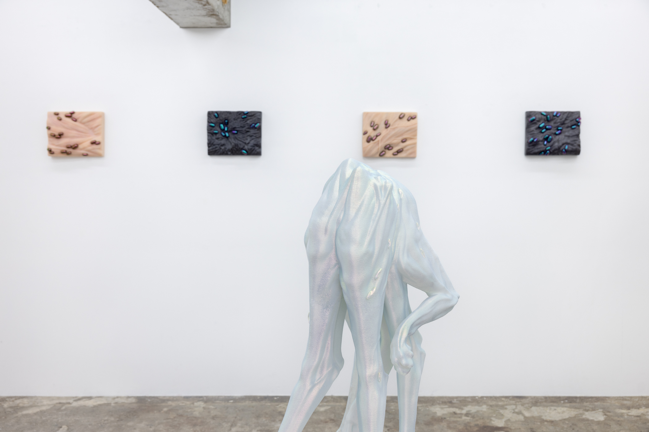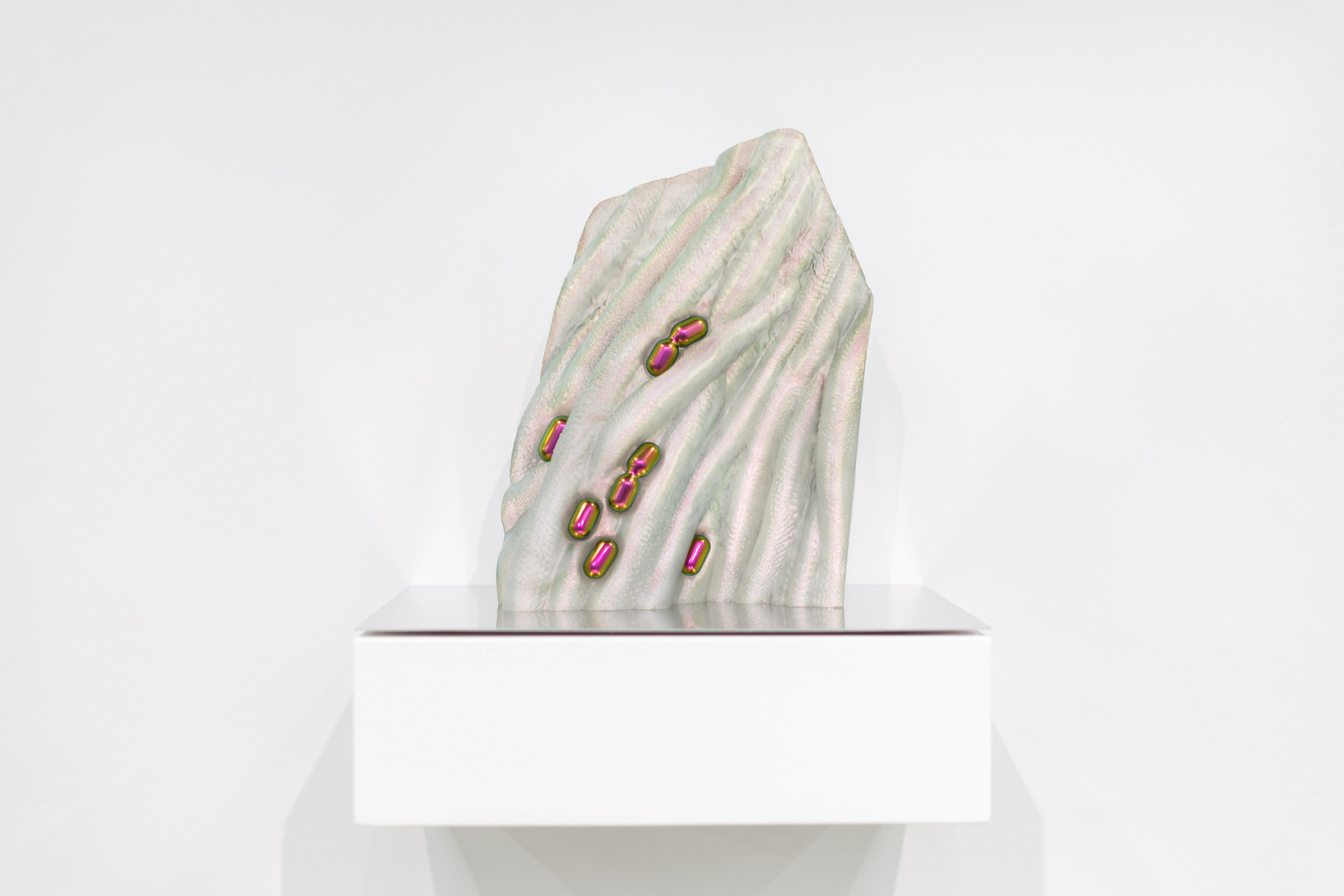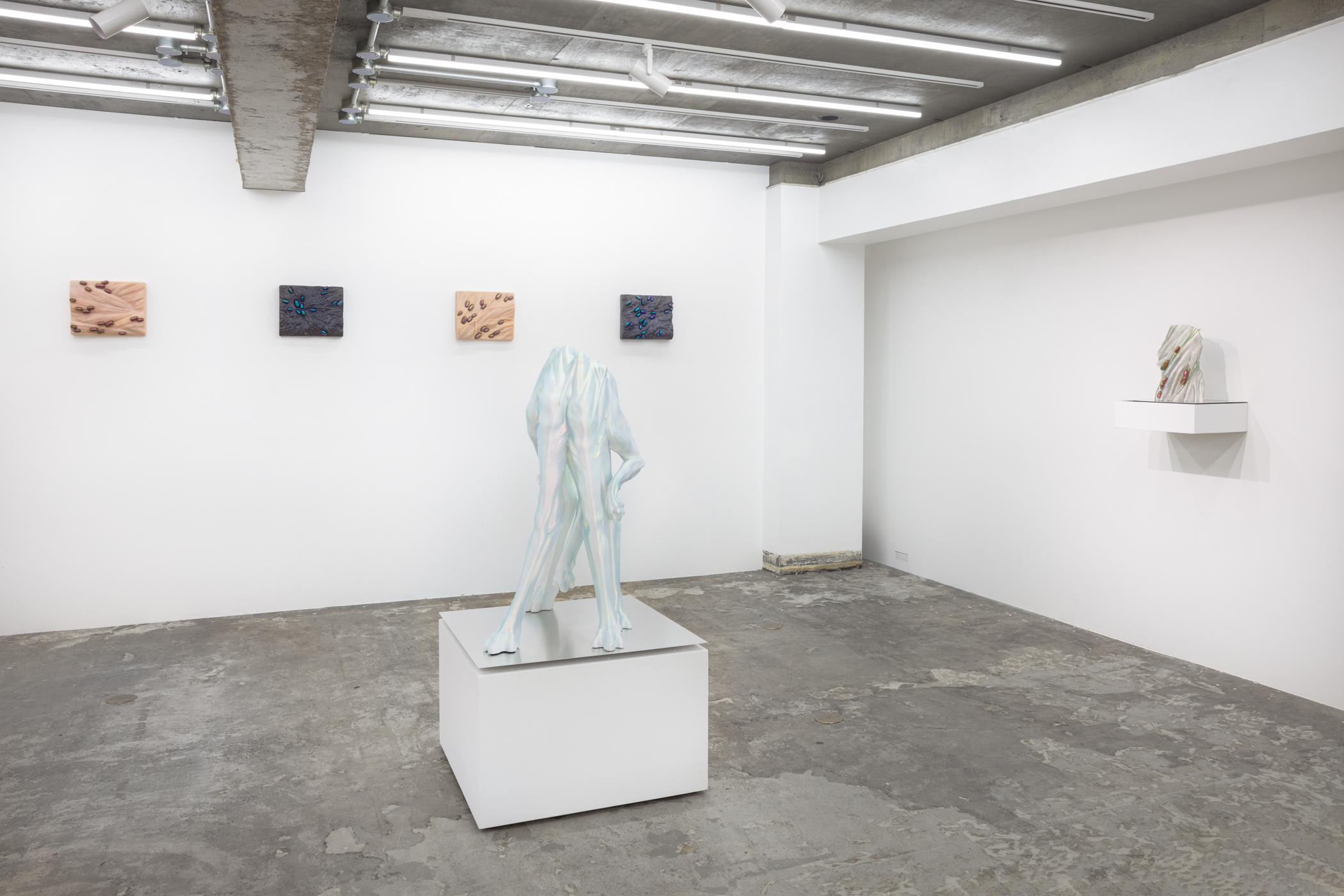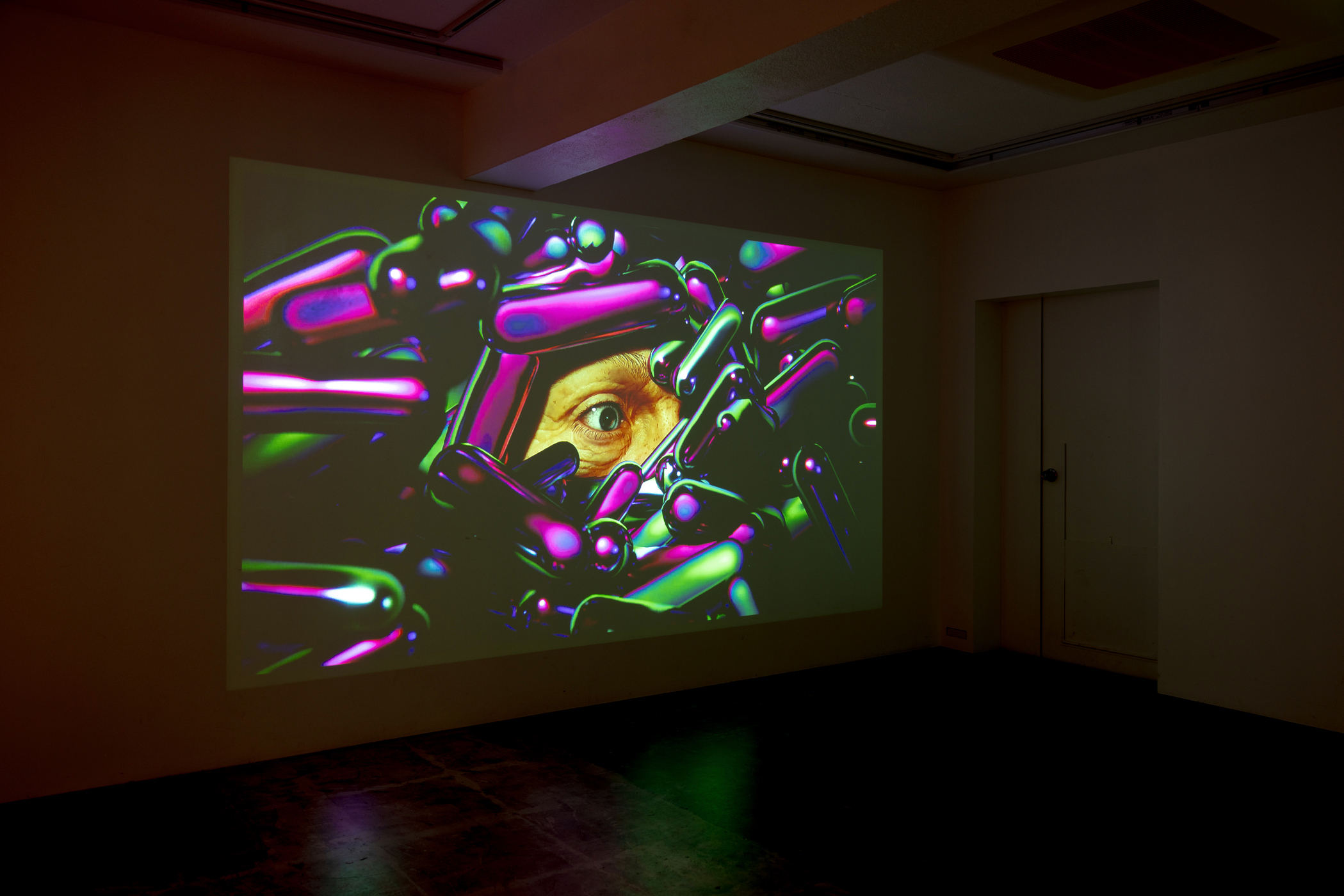 Shiny, multiple, perfect abstract shapes overwhelm and engulf the landscapes of biomorphic patterns present in the exhibition’s sculptures and video projections. As in the body-horror movies Akira (1988) and Videodrome (1983), the concept of overgrowth is evoked as the continuous struggle between creation and entropy - both at the microscopic scale and at the cosmic scale, both in the physical world and in the virtual world.