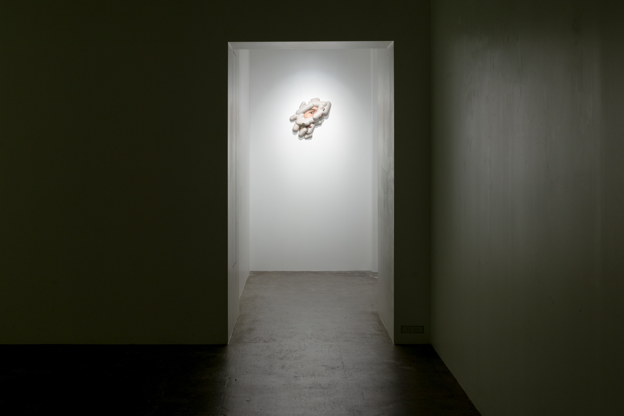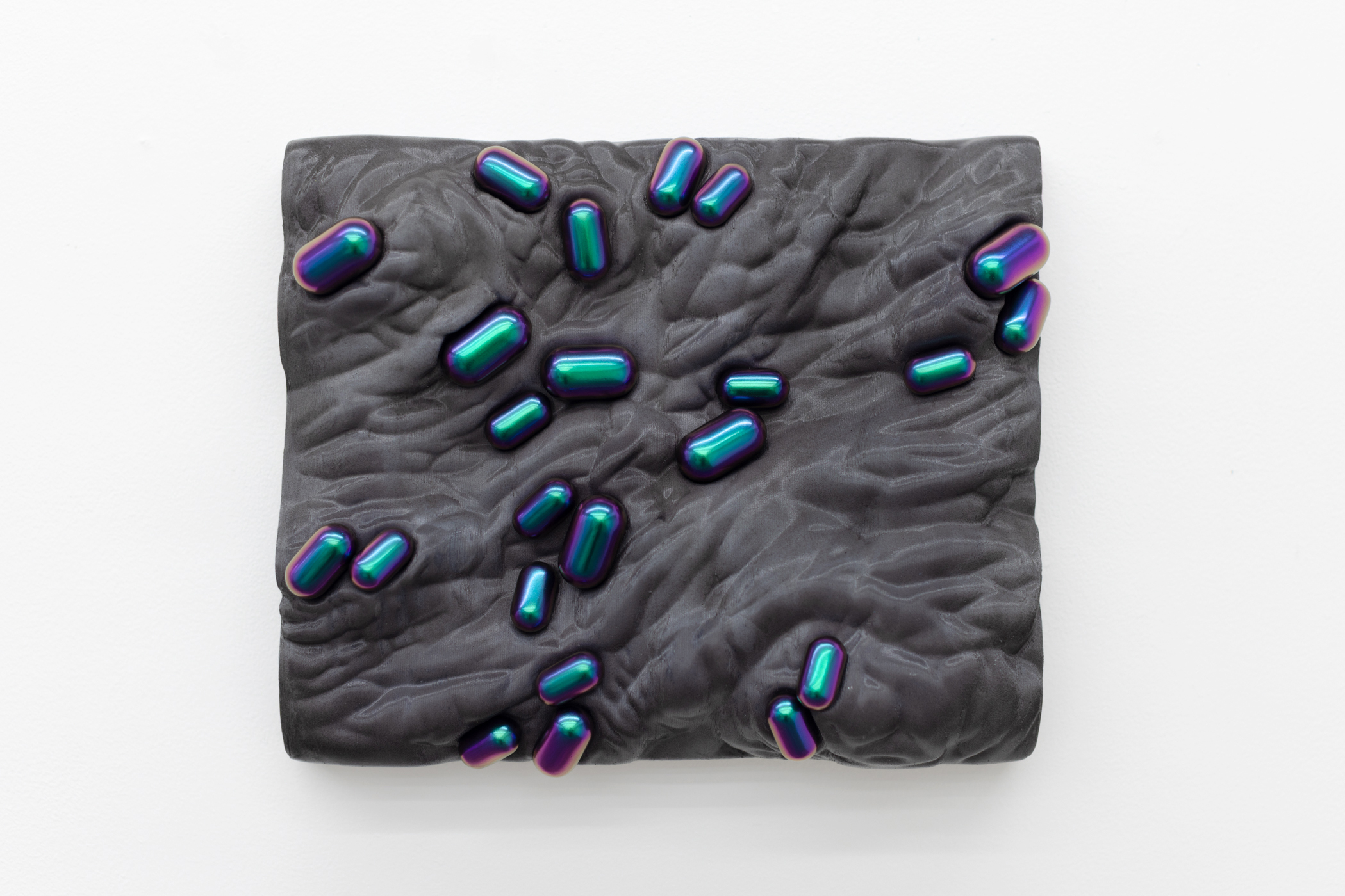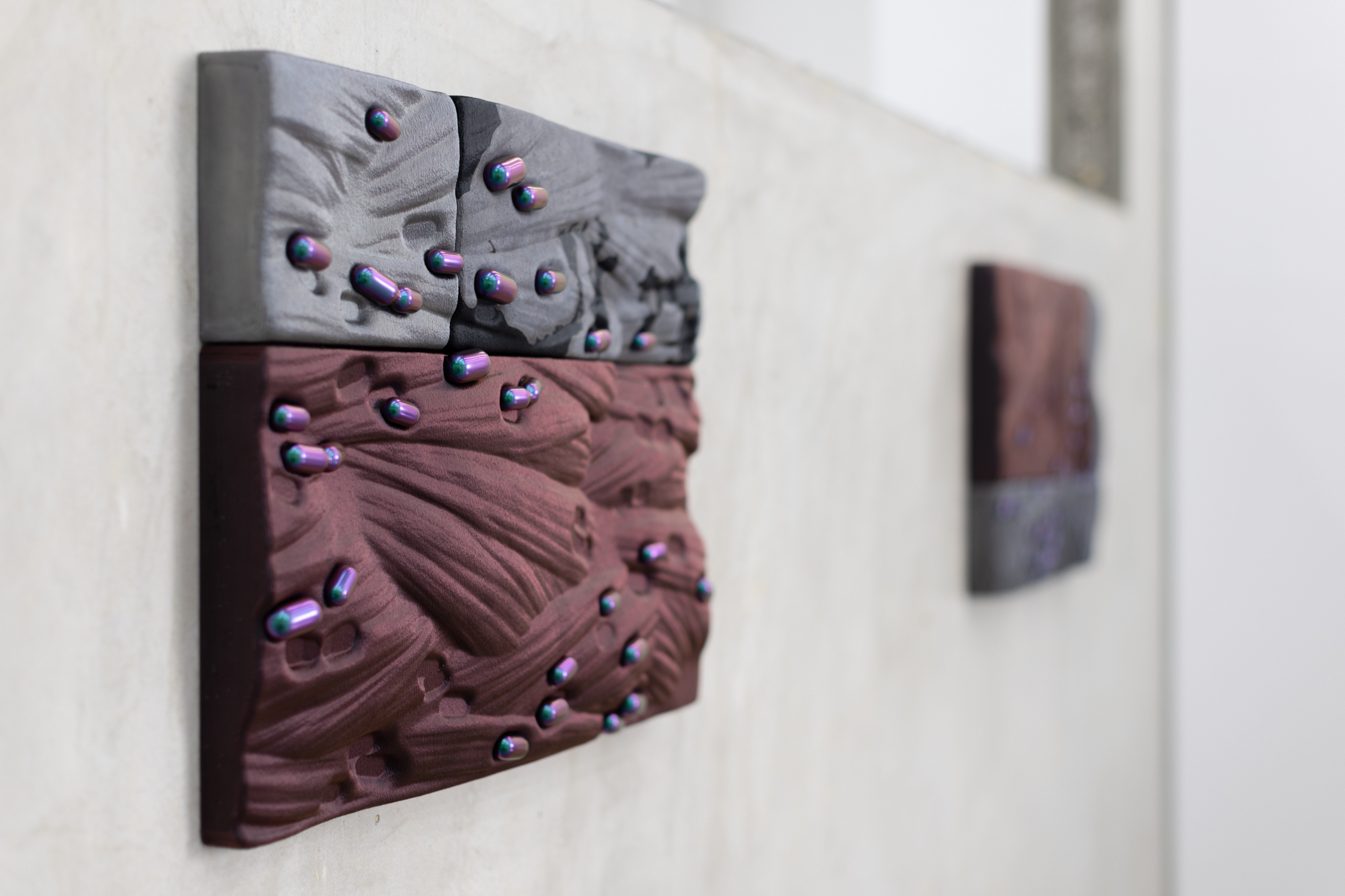 Shiny, multiple, perfect abstract shapes overwhelm and engulf the landscapes of biomorphic patterns present in the exhibition’s sculptures and video projections. As in the body-horror movies Akira (1988) and Videodrome (1983), the concept of overgrowth is evoked as the continuous struggle between creation and entropy - both at the microscopic scale and at the cosmic scale, both in the physical world and in the virtual world.