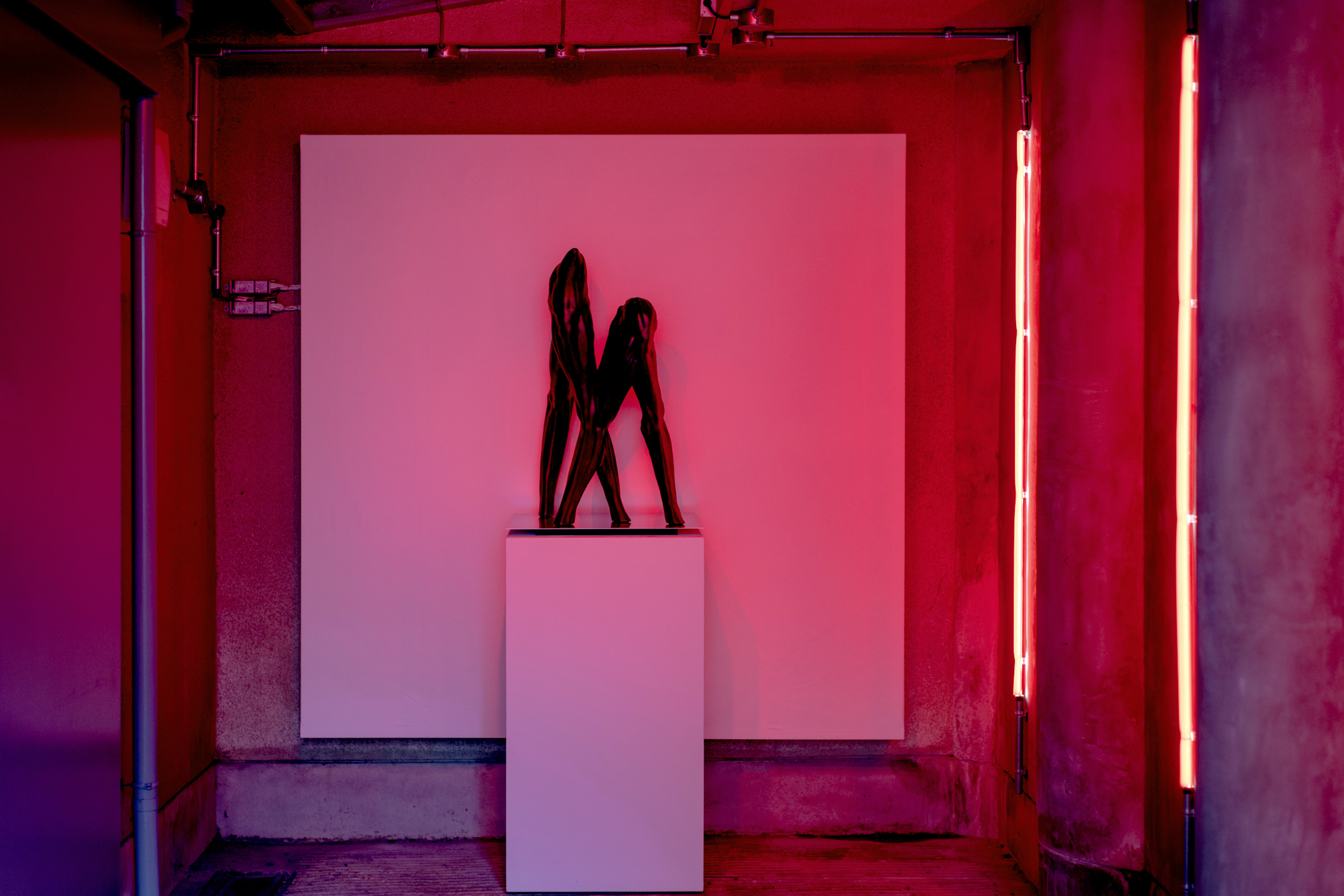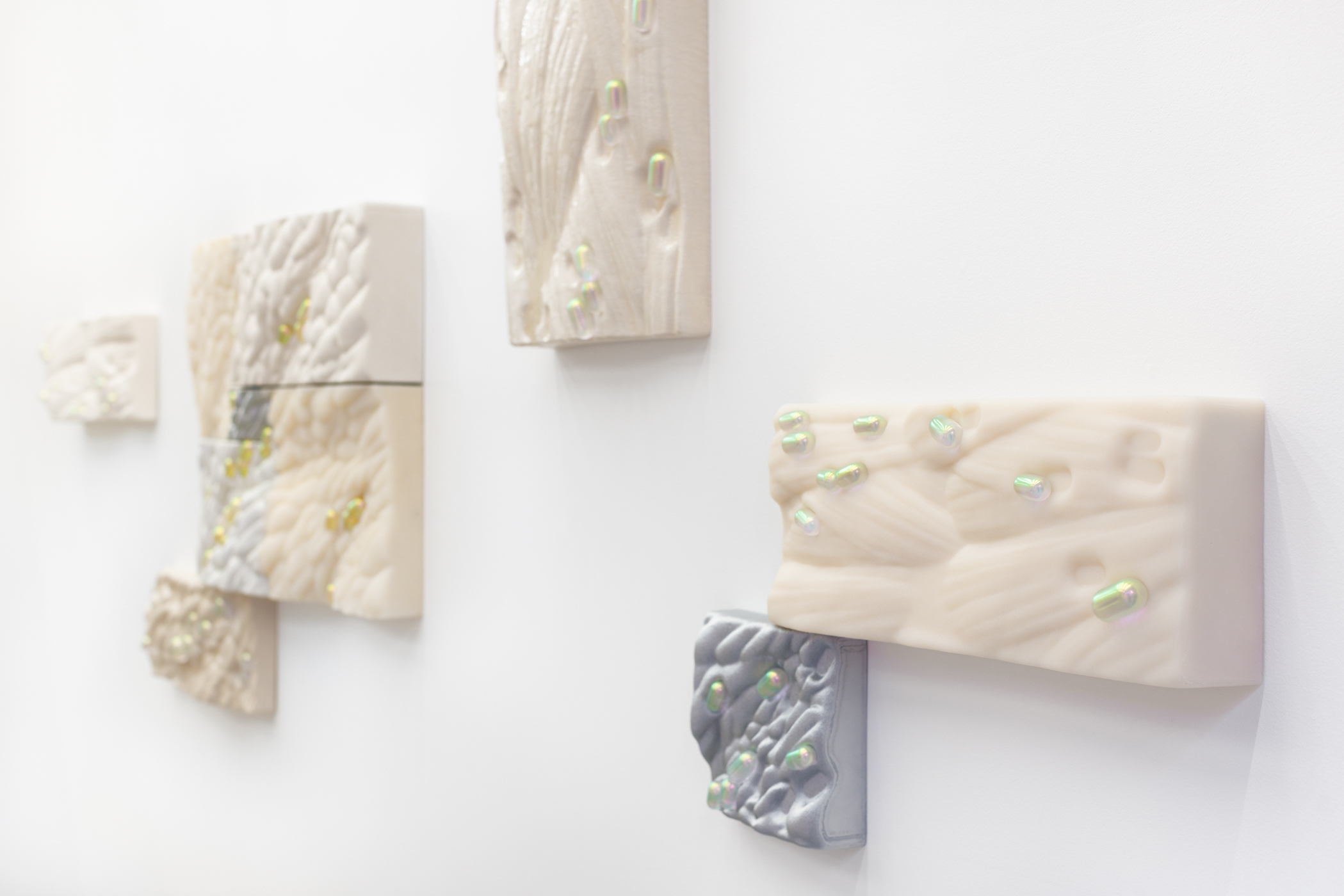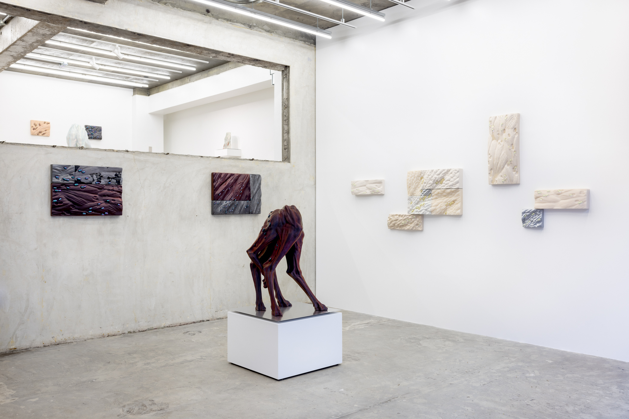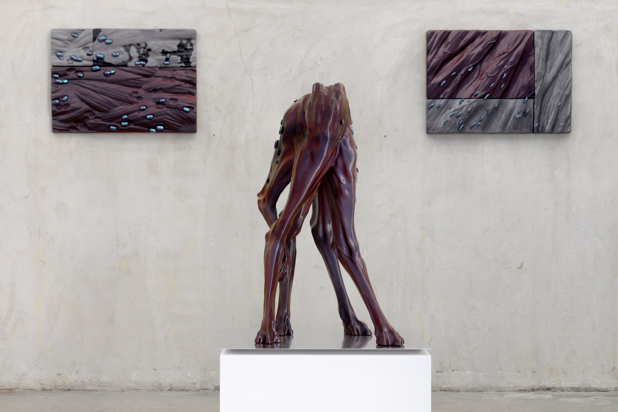 Shiny, multiple, perfect abstract shapes overwhelm and engulf the landscapes of biomorphic patterns present in the exhibition’s sculptures and video projections. As in the body-horror movies Akira (1988) and Videodrome (1983), the concept of overgrowth is evoked as the continuous struggle between creation and entropy - both at the microscopic scale and at the cosmic scale, both in the physical world and in the virtual world.