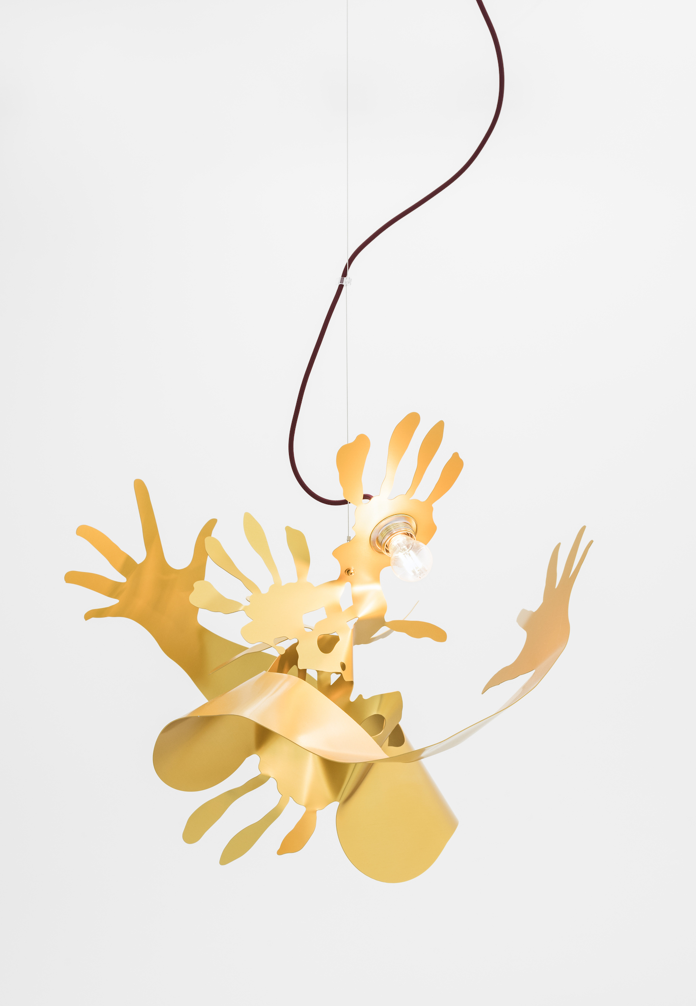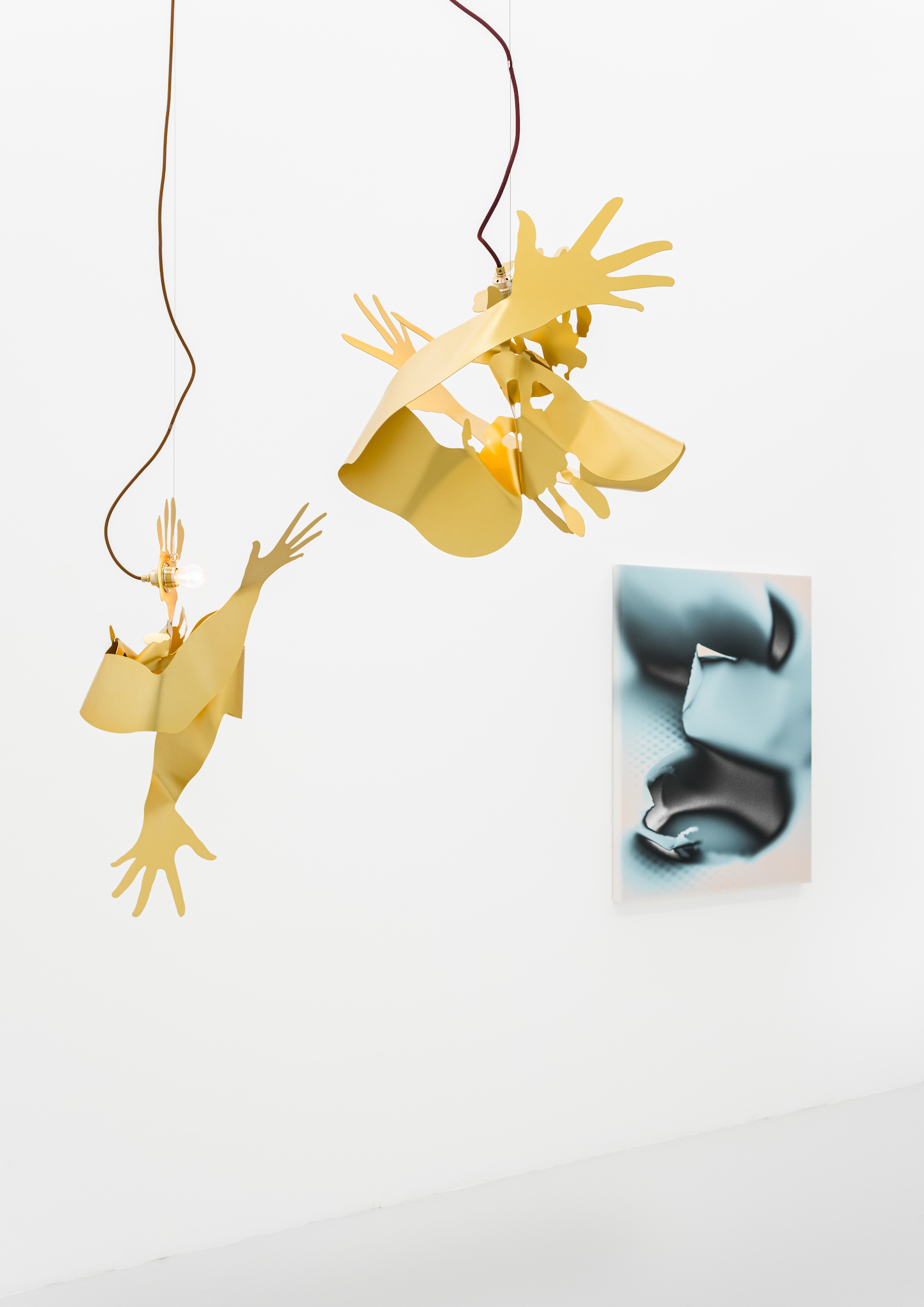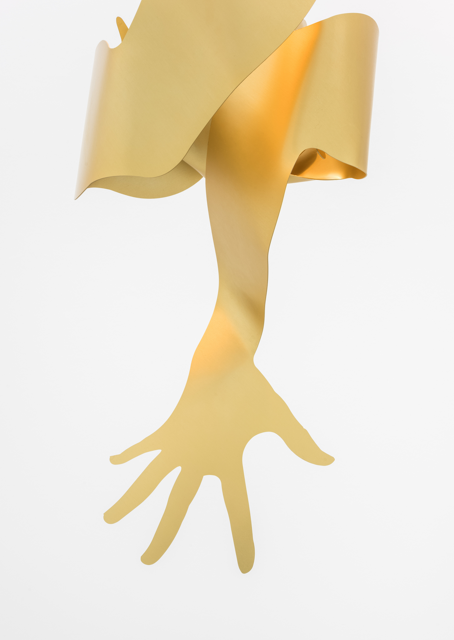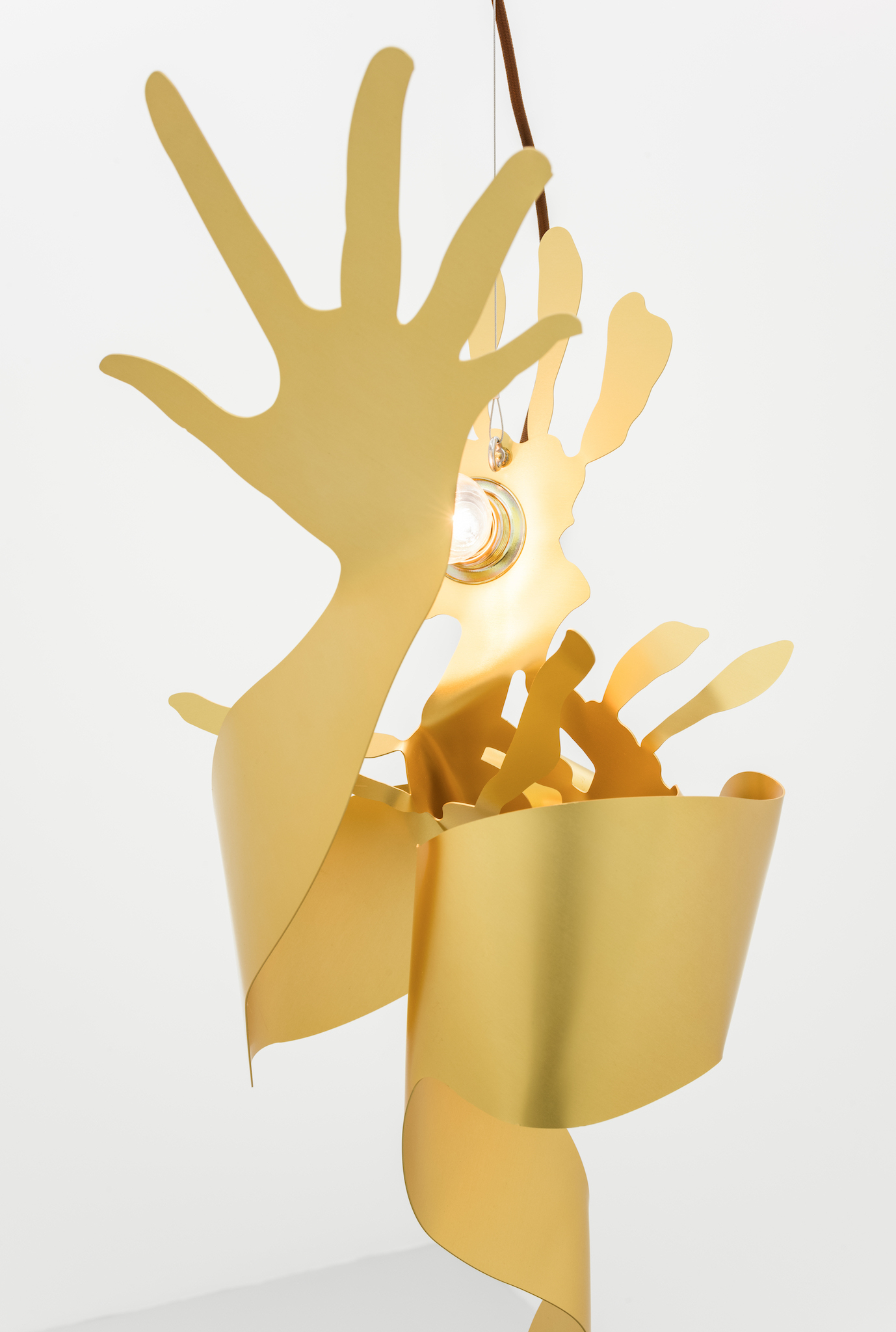 Metallic hands writhing, a gesture akin to flames. Aluminum surfaces catch the light as they mingle â[a]nd pour their diamond fires in mine eyes[.]â1 Shadows intermittently veil the brilliance, in doing so, contrasting the golden glowâabstract spatiality of anodized worlds. Through bending these expressive gesticulations emerge; it would appear the splaying of fingers induces self-amorphosis. Perhaps this is also a result of the light source, which, in the round dance of the hands, exerts its power and causes matter to melt. In the background, stranded wire and cable clamps. They brace and support, form the scaffolding to which the dance of light is affixed. Likewise, it can be arguedâechoing Leroi-Gourhanâthat their constitution itself readily identifies them as machine-made. Whereas ropes were once handmade, âthere was [...] an exteriorization of muscle powerâ2 and the apparatus annexed human proficiency. As much as aluminum captivates with its life-like contours and figurative design, it too is wholly alienated from the notion of human skilled craftsmanship. Bundled light and computer-aided design are integral to its creation. Could this be why the hand cautions us, warns us against âa mutation of the external organism which, in the human, substitutes itself for the human body[?]â3 An organism we can no longer identify as a machine?