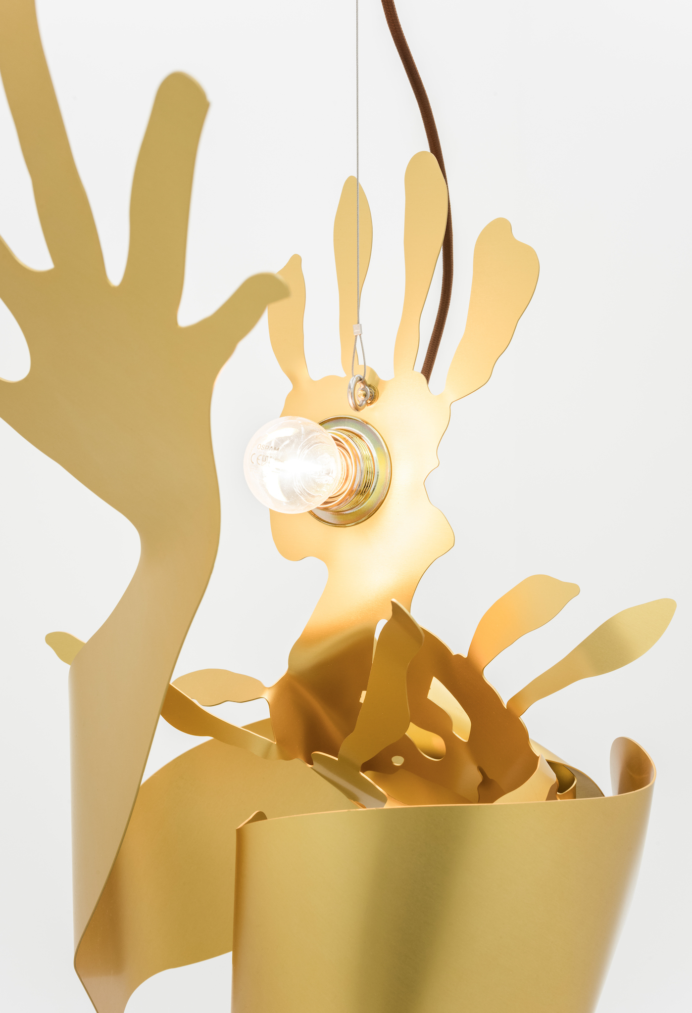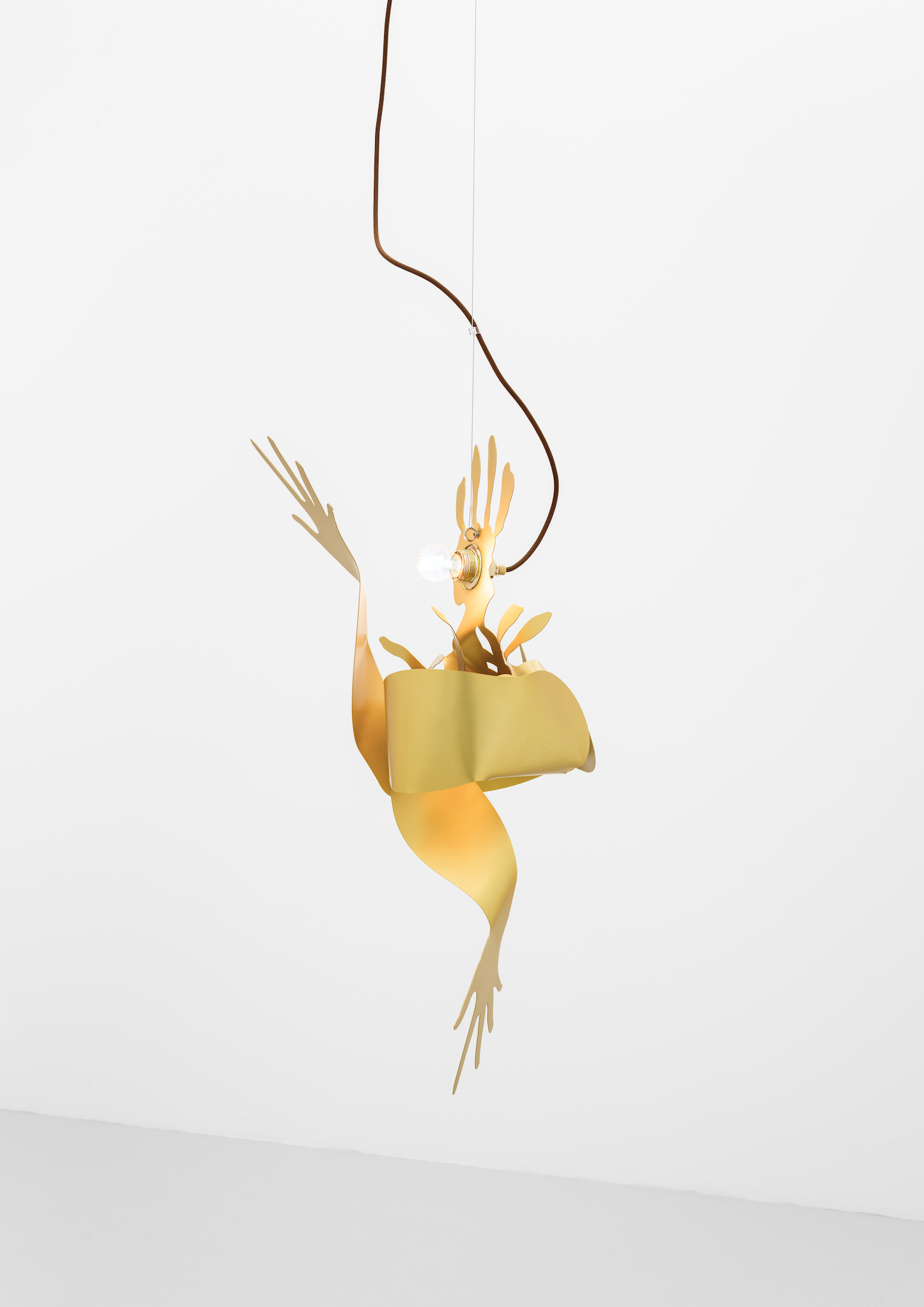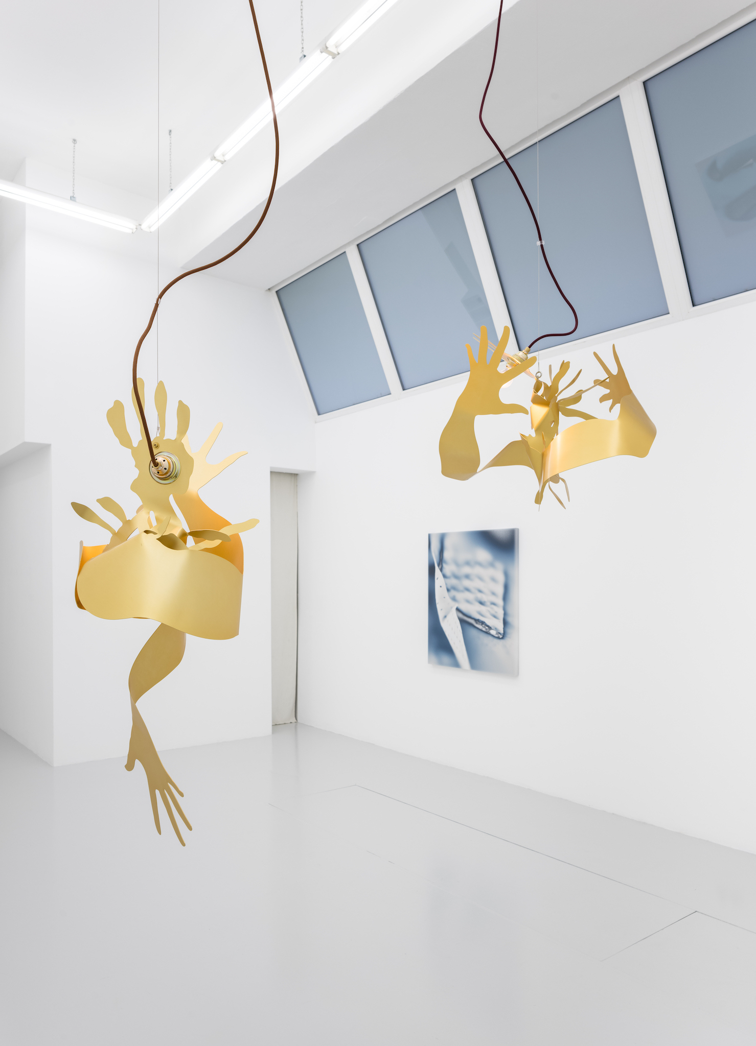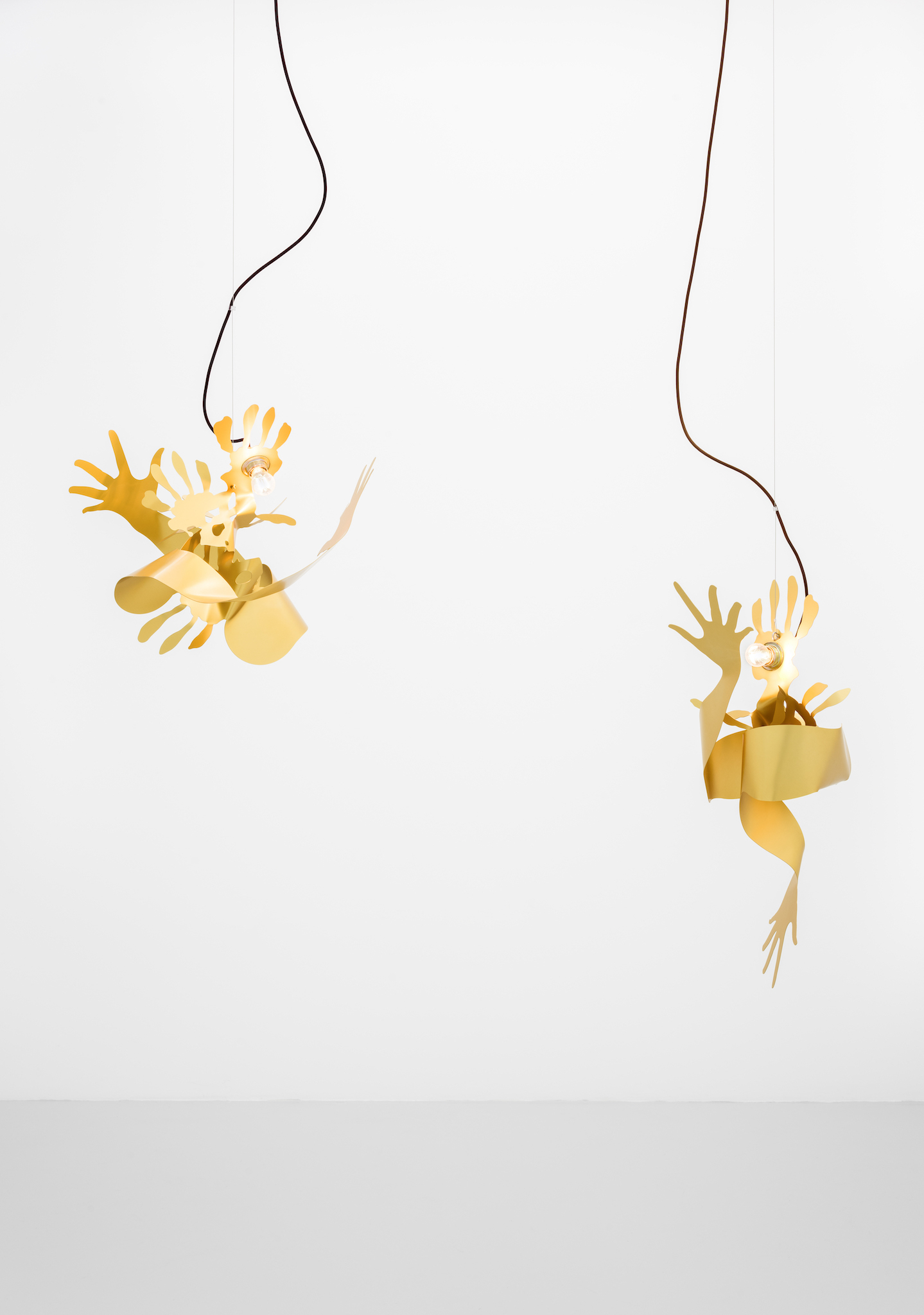 Metallic hands writhing, a gesture akin to flames. Aluminum surfaces catch the light as they mingle â[a]nd pour their diamond fires in mine eyes[.]â1 Shadows intermittently veil the brilliance, in doing so, contrasting the golden glowâabstract spatiality of anodized worlds. Through bending these expressive gesticulations emerge; it would appear the splaying of fingers induces self-amorphosis. Perhaps this is also a result of the light source, which, in the round dance of the hands, exerts its power and causes matter to melt. In the background, stranded wire and cable clamps. They brace and support, form the scaffolding to which the dance of light is affixed. Likewise, it can be arguedâechoing Leroi-Gourhanâthat their constitution itself readily identifies them as machine-made. Whereas ropes were once handmade, âthere was [...] an exteriorization of muscle powerâ2 and the apparatus annexed human proficiency. As much as aluminum captivates with its life-like contours and figurative design, it too is wholly alienated from the notion of human skilled craftsmanship. Bundled light and computer-aided design are integral to its creation. Could this be why the hand cautions us, warns us against âa mutation of the external organism which, in the human, substitutes itself for the human body[?]â3 An organism we can no longer identify as a machine?
