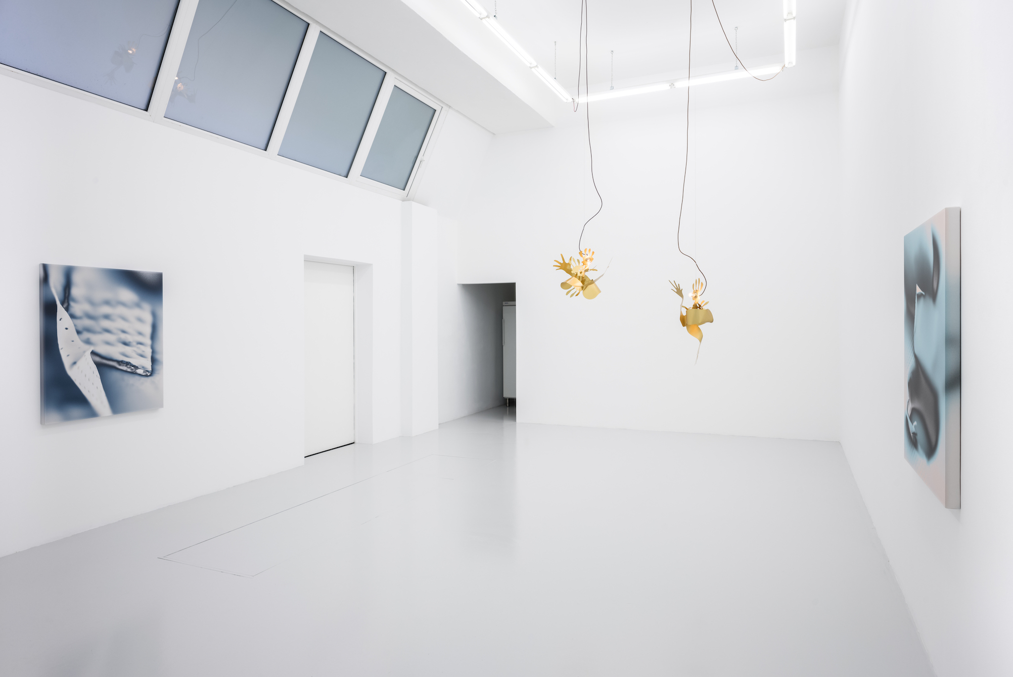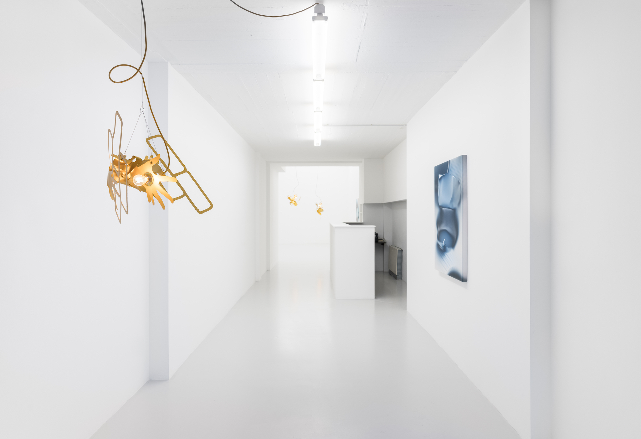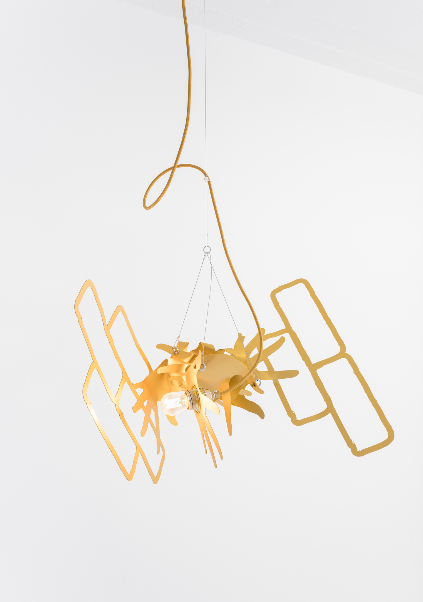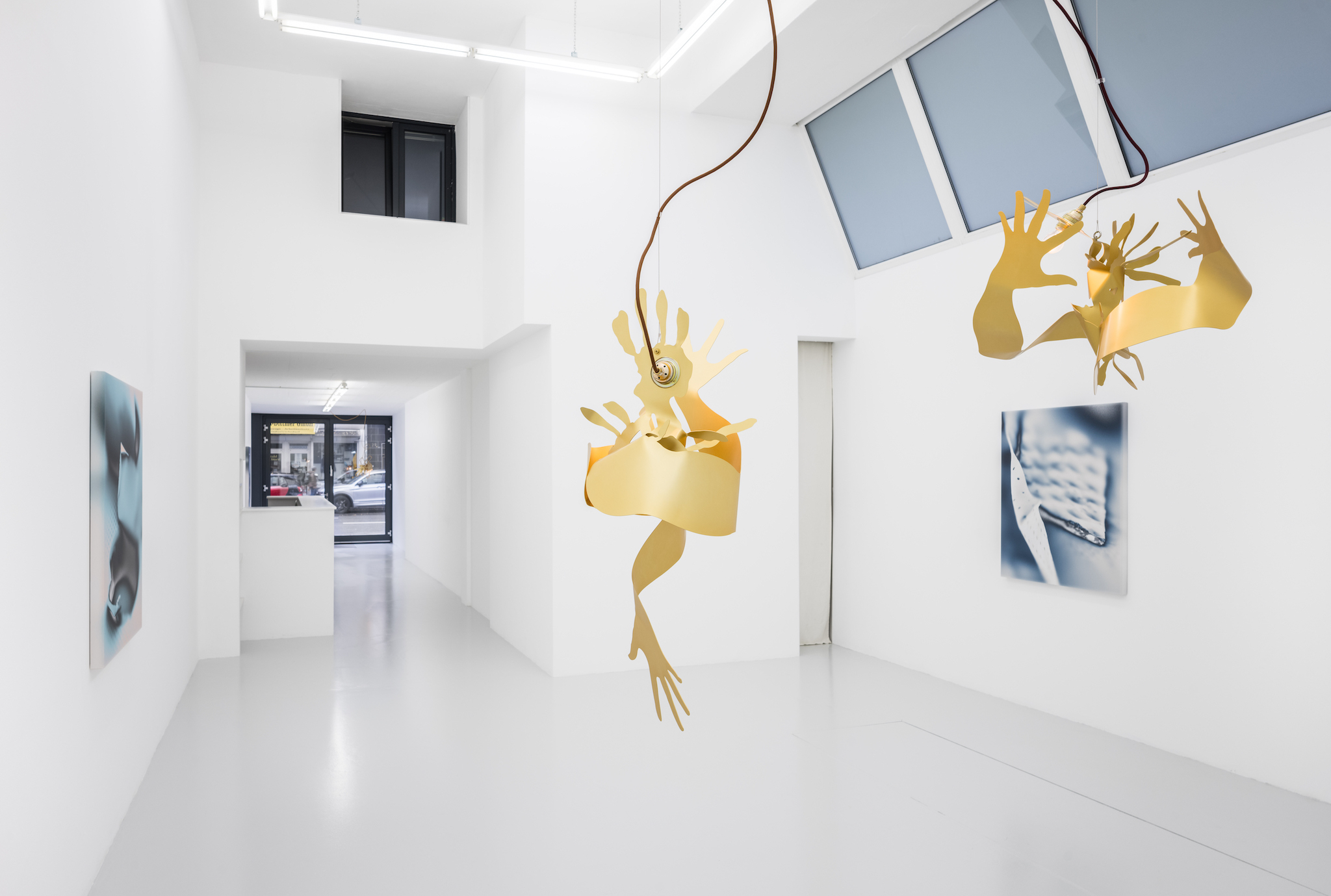 Metallic hands writhing, a gesture akin to flames. Aluminum surfaces catch the light as they mingle â[a]nd pour their diamond fires in mine eyes[.]â1 Shadows intermittently veil the brilliance, in doing so, contrasting the golden glowâabstract spatiality of anodized worlds. Through bending these expressive gesticulations emerge; it would appear the splaying of fingers induces self-amorphosis. Perhaps this is also a result of the light source, which, in the round dance of the hands, exerts its power and causes matter to melt. In the background, stranded wire and cable clamps. They brace and support, form the scaffolding to which the dance of light is affixed. Likewise, it can be arguedâechoing Leroi-Gourhanâthat their constitution itself readily identifies them as machine-made. Whereas ropes were once handmade, âthere was [...] an exteriorization of muscle powerâ2 and the apparatus annexed human proficiency. As much as aluminum captivates with its life-like contours and figurative design, it too is wholly alienated from the notion of human skilled craftsmanship. Bundled light and computer-aided design are integral to its creation. Could this be why the hand cautions us, warns us against âa mutation of the external organism which, in the human, substitutes itself for the human body[?]â3 An organism we can no longer identify as a machine?