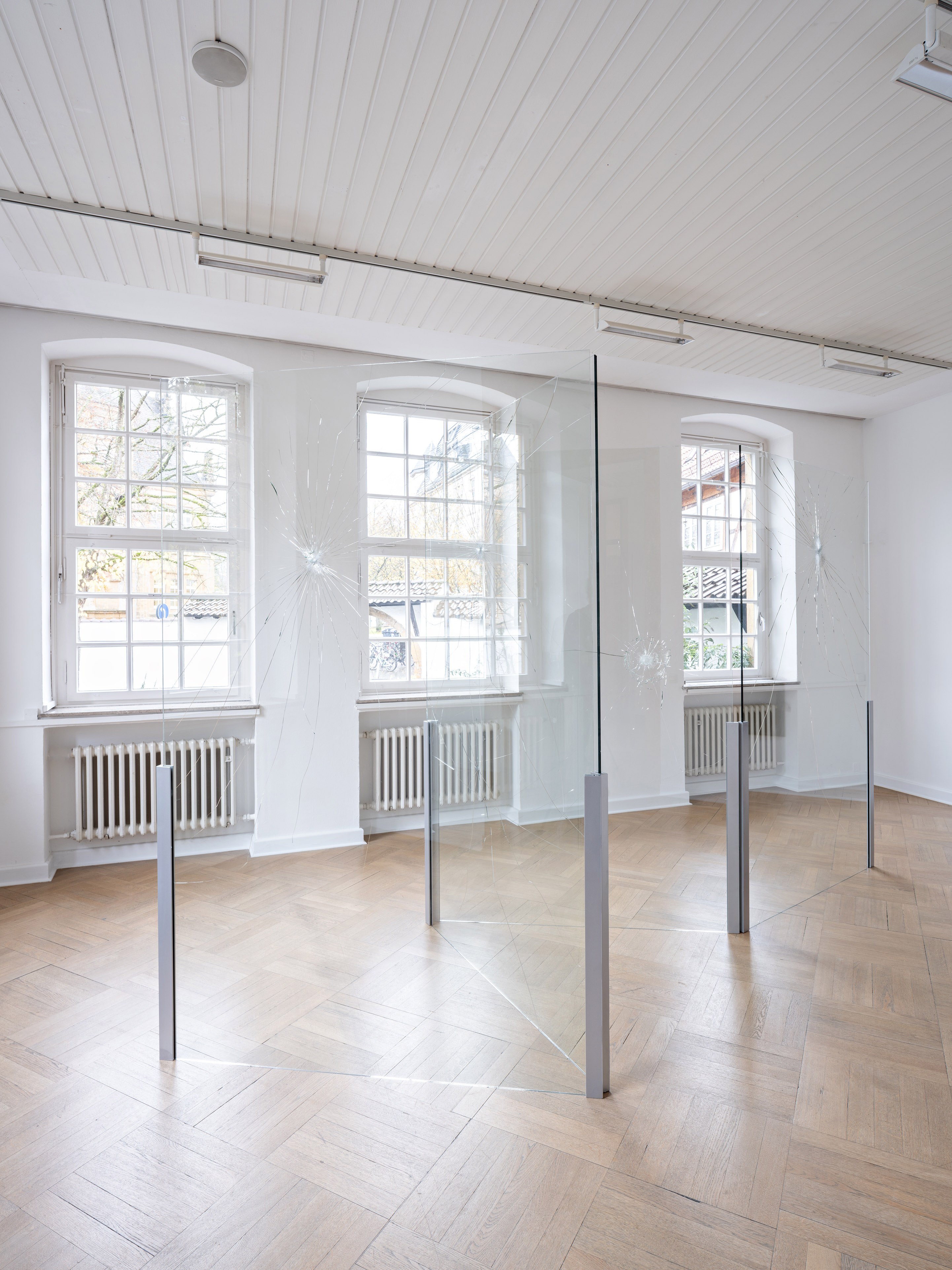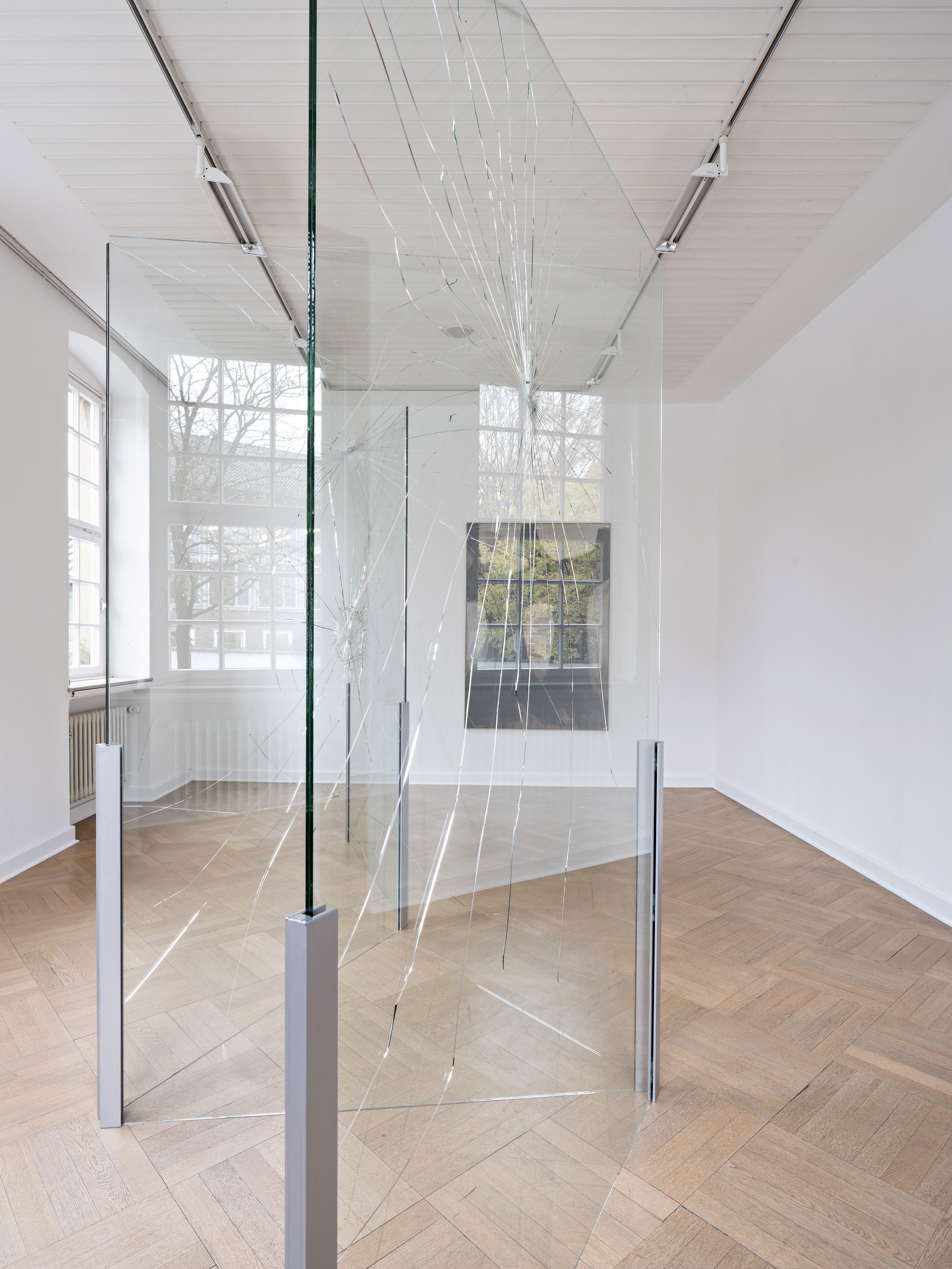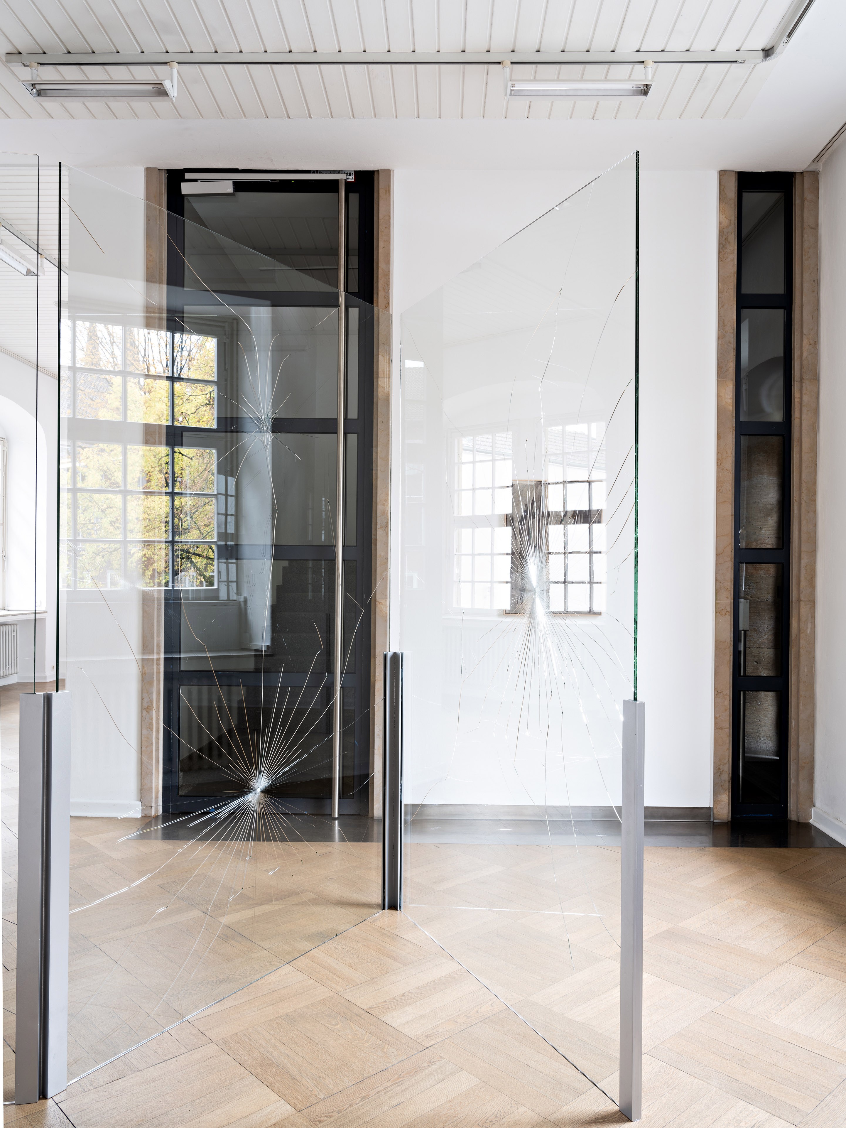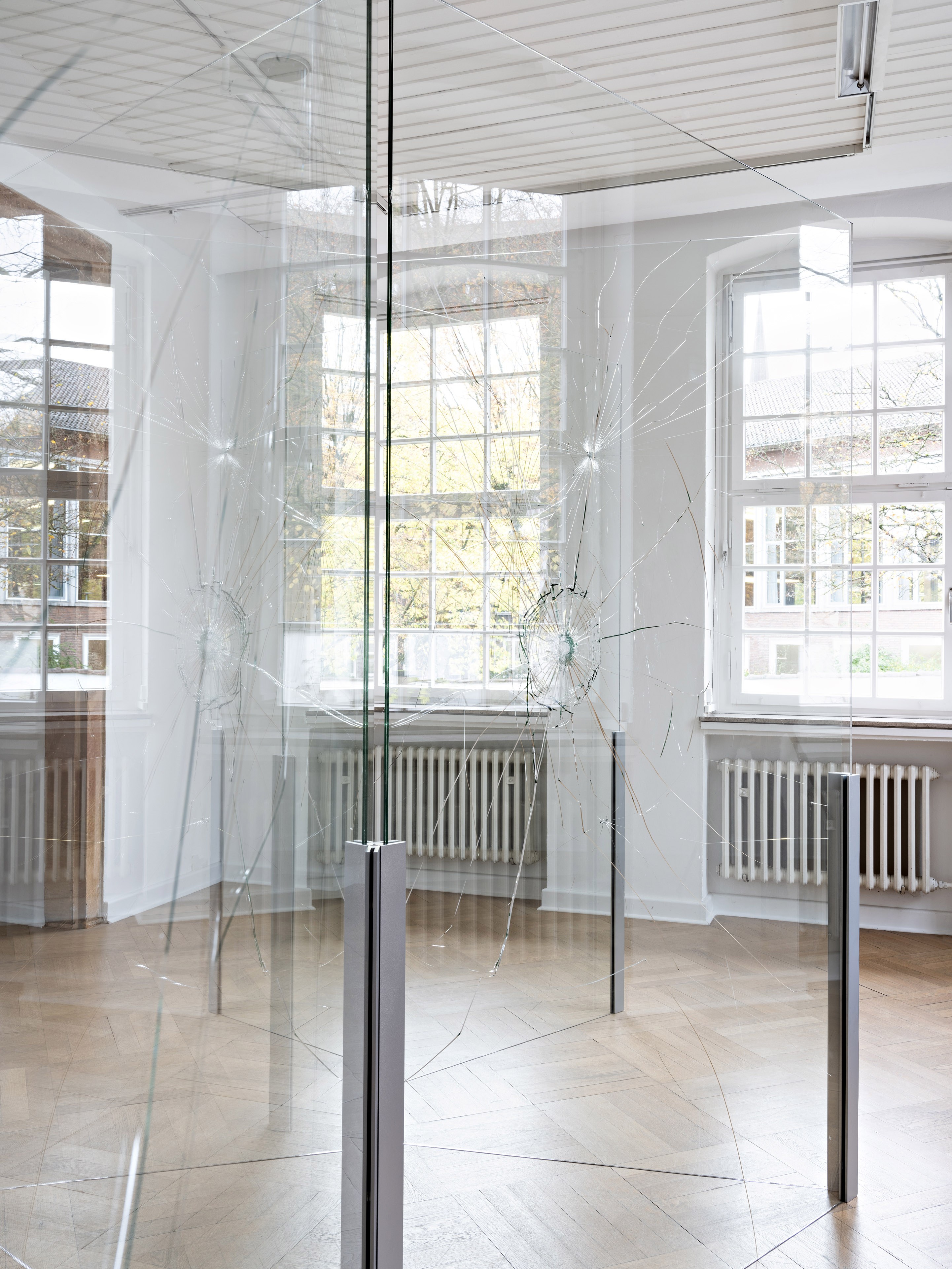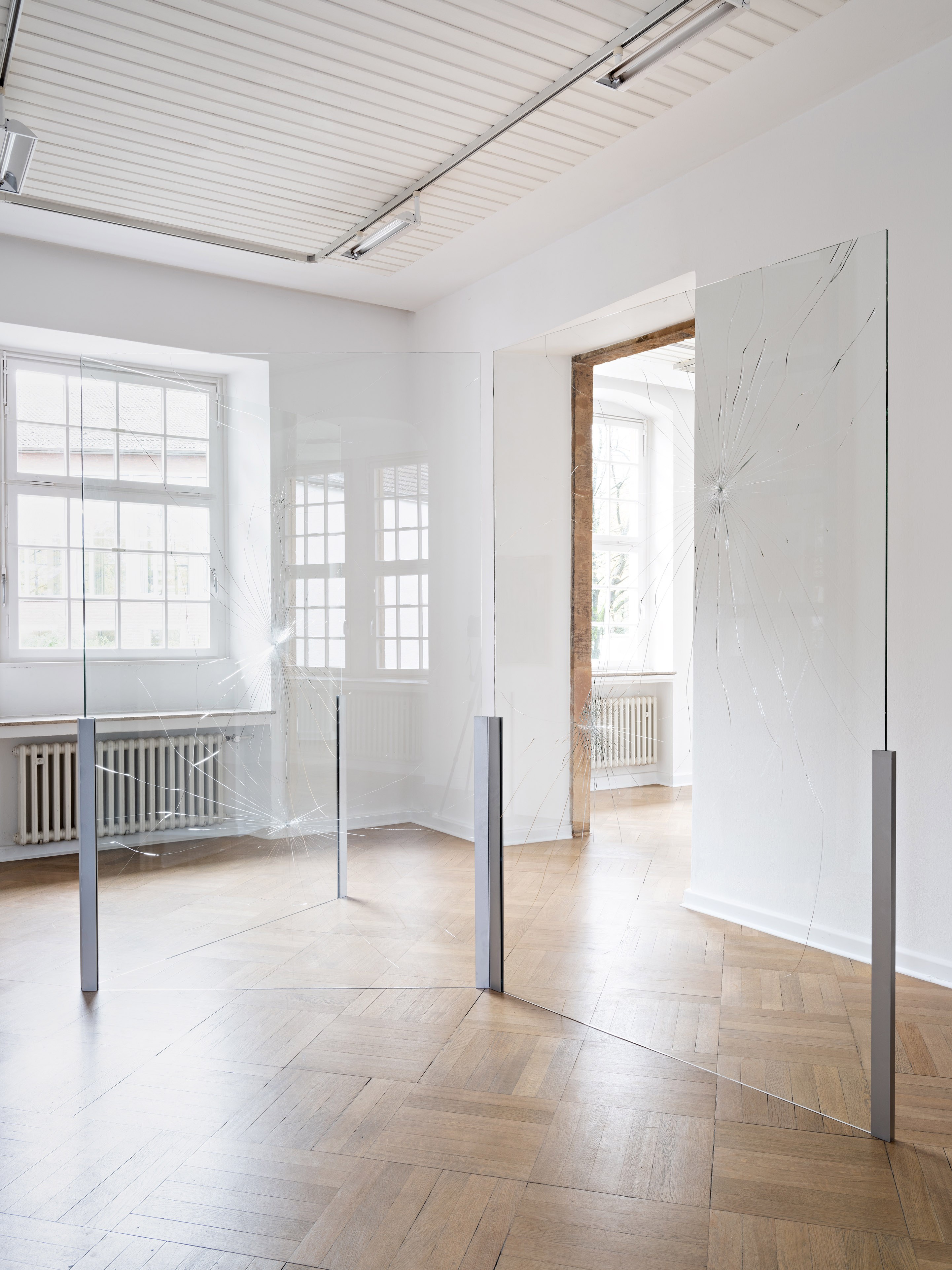 Her glass installations – sculptures and wall pieces, in particular, the bringing together of glass and metal – can be understood as symbols of heterogeneous systems, as visible and invisible barriers. They play with aspects of transparency, fragility, self-location and moments of transition. The space-dominating installations create walls of broken glass at defined angles. The viewer can walk around them, reflect in them, perceive them individually as well or as a whole. Working with brute force, which in itself testifies to the energy and power that underlies these works, the artist creates a being that tells of the interplay between precarious systems. It speaks of the delicacy of social structures, of the fragmentation resulting from individual perspectives and societal interests, and thus of the proverbial glass house in which one should not throw stones. Psychological aspects can also be found in the glass wall architectures. Splintered mosaics of light refer to the spectra of the inside and the outside. Emotions, experiences, and traumas of individuals and groups are reflected through the work’s shattered prism structure. The glass sculptures thematize threshold experiences of matter that hold both positive and negative correspondences within a singular form.