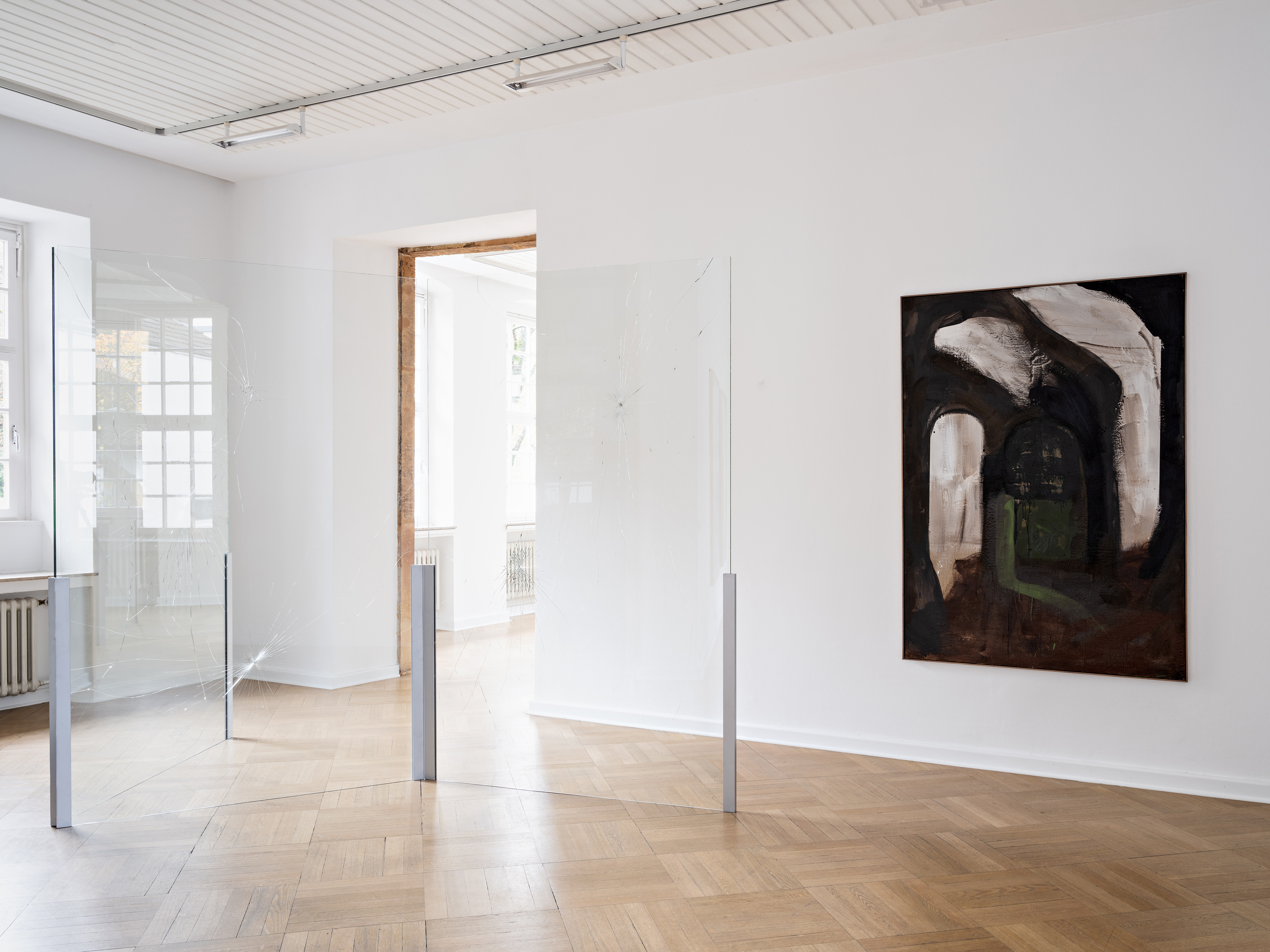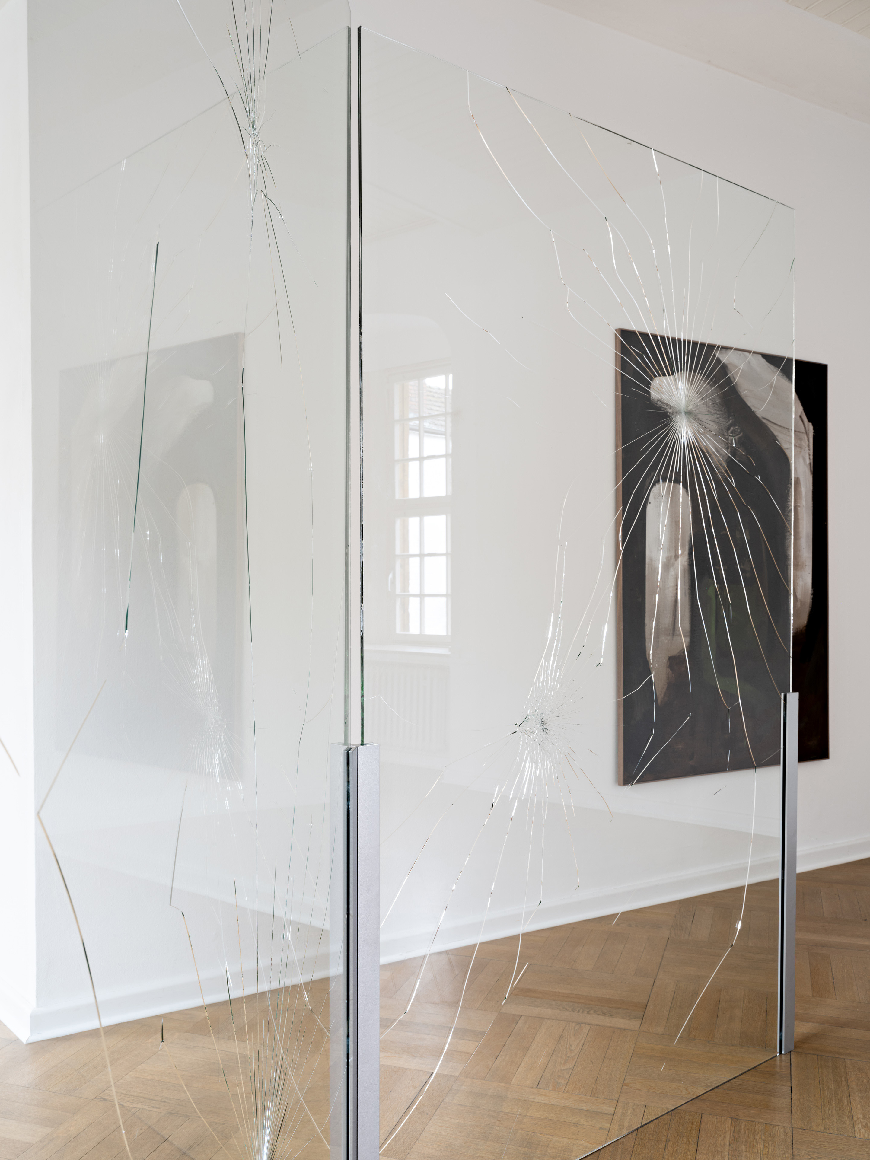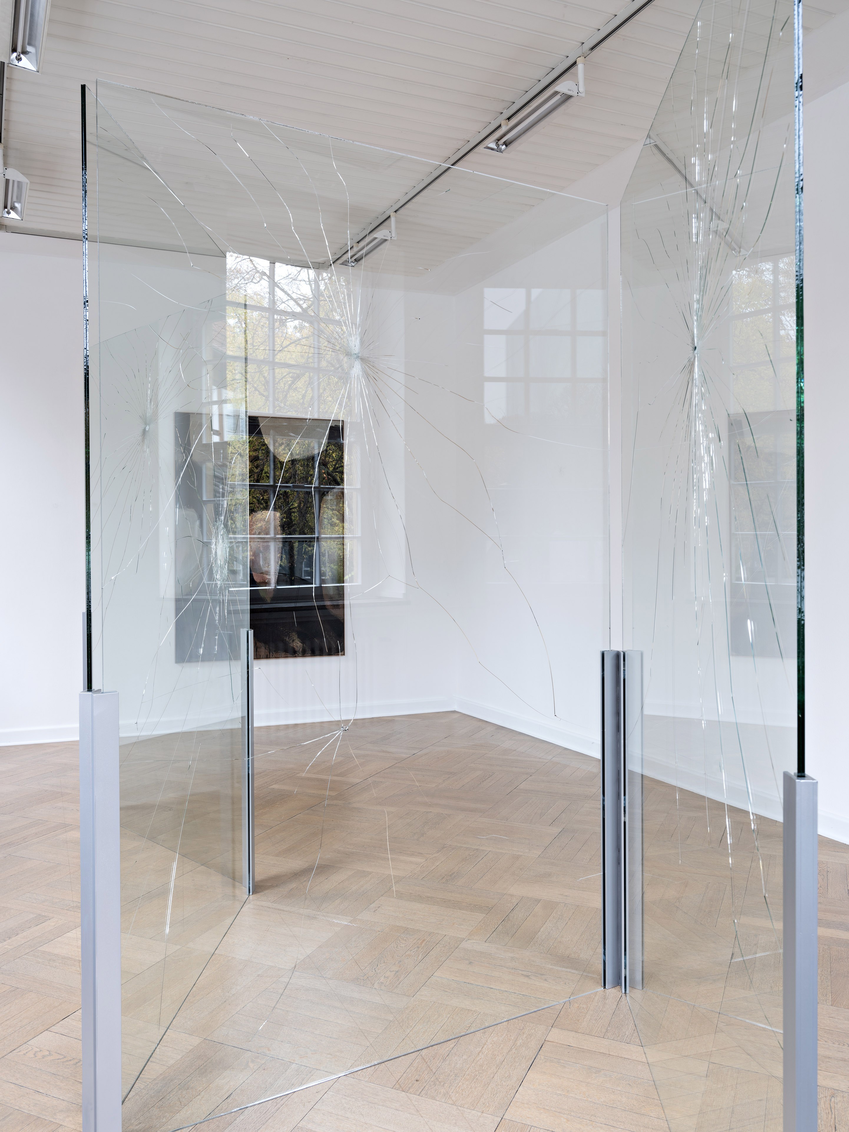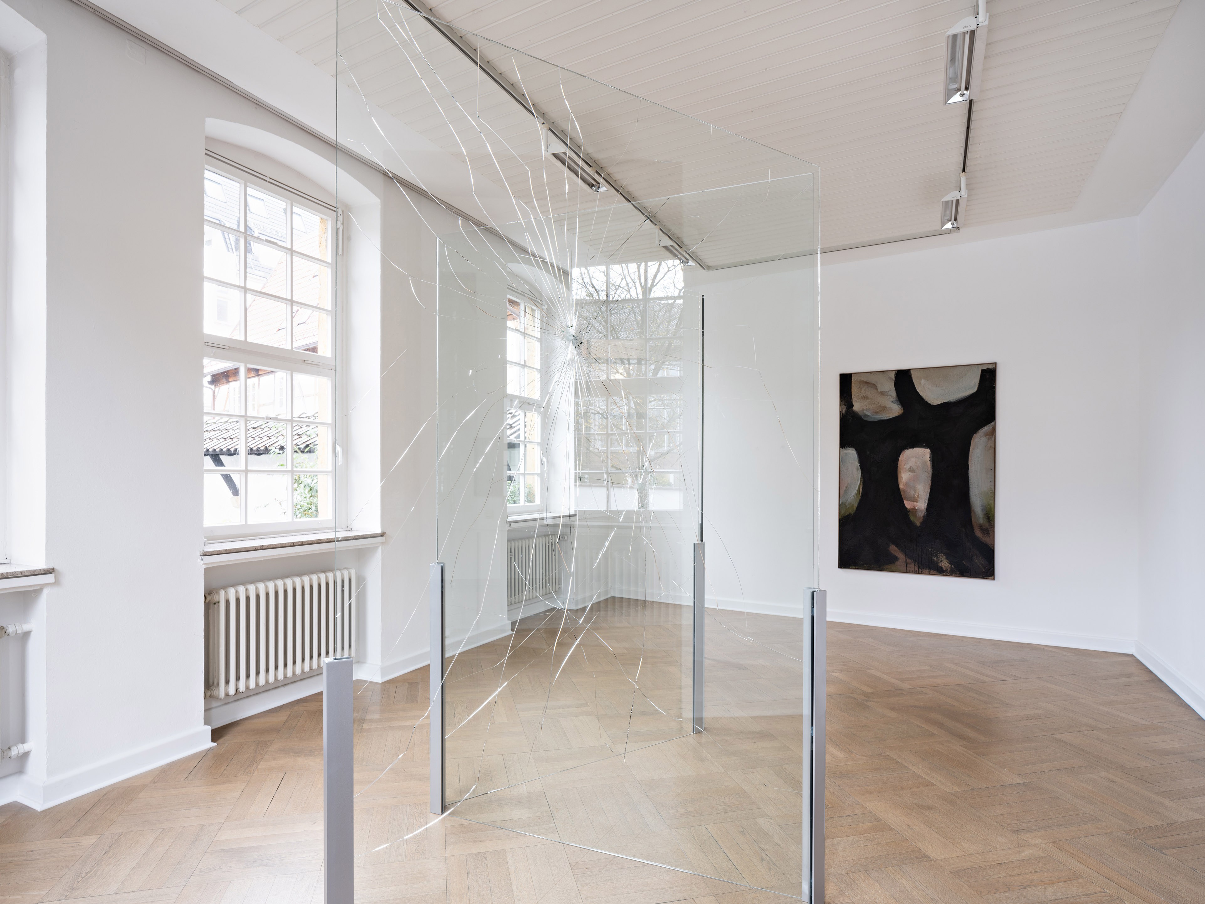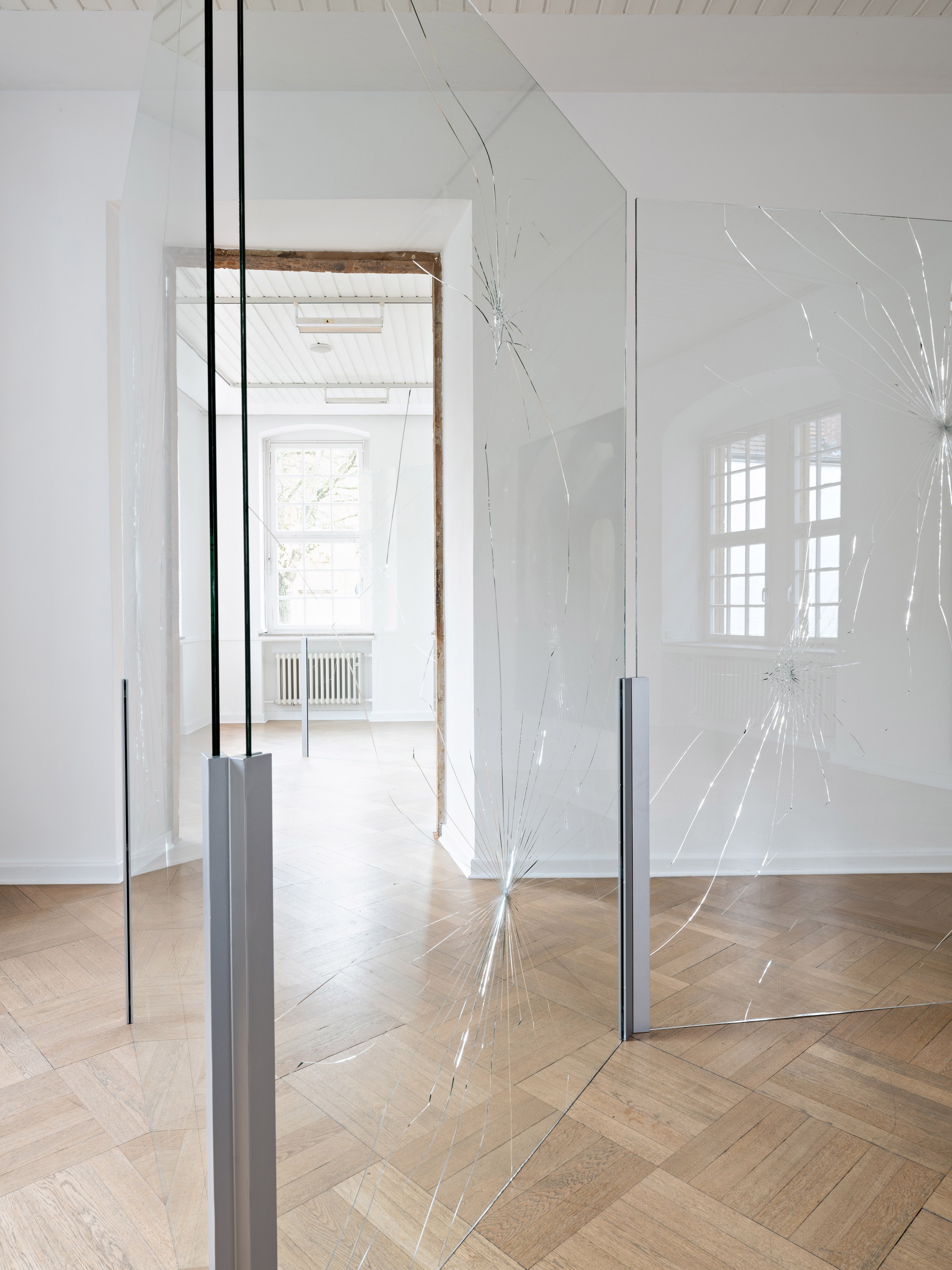 Her glass installations – sculptures and wall pieces, in particular, the bringing together of glass and metal – can be understood as symbols of heterogeneous systems, as visible and invisible barriers. They play with aspects of transparency, fragility, self-location and moments of transition. The space-dominating installations create walls of broken glass at defined angles. The viewer can walk around them, reflect in them, perceive them individually as well or as a whole. Working with brute force, which in itself testifies to the energy and power that underlies these works, the artist creates a being that tells of the interplay between precarious systems. It speaks of the delicacy of social structures, of the fragmentation resulting from individual perspectives and societal interests, and thus of the proverbial glass house in which one should not throw stones. Psychological aspects can also be found in the glass wall architectures. Splintered mosaics of light refer to the spectra of the inside and the outside. Emotions, experiences, and traumas of individuals and groups are reflected through the work’s shattered prism structure. The glass sculptures thematize threshold experiences of matter that hold both positive and negative correspondences within a singular form.