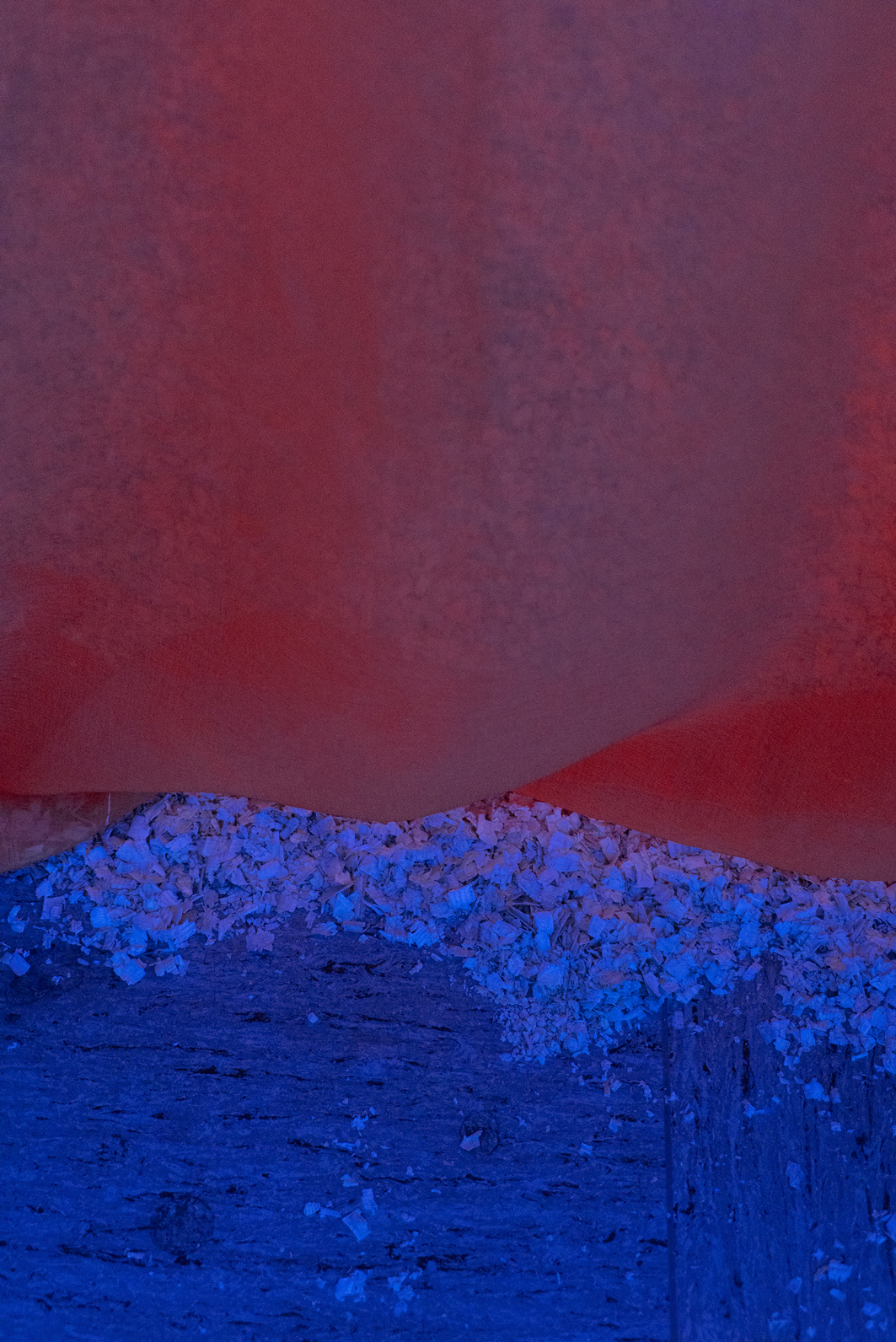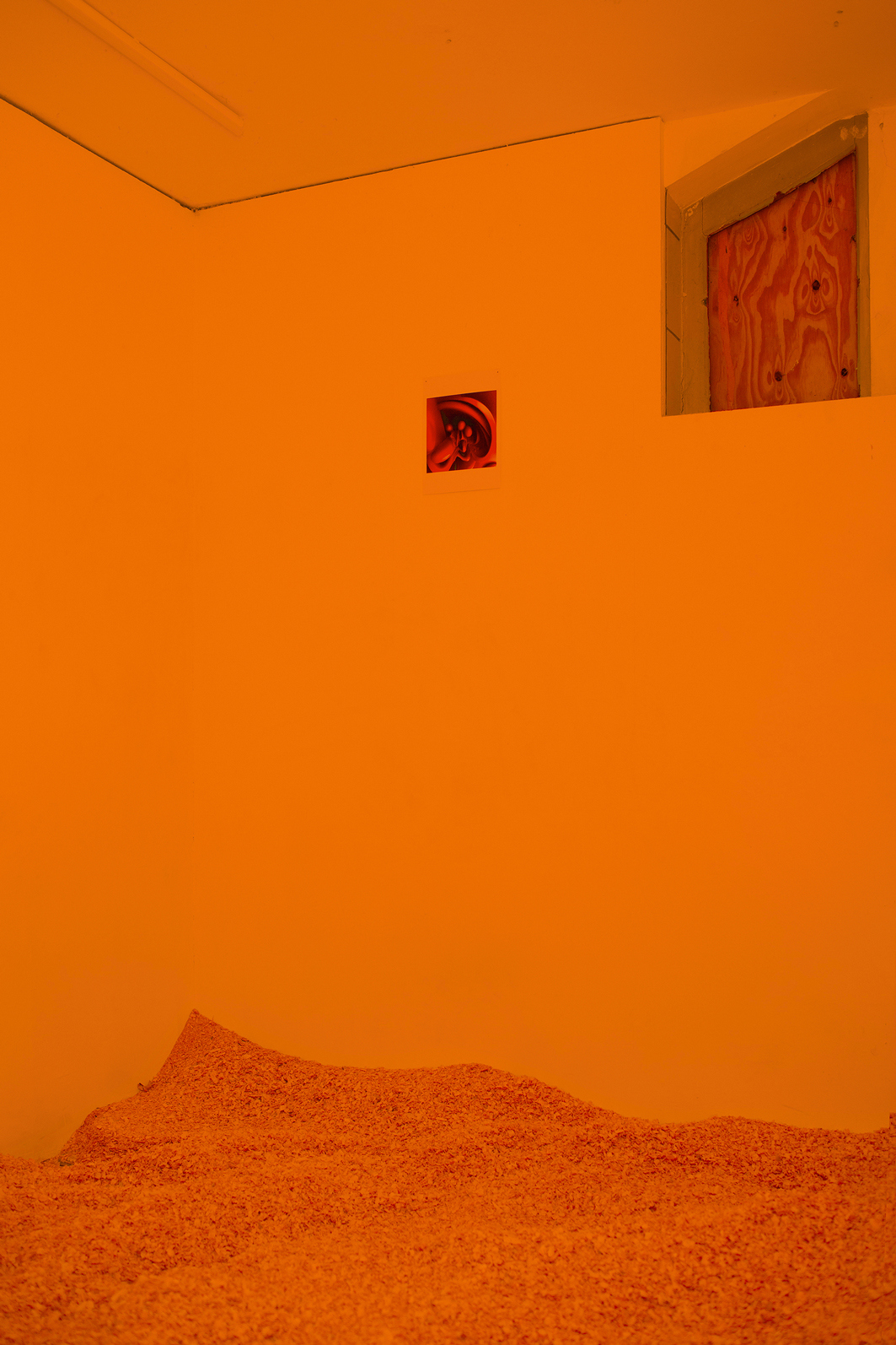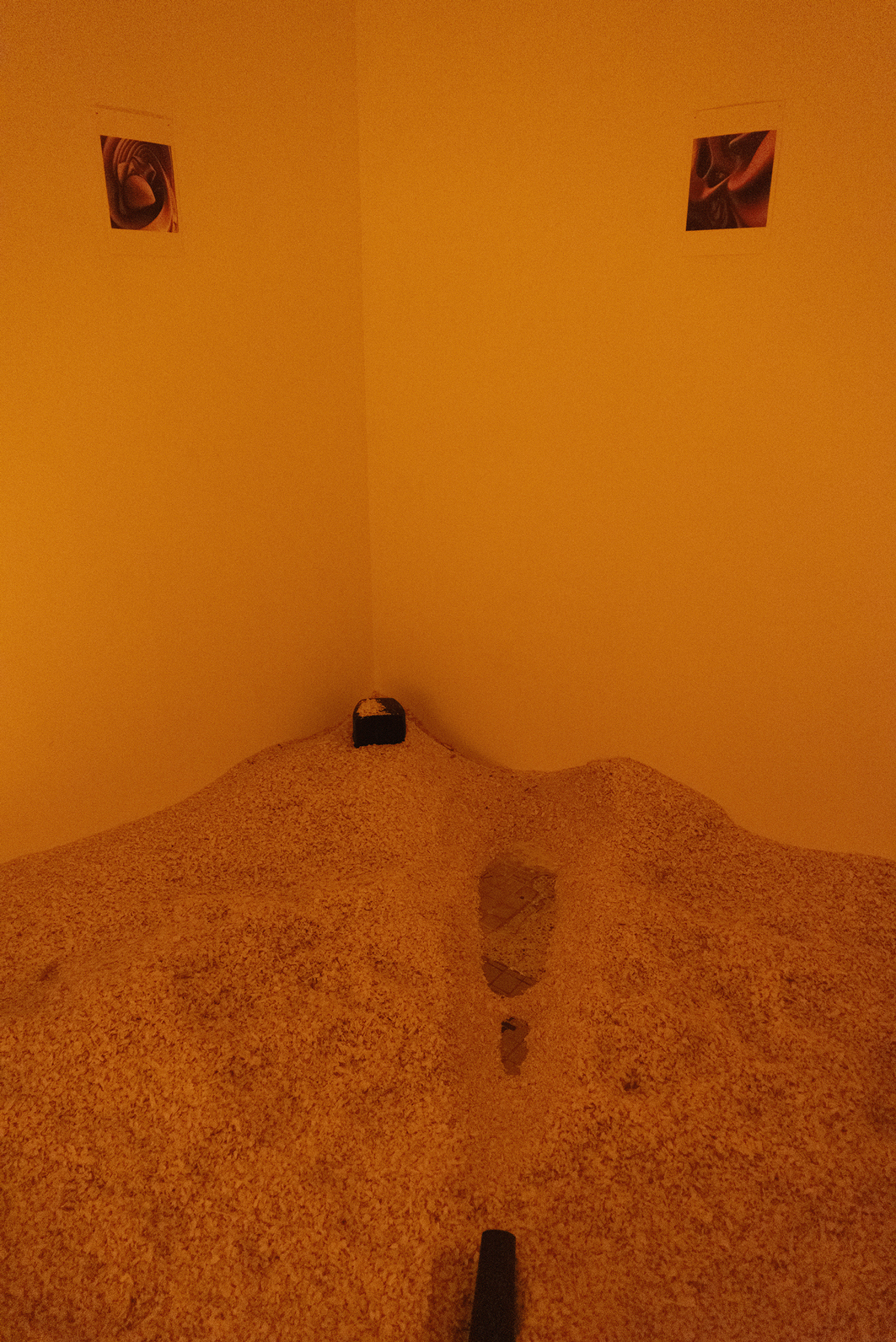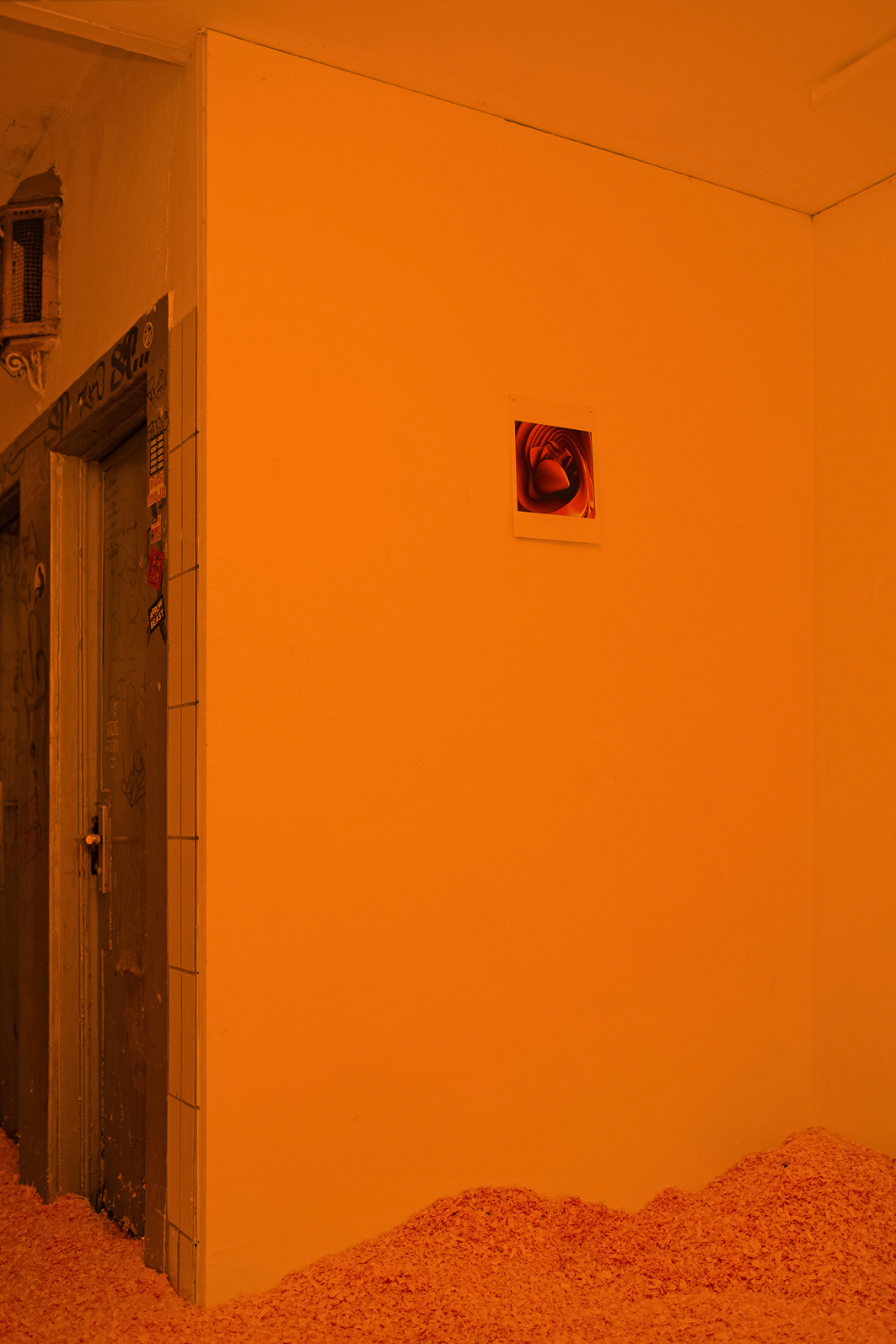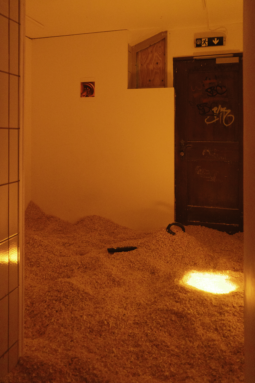 The room is illuminated solely by an eerie orange glow emanating from beneath the shavings. Coupled with a disconcerting speech by right-wing extremist and neopagan Frank Willy Ludwig, which echoes from a speaker in the vestibule and discusses cosmic alliances and ancient Germanic heritage, the entire environment takes on an unsettling quality. Viewers are confronted with a challenging exploration of their personal boundaries and left to grapple with the conflicting insinuations independently.