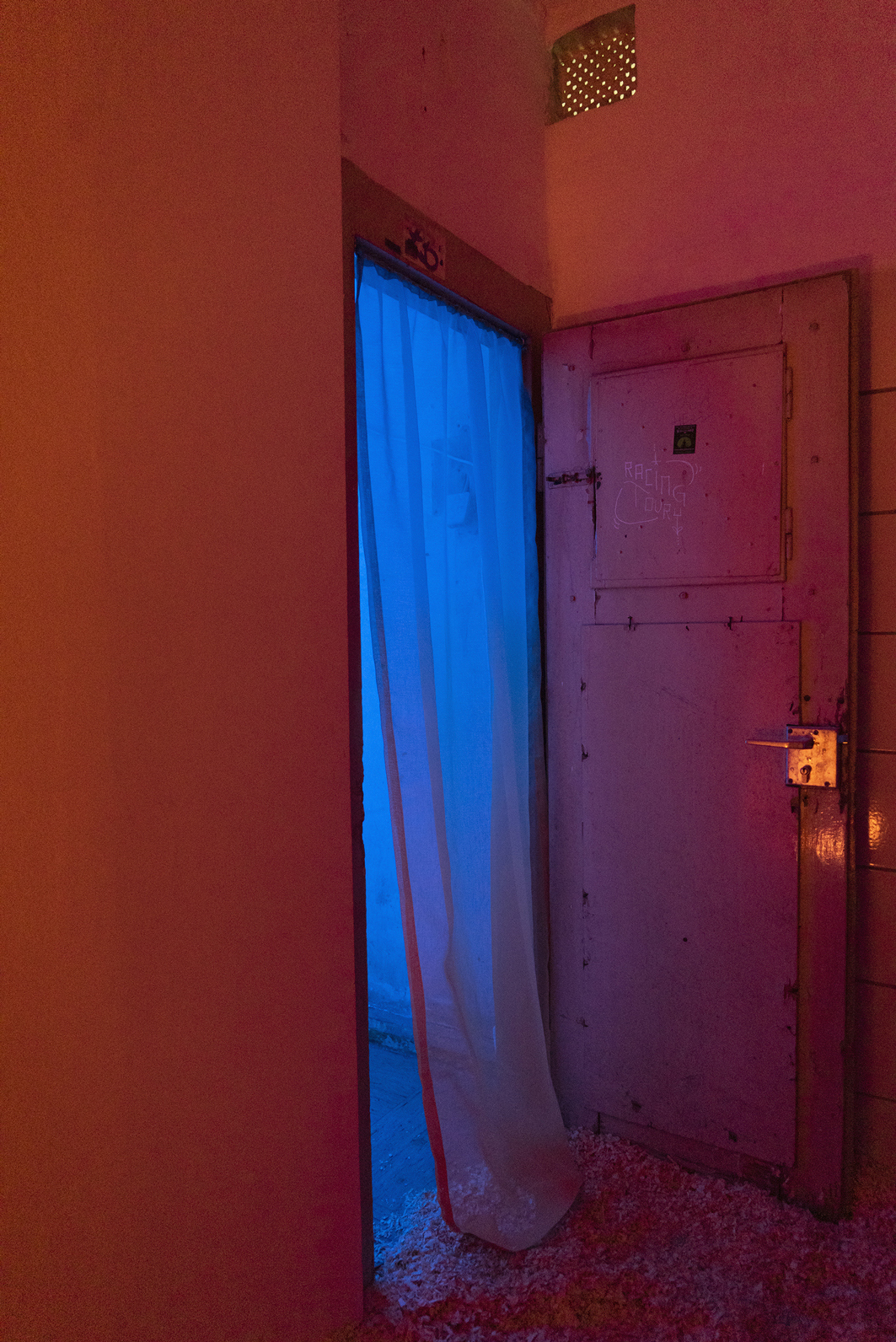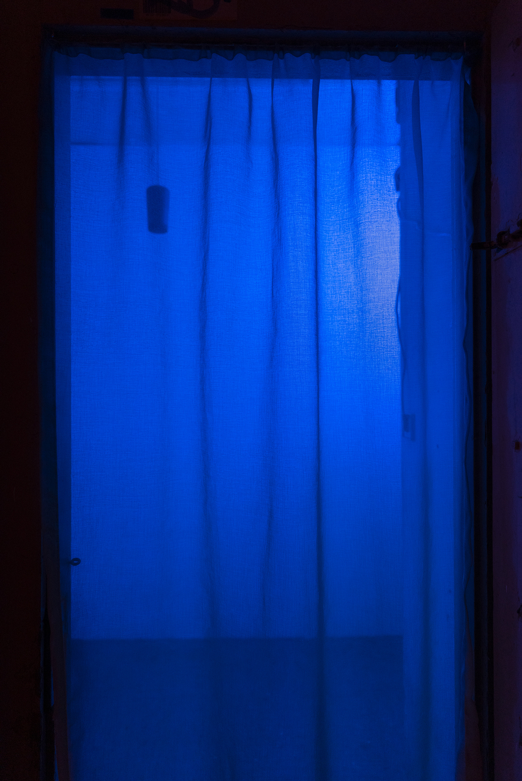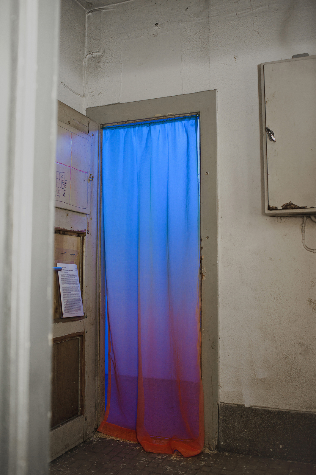 Upon entering the dimly lit exhibition, visitors must traverse two curtains, marking the passage into both the vestibule and the primary exhibition space. These curtains, made of lightweight fabric, feature a color gradient from light blue to orange, reminiscent of the hues seen in a picturesque sunset. Notably, these curtains are readymades that Slaby acquired when she came across them while searching for "esoteric curtains" online. Despite their initial connotation of providing a sense of comfort and protection from prying eyes, these very curtains paradoxically draw attention to themselves, prompting contemplation regarding what they might be concealing.