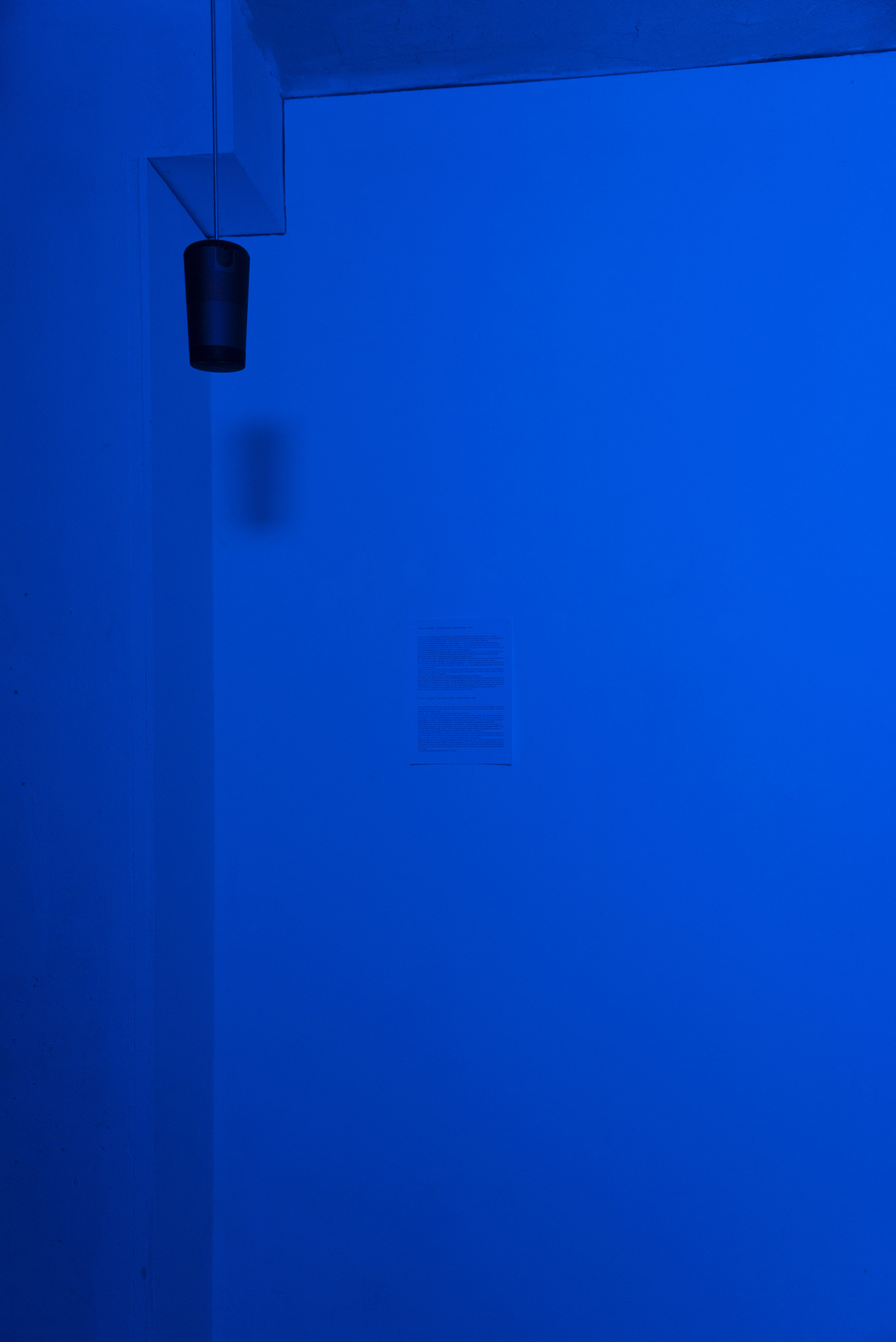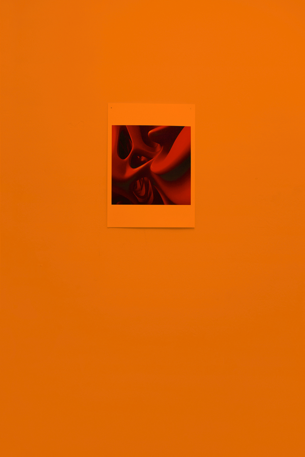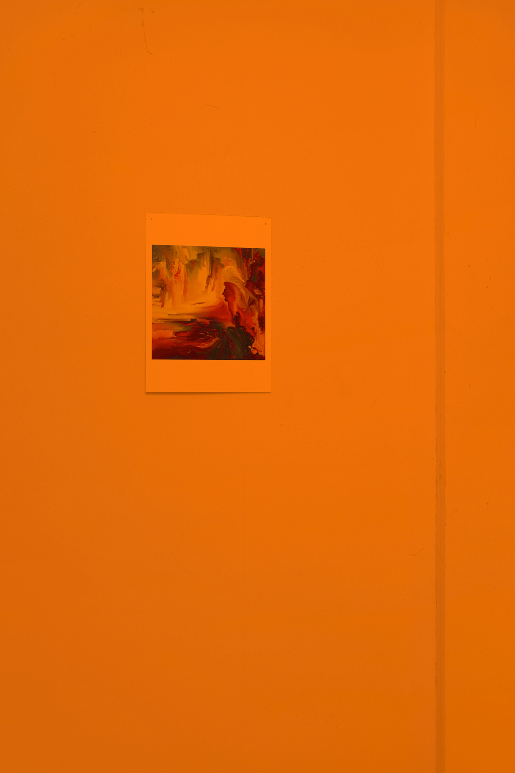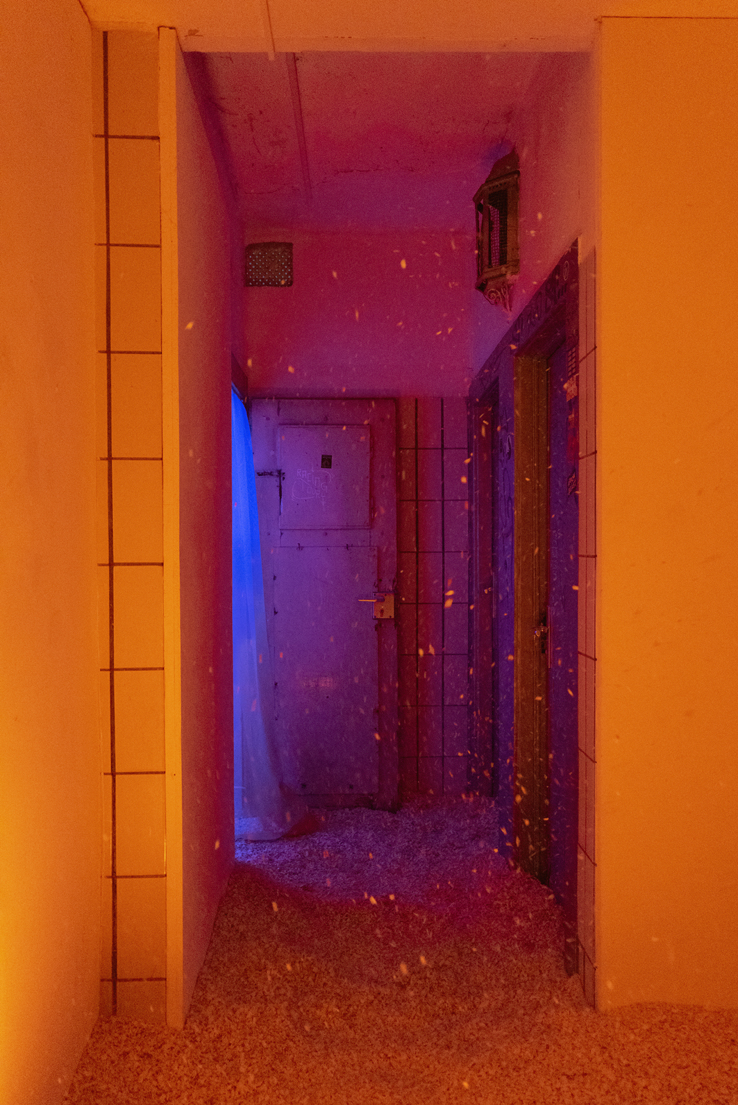 Upon entering the dimly lit exhibition, visitors must traverse two curtains, marking the passage into both the vestibule and the primary exhibition space. These curtains, made of lightweight fabric, feature a color gradient from light blue to orange, reminiscent of the hues seen in a picturesque sunset. Notably, these curtains are readymades that Slaby acquired when she came across them while searching for "esoteric curtains" online. Despite their initial connotation of providing a sense of comfort and protection from prying eyes, these very curtains paradoxically draw attention to themselves, prompting contemplation regarding what they might be concealing.