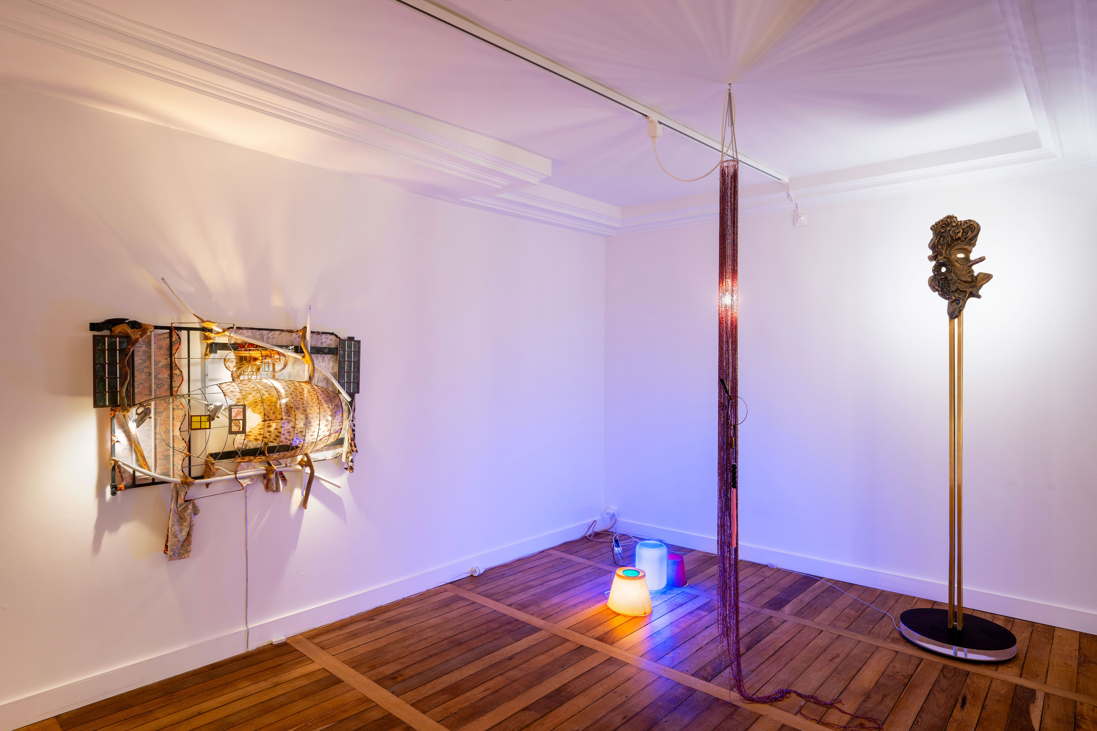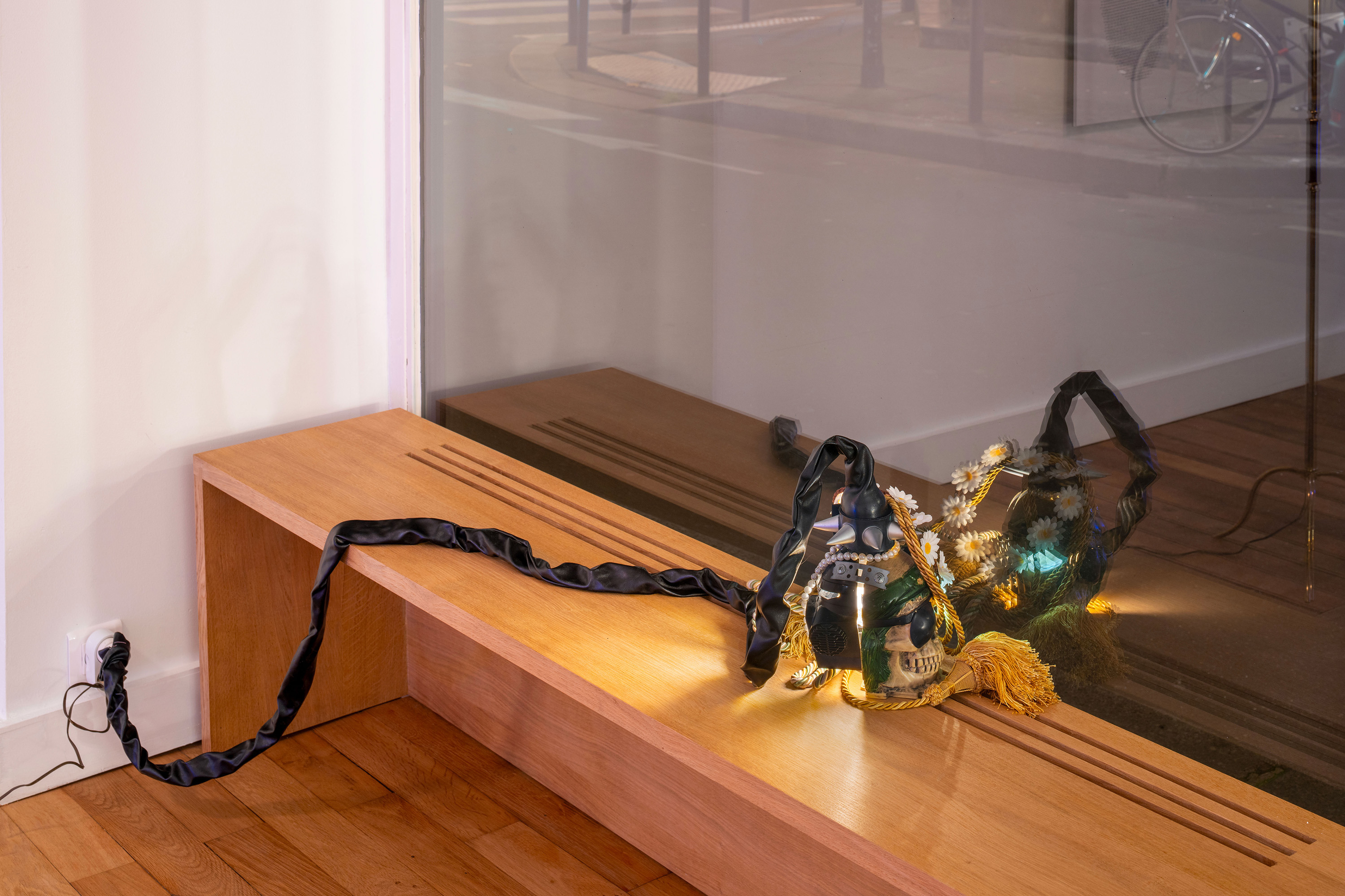 Renaud Jerez, *Untitled (Miroir noir - Poisson/Dragon)*, 2018, Light bulb, masks (skull & Darth Vader), accessories (plastic flowers, plastic beads, spike bracelet), curtain ropes, leatherette, electrical system, 220 × 20 × 14 cm