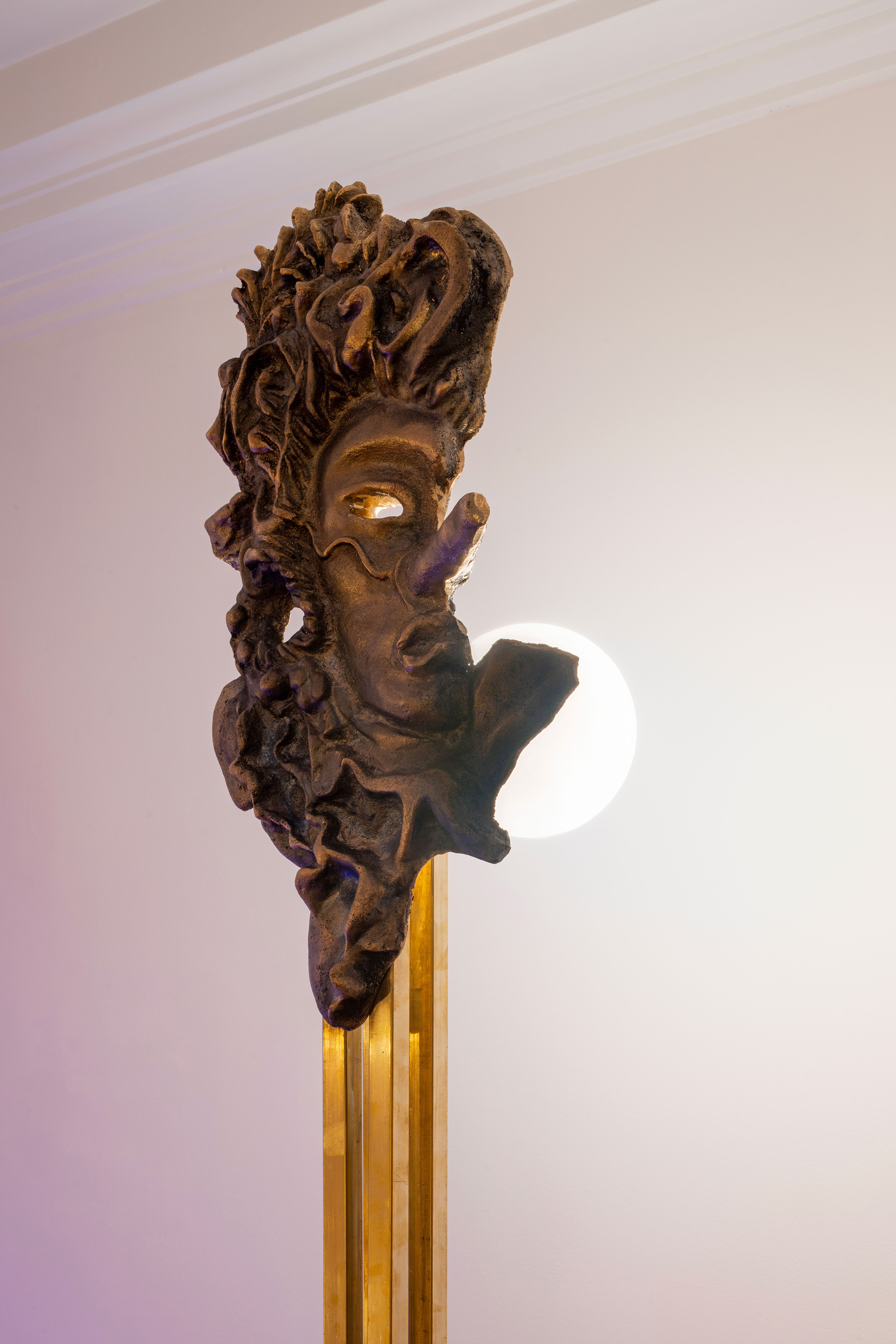 Than Hussein Clark, *Pinocchio Floor Lamp (Entrance # 4 - The Arrival of the Ambassador of D’Arros)*, 2023, Brass, acrylic, blackened steel, porcelain light bulb, patina, 222 × 50 × 50 cm