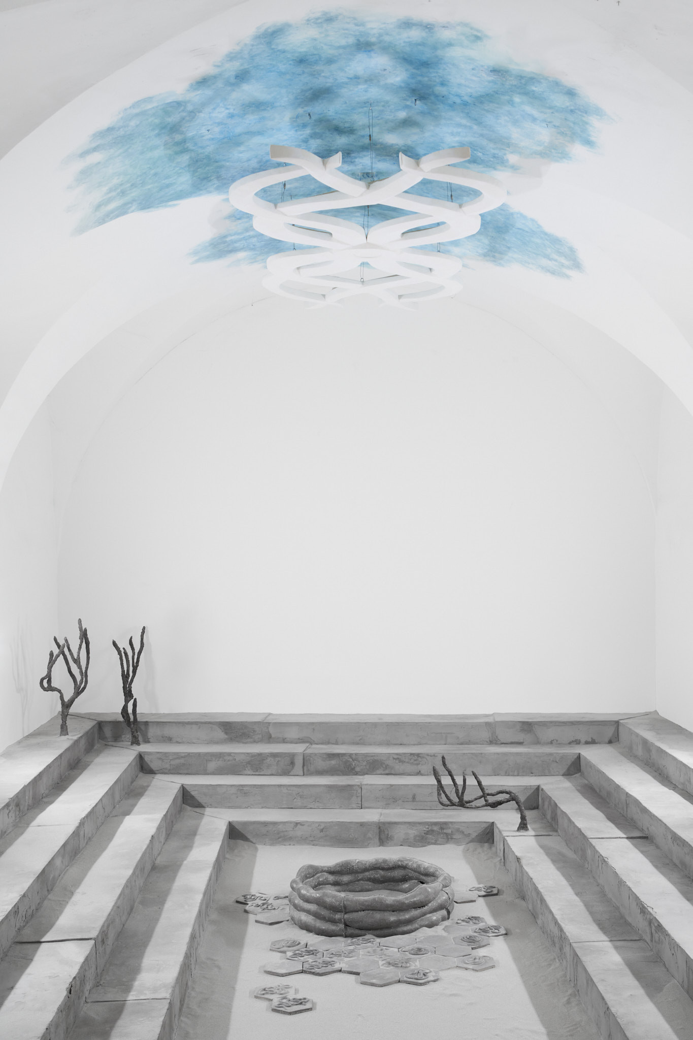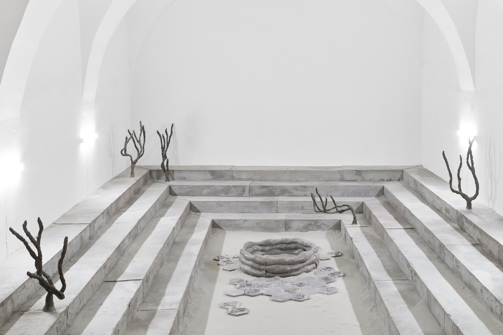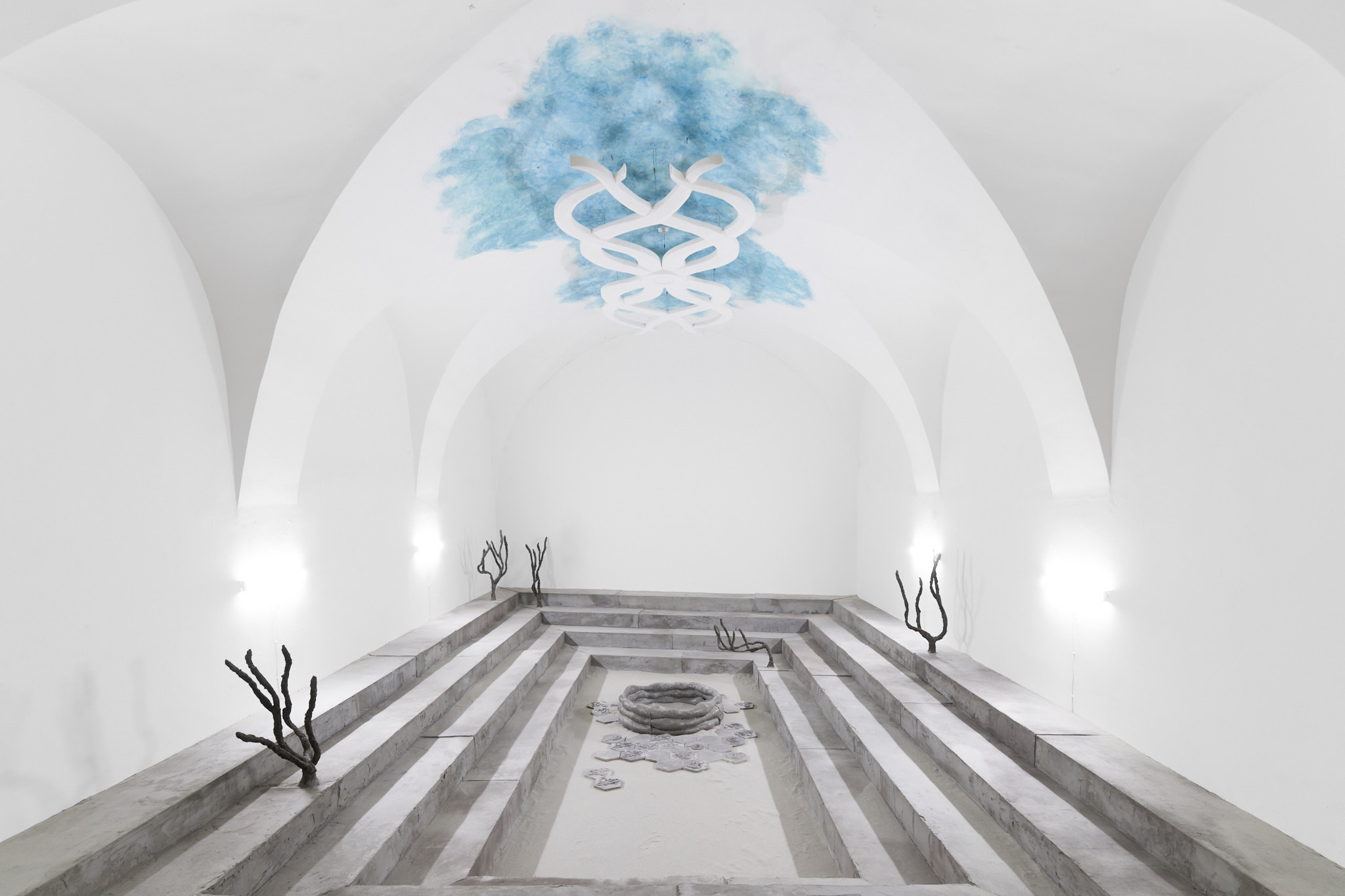 The place of otherness, emptiness, formation, potentiality of sensory perceptible materiality; Khora, emerges in the exhibition of Tereza Kalousová and Erika Velicková in the form of a symbol referring to the architecture of Greek temples and theatres covered with sand and overgrown by bushes. The artists have established a dislocated place, hovering in the gap which a gallery in the city centre, by itself, can be. They have created a space for contemplation, idleness and daydreaming over healing and signs and sharing the void.
